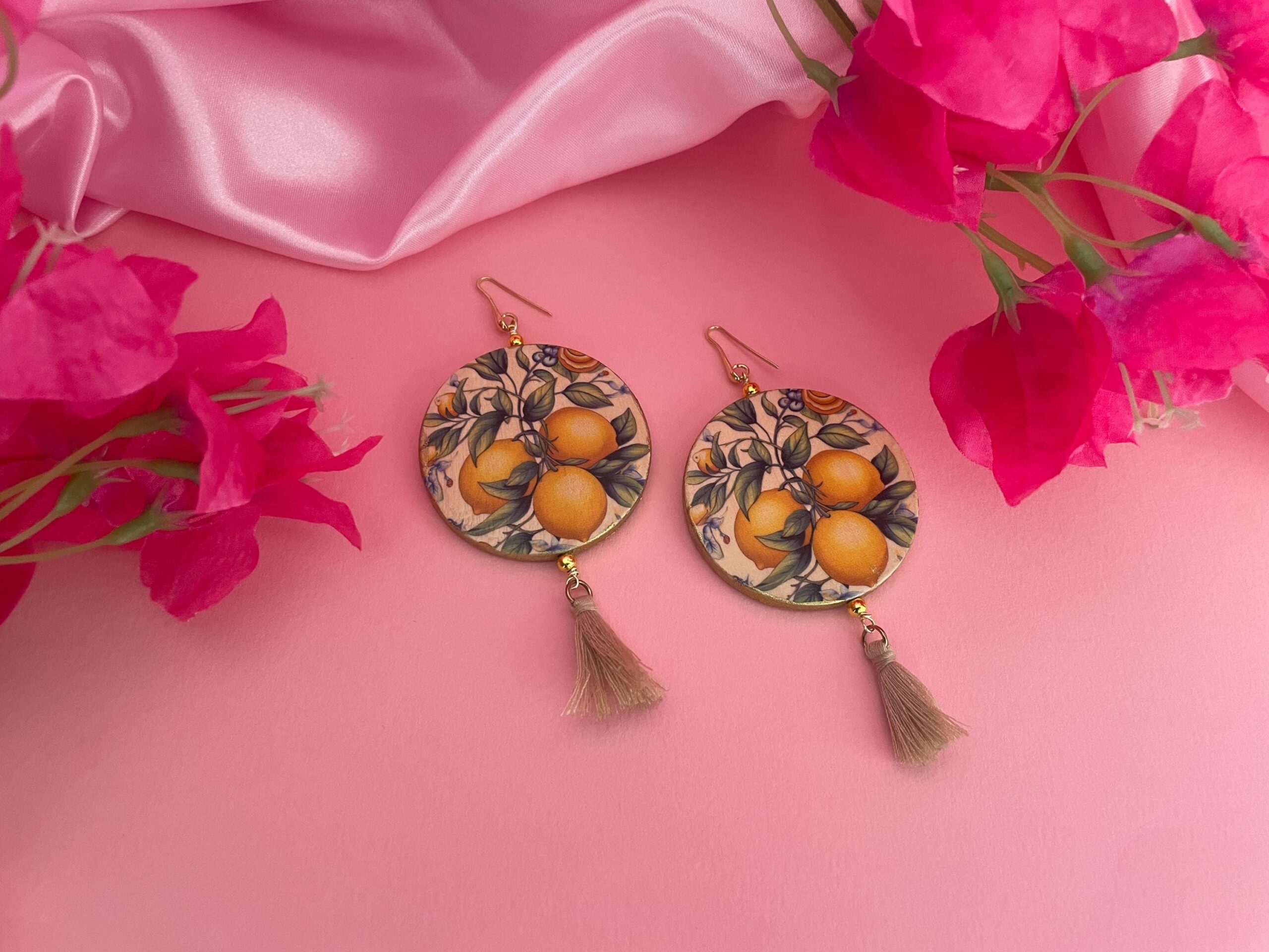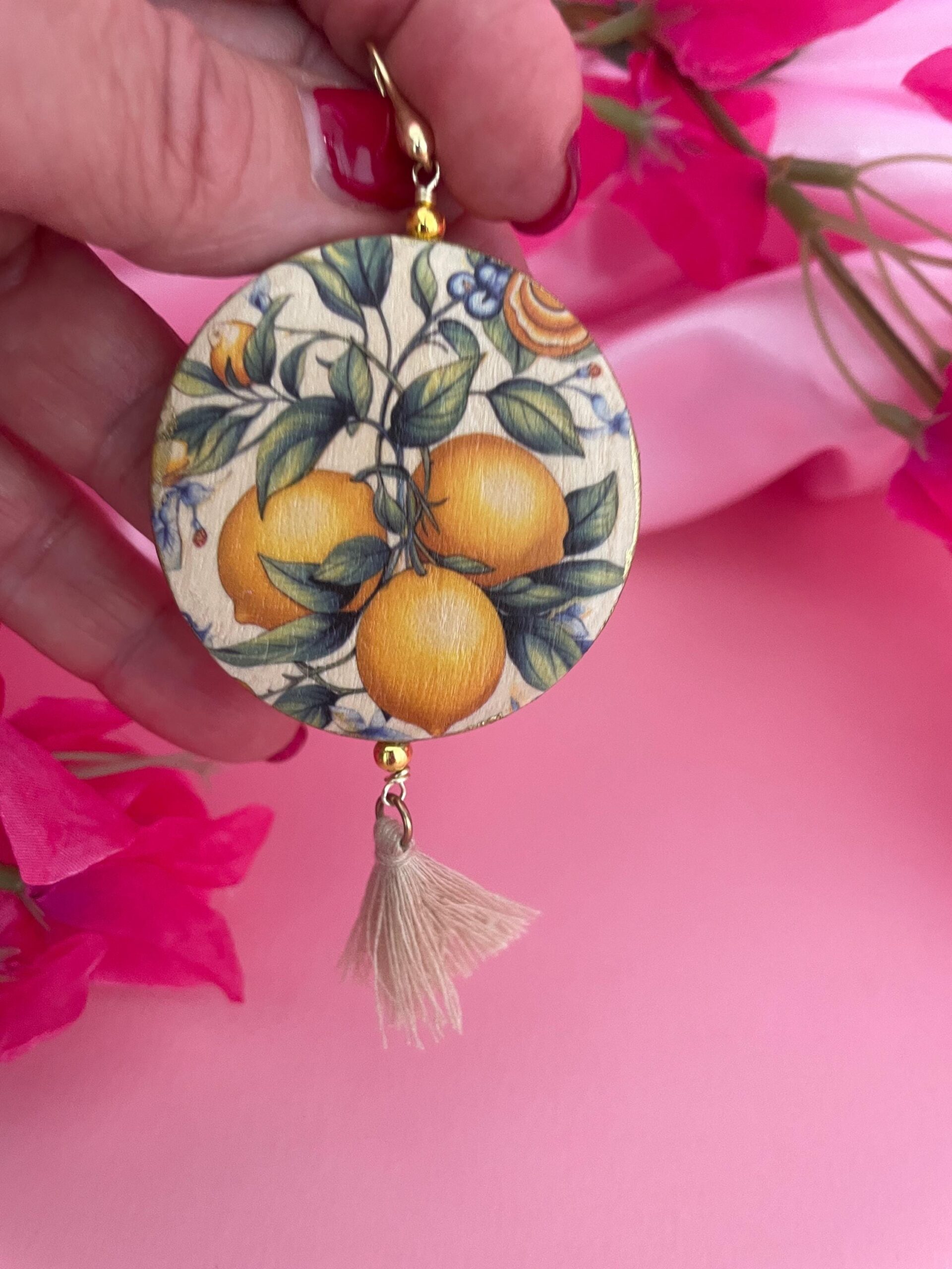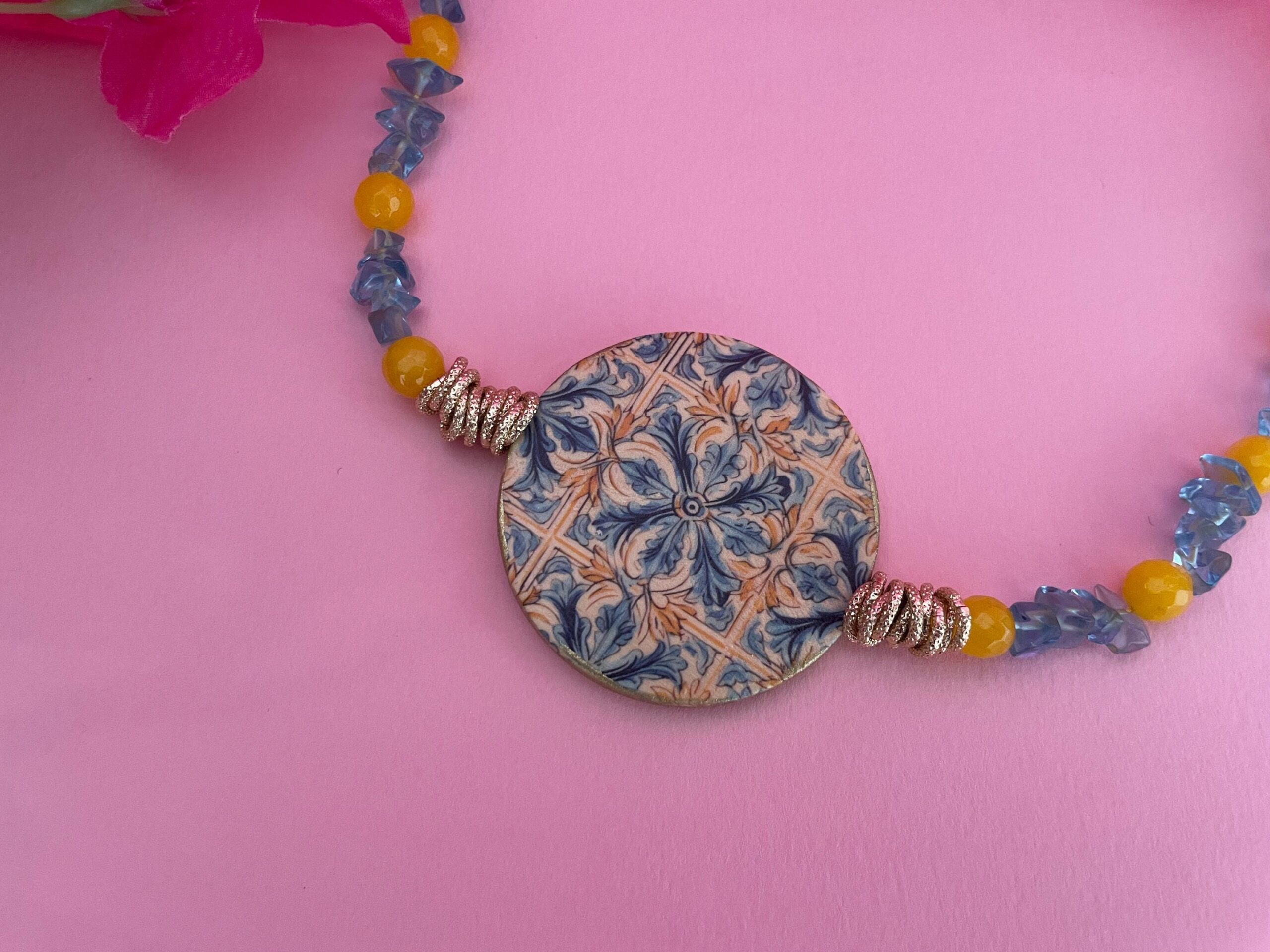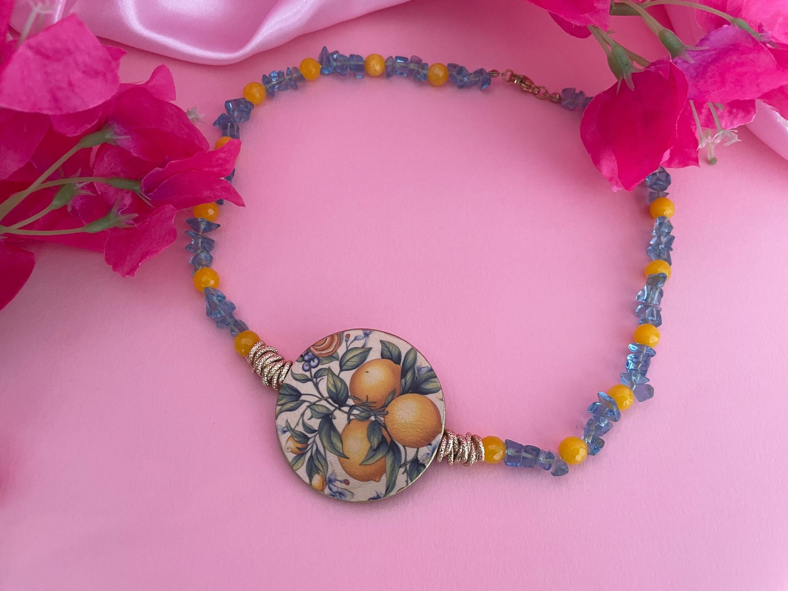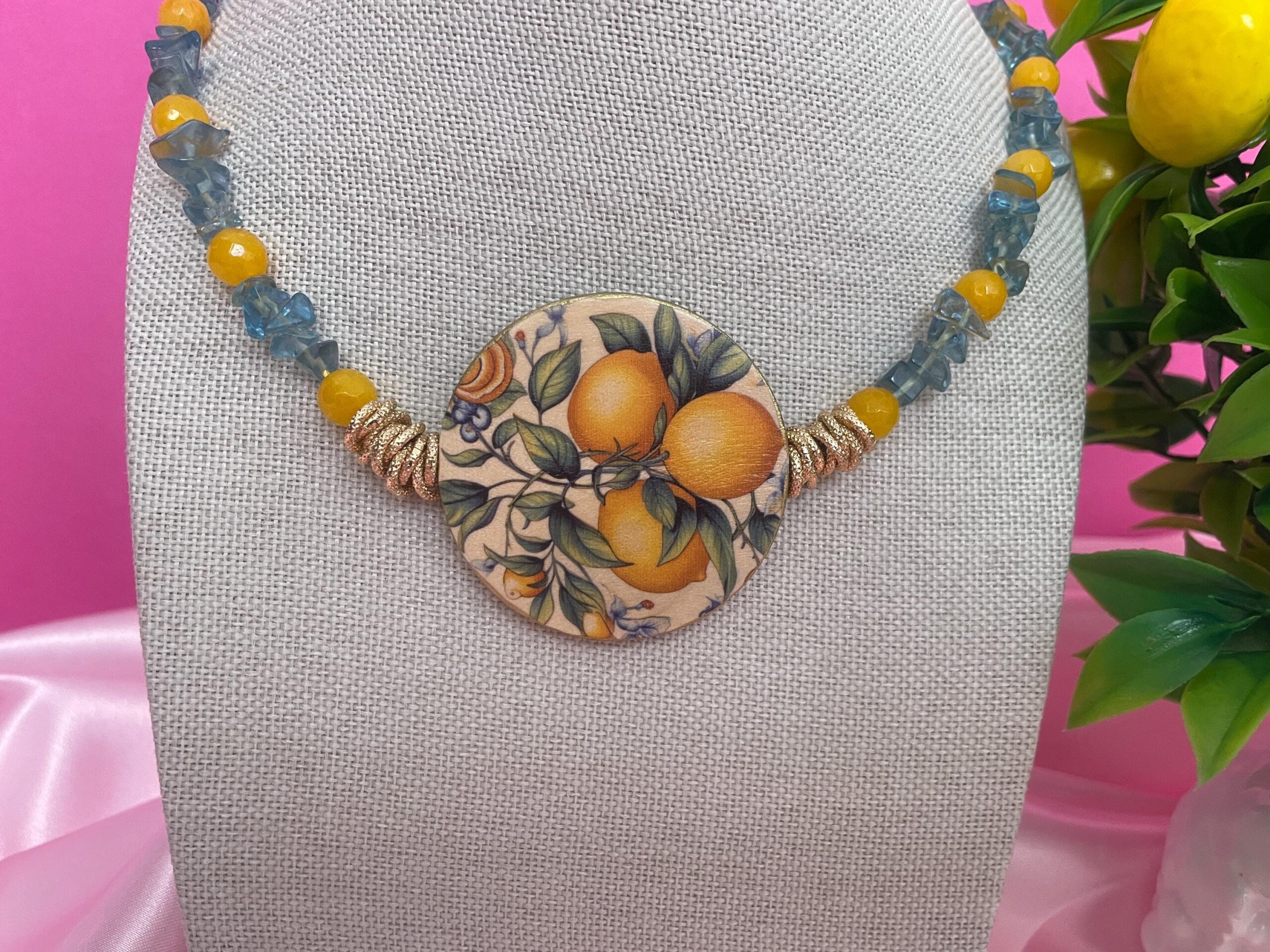 Collana di grande effetto unica nel suo genere realizzata con un filo di chips di pietra naturale azzurra e perle di Agata gialla. Un grande medaglione di legno double face, limoni su un lato e disegni geometrici sull’altro, funge da connettore.