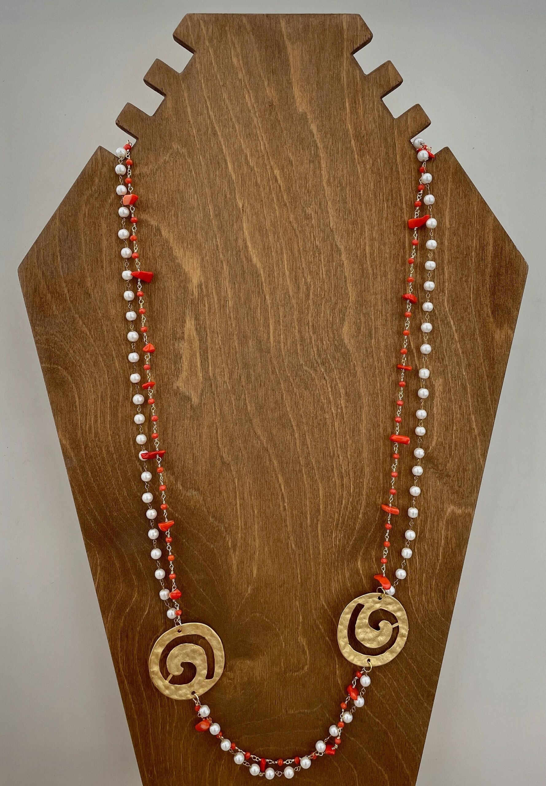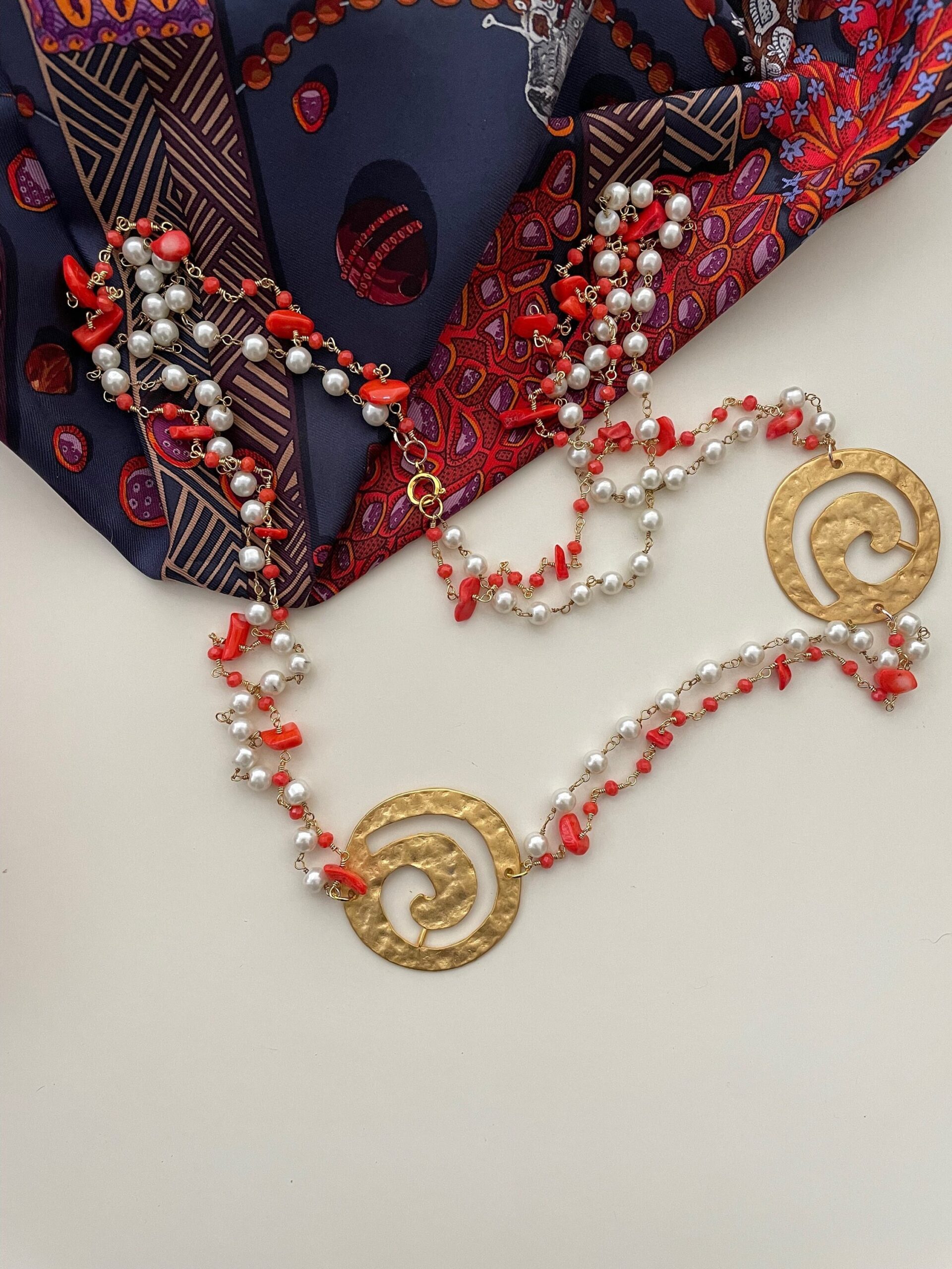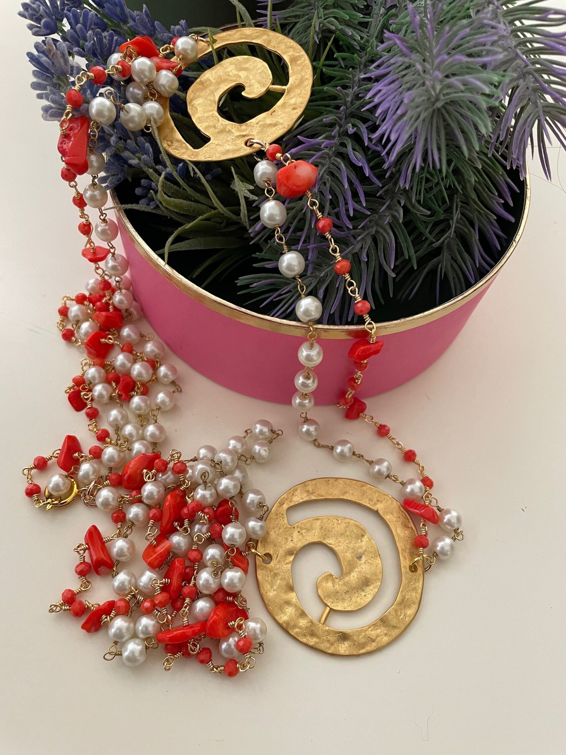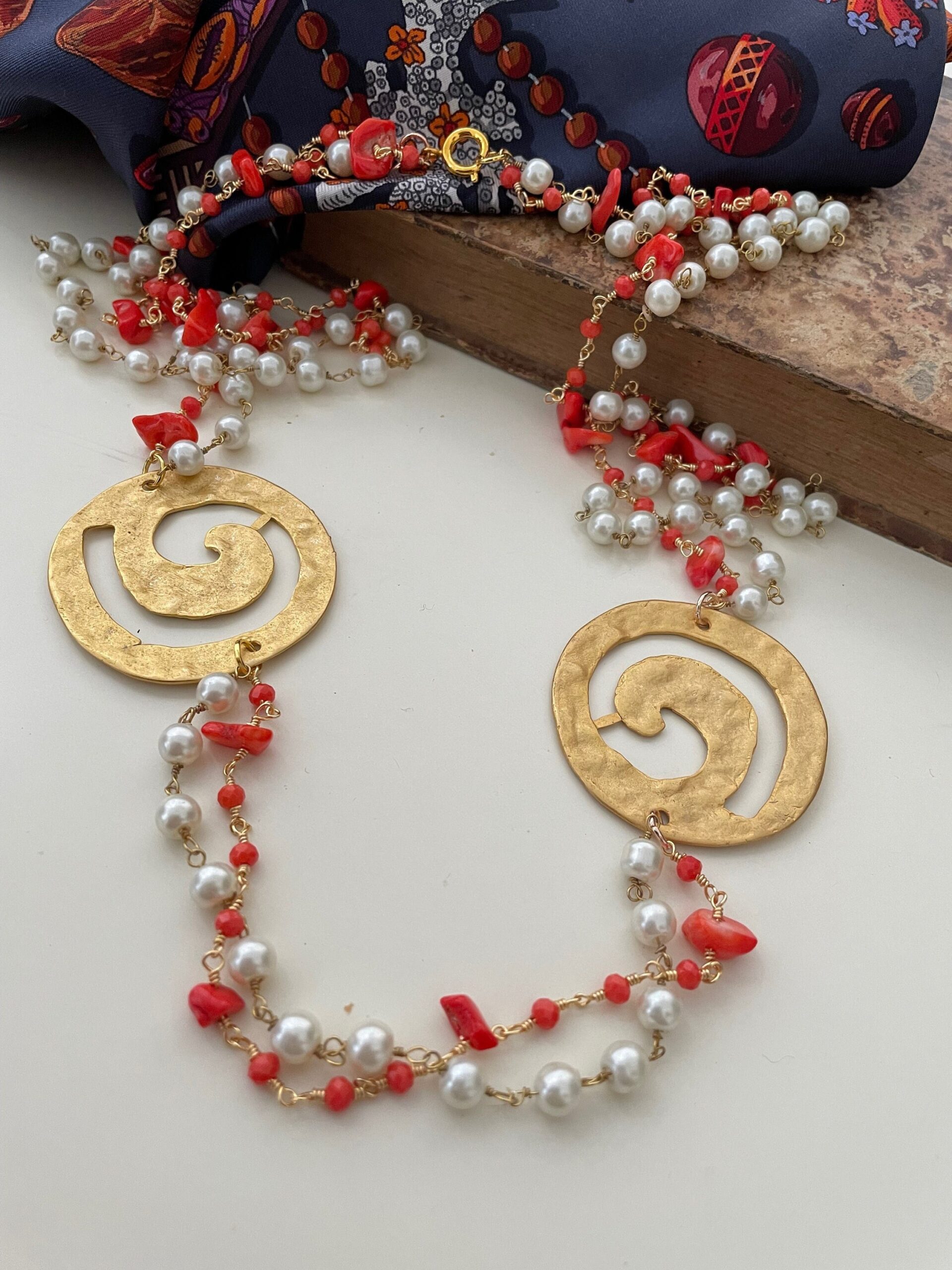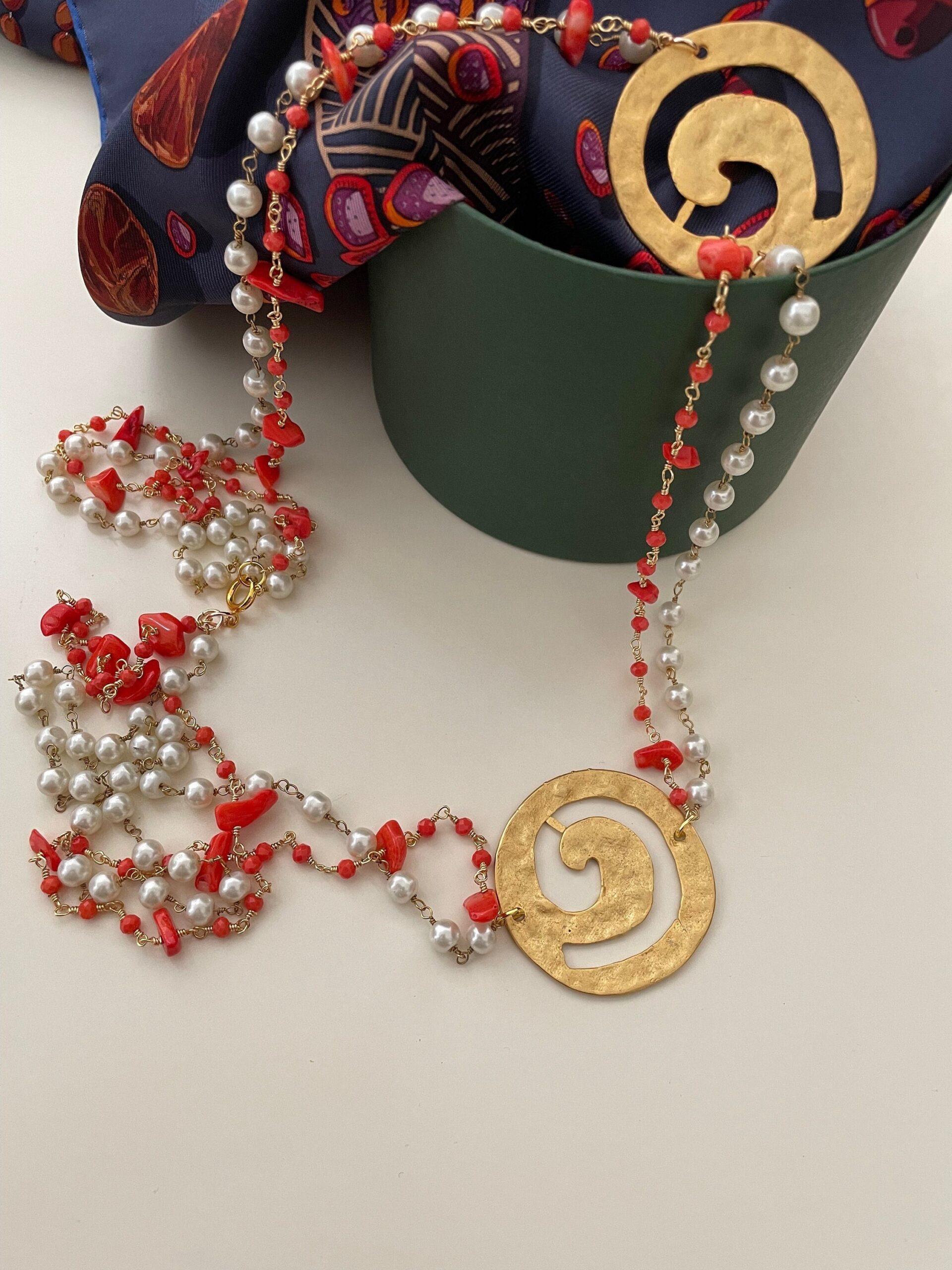 Composta da doppia catena di tipo Rosario, una con perle Maiorca e una con pezzi di corallo interrotta da due grandi connettori in ottone tondi a spirale.