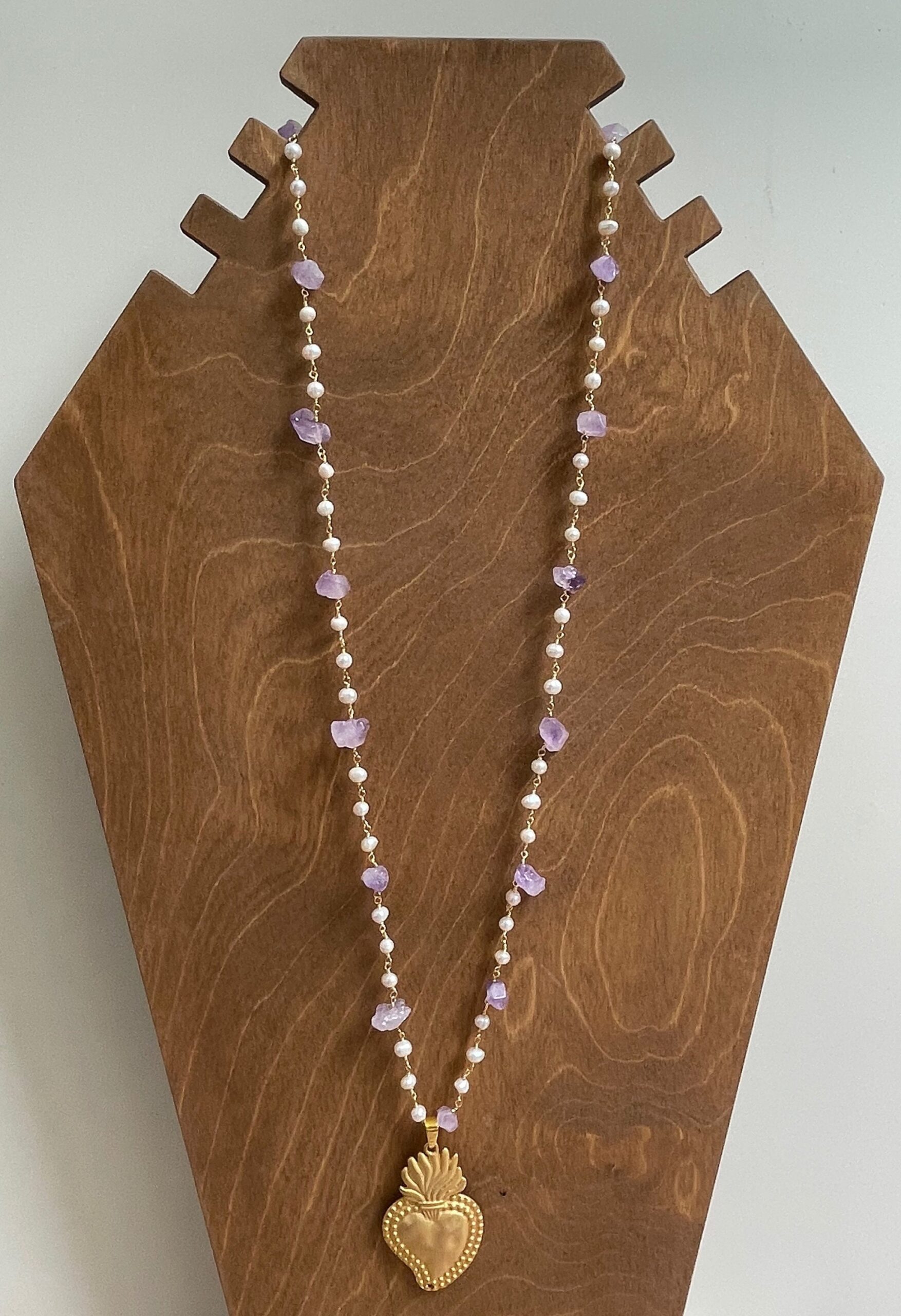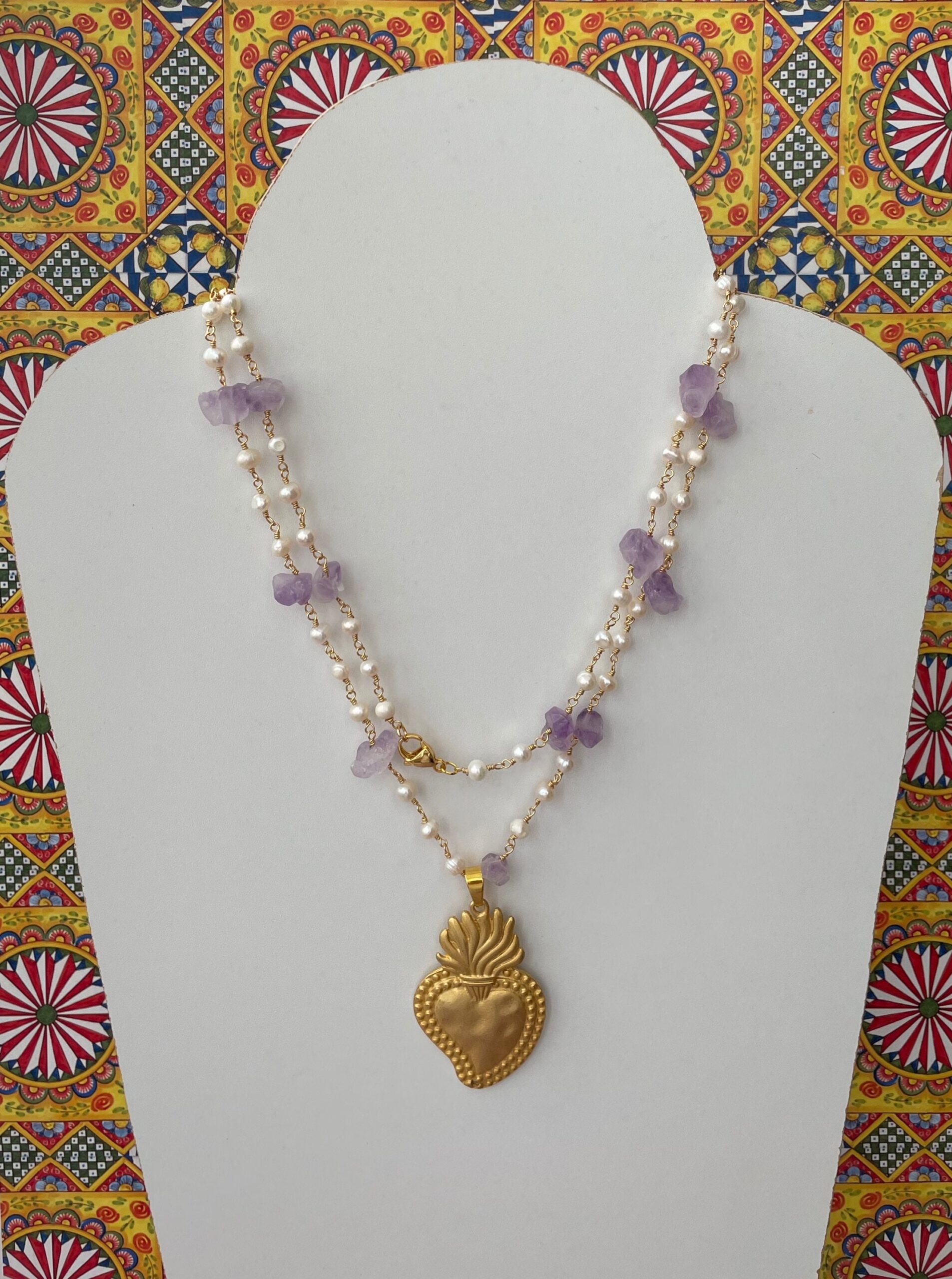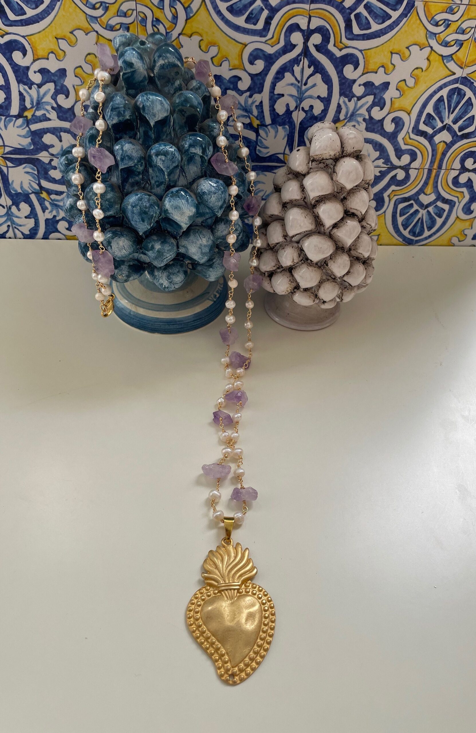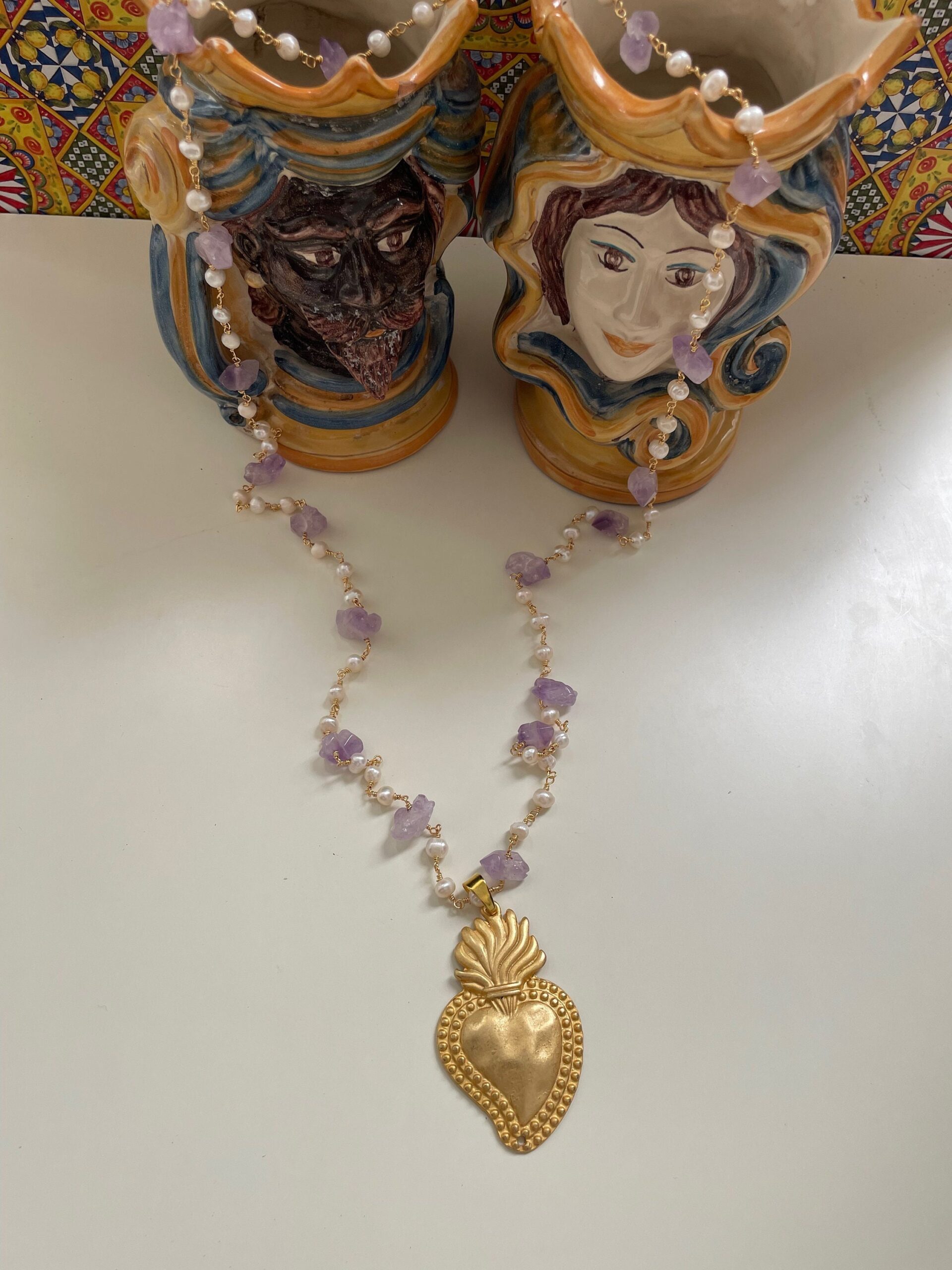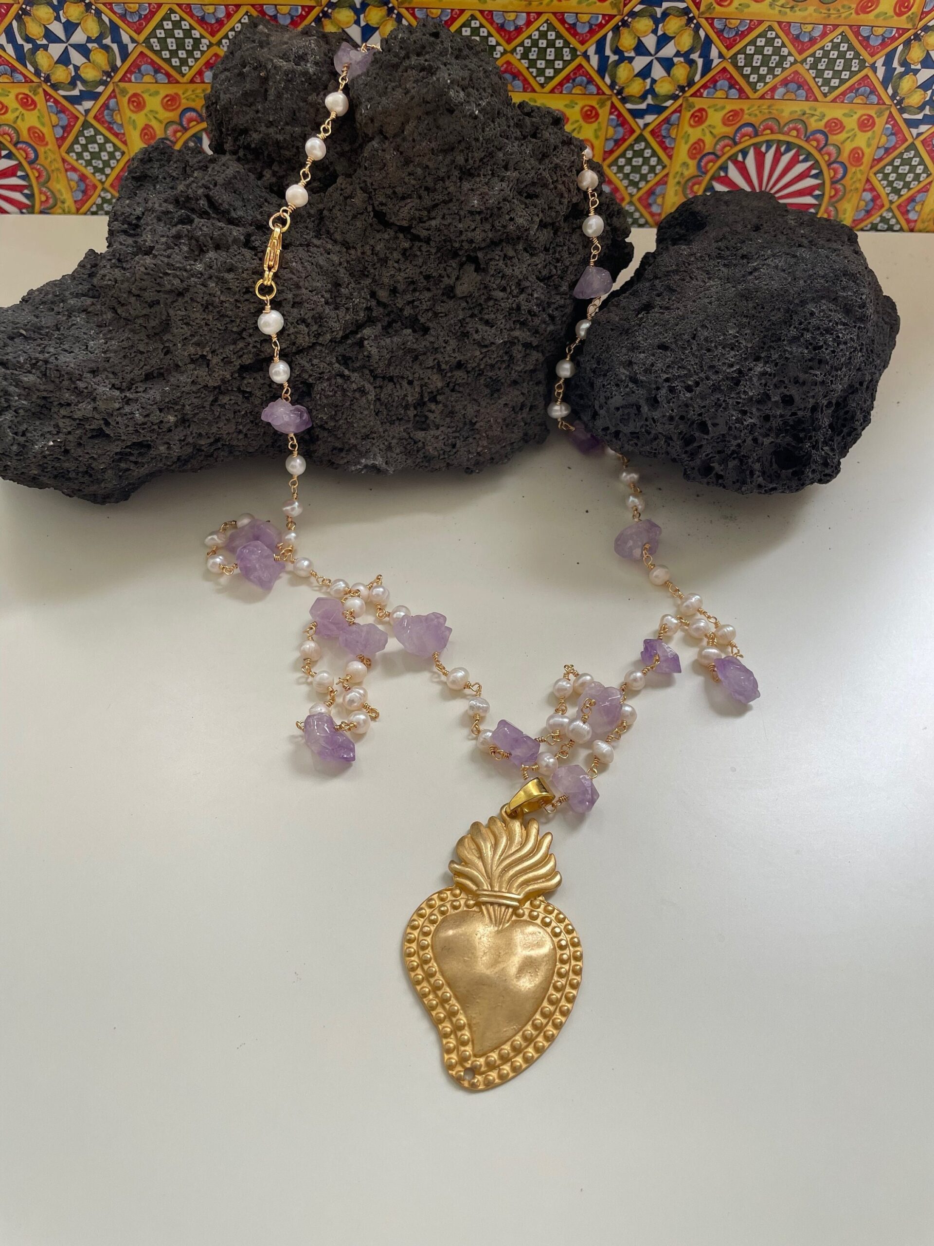 Composta da catena del tipo Rosario montata con sassi di Ametista grezza e perle di fiume.