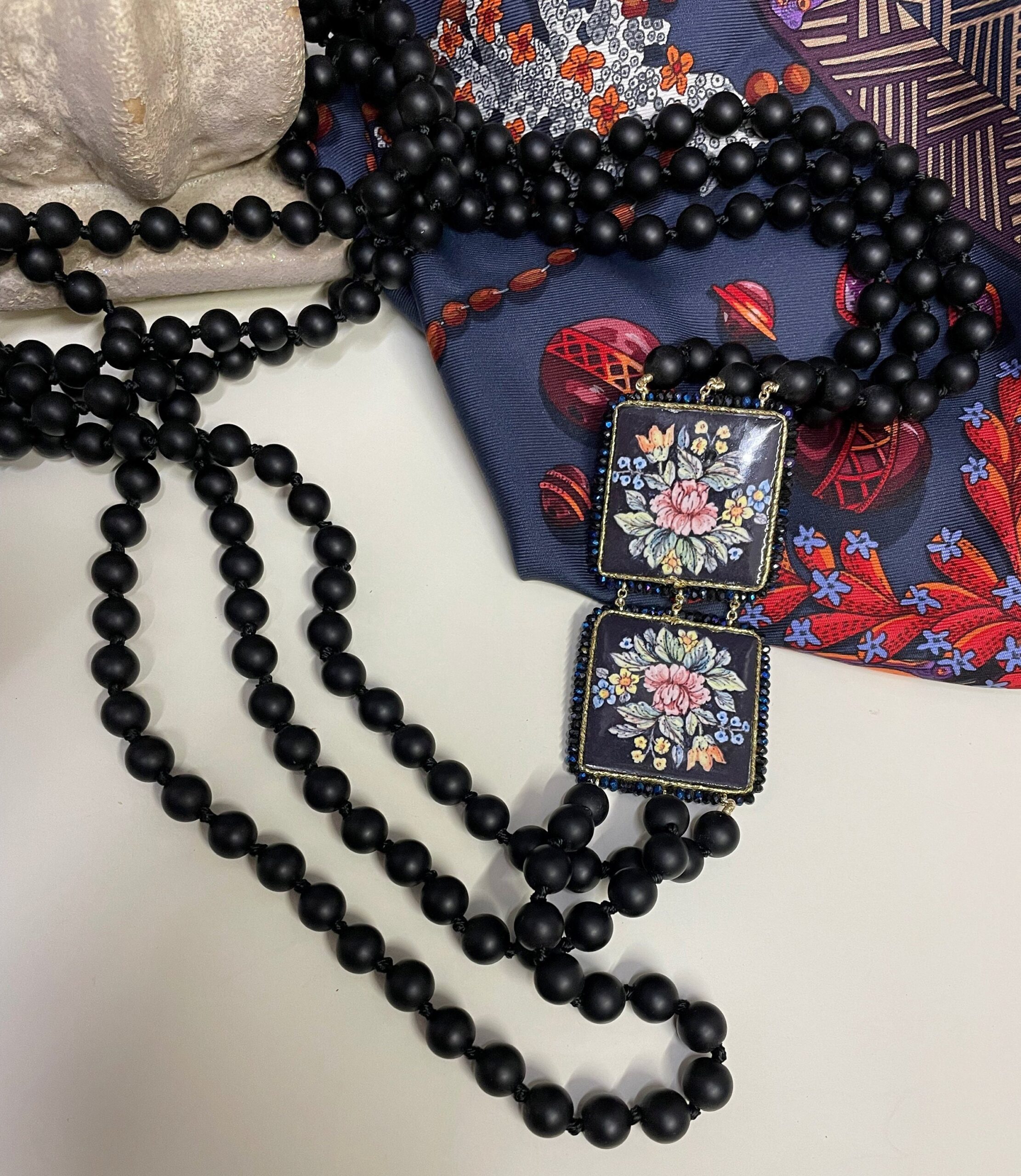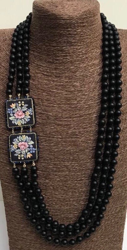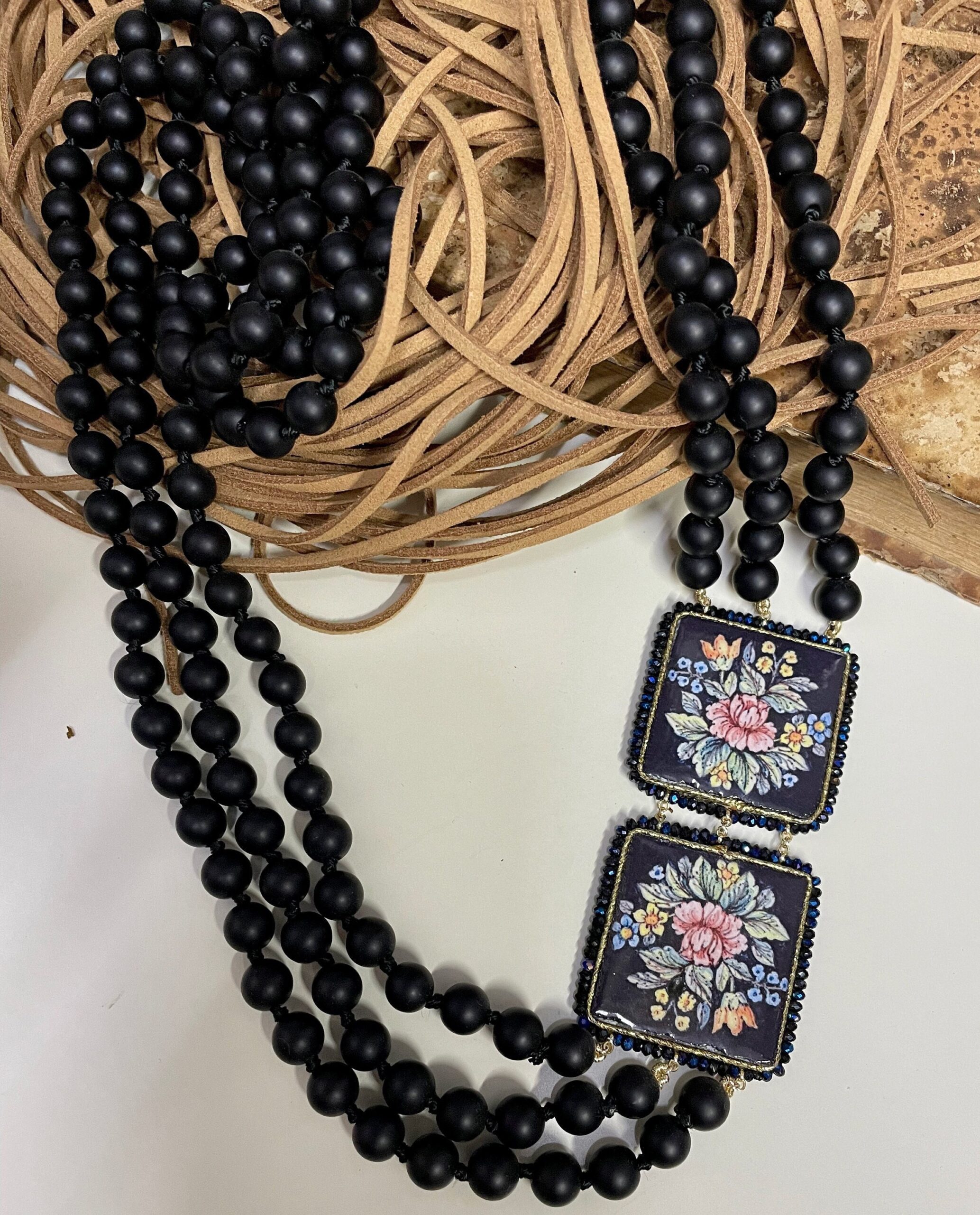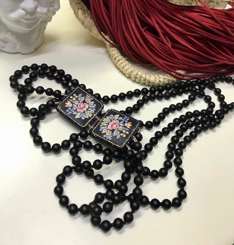Realizzata con tre fili di perle di lava liscia, singolarmente annodate e due mattonelle di Ceramica di Caltagirone, stampate in superficie, a motivi floreali su fondo nero.