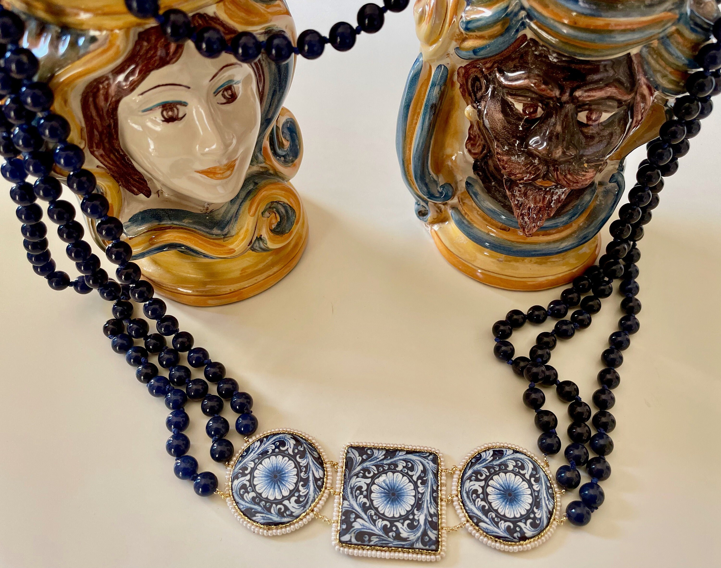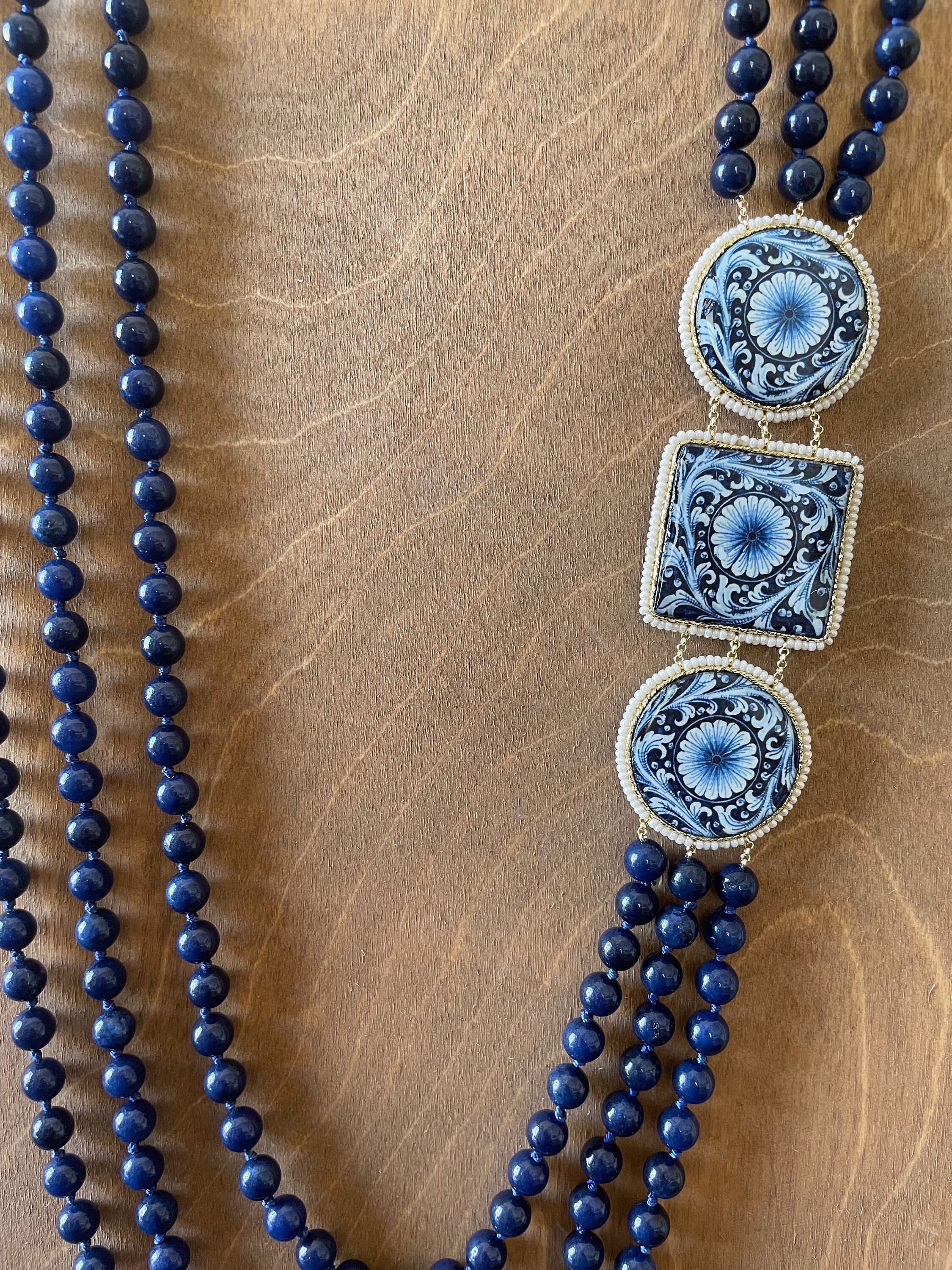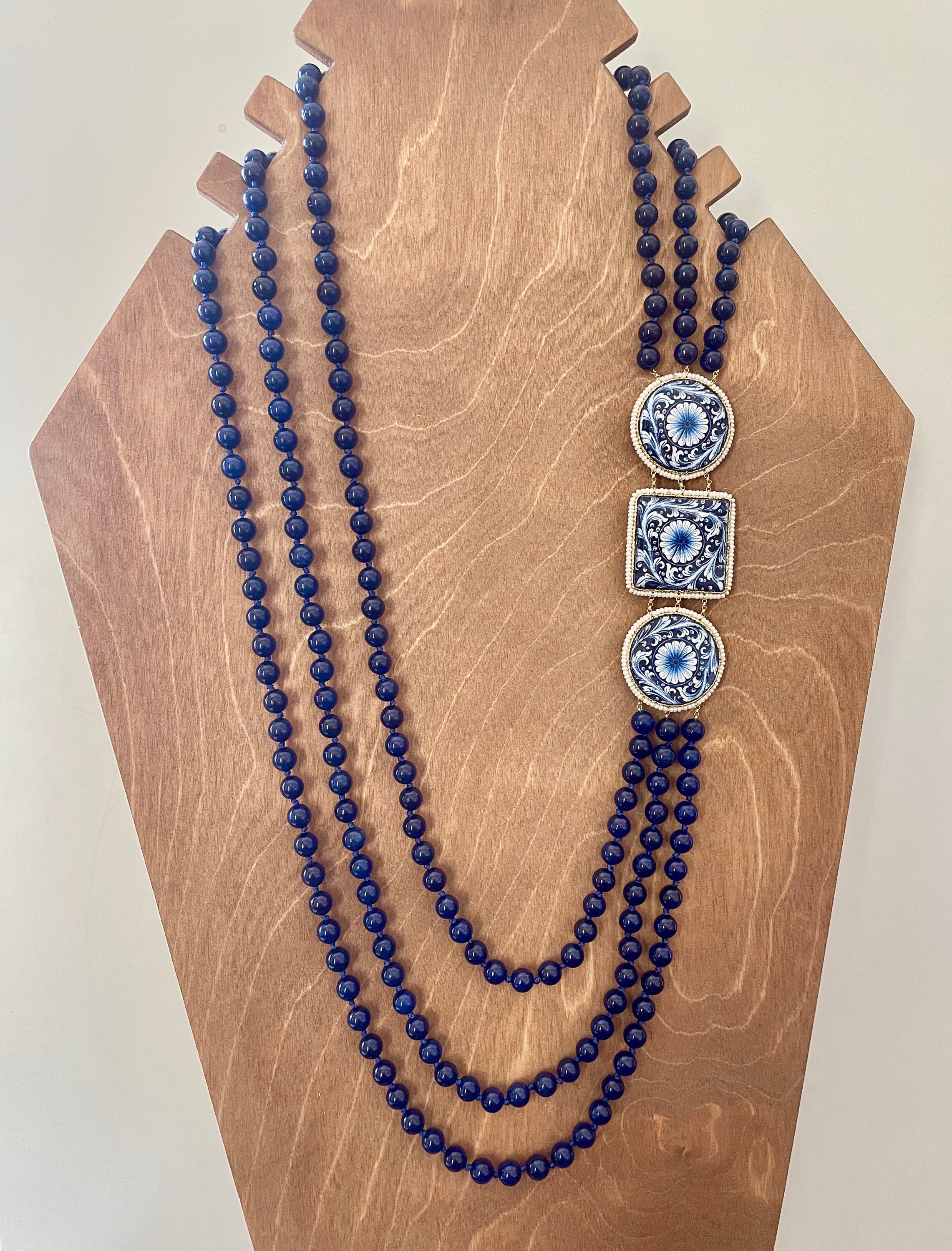 Elegante collana siciliana, realizzata con tre fili di perle di Giada blu zaffiro, singolarmente annodate.