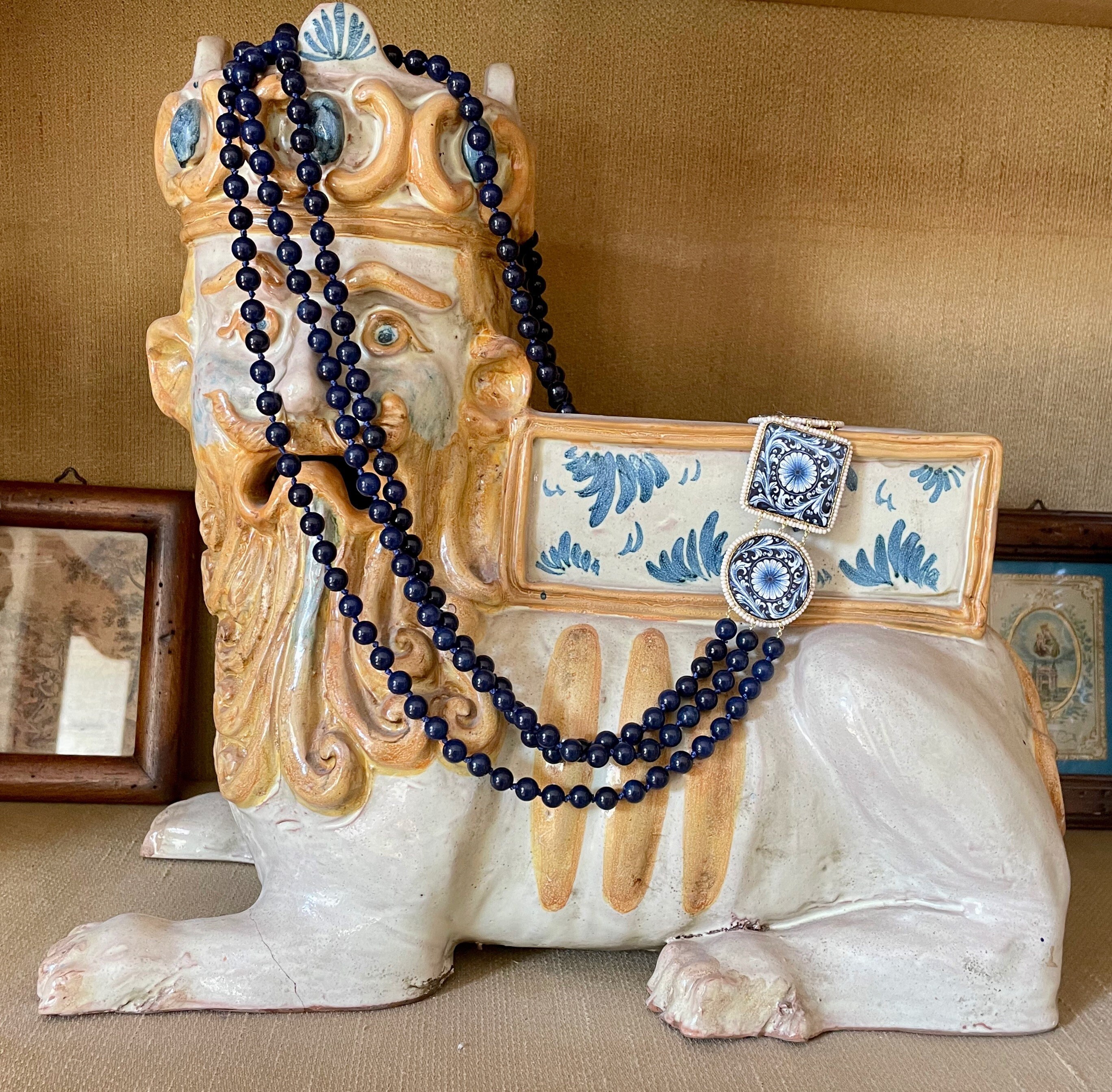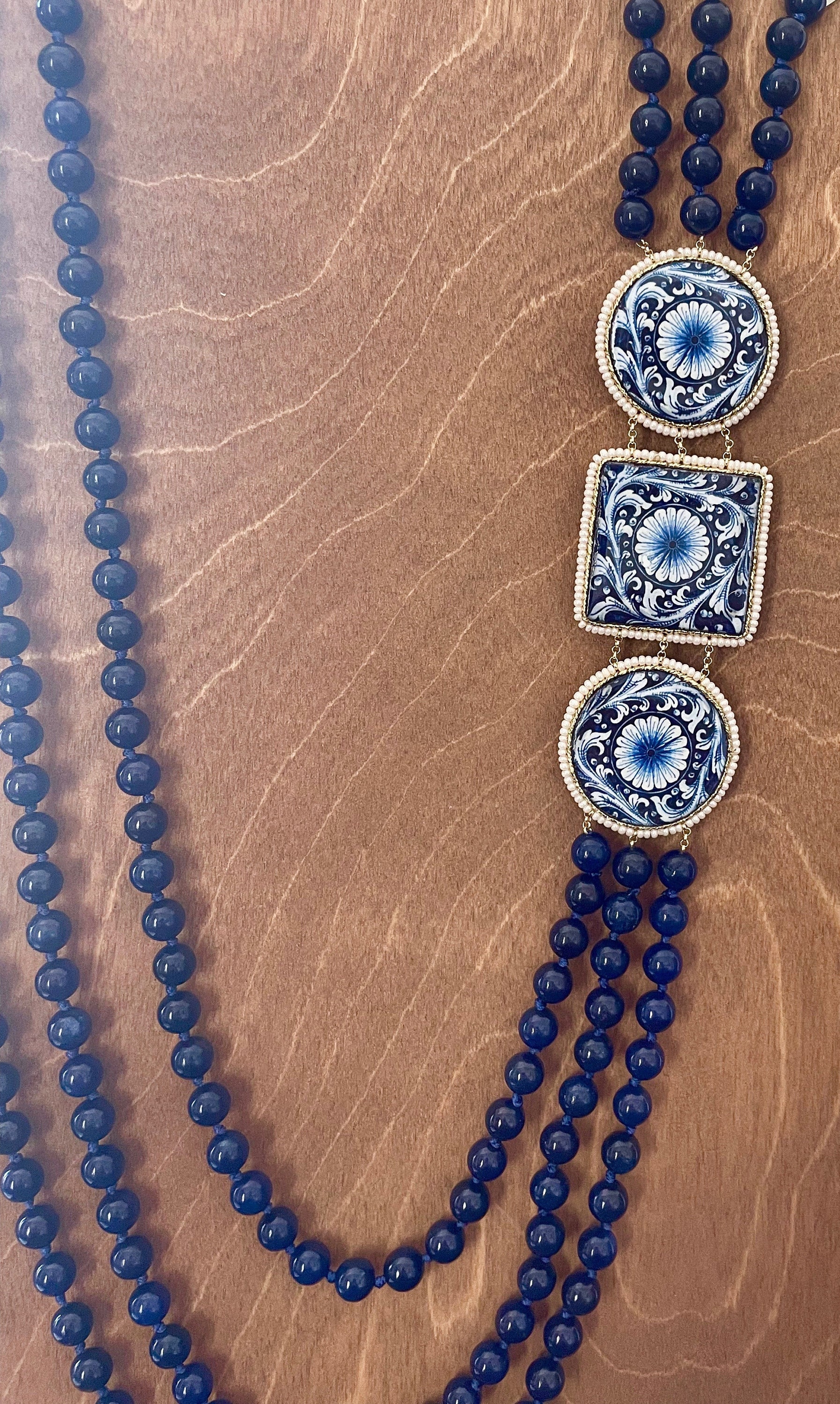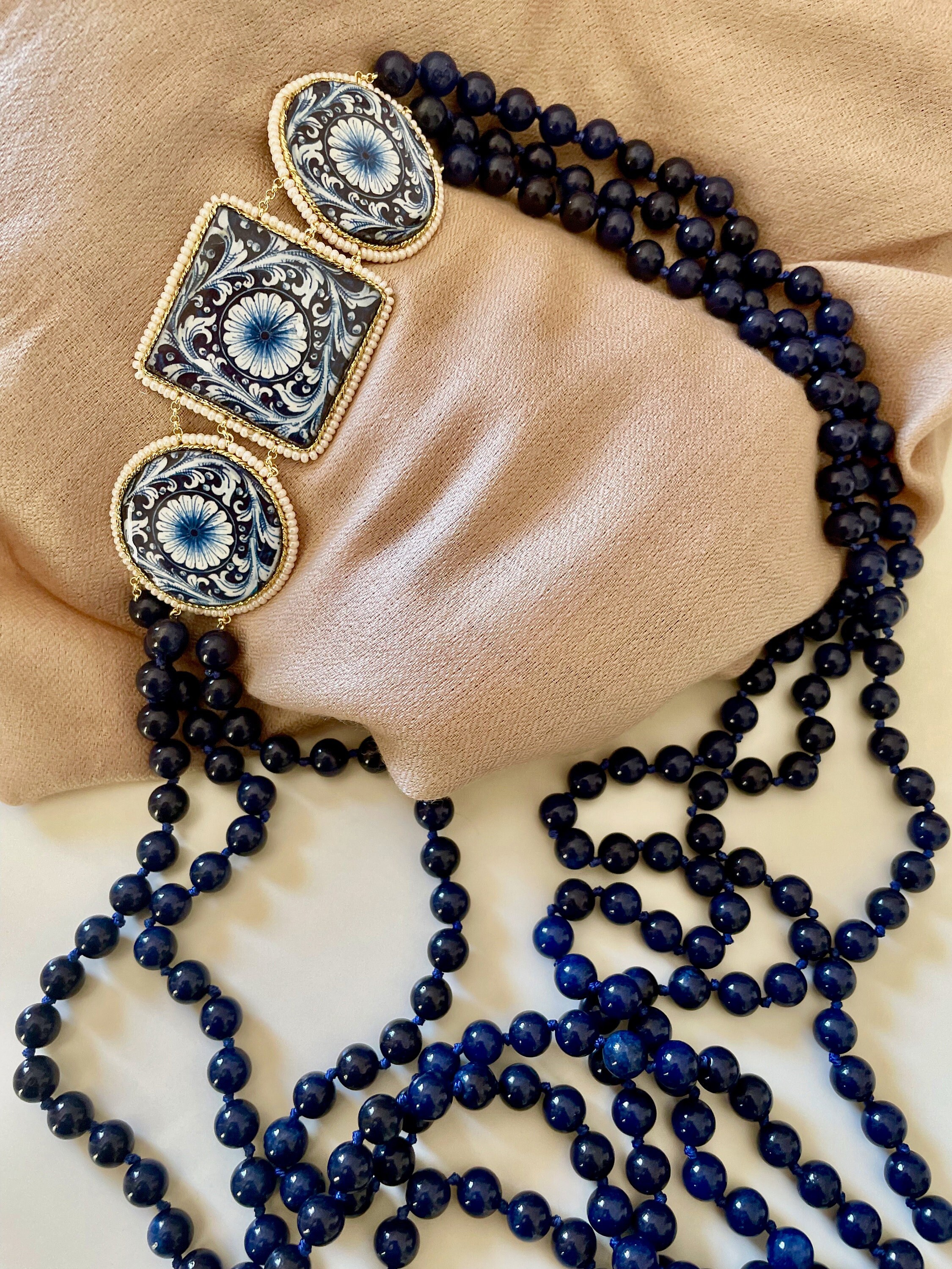Elegante collana siciliana, realizzata con tre fili di perle di Giada blu zaffiro, singolarmente annodate.