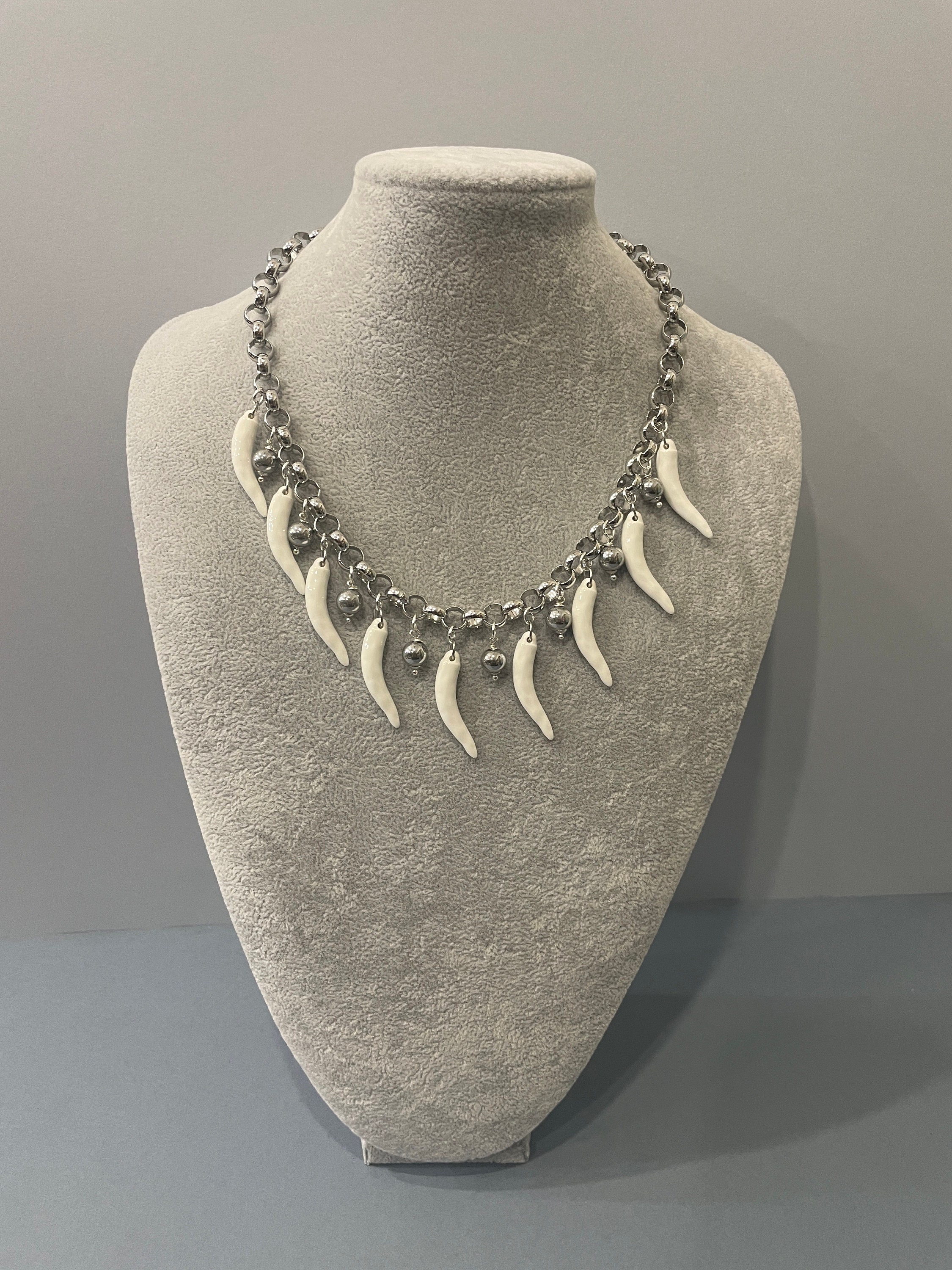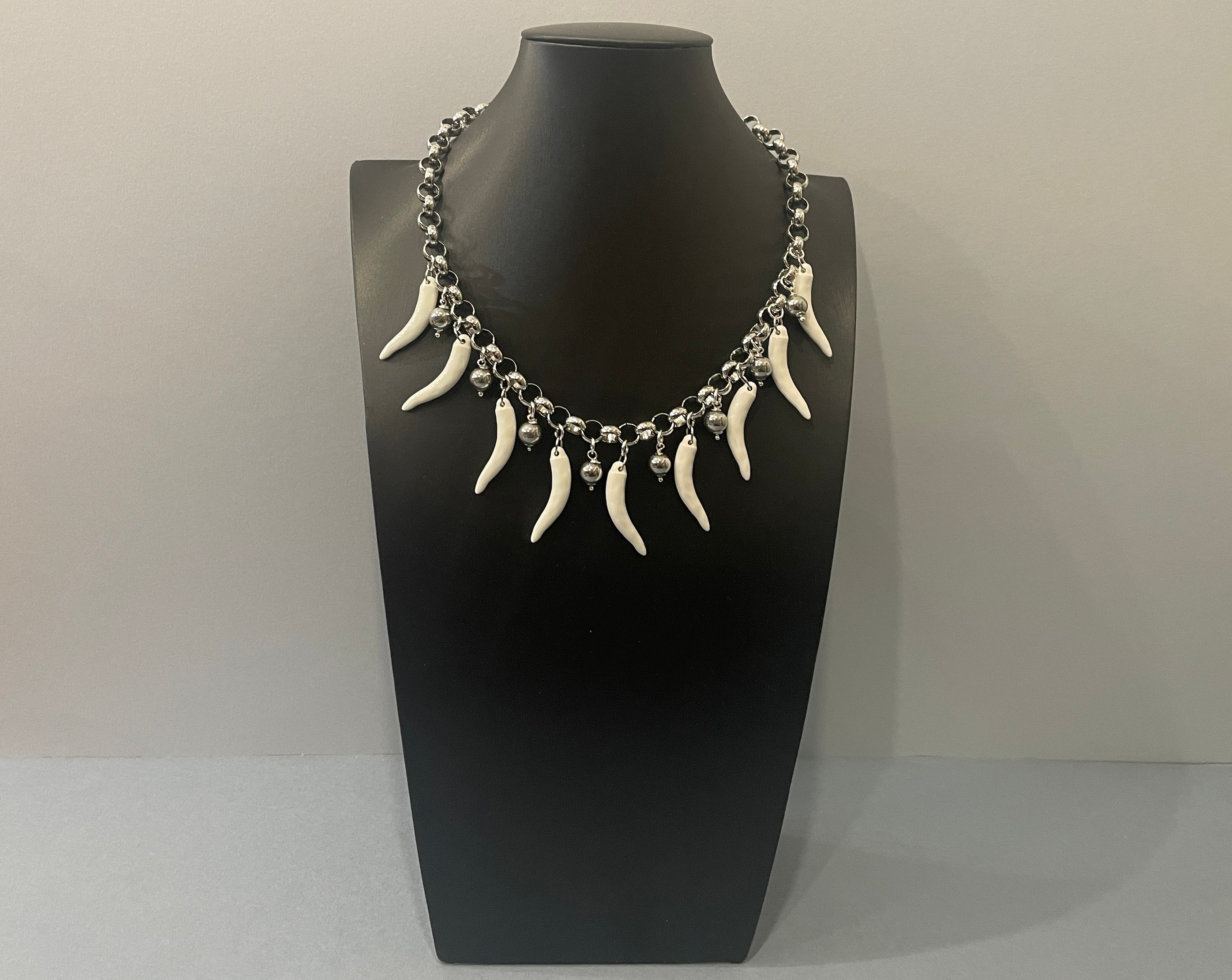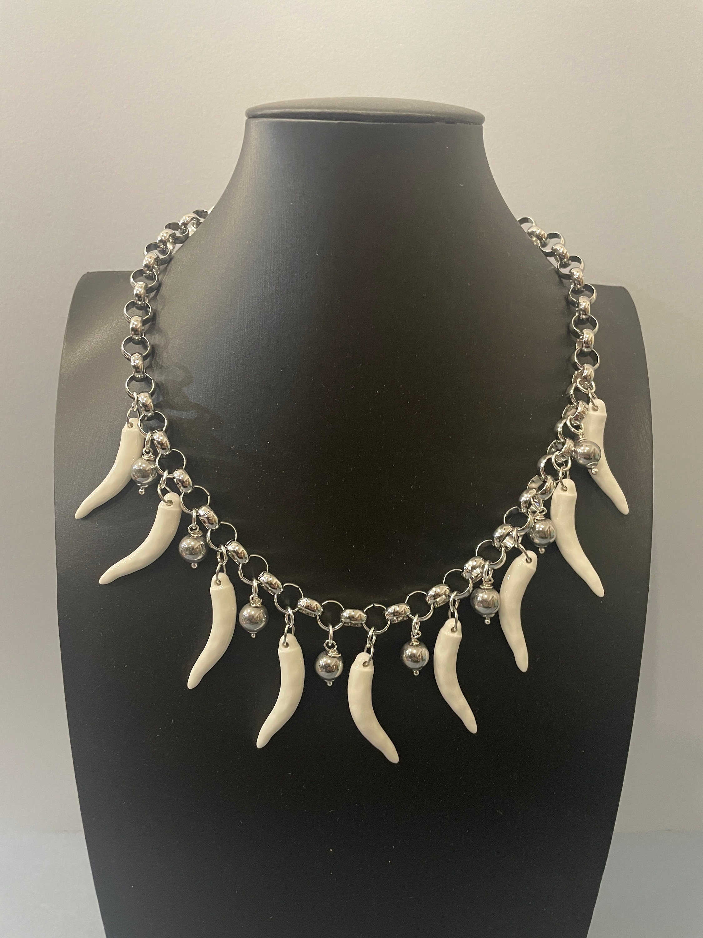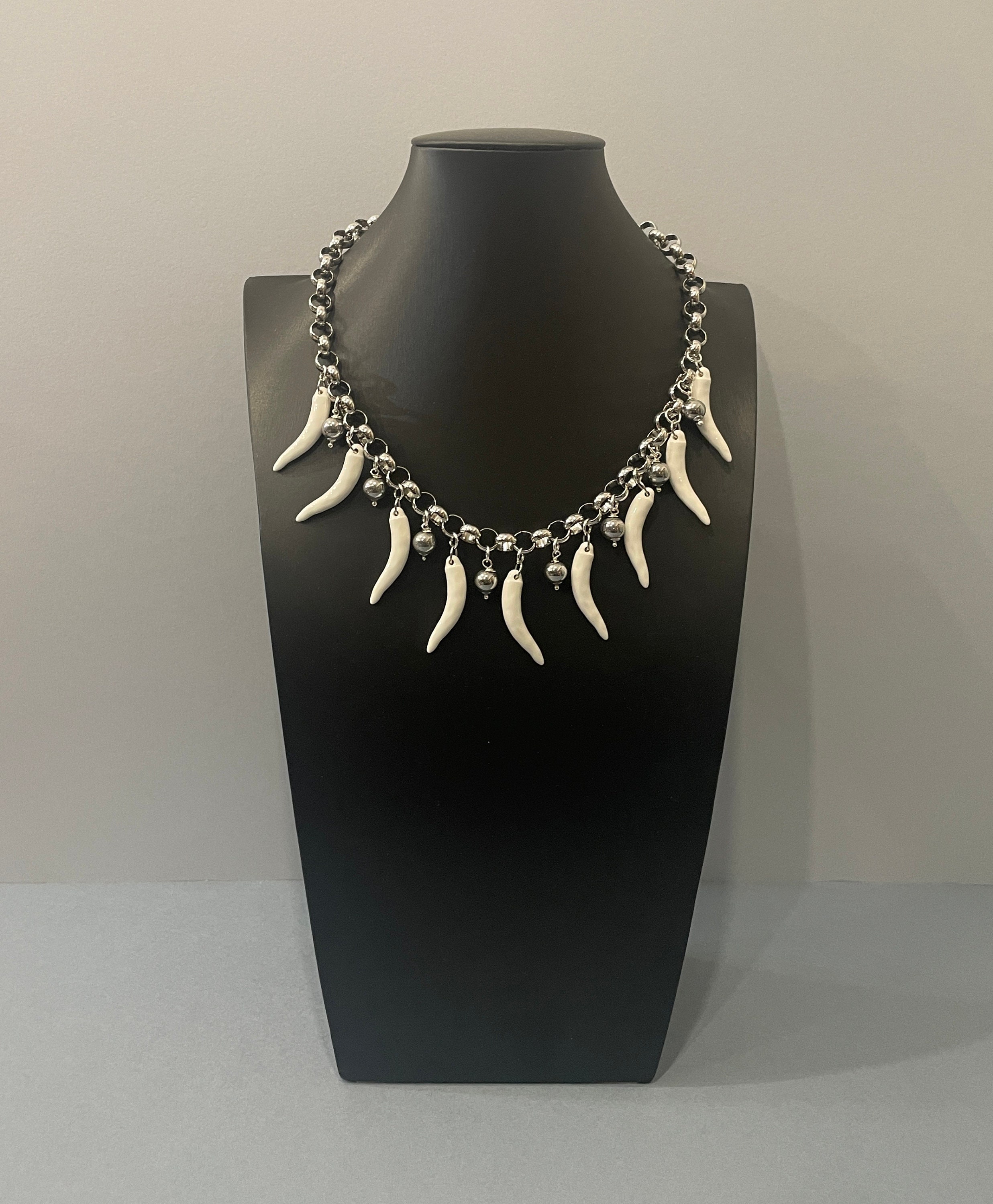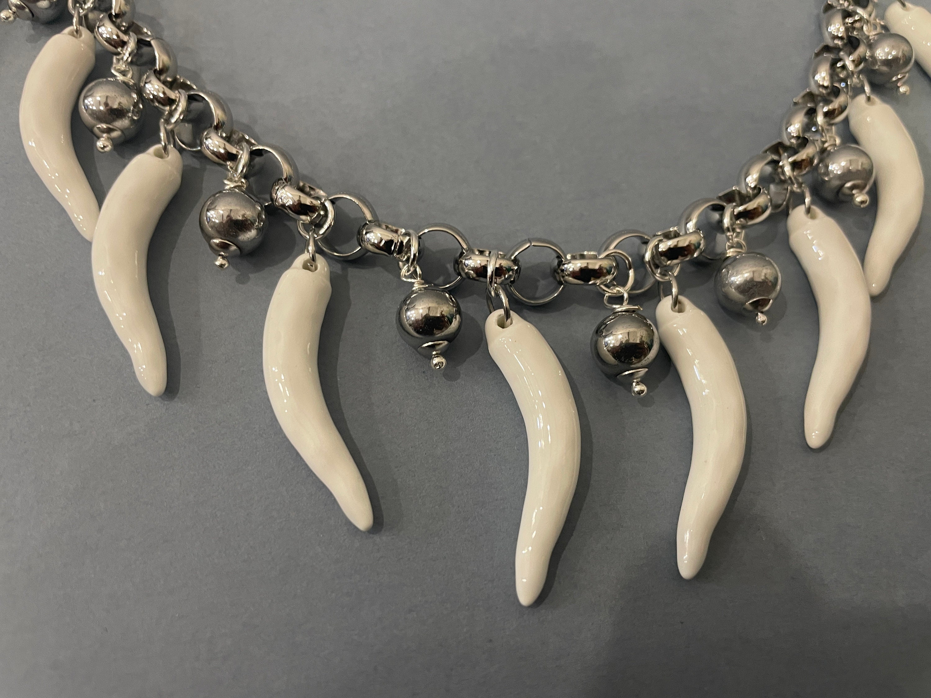 Nove ciondoli di ceramica di Caltagirone a forma di piccoli corni della Fortuna di colore bianco pendono dalla catena alternati a sfere di ematite grigia.