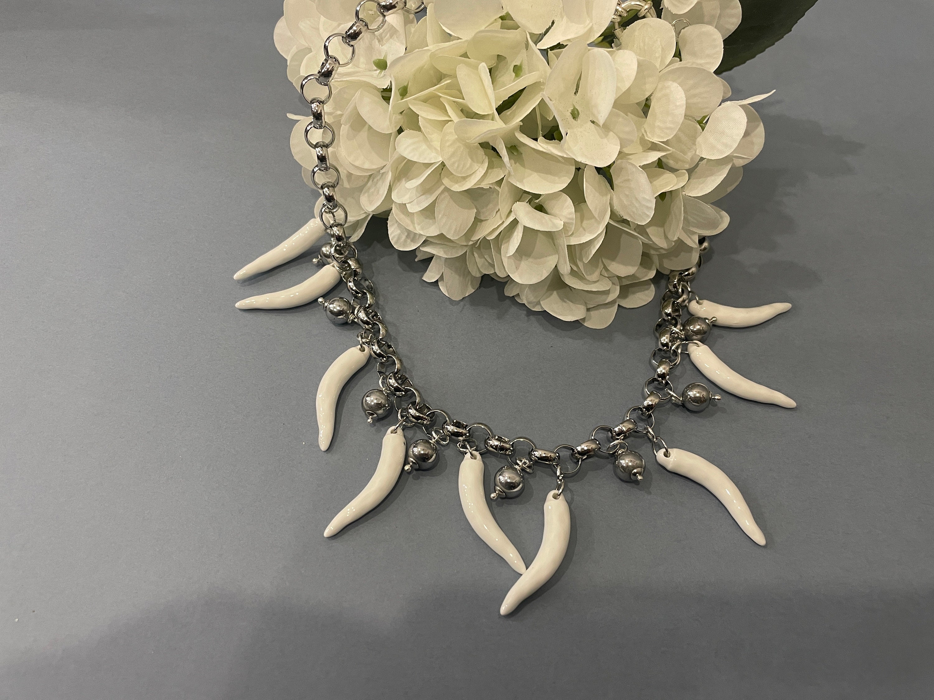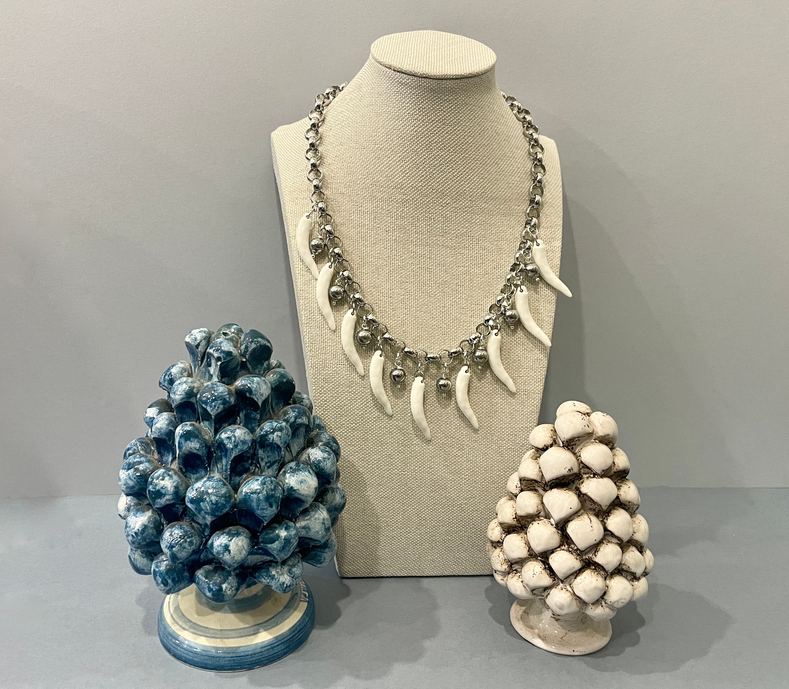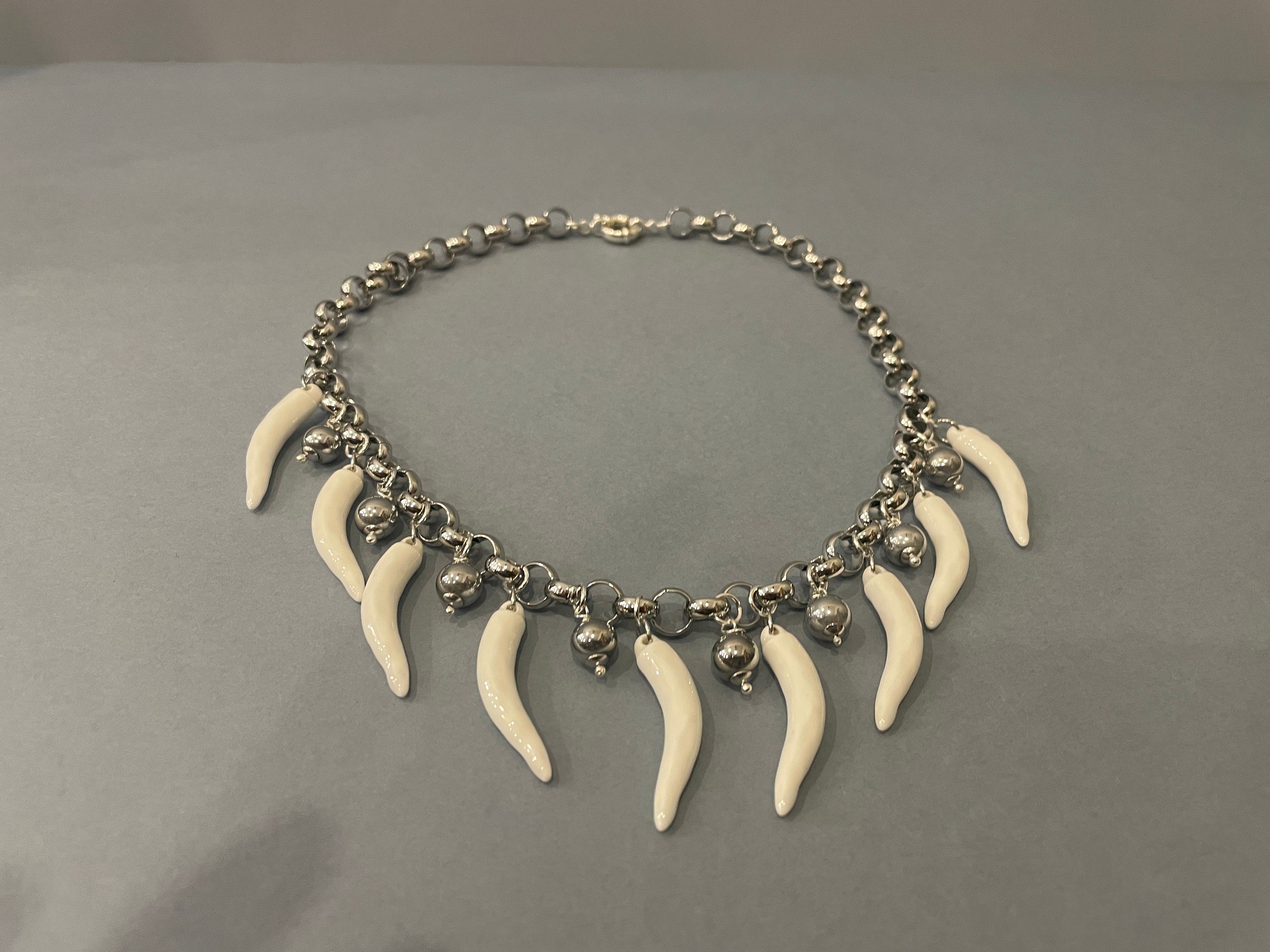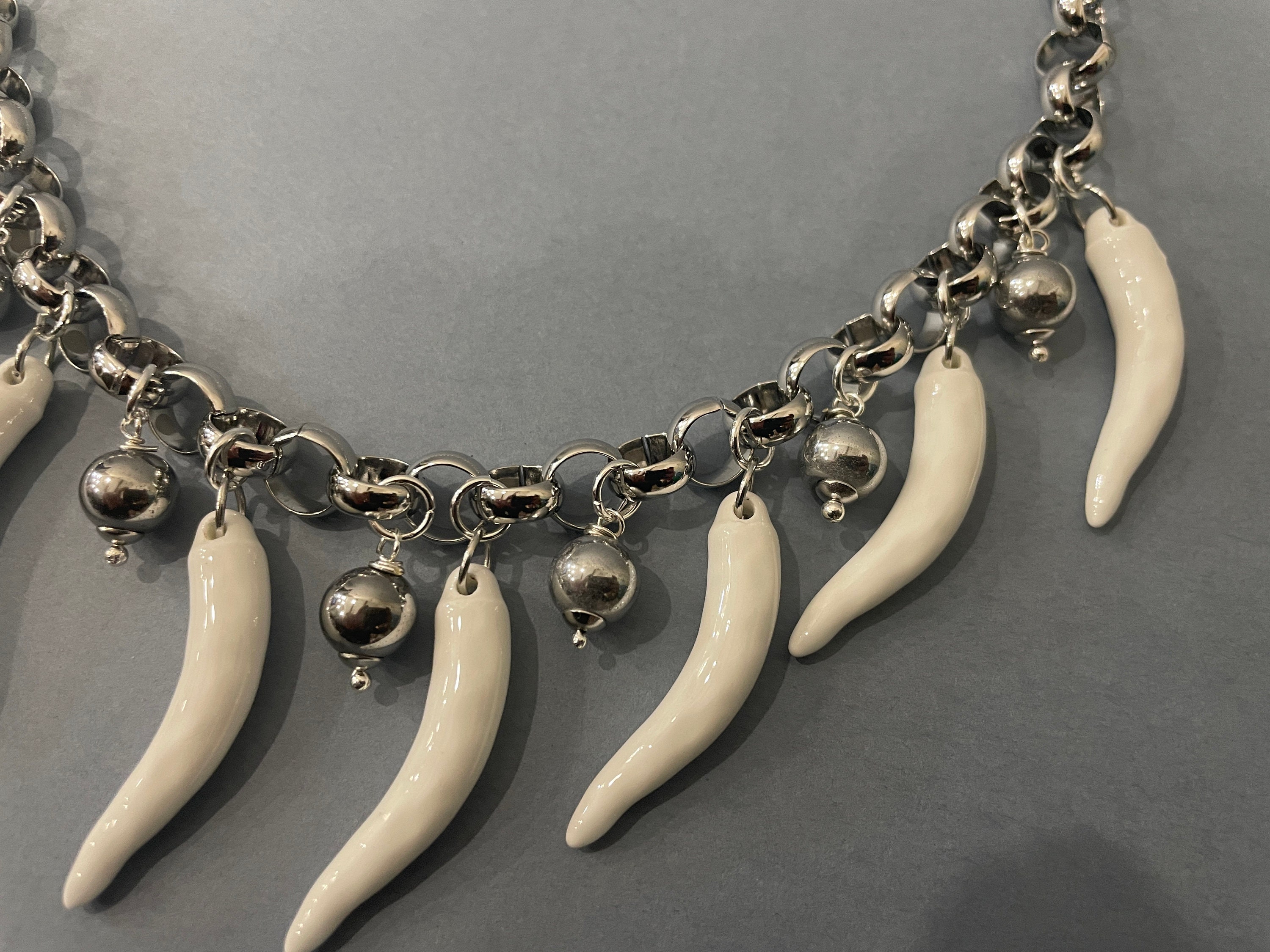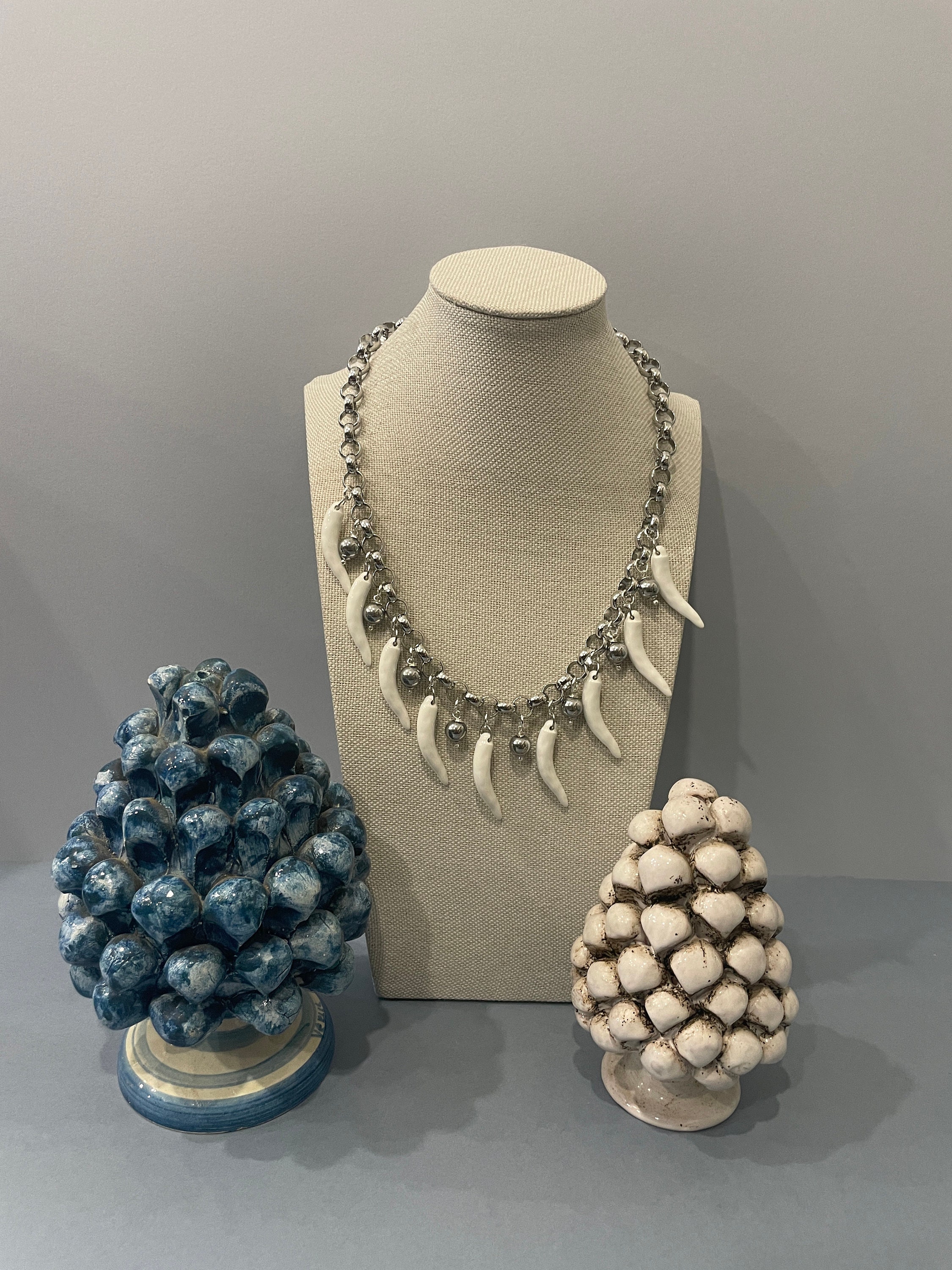 Nove ciondoli di ceramica di Caltagirone a forma di piccoli corni della Fortuna di colore bianco pendono dalla catena alternati a sfere di ematite grigia.