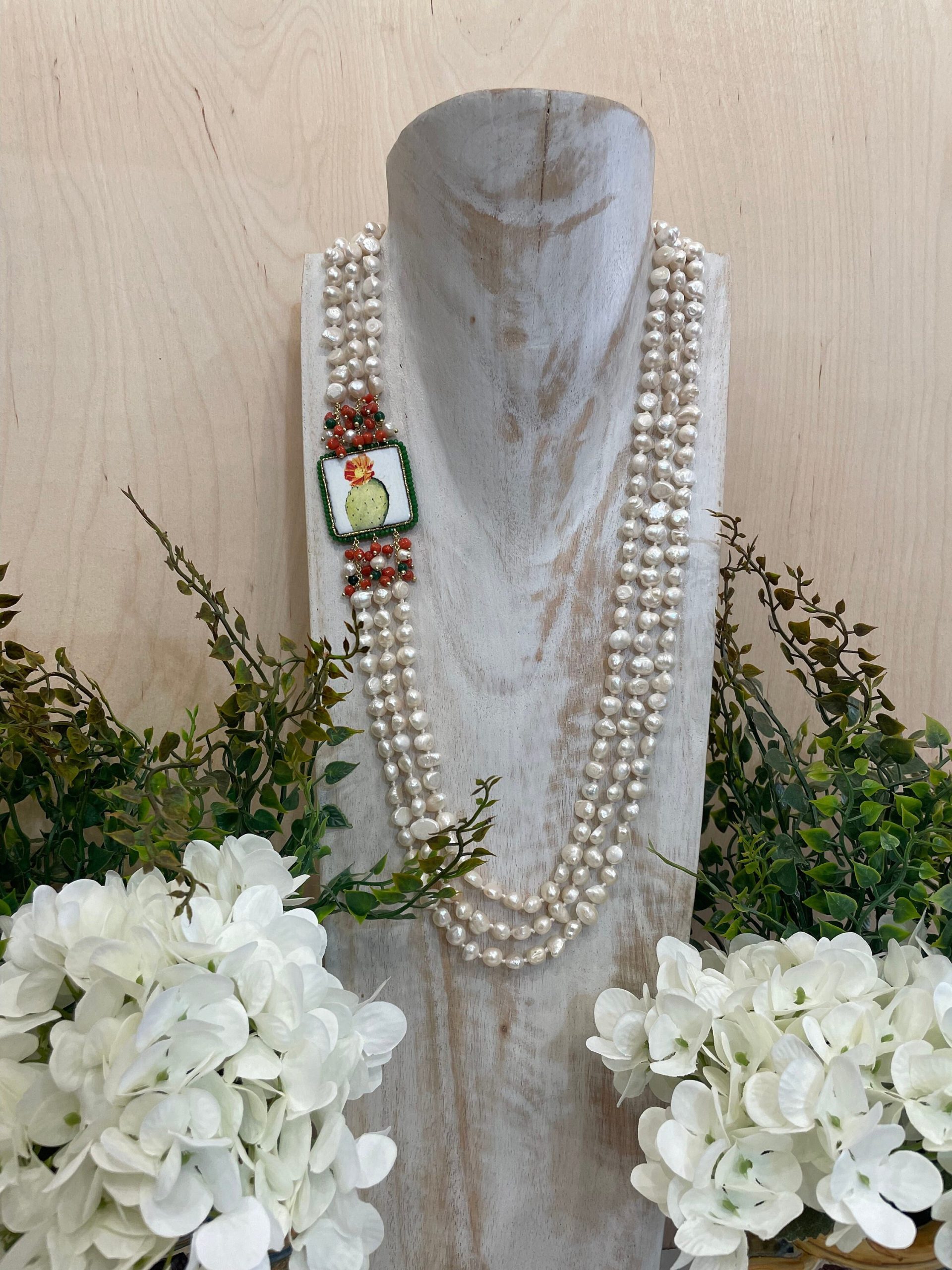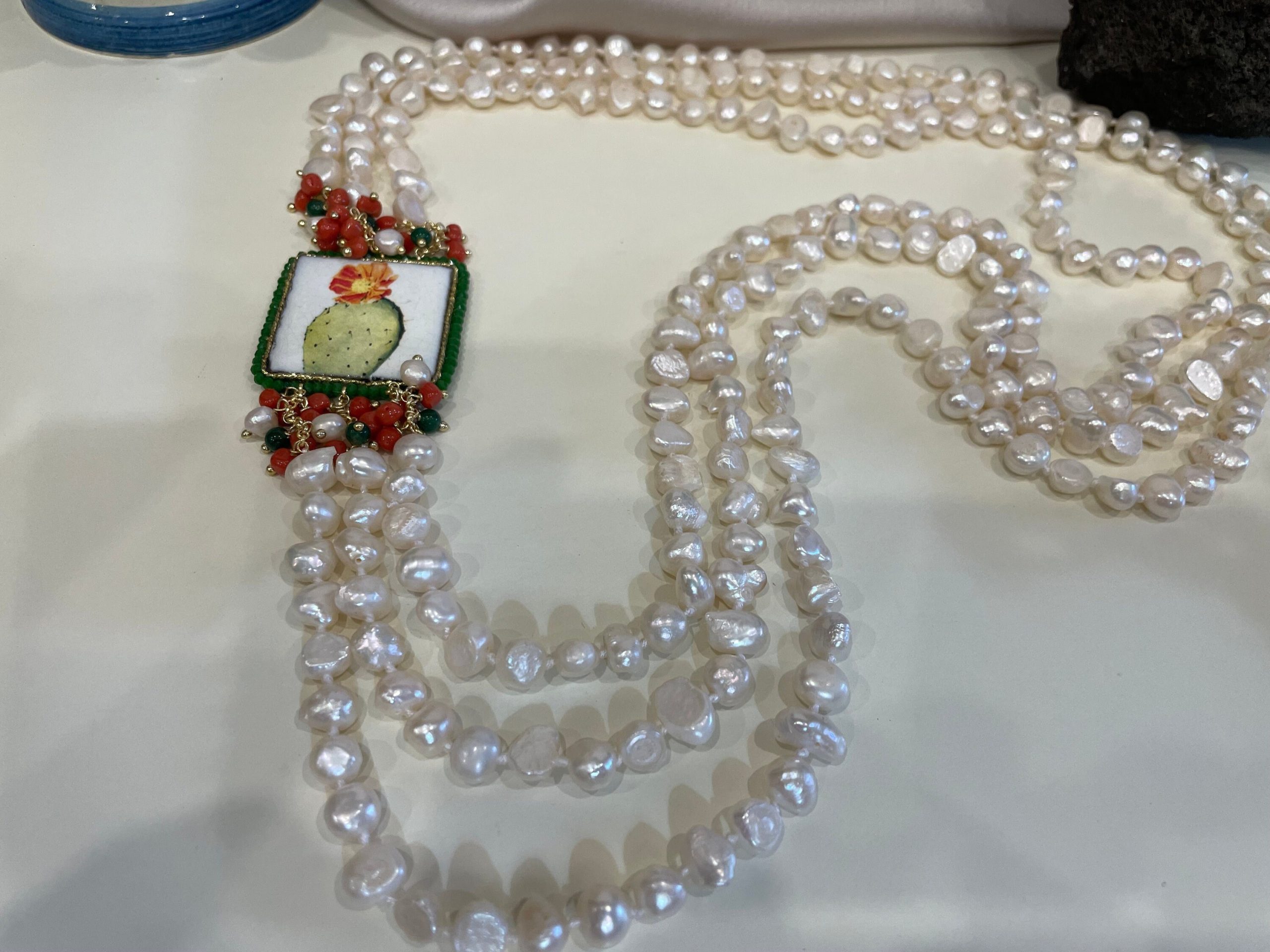 Splendida collana dallo stile tutto siciliano realizzata con tre fili di perle di fiume singolarmente annodate.