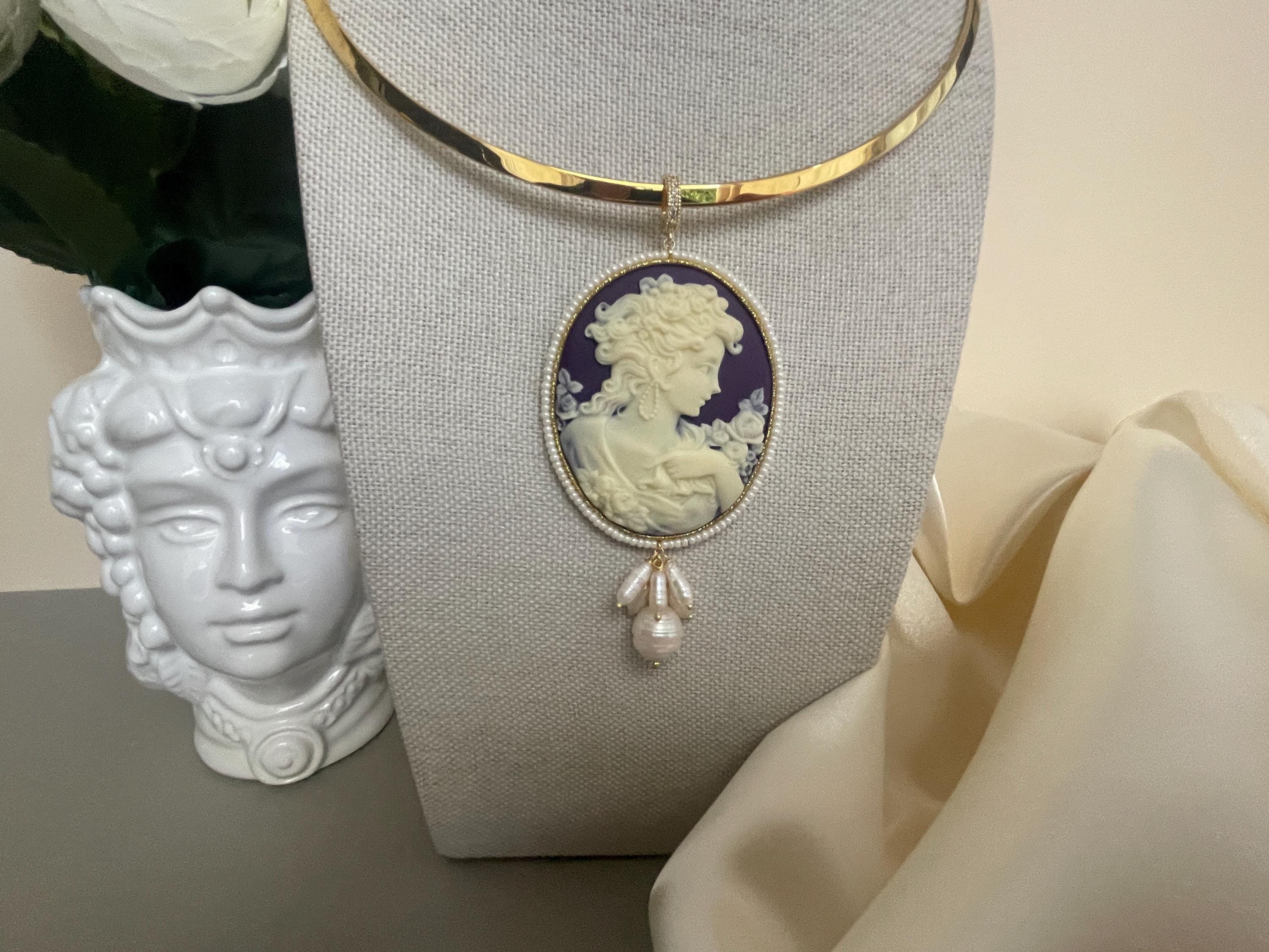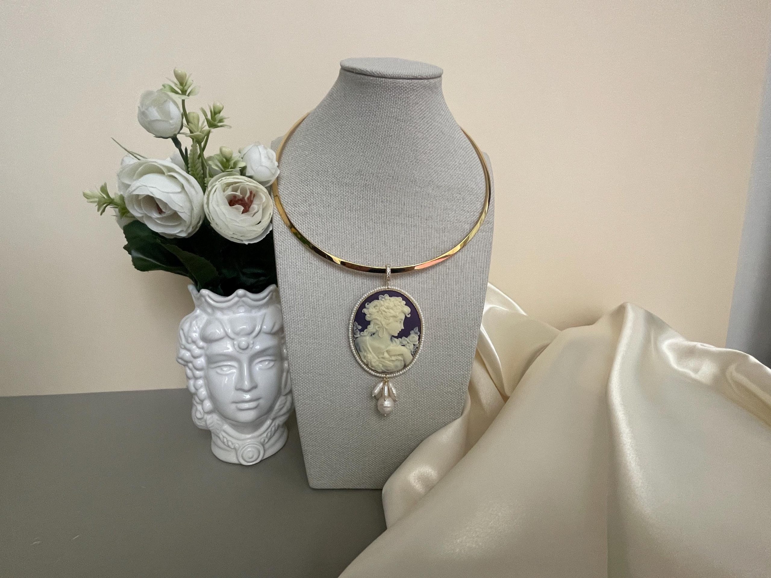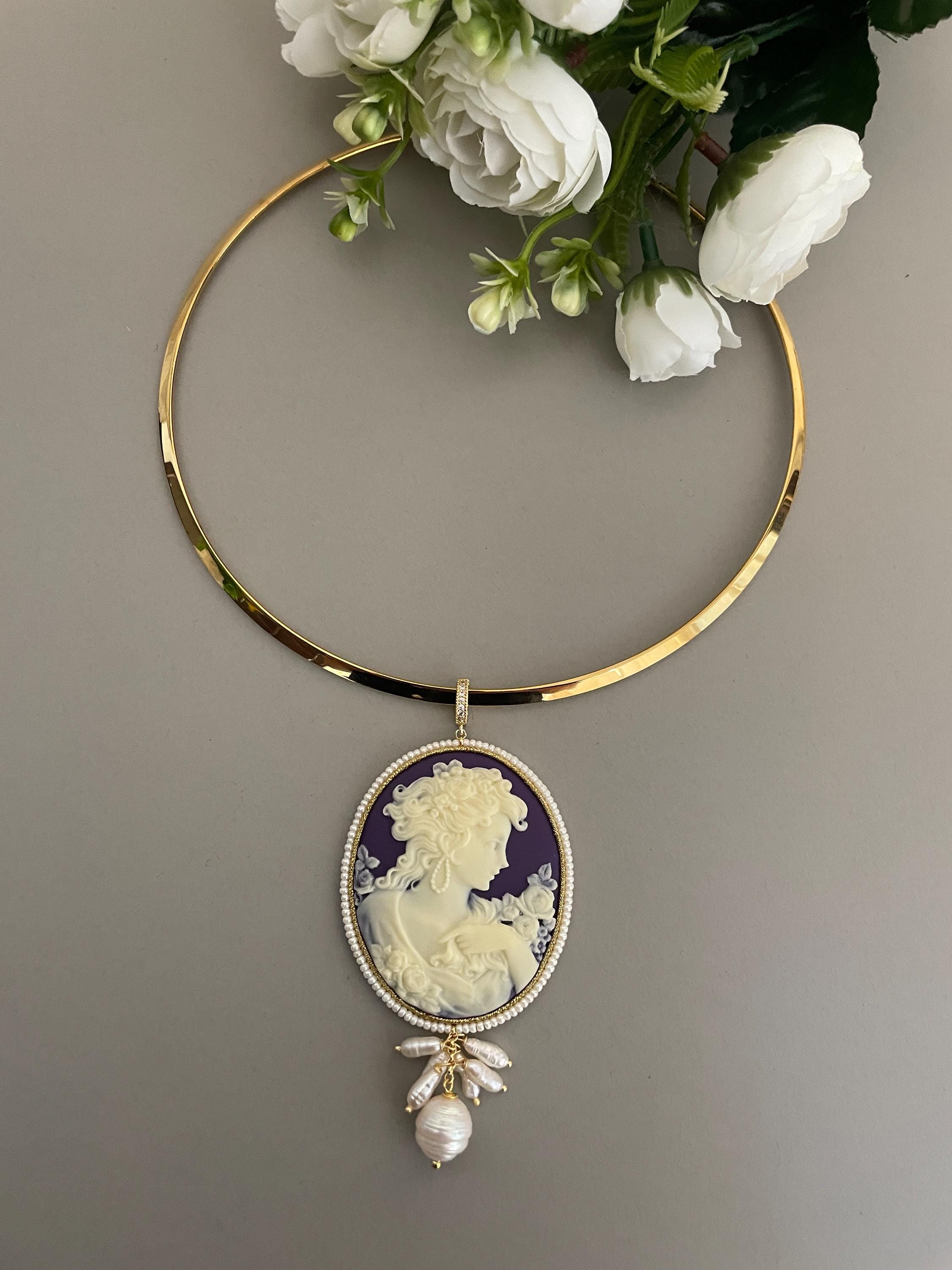 Splendida collana da indossare con una bella scollatura audace per valorizzare il tuo decoltè con il maxi Cammeo che pende dal cerchio rigido.