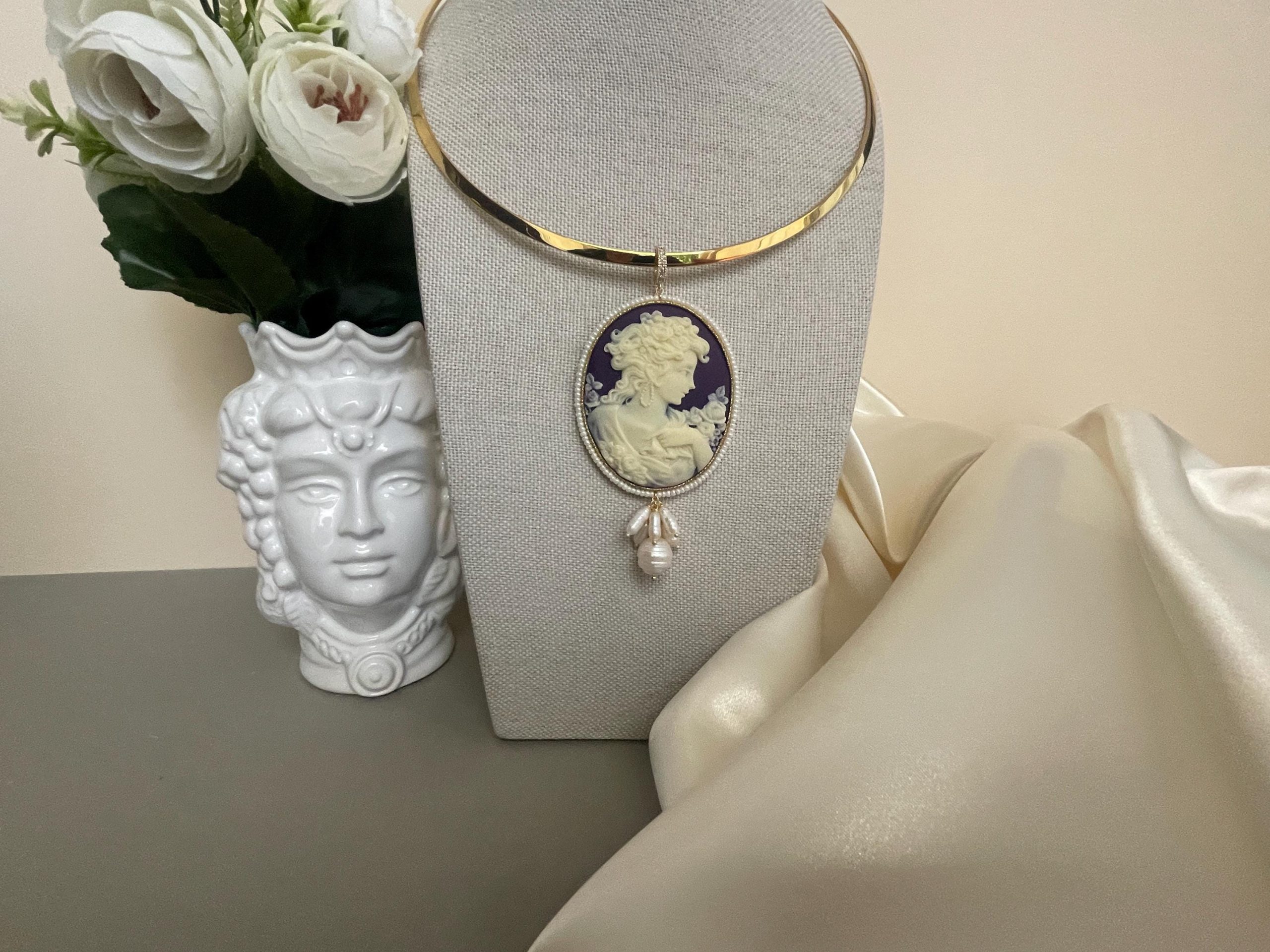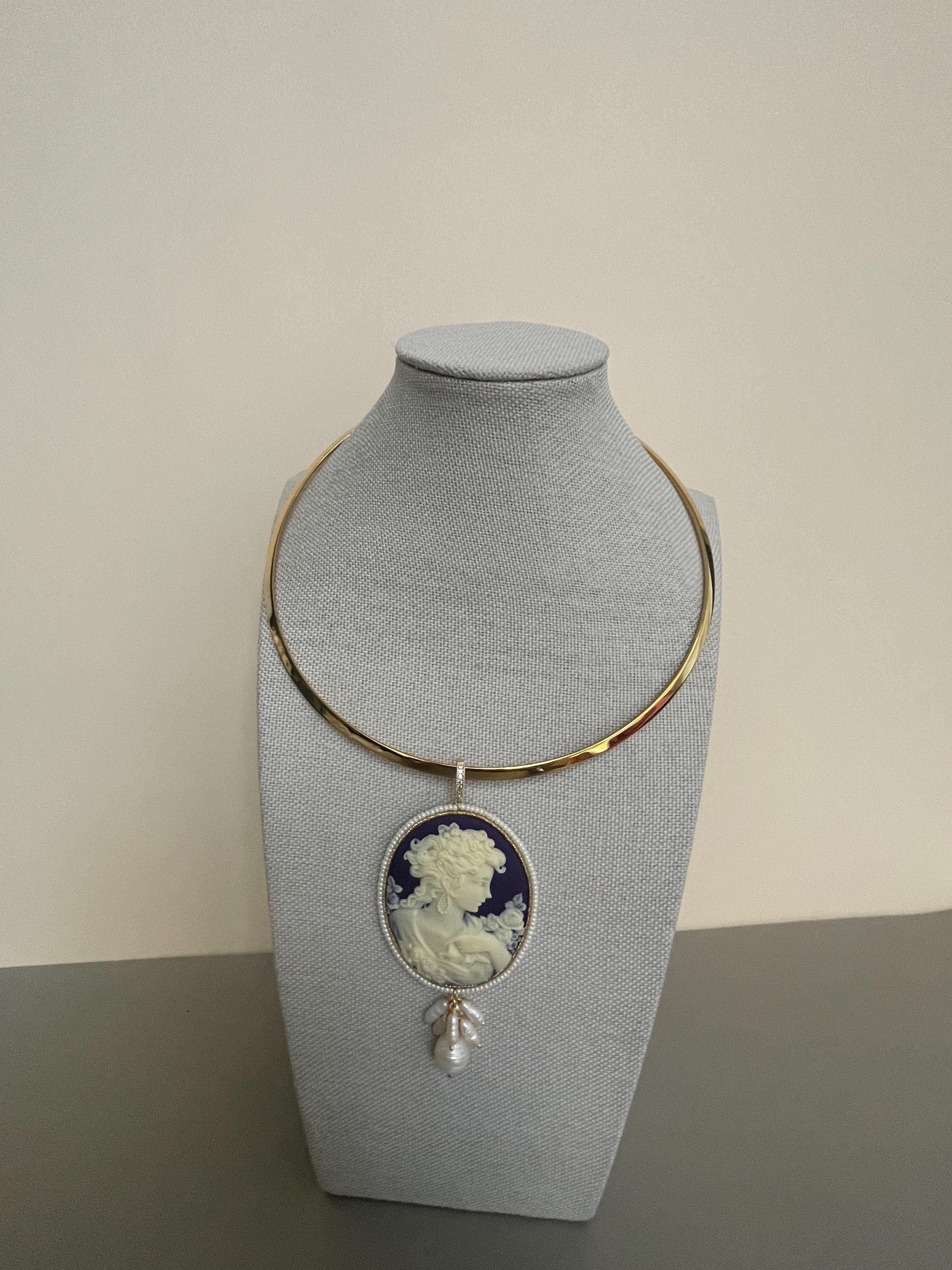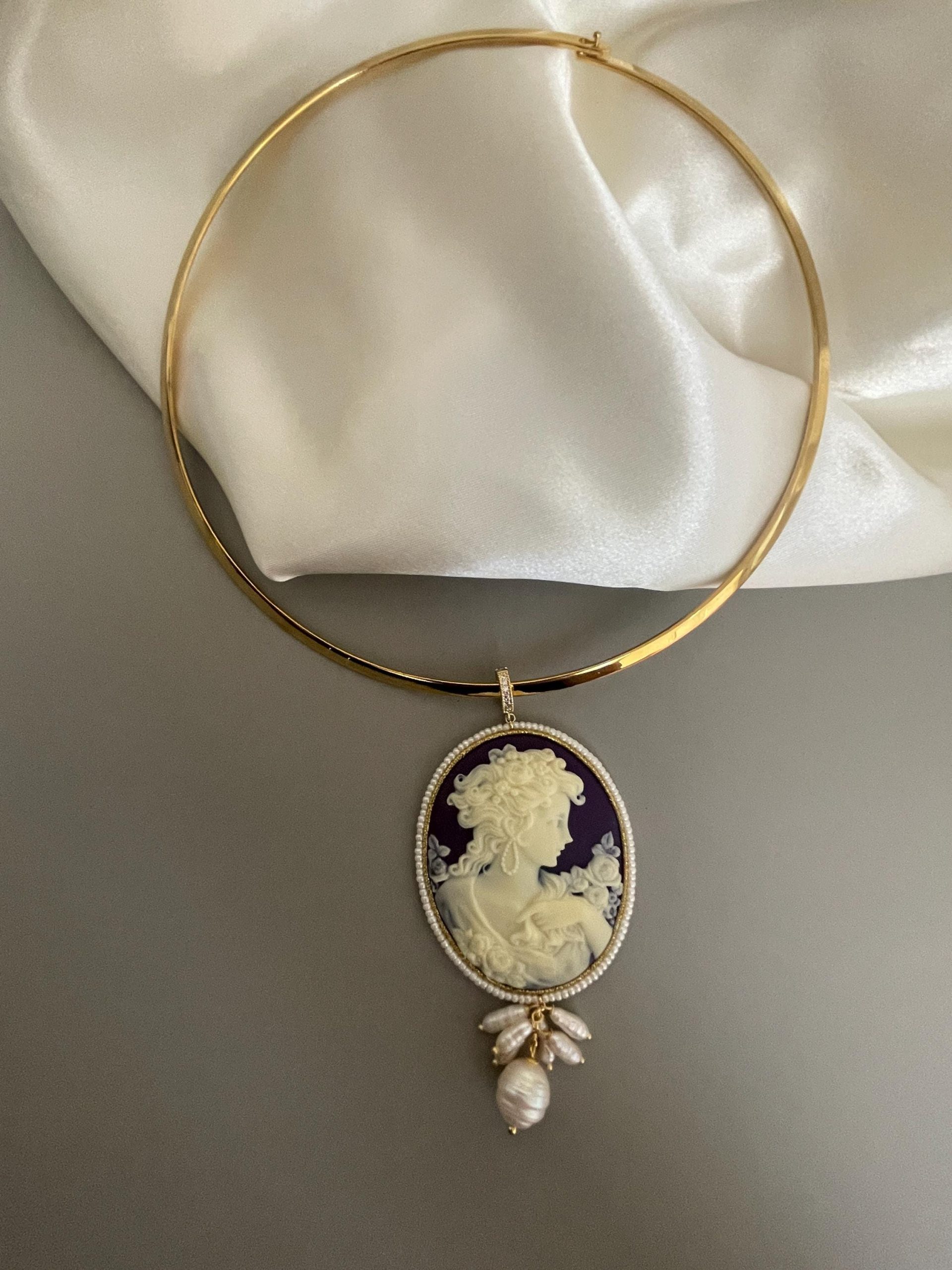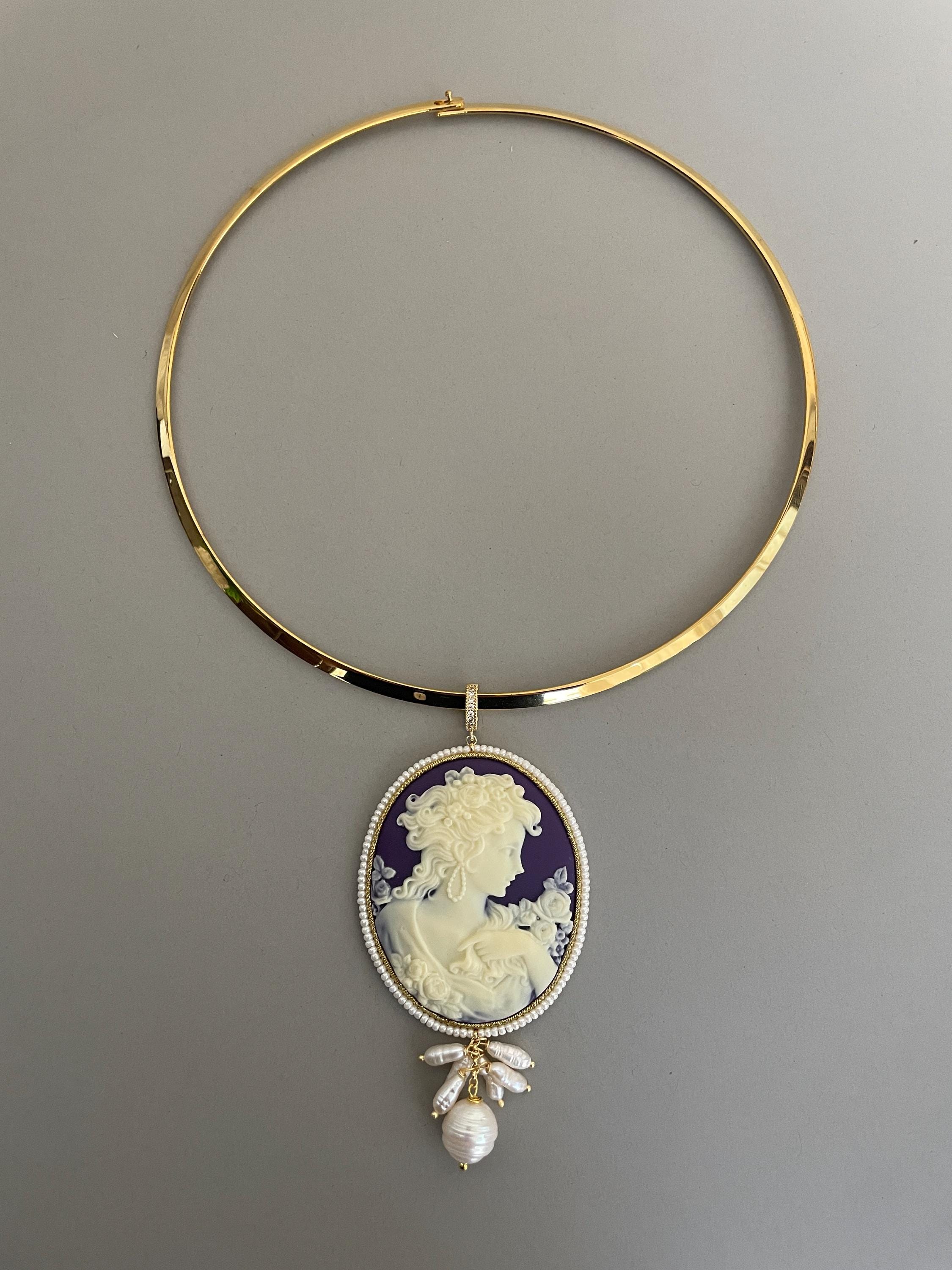 Splendida collana da indossare con una bella scollatura audace per valorizzare il tuo decoltè con il maxi Cammeo che pende dal cerchio rigido.