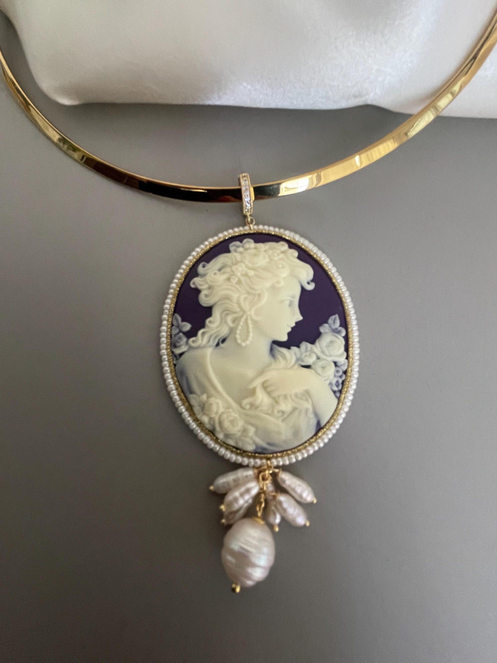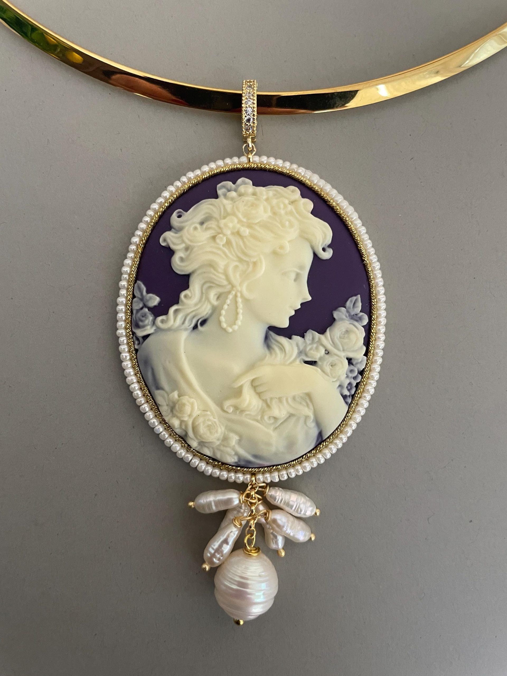 Il cammeo è incorniciato da un filo di microperle di fiume e da esso pende un grappolo di perle di fiume.