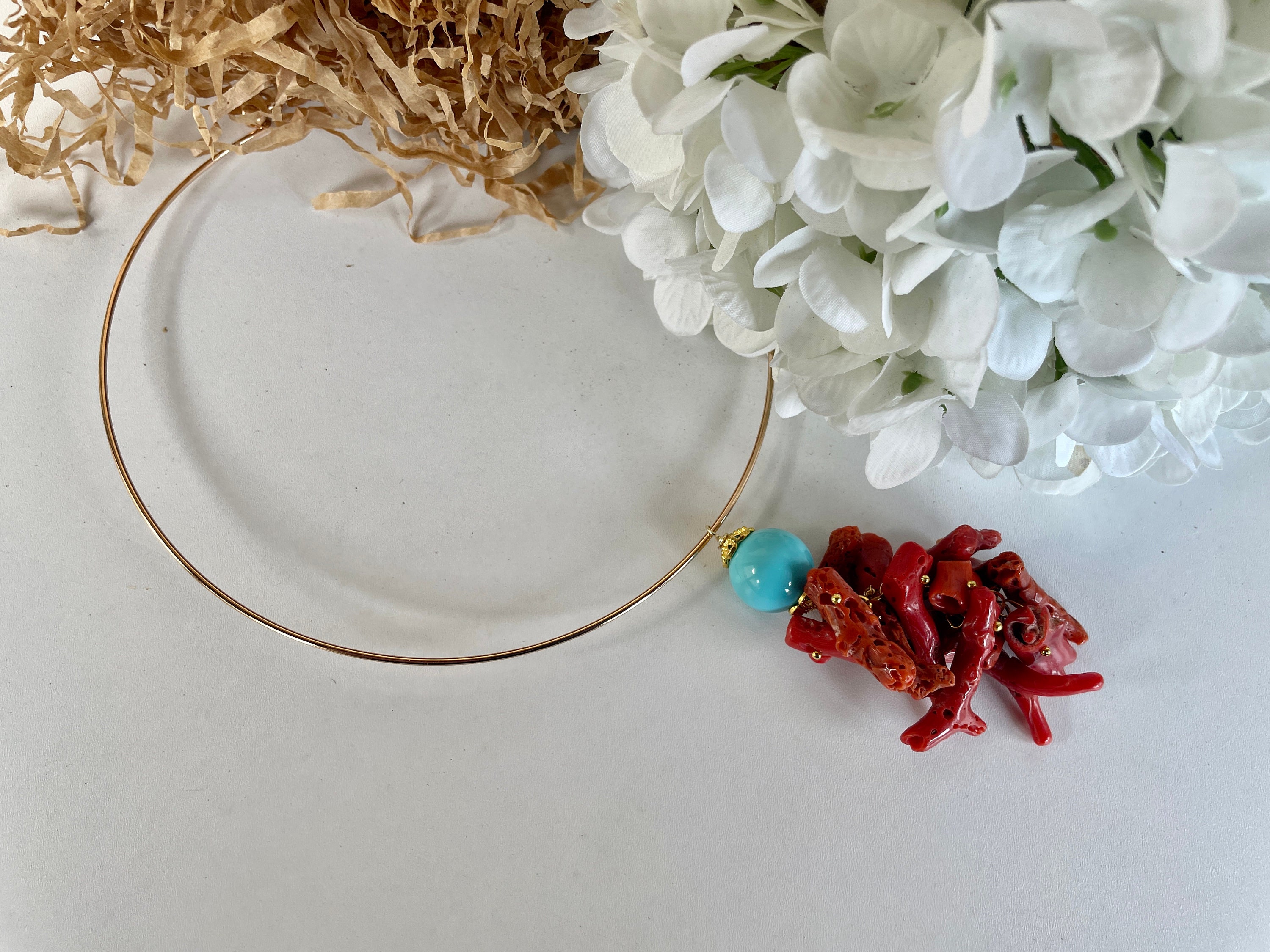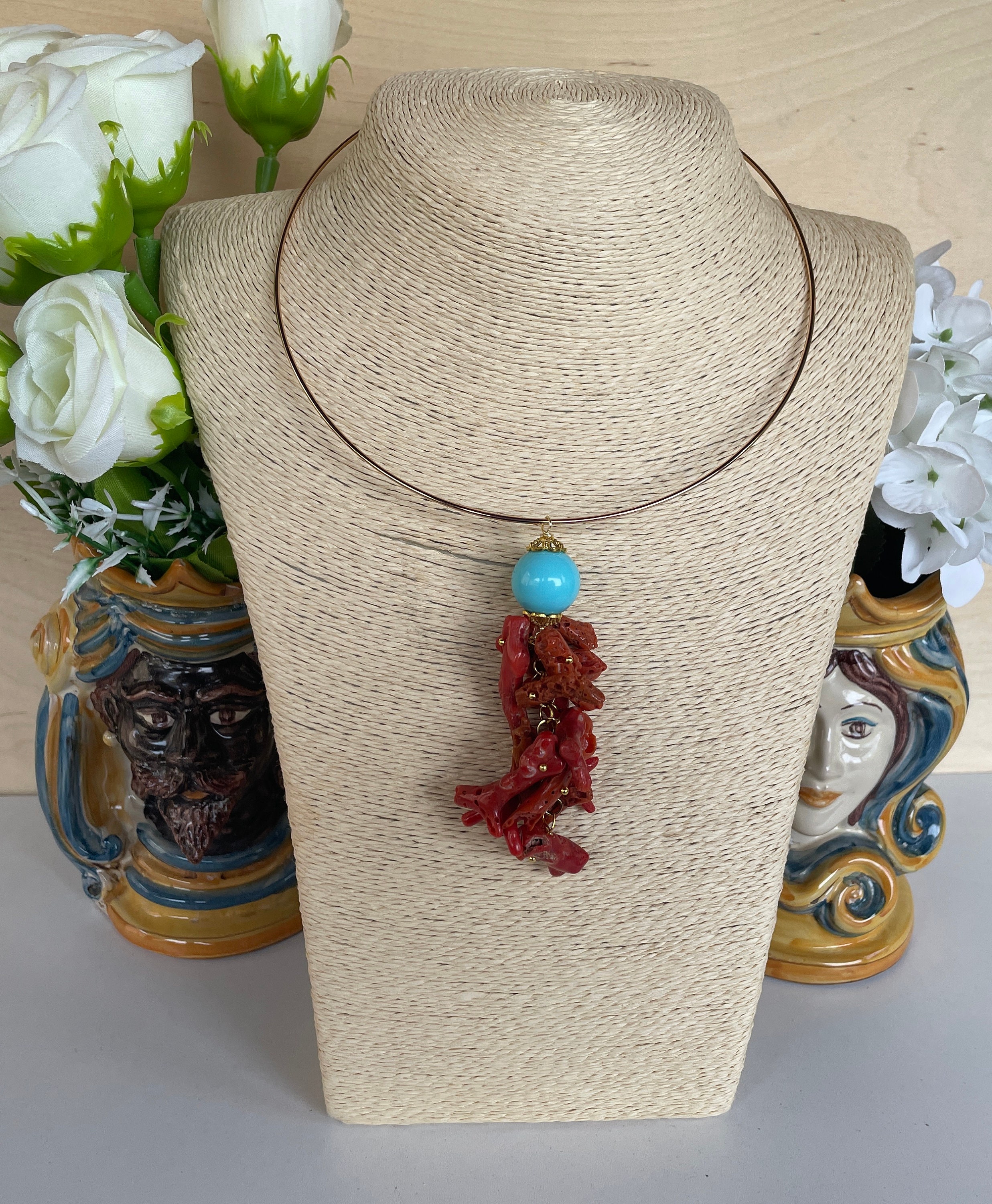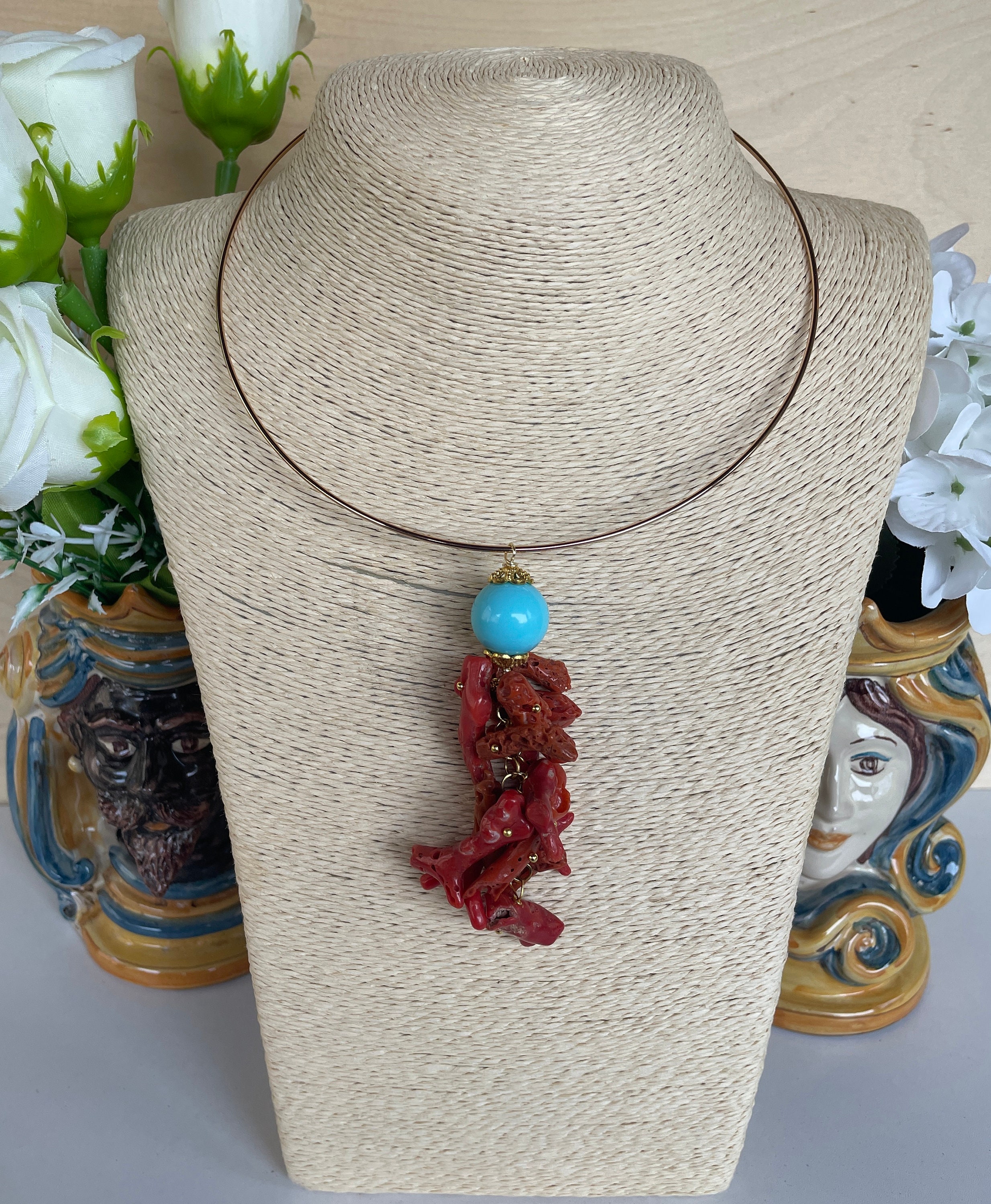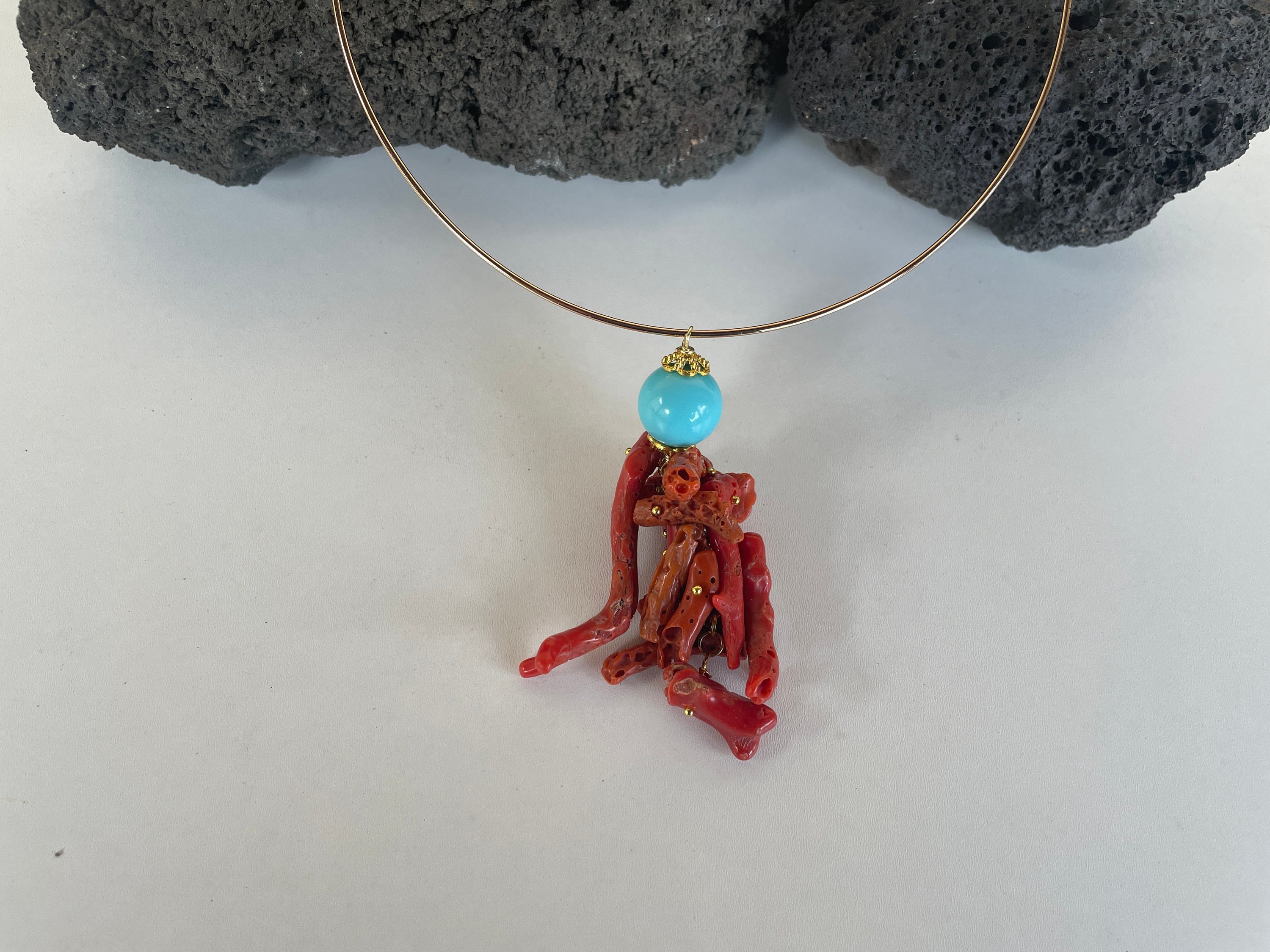 Il ciondolo, rigorosamente realizzato artigianalmente, si compone di una grande perla di pasta di turchese e uno splendido grappolo di pezzi di corallo vero del Mediterraneo.