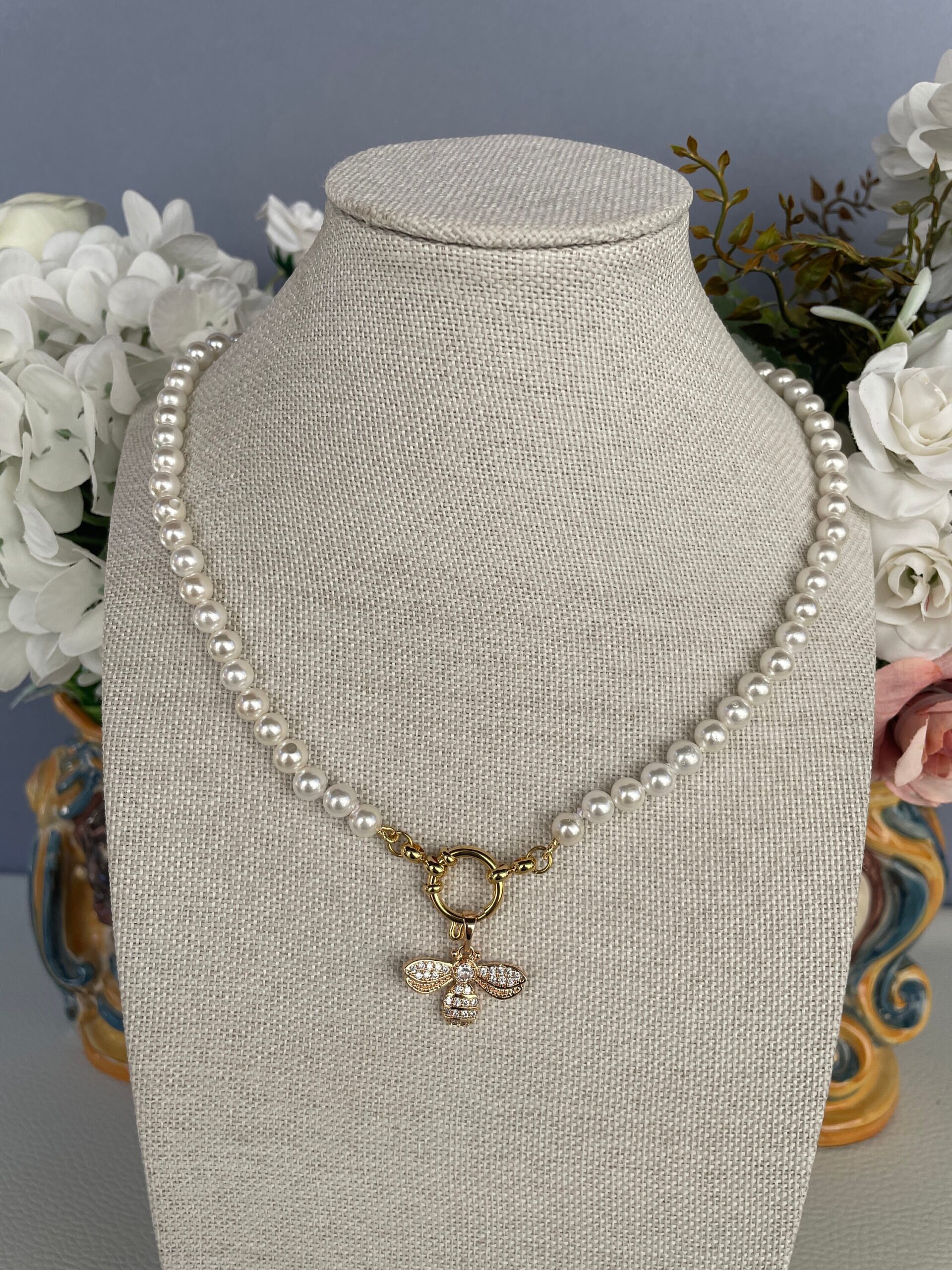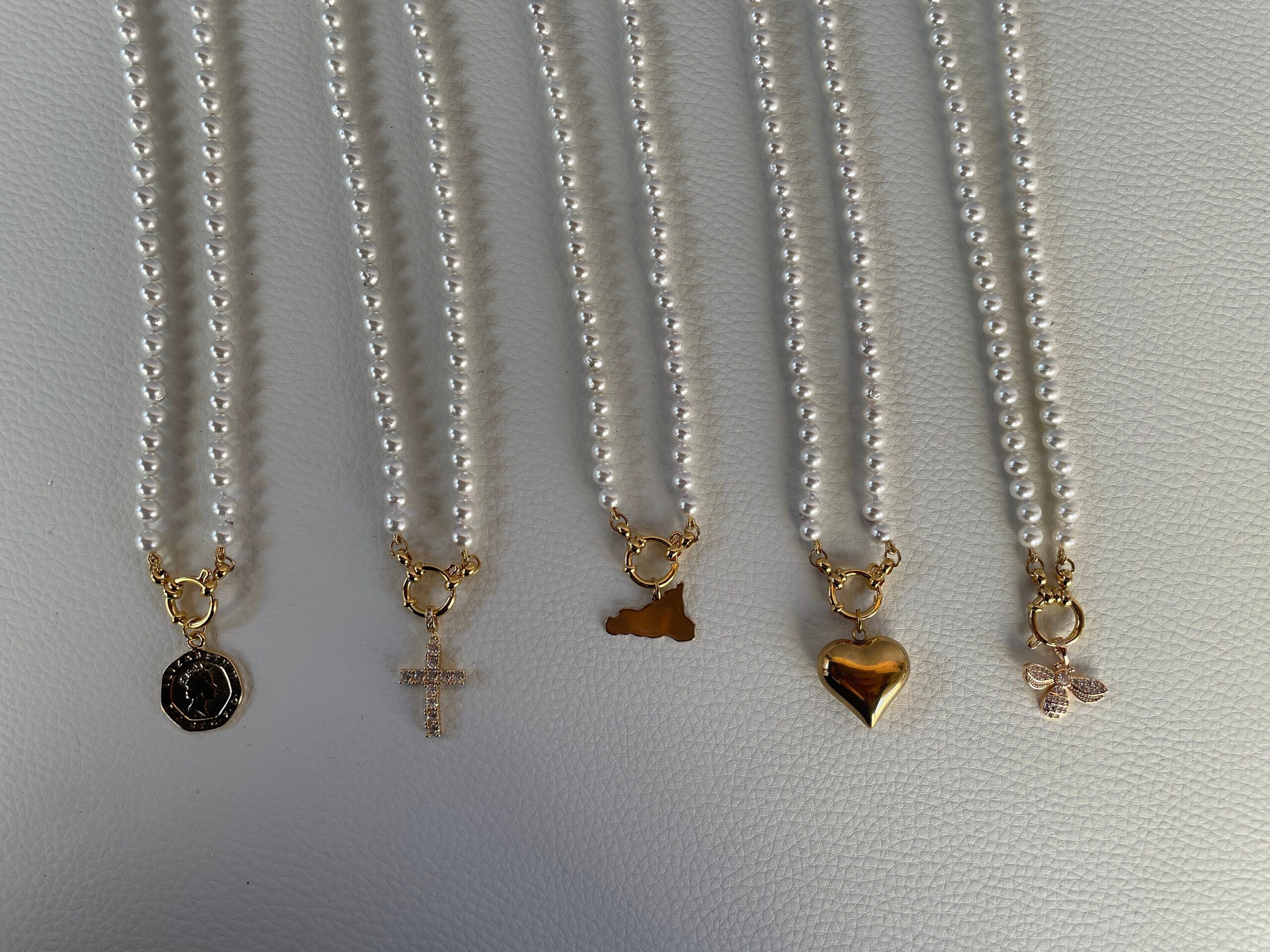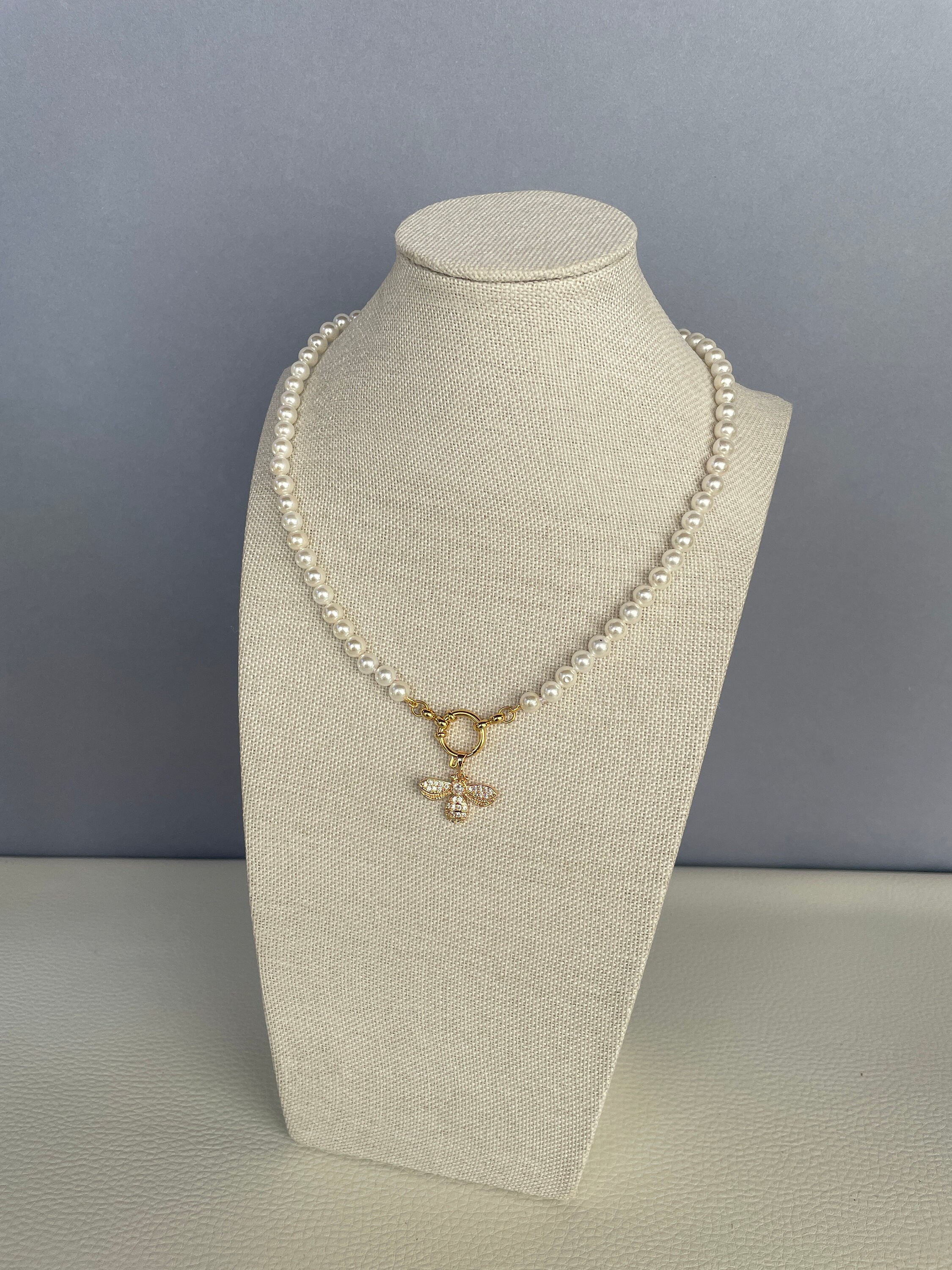 Collana di perle con ciondolo in acciaio inossidabile, placcato oro 14k.