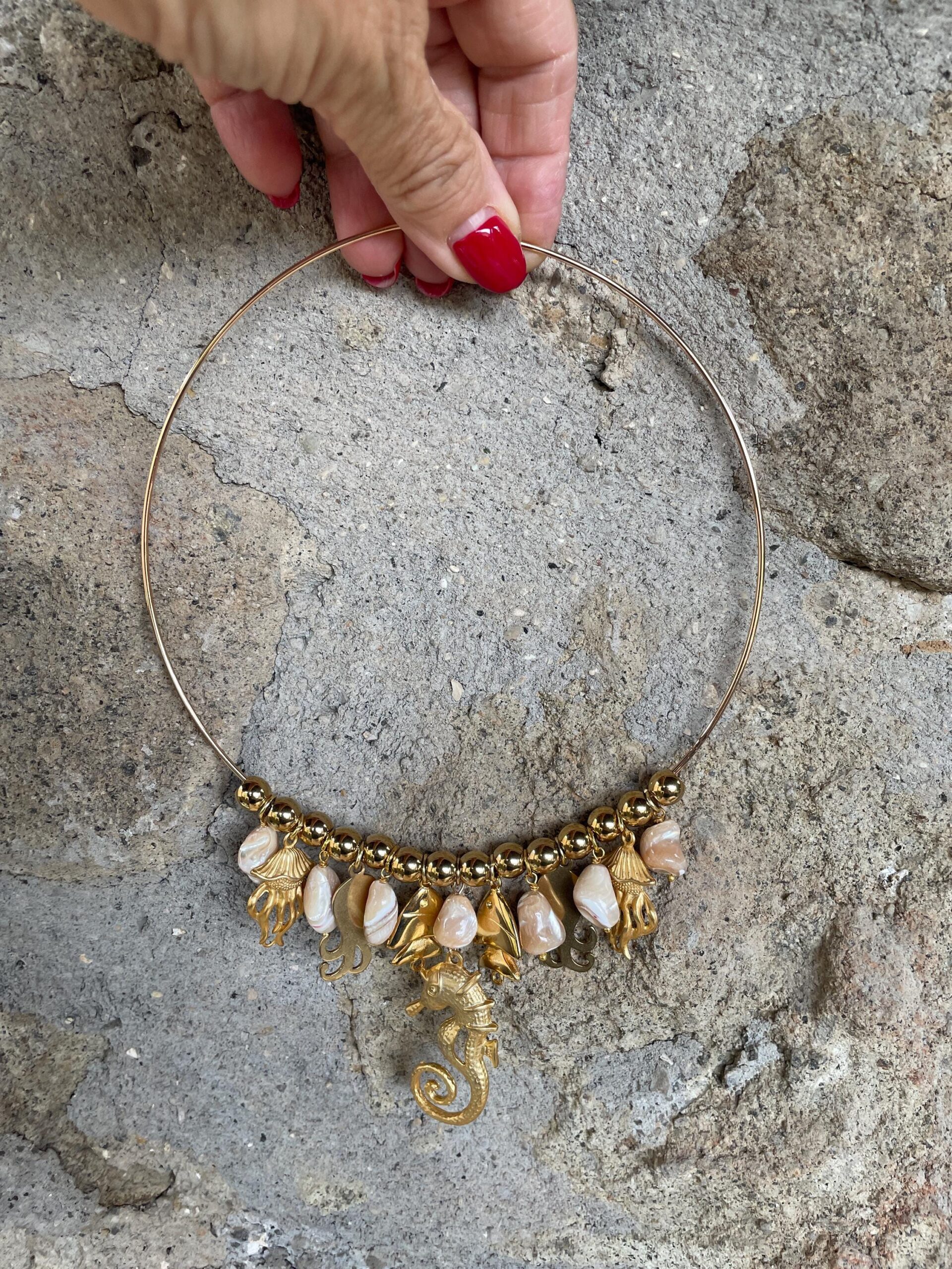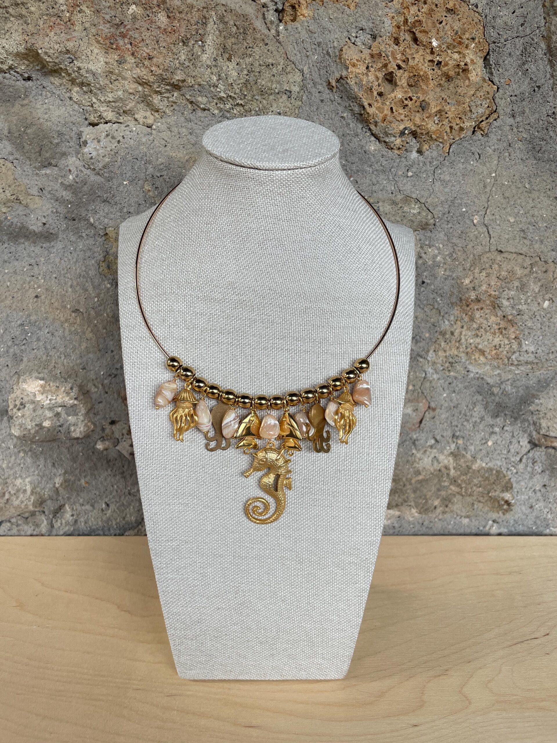 Collana girocollo con collare rigido in ottone oro e piena di charms assortiti a tema marino, pietre di madreperla e sfere di ematite oro.