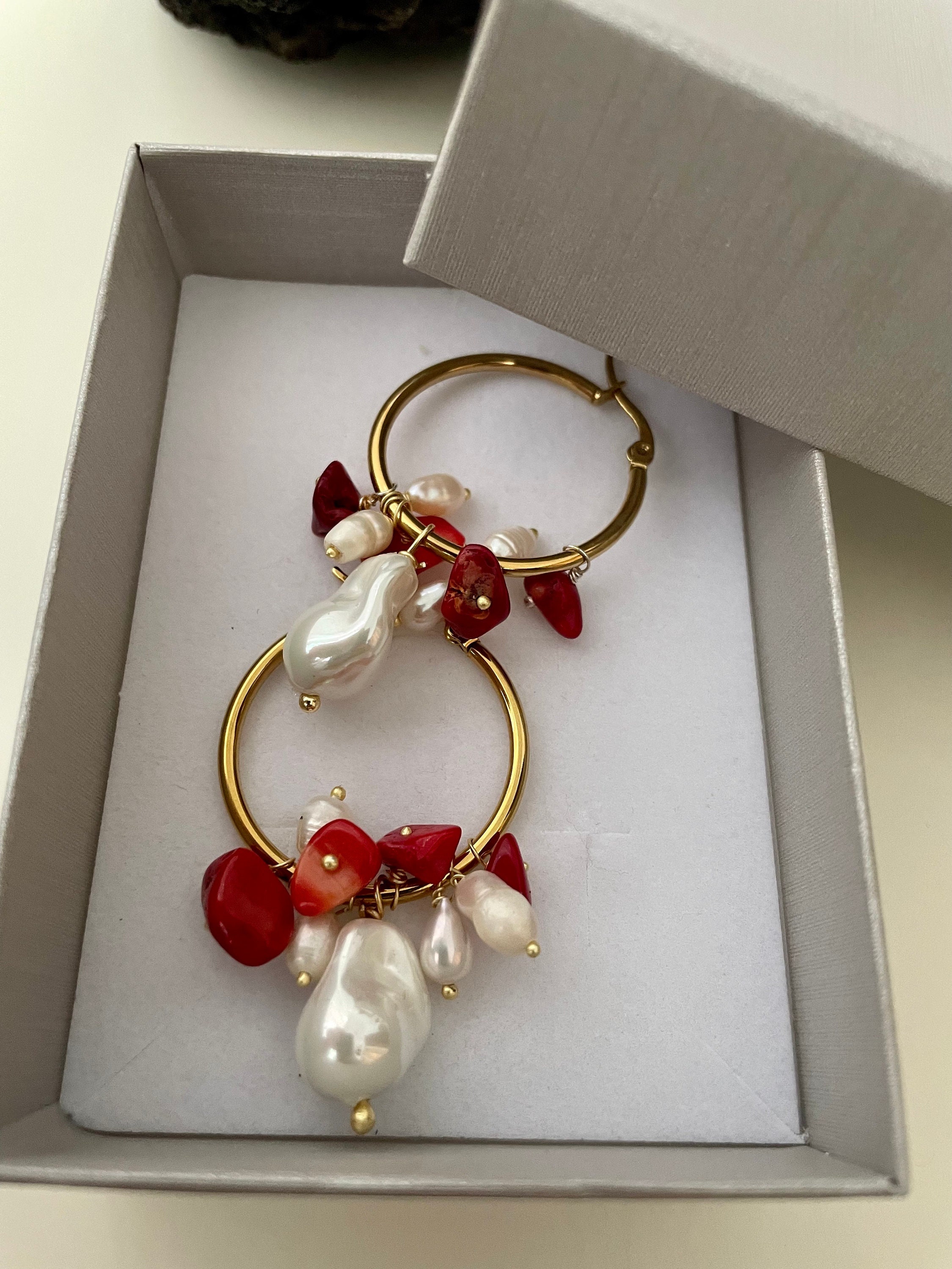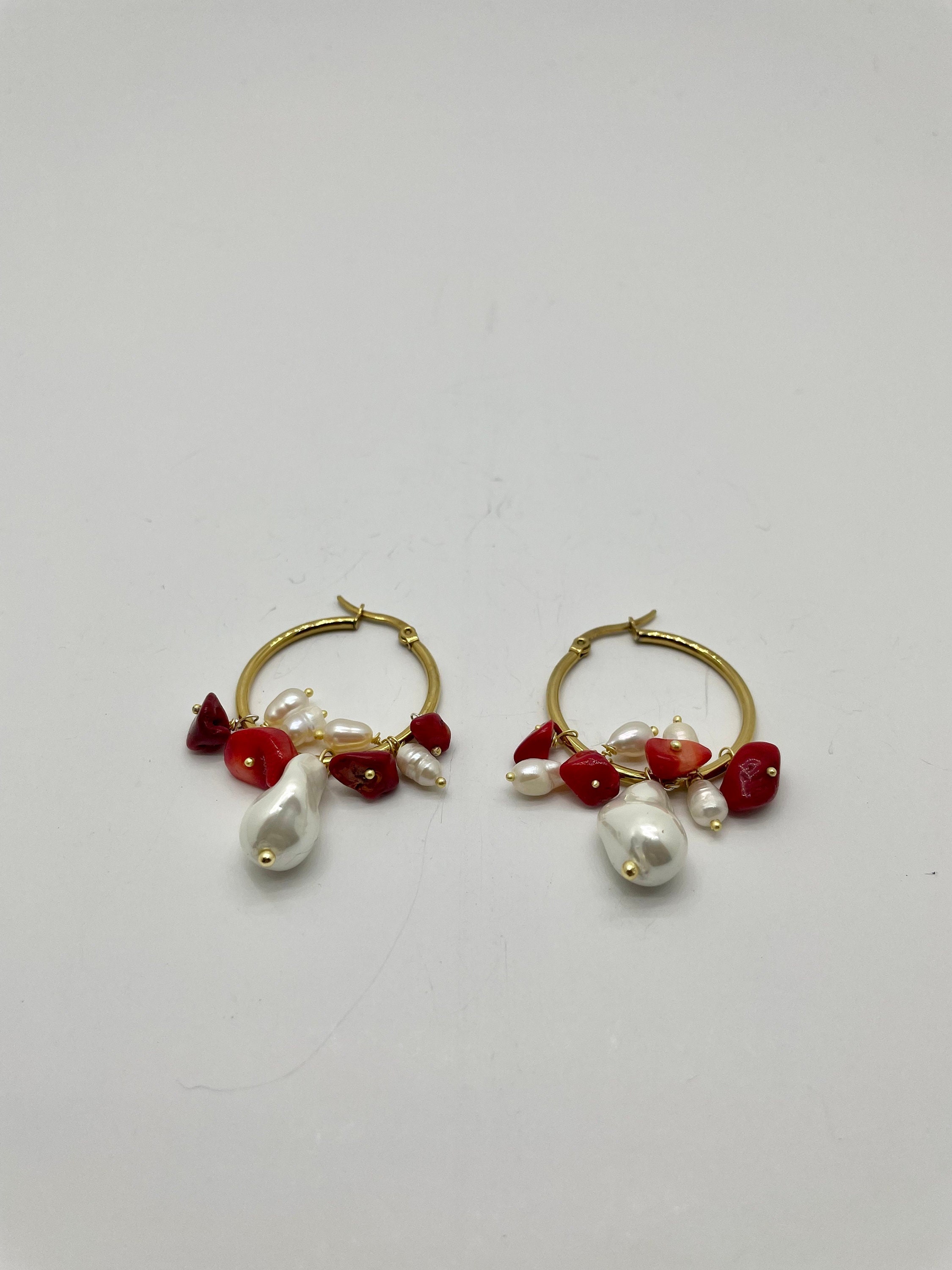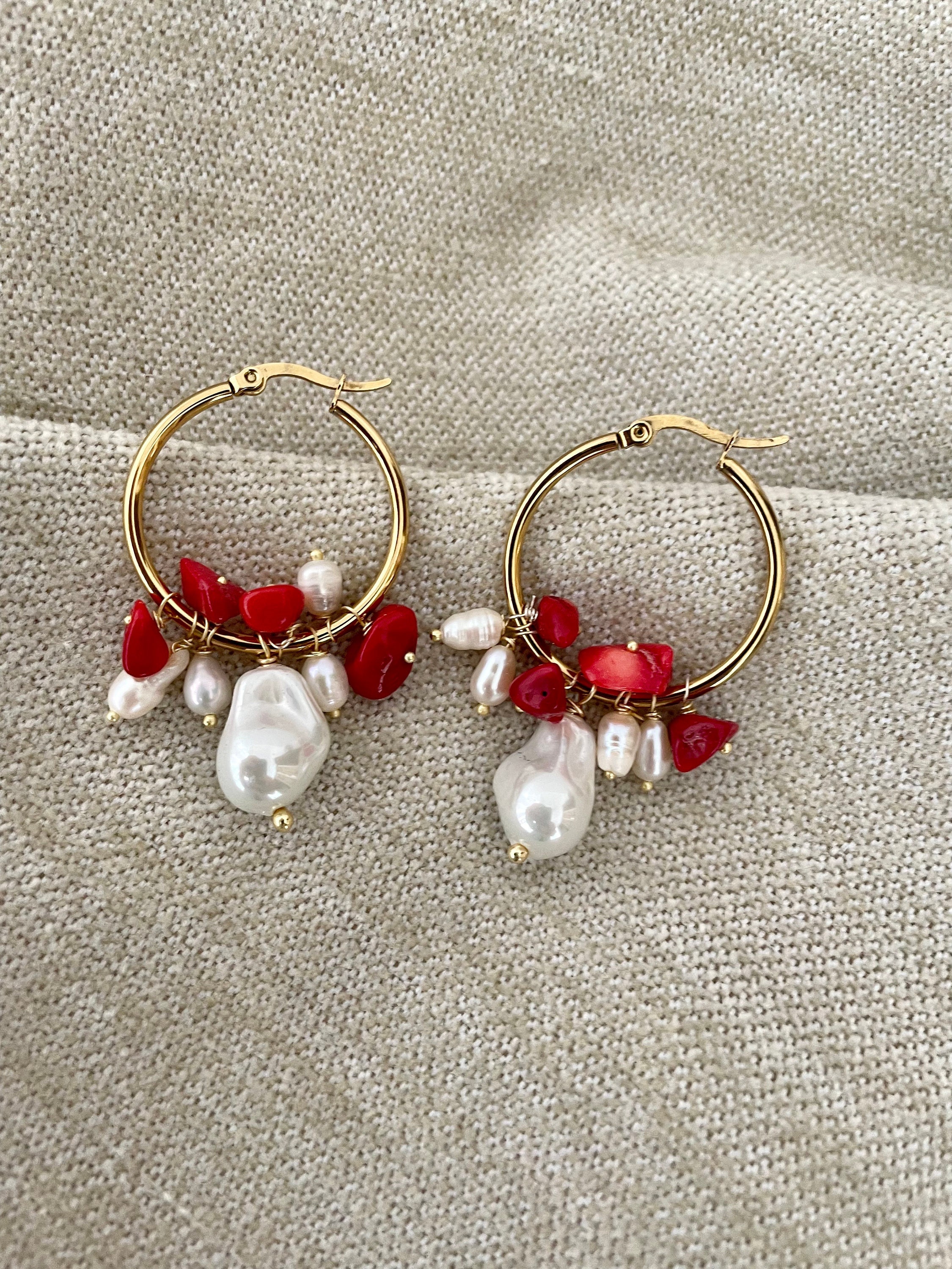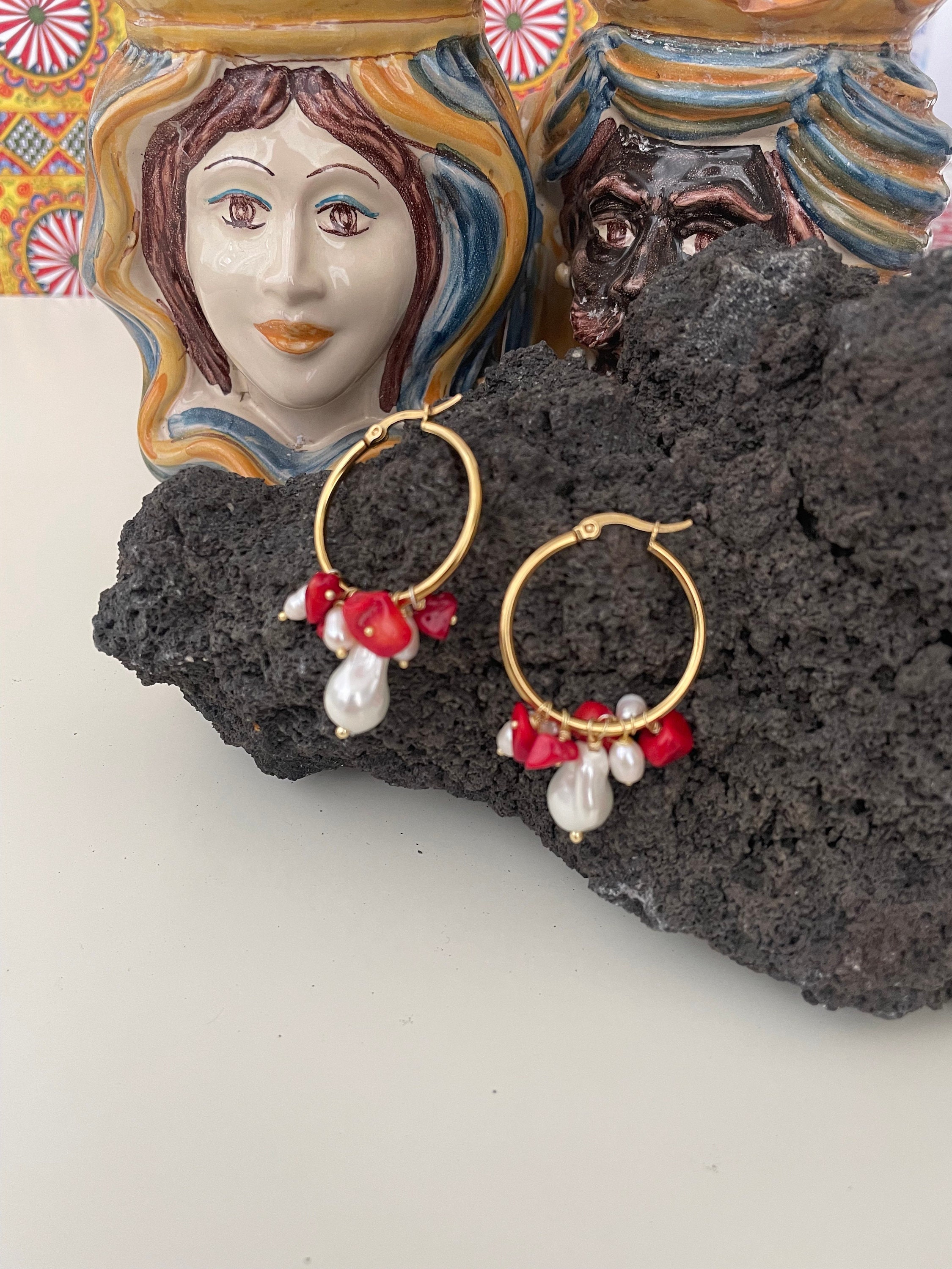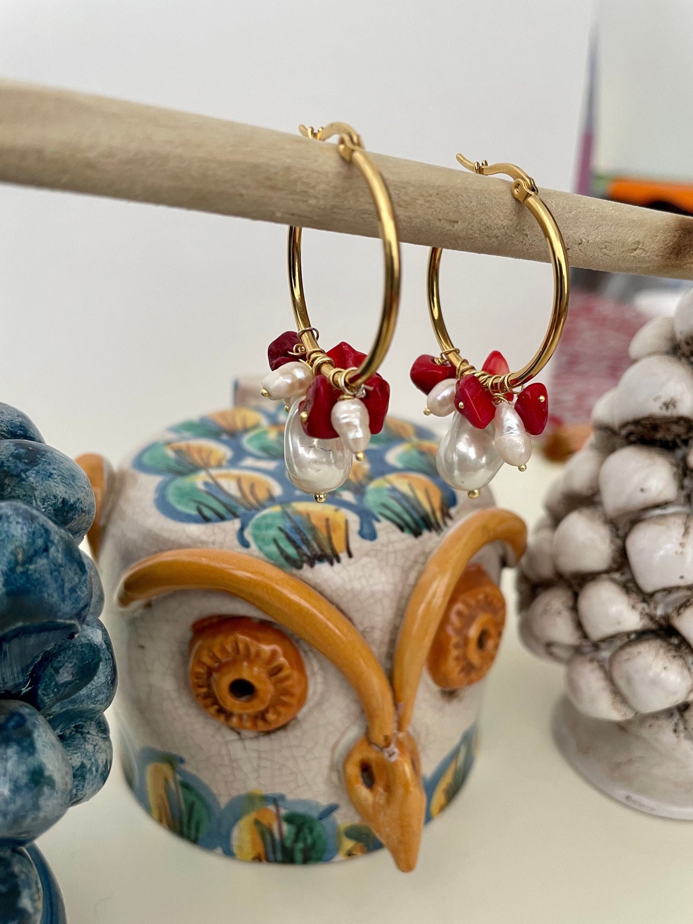 Realizzati con cerchio in ottone, chips di corallo bambù, perle di fiume e perla Maiorca irregolare.