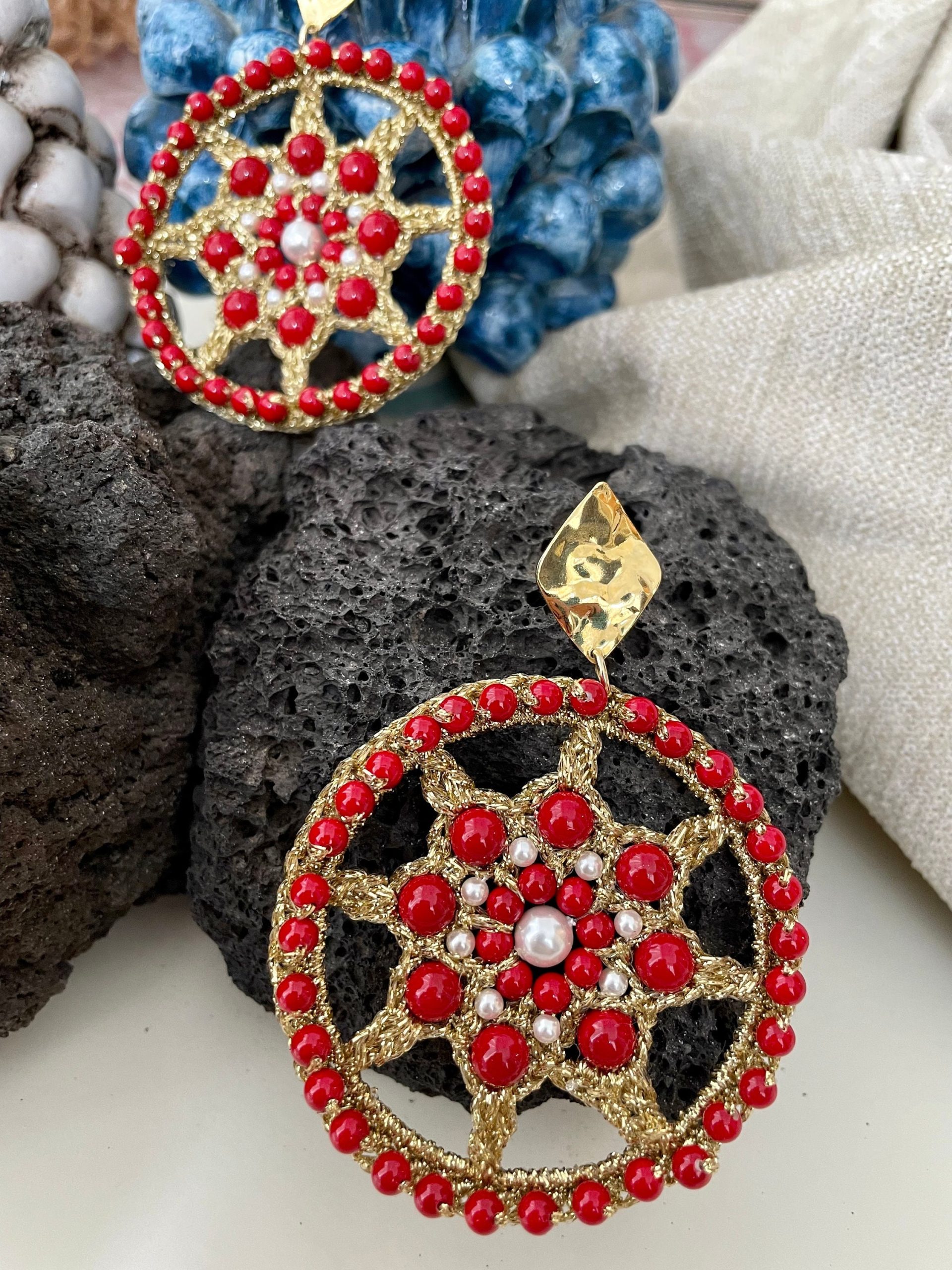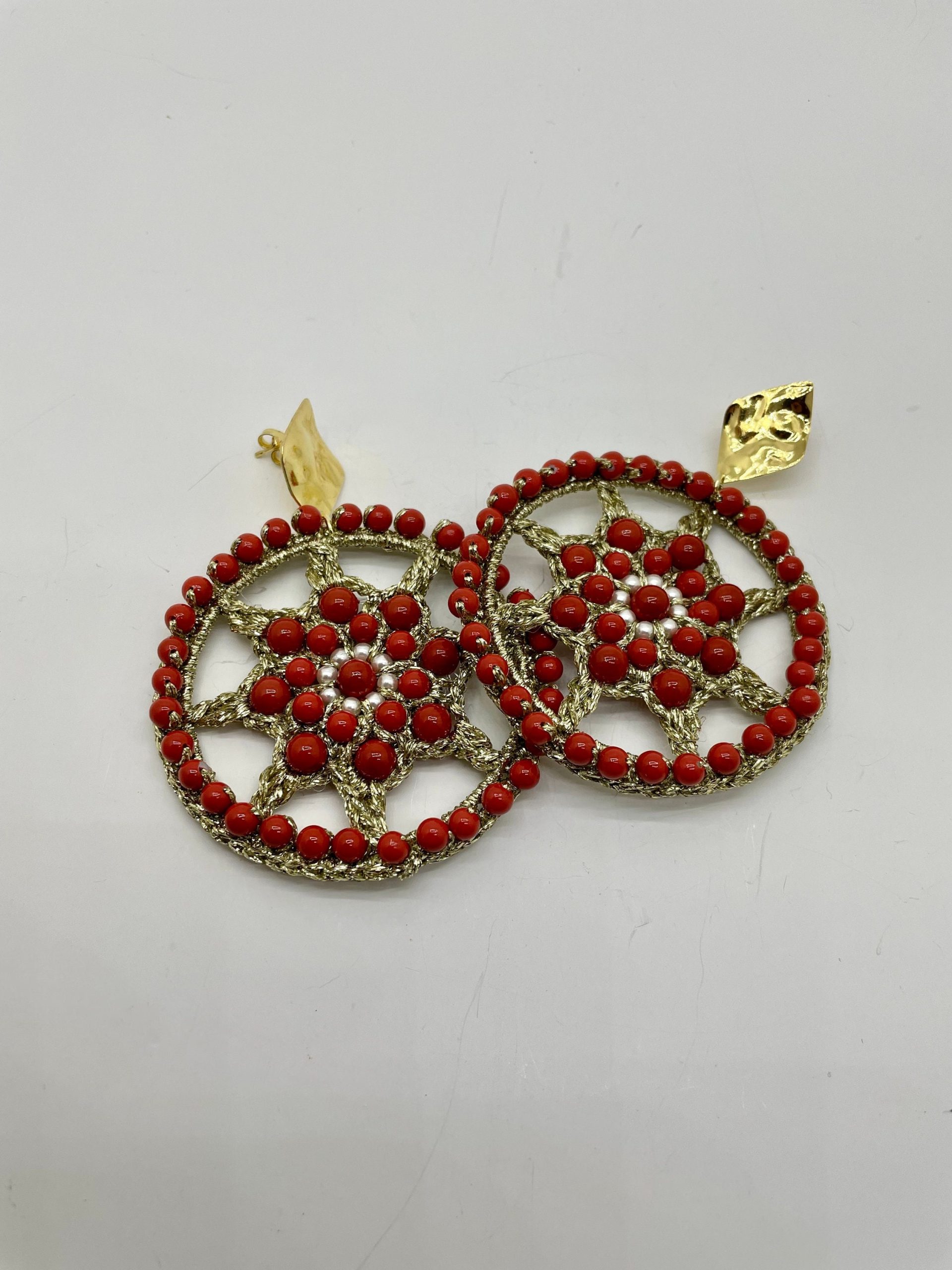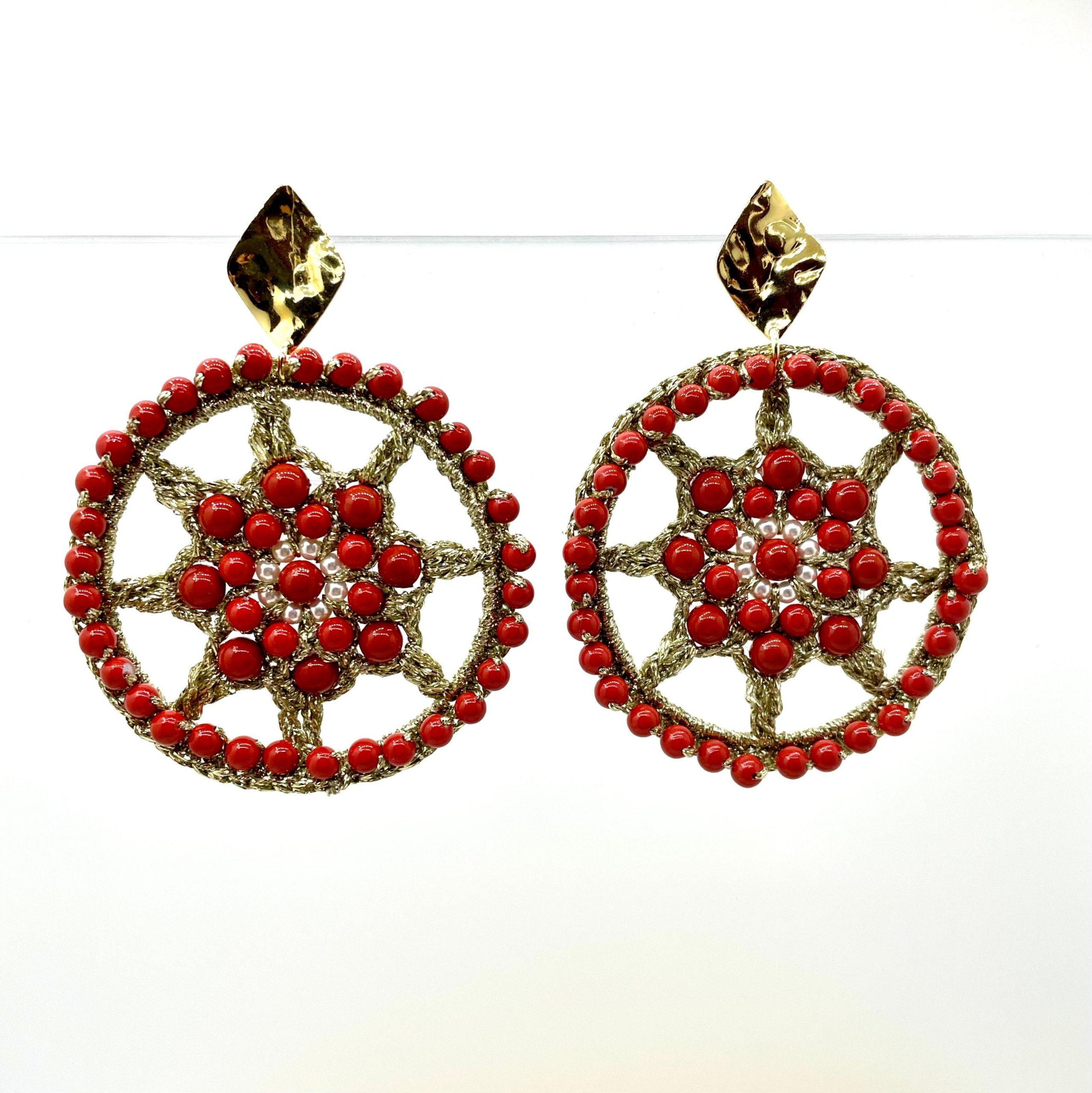 Realizzati con base in chiacchierino dorato a forma di grande Ruota di carretto, impreziosita da perle di Maiorca rosse e alcune bianche.