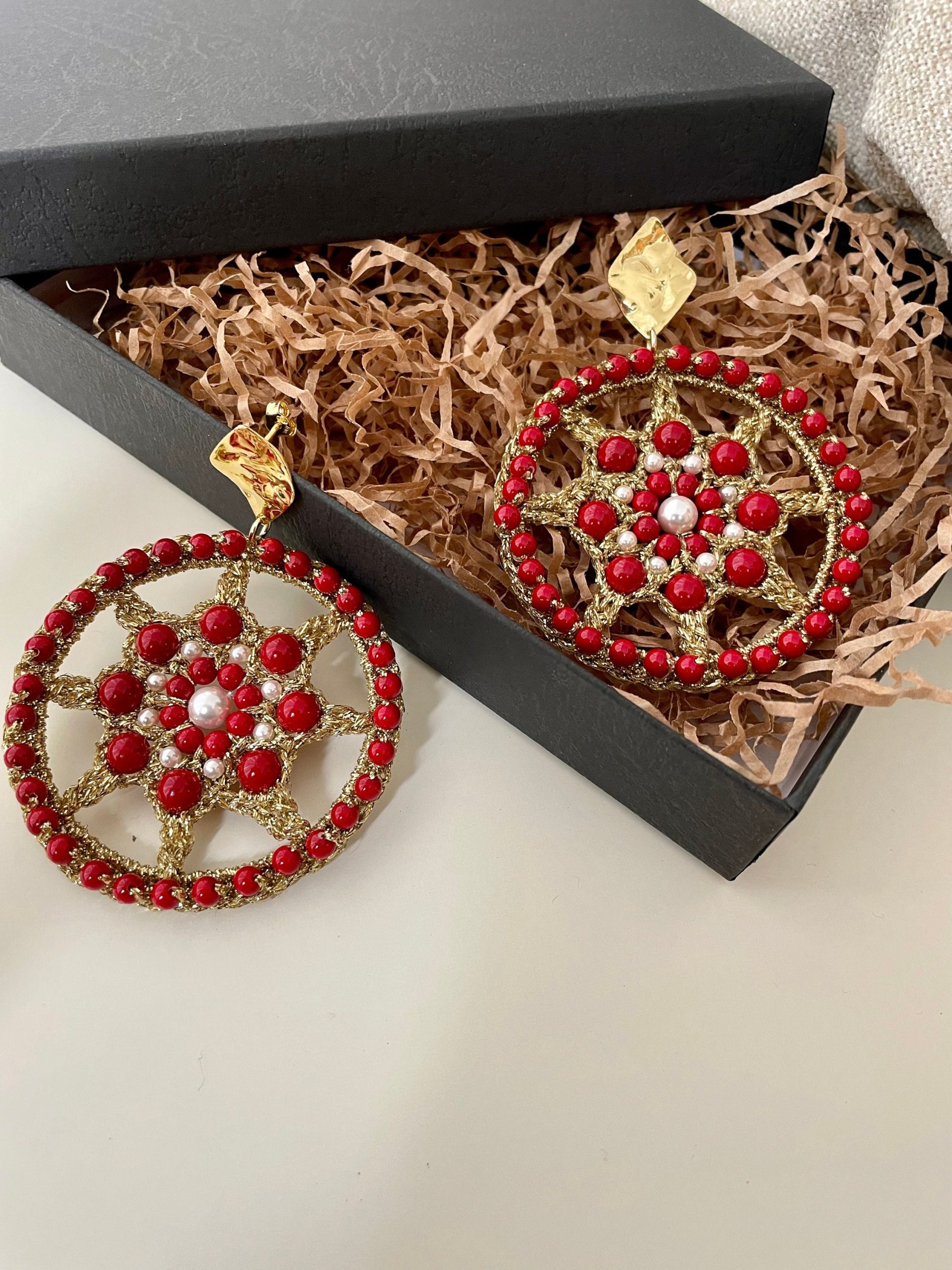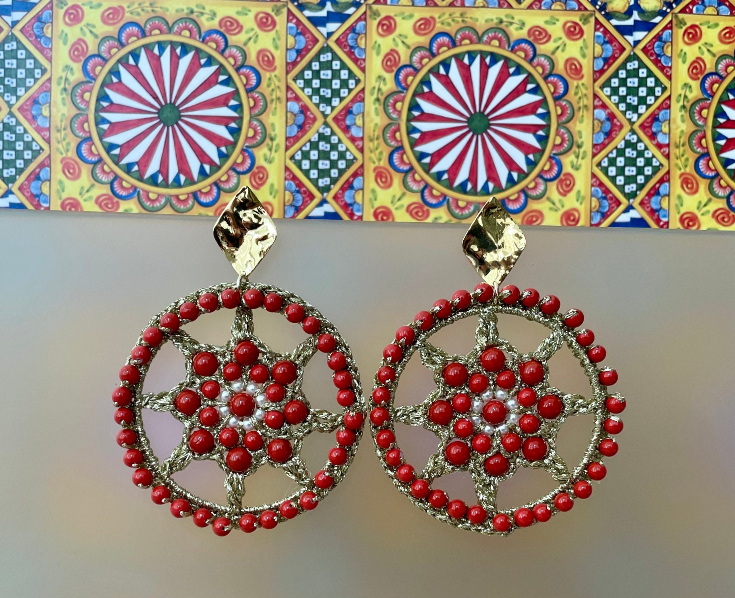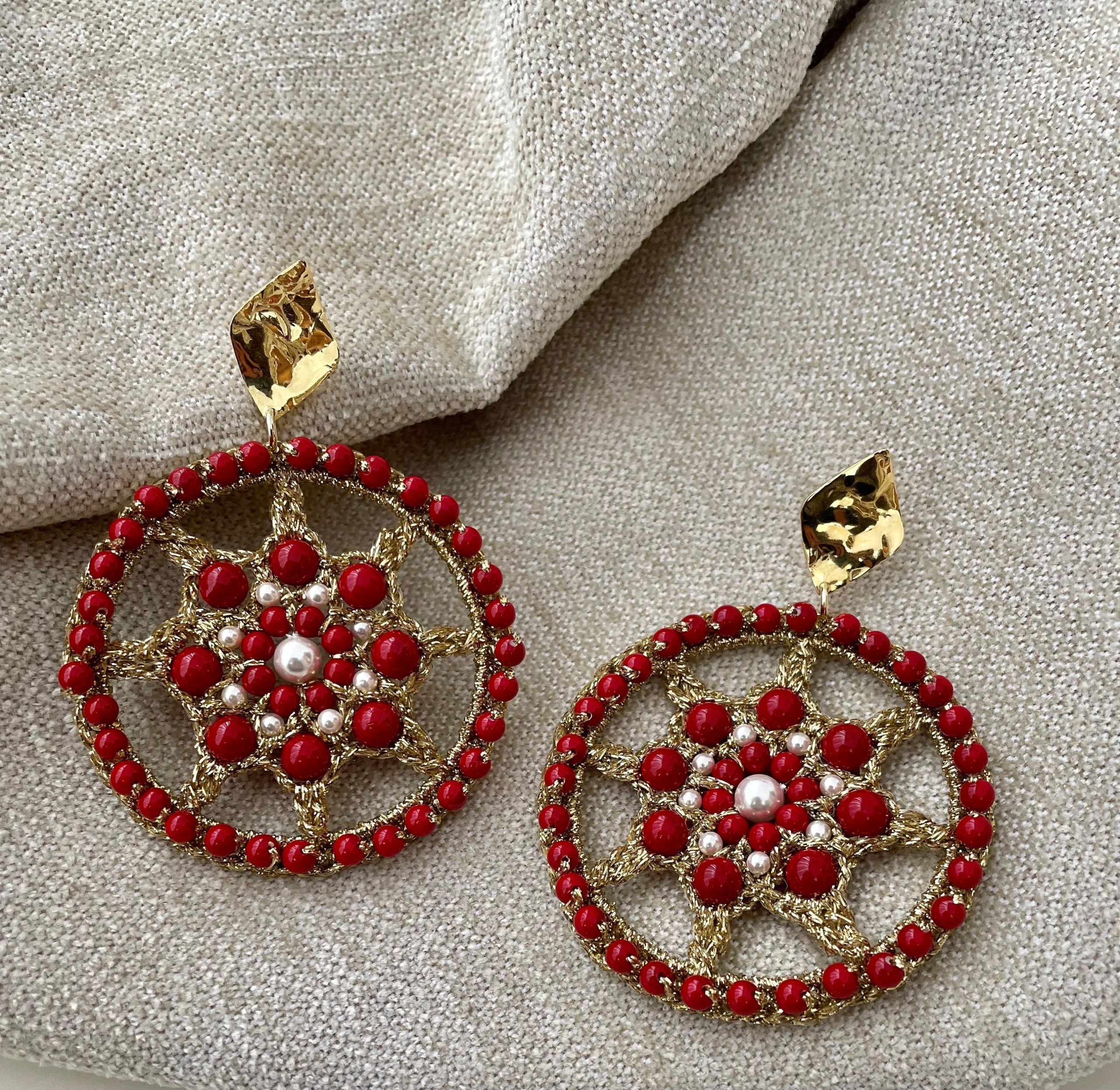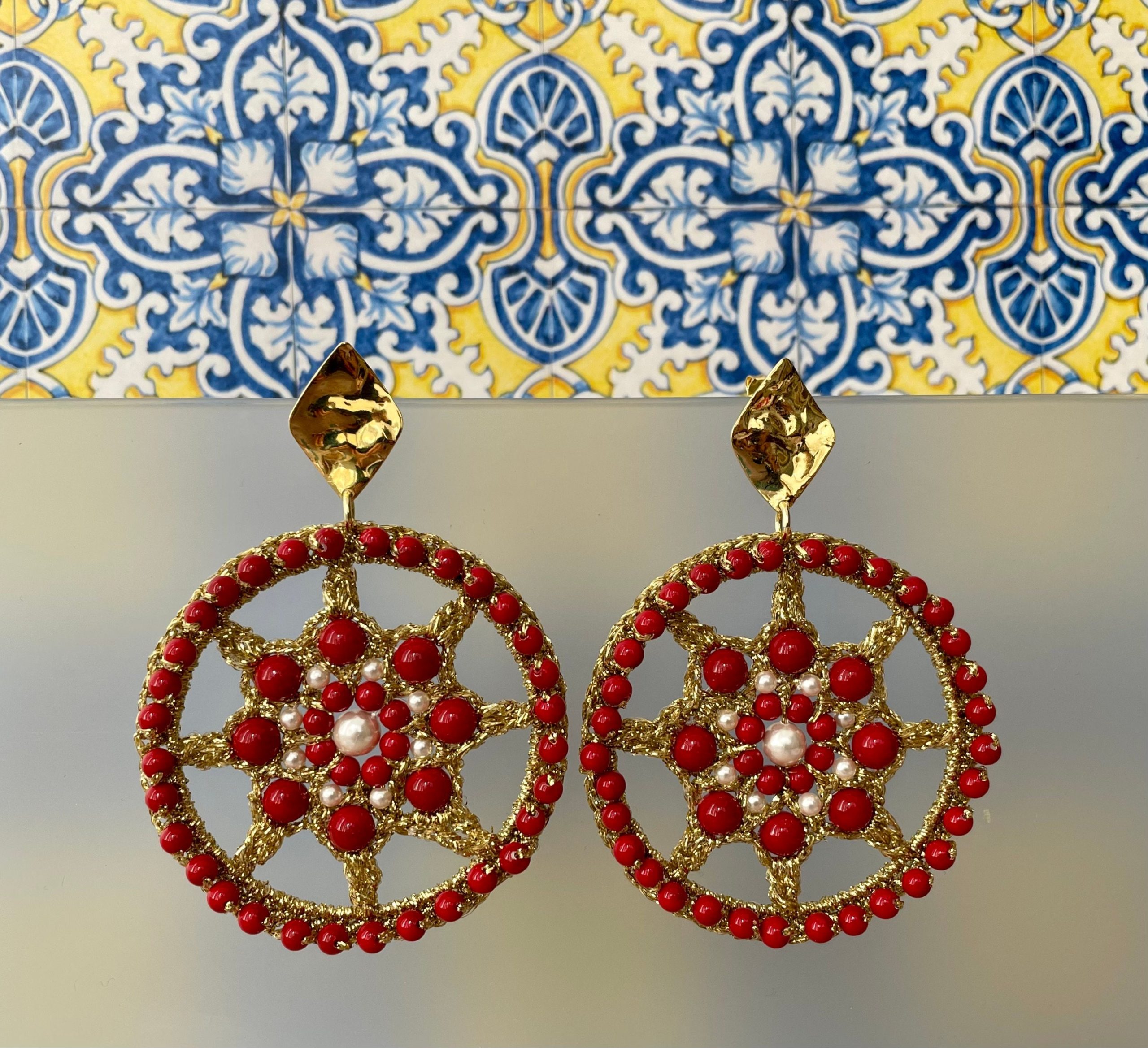 Realizzati con base in chiacchierino dorato a forma di grande Ruota di carretto, impreziosita da perle di Maiorca rosse e alcune bianche.