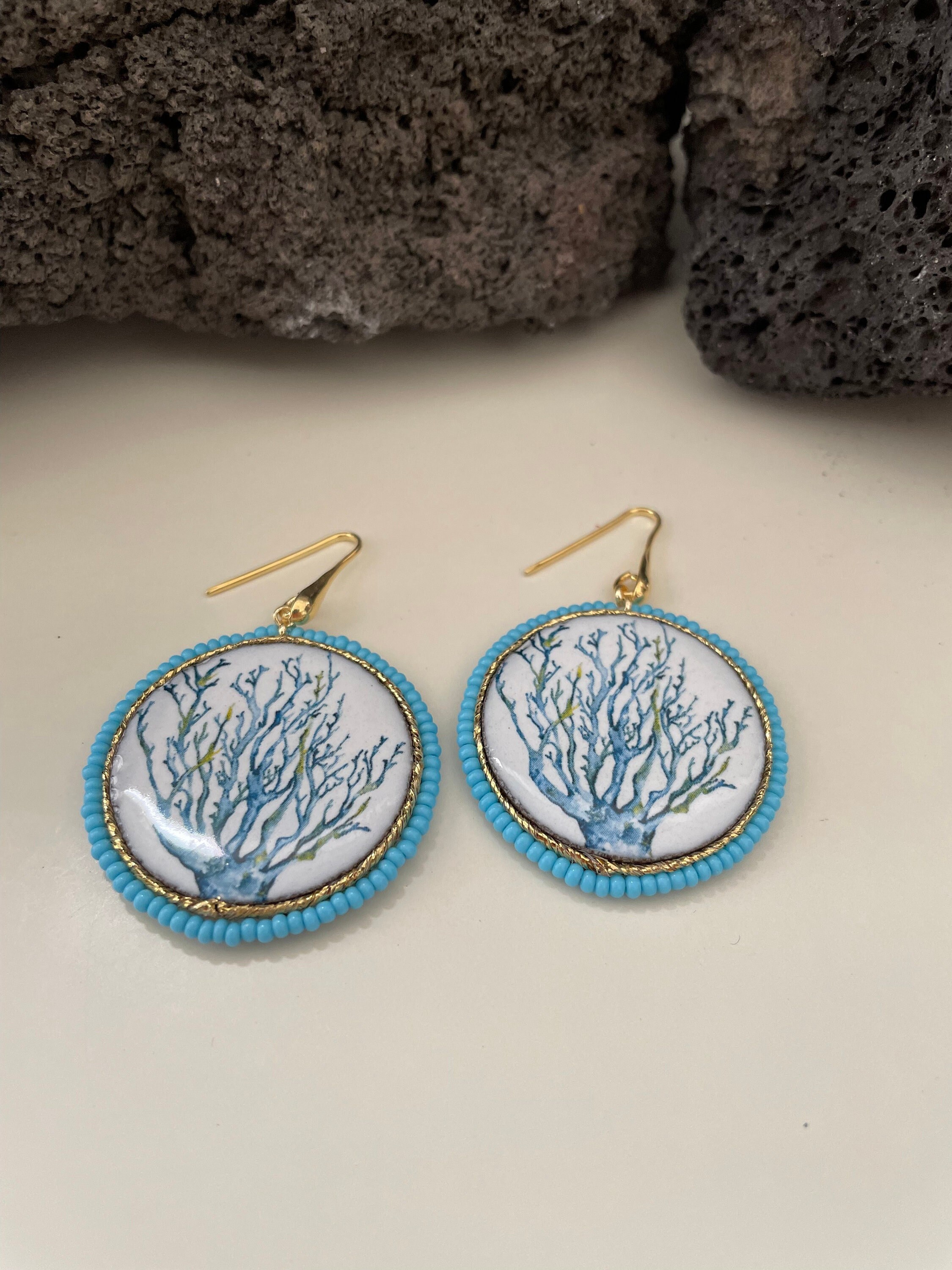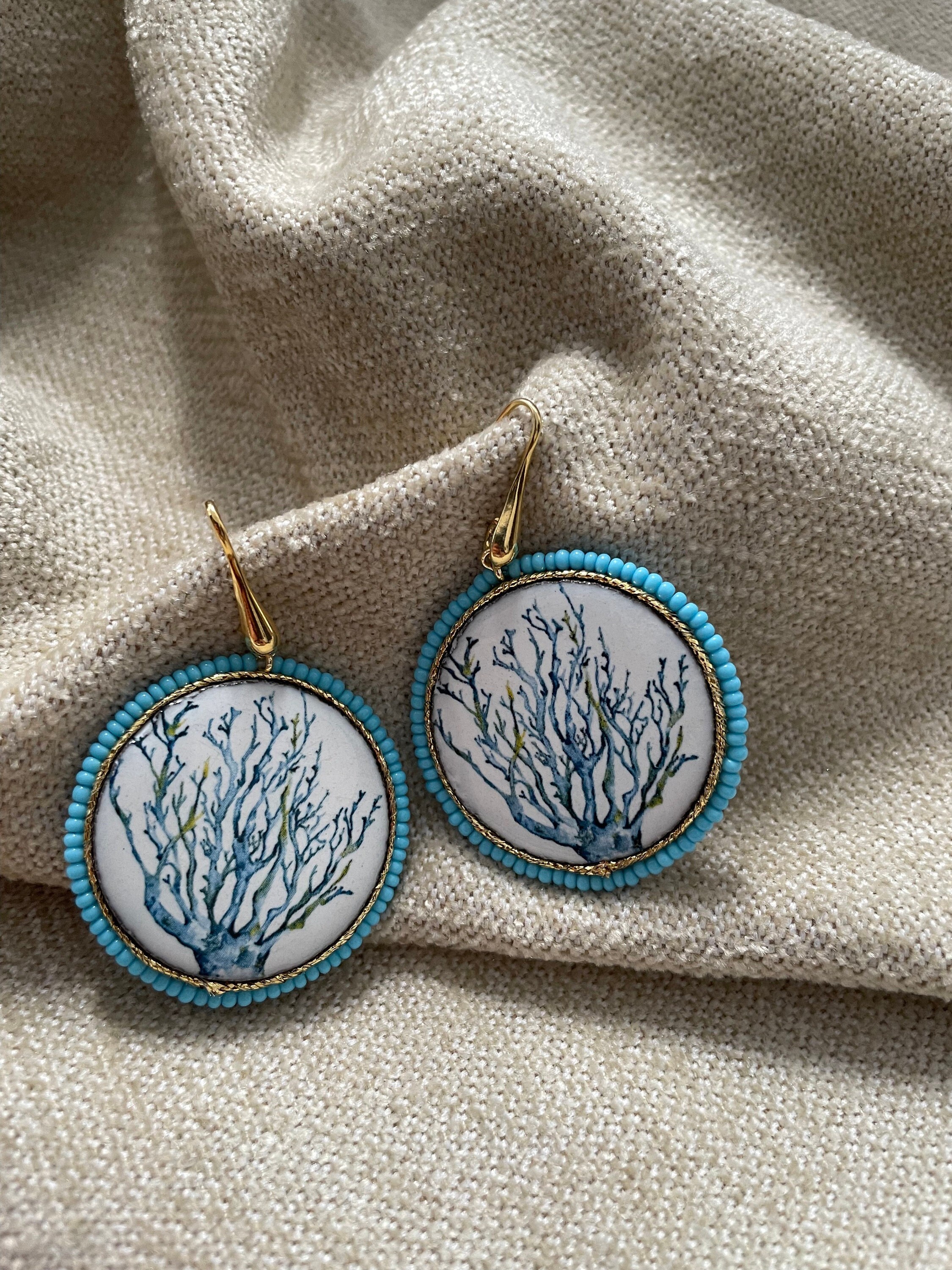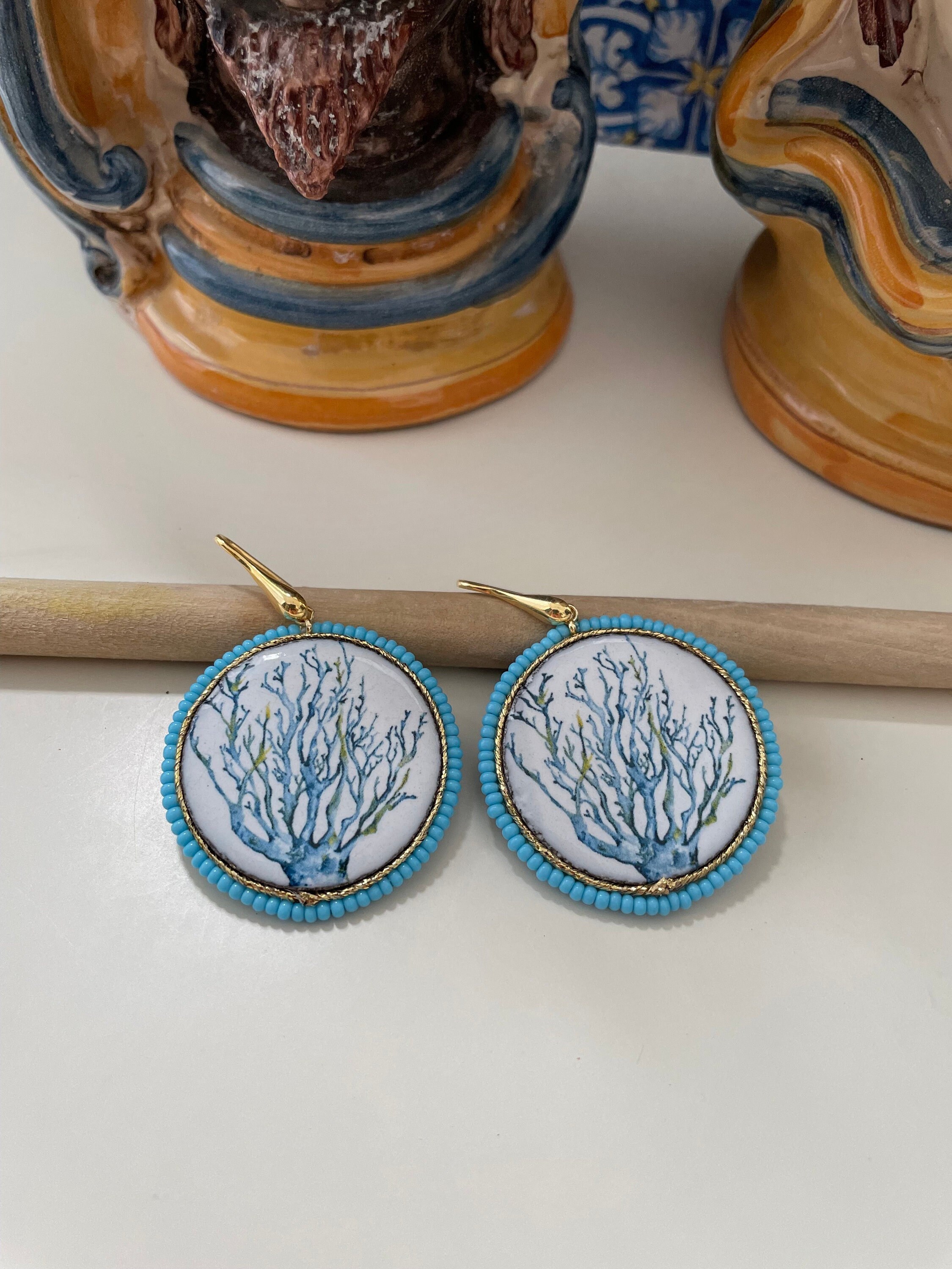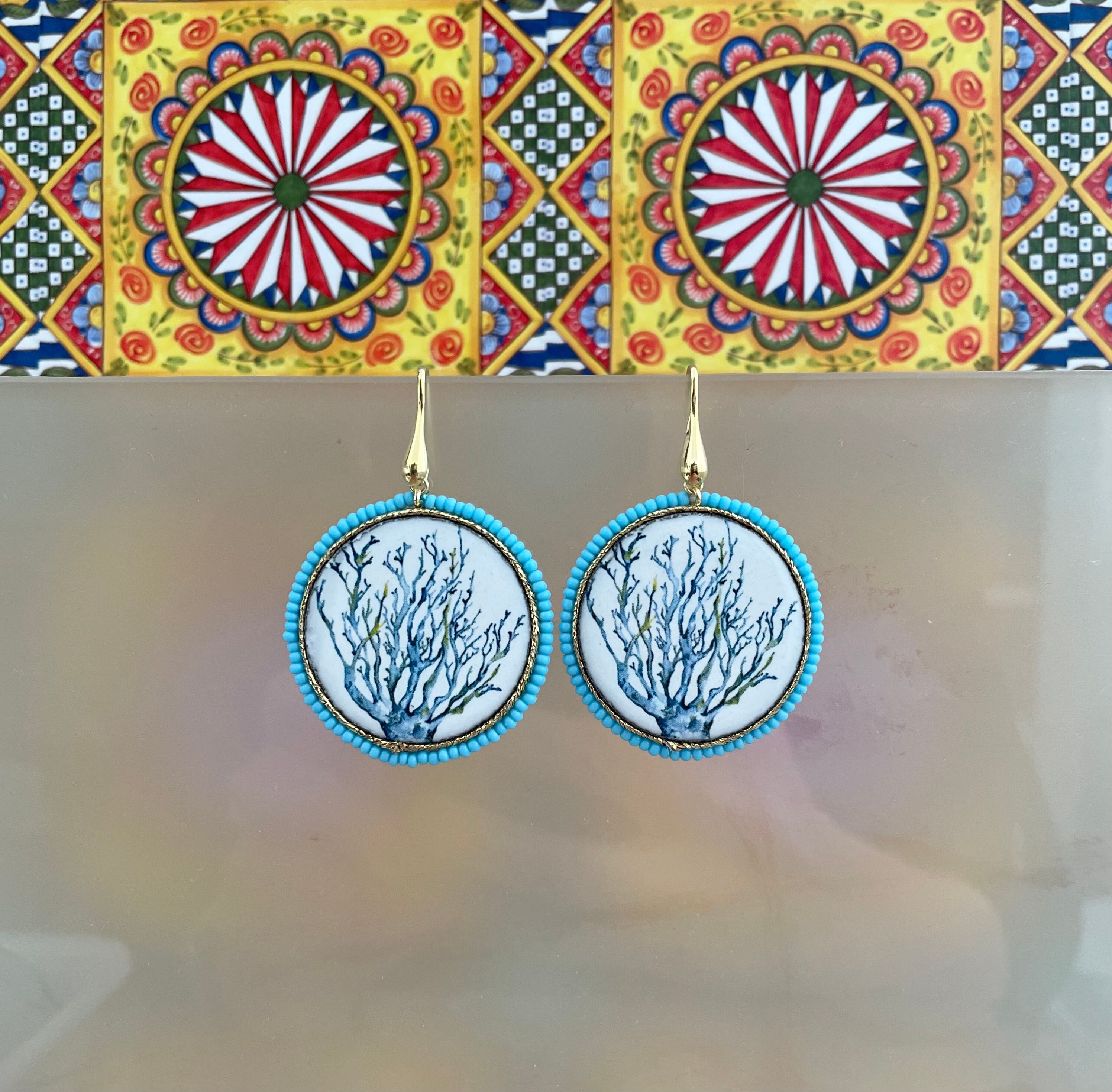 Orecchini argento 925 e grande mattonella tonda di ceramica di Caltagirone cornice di pasta di turchese.