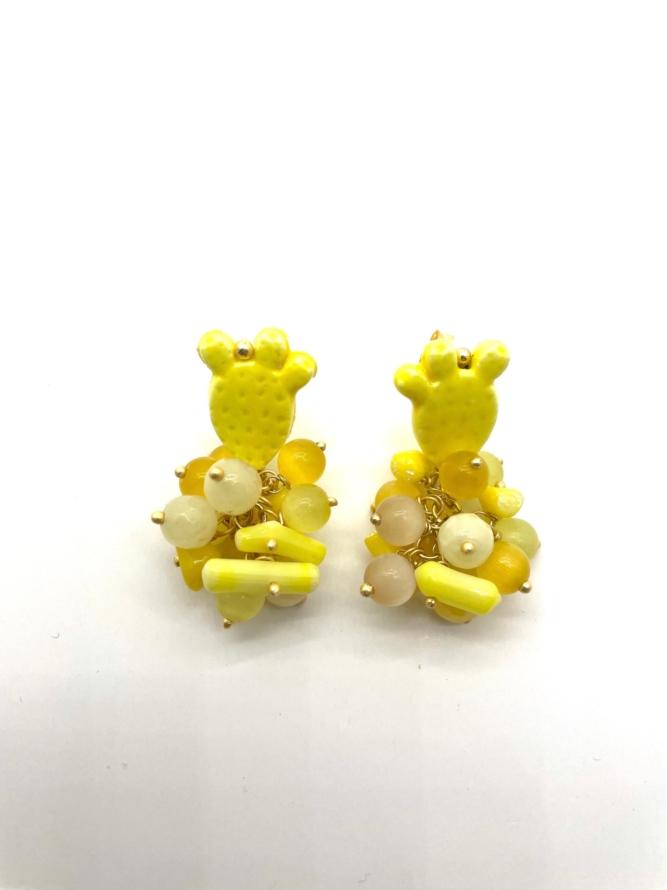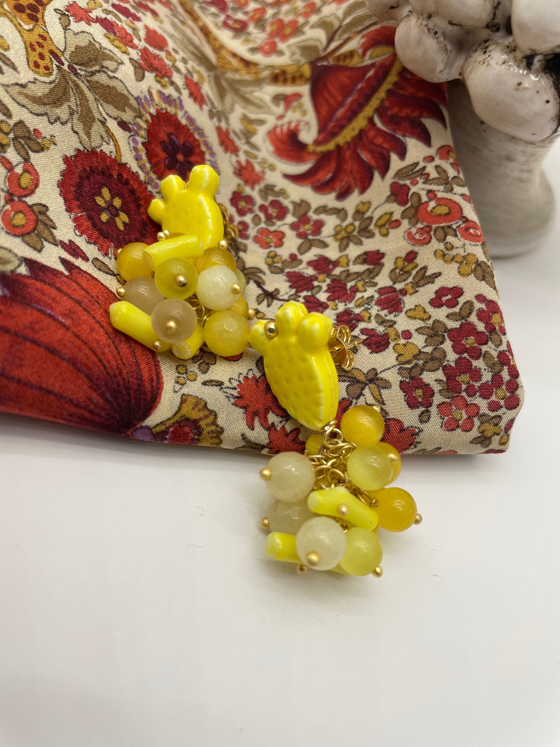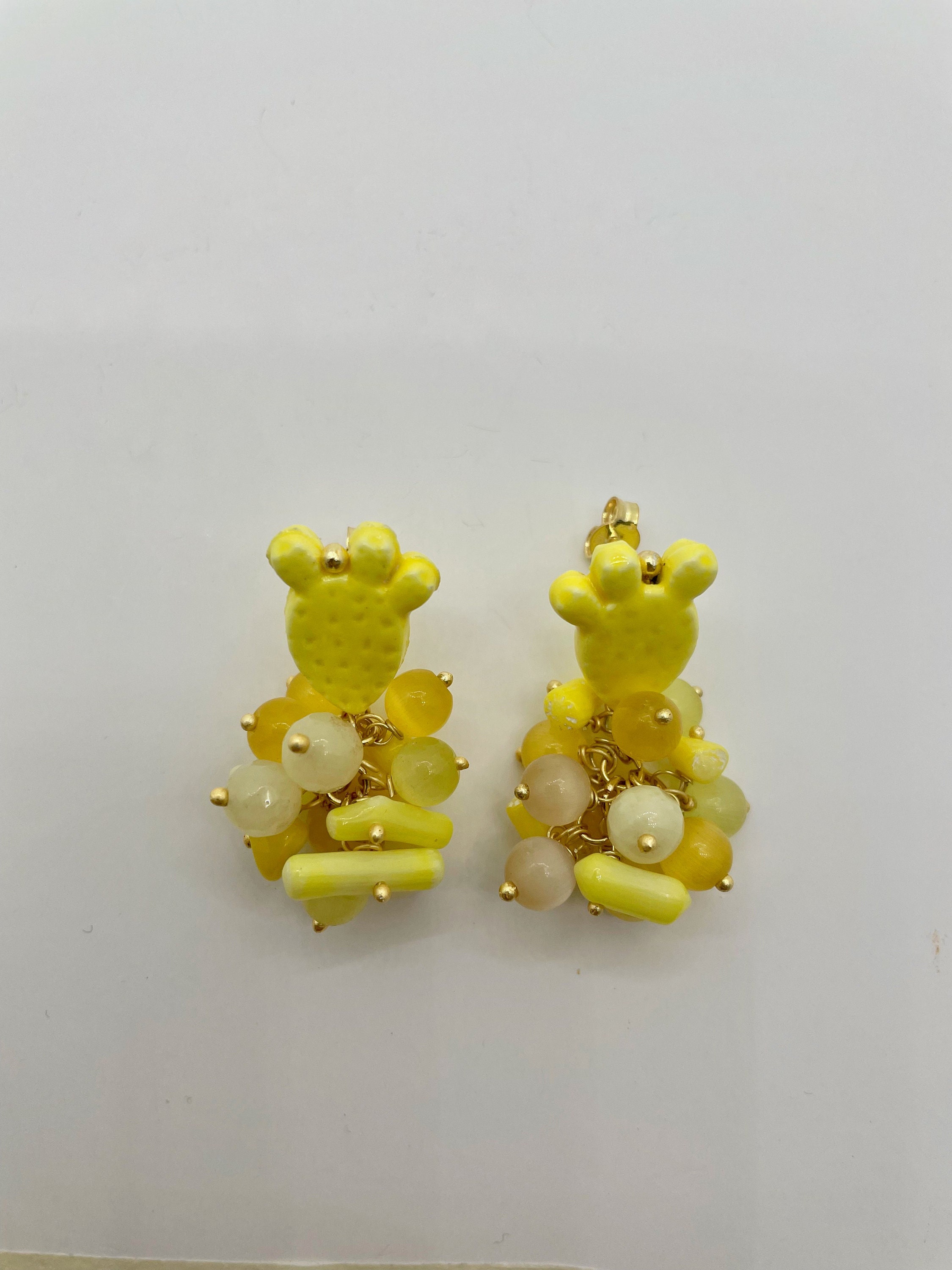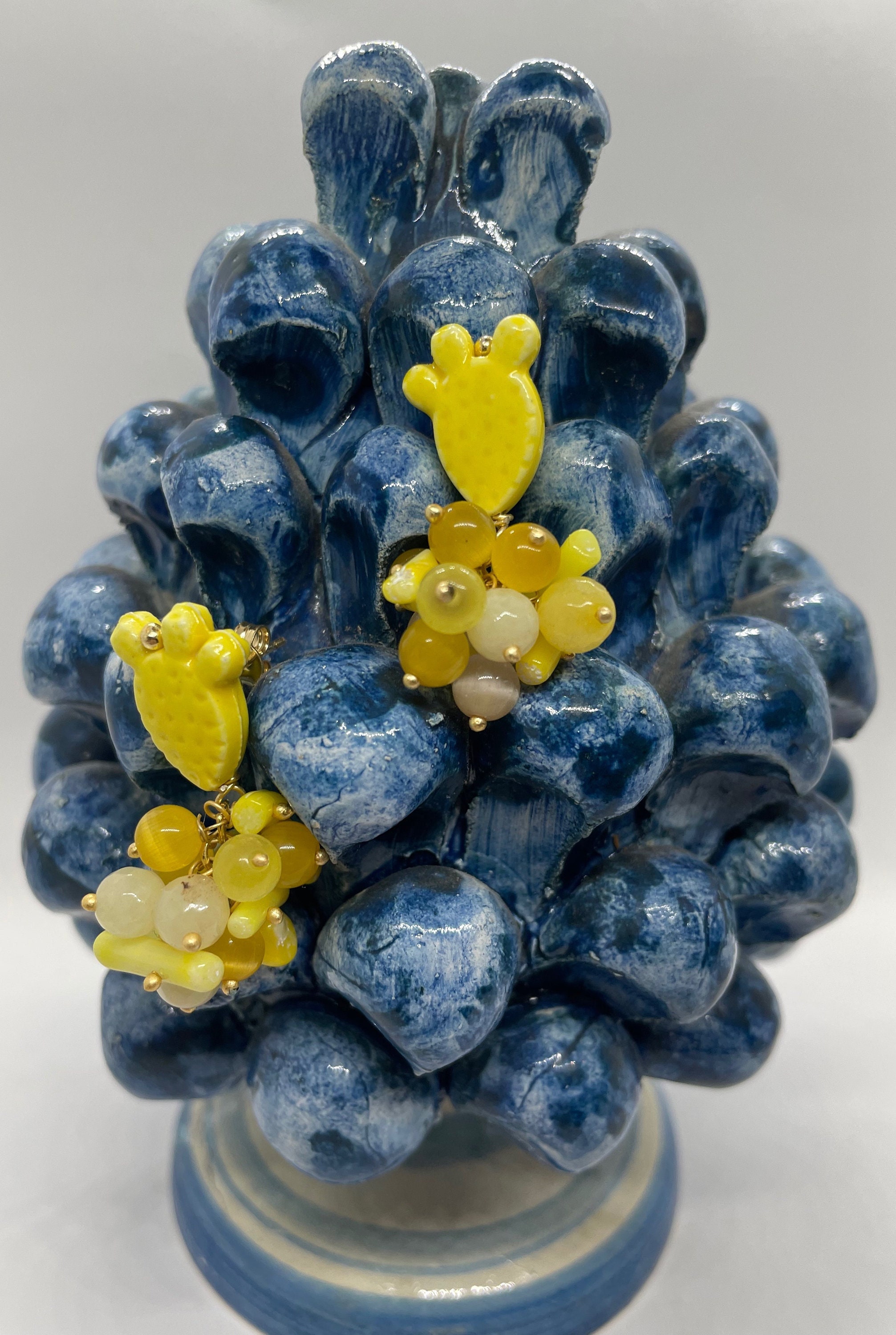 Composti da Fico d’India in ceramica di Caltagirone giallo, grappolo di perle di agata e occhio di gatto di vari colori sui toni del giallo.