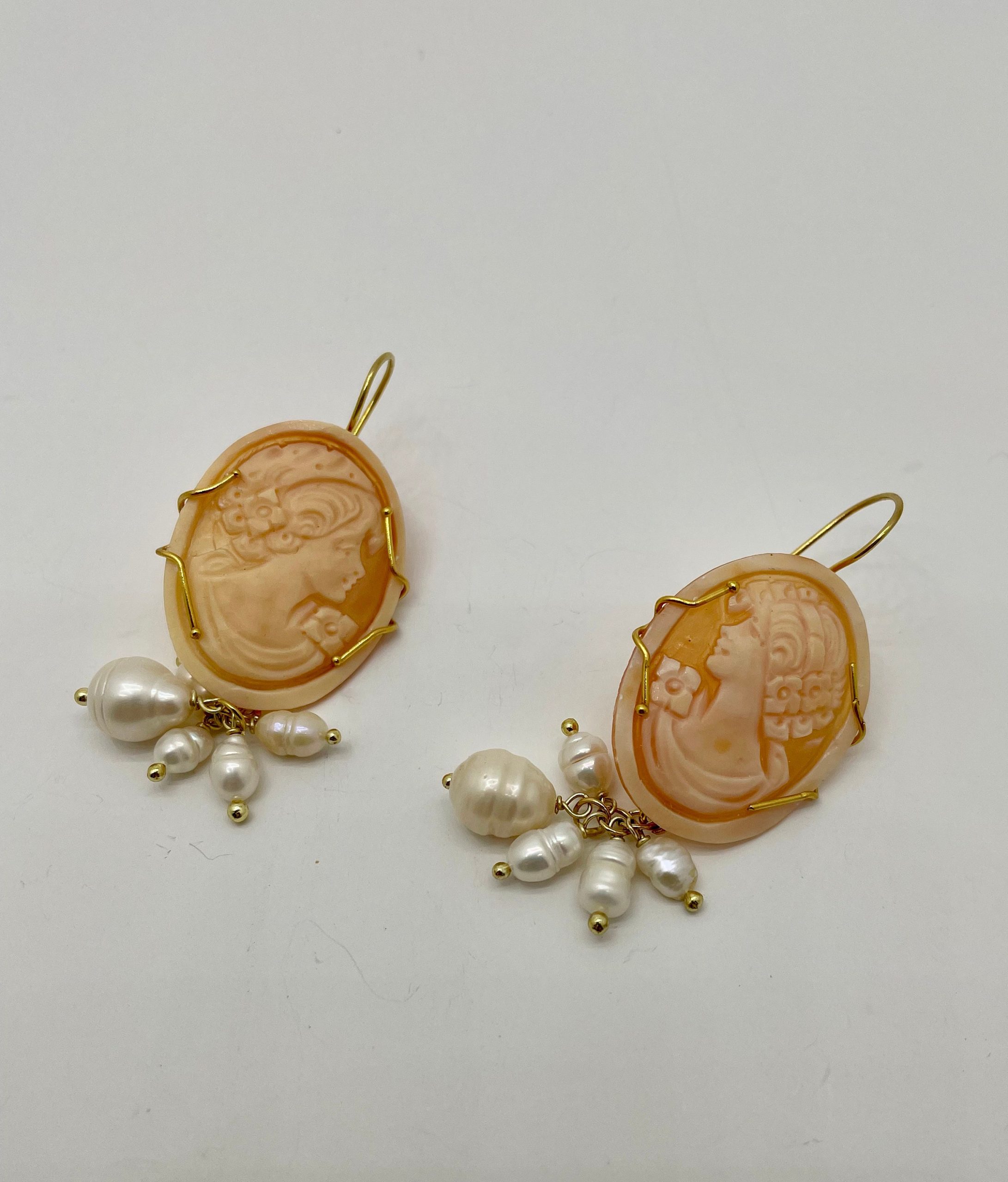 Cammei genuini di vera conchiglia lavorati a mano a Torre del Greco. I due Cammei raffigurano volti femminili. Da essi pendono grappoli di perle di fiume.