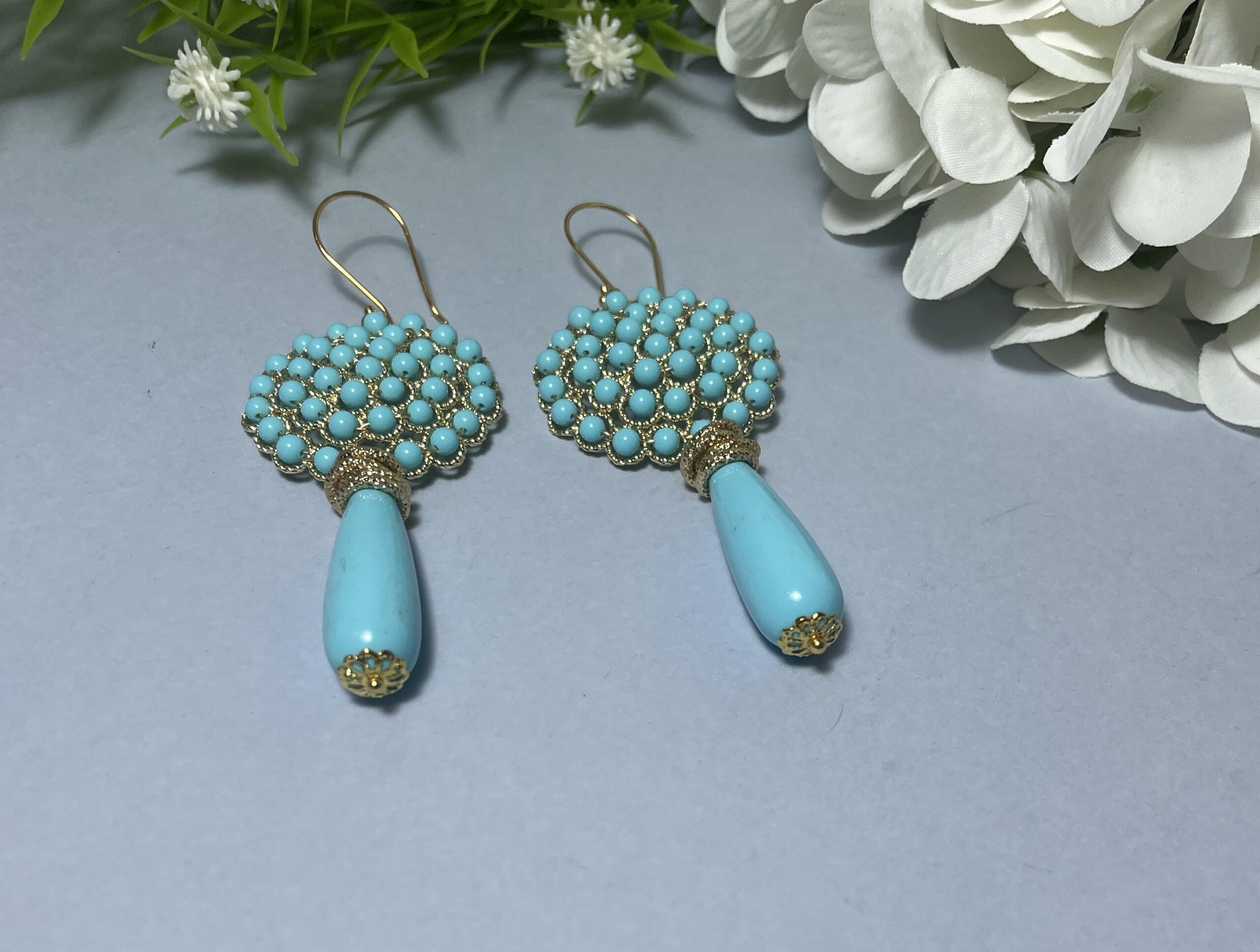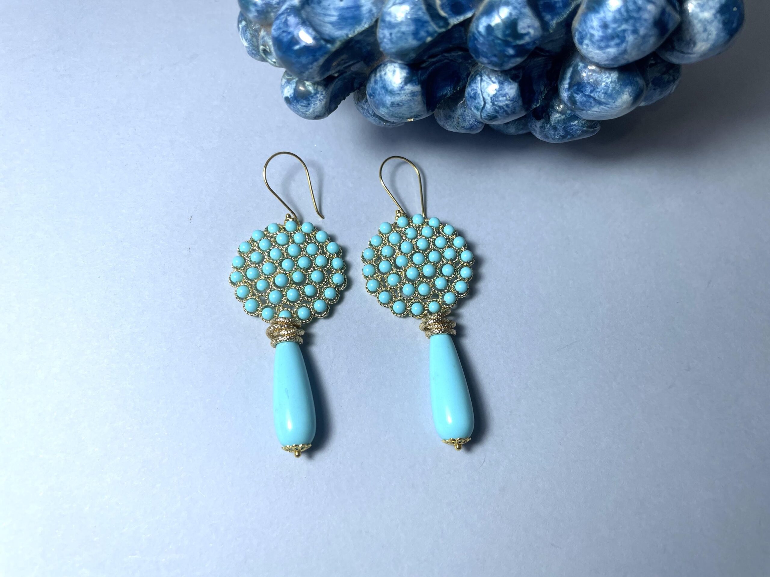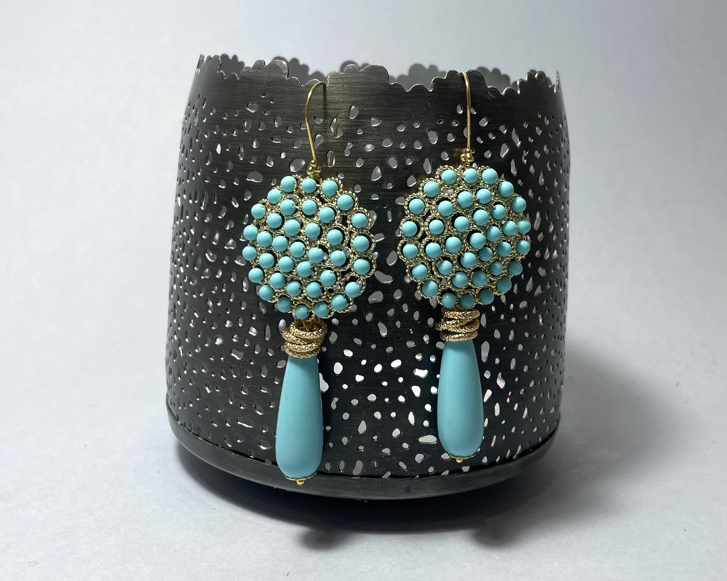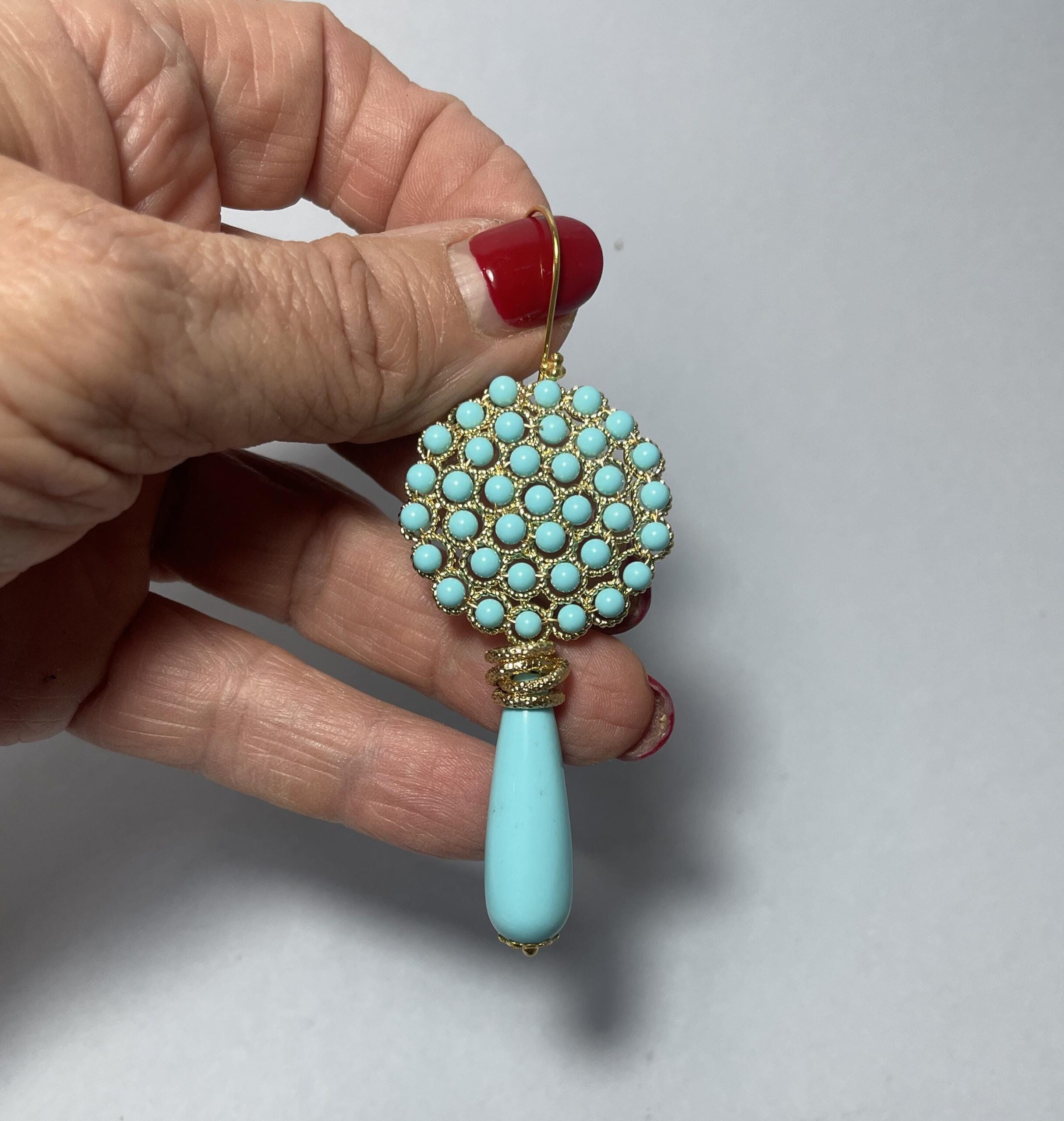 Bellissimi orecchini maxi pendenti, fatti a mano, realizzati con filigrana intrecciata a perle di pasta di turchese. Pendente una bella perla a goccia di pasta di turchese