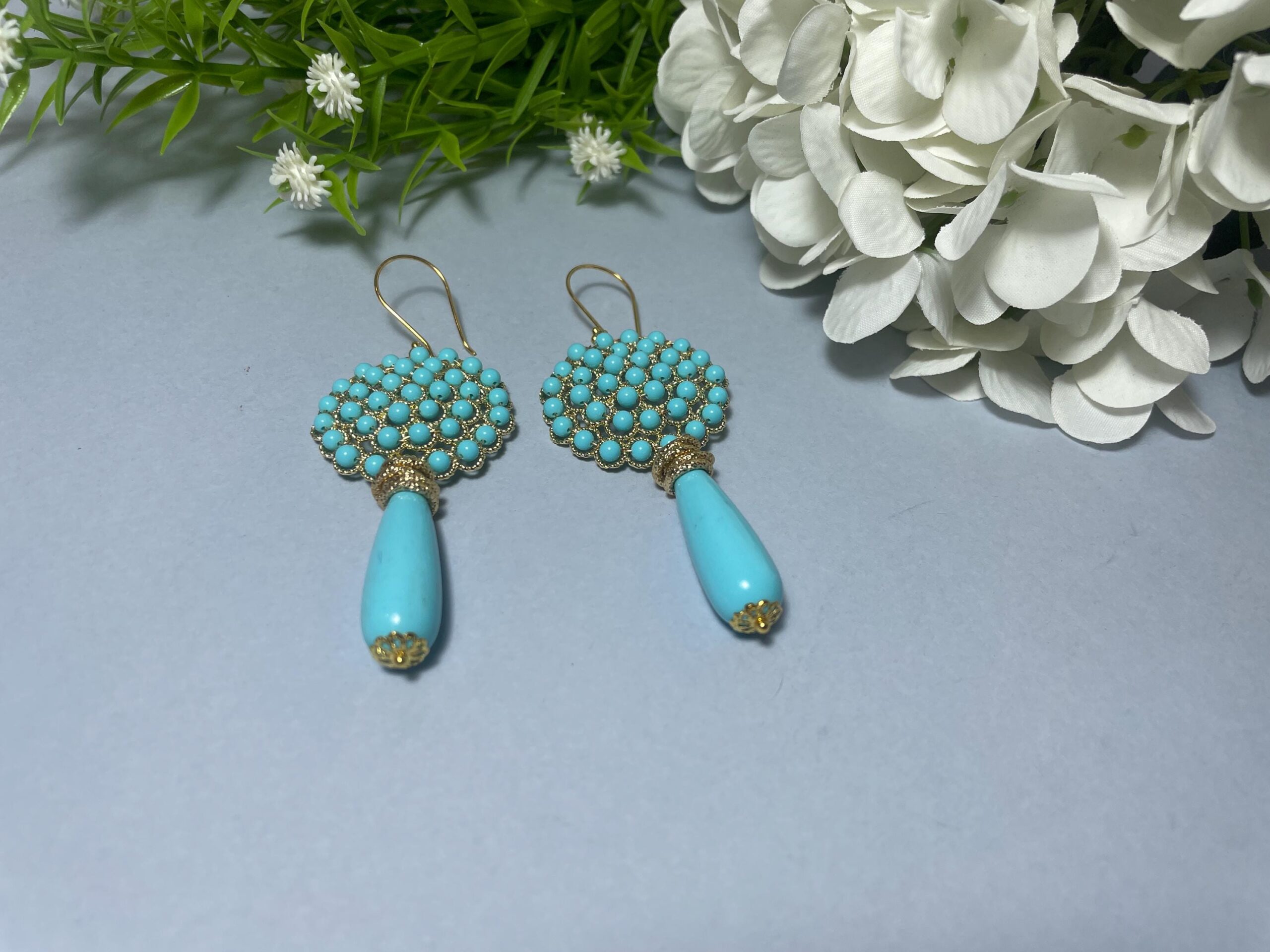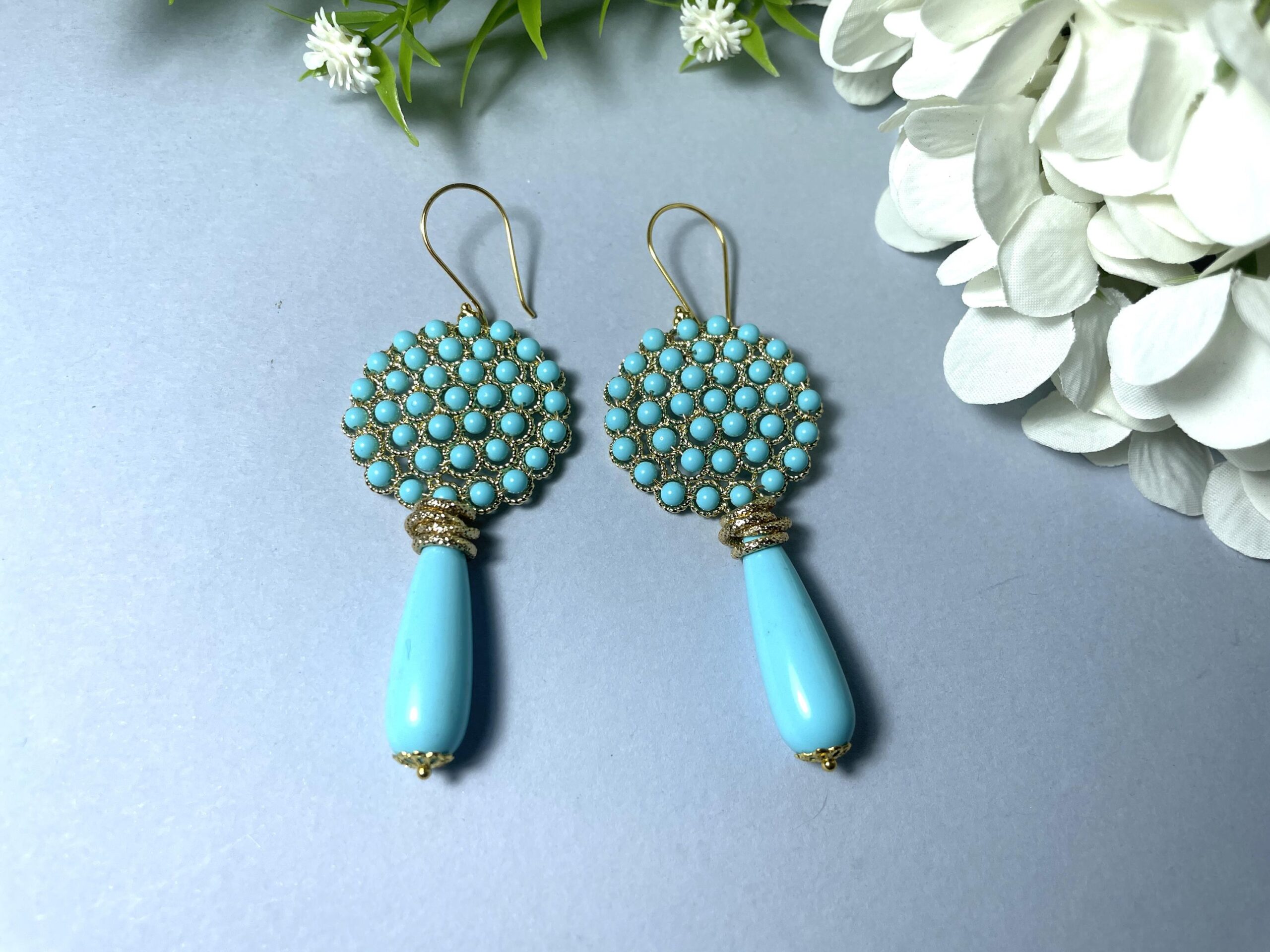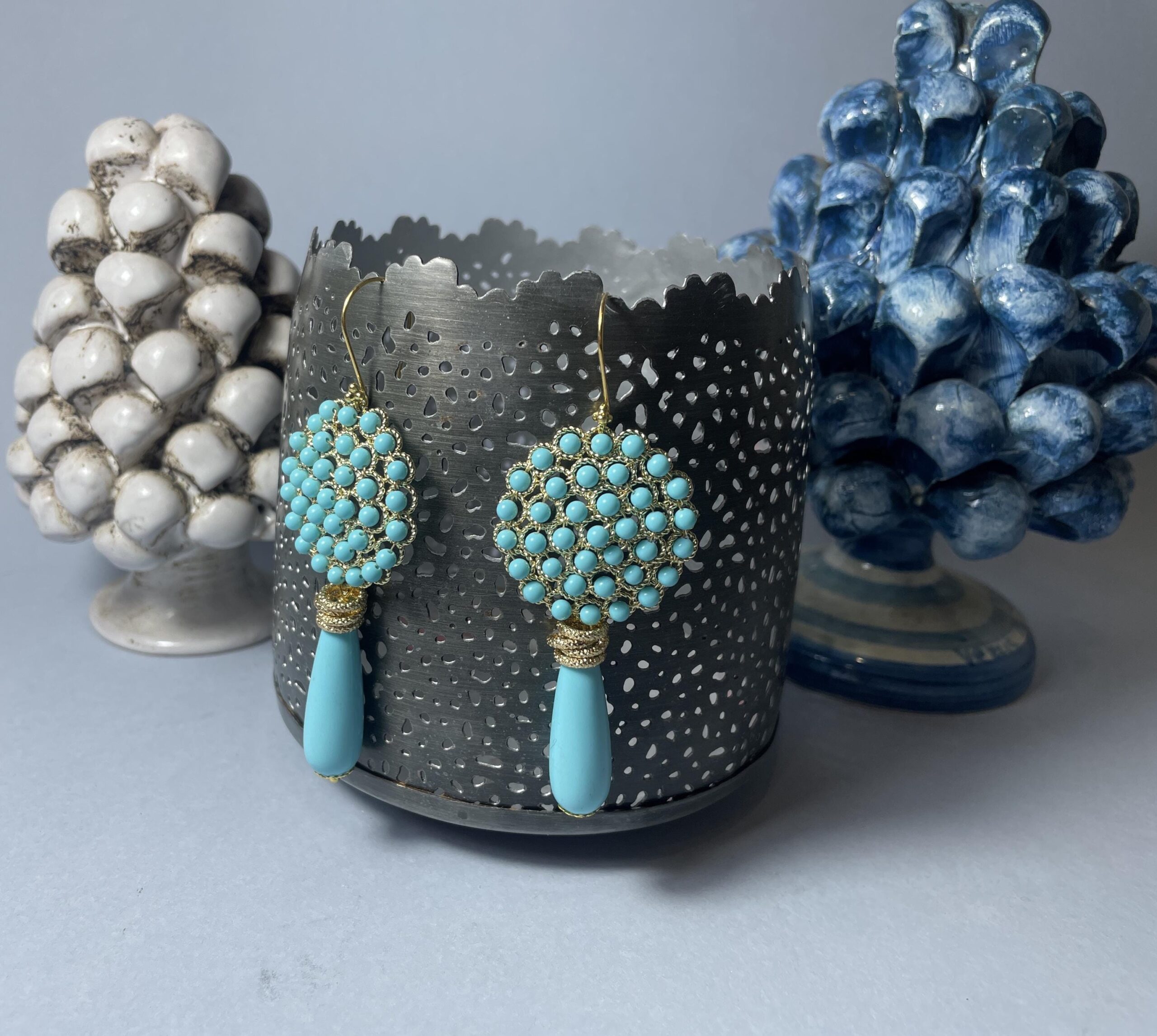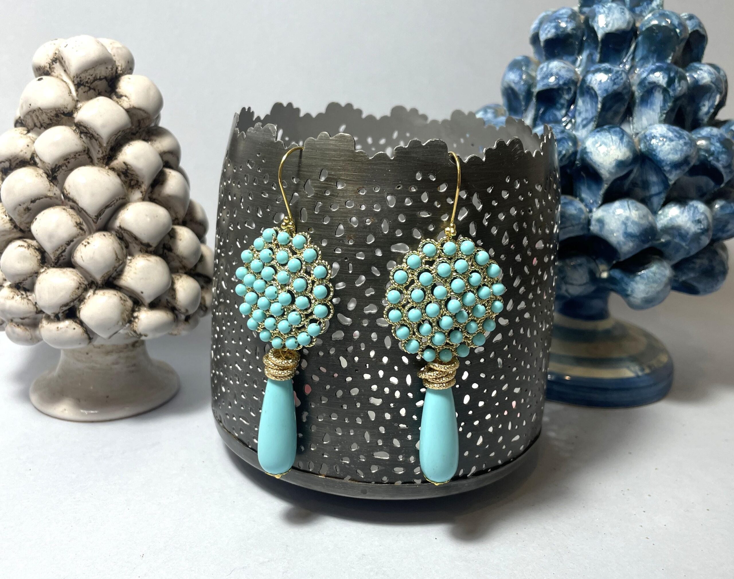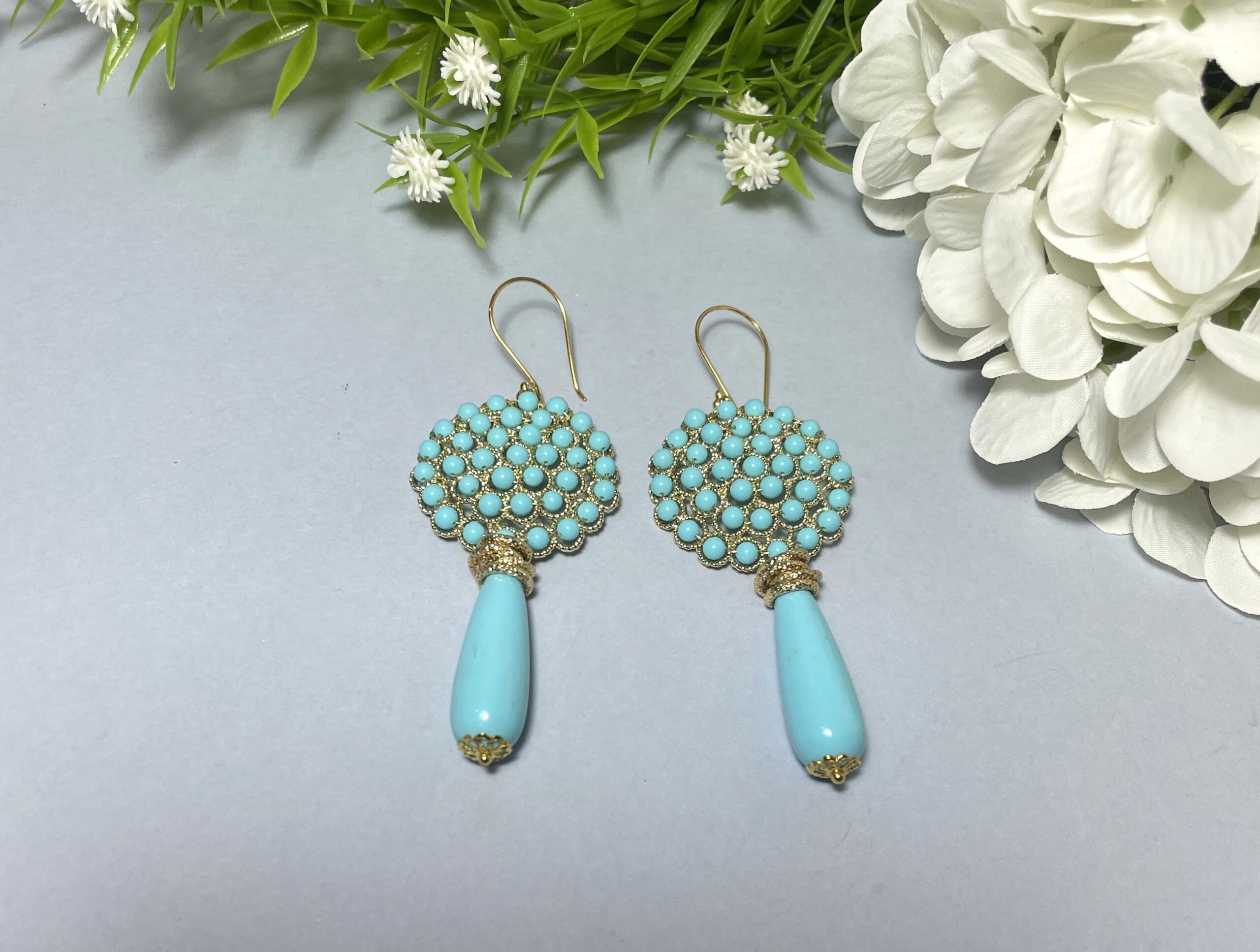 Bellissimi orecchini maxi pendenti, fatti a mano, realizzati con filigrana intrecciata a perle di pasta di turchese. Pendente una bella perla a goccia di pasta di turchese