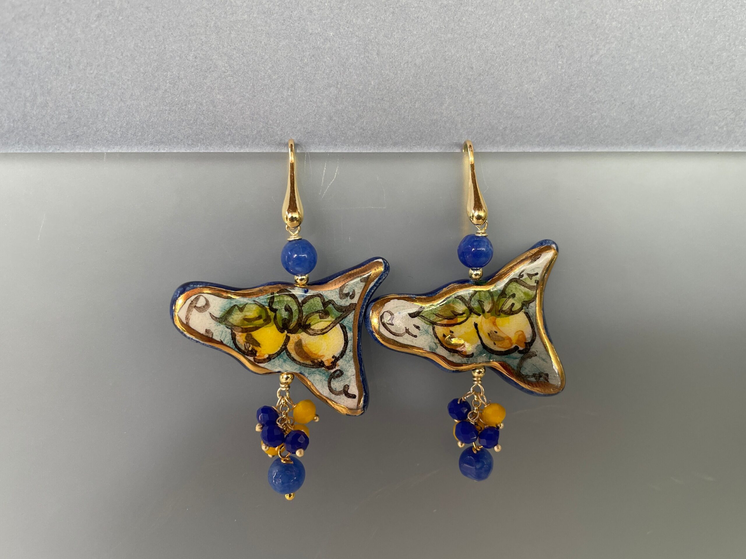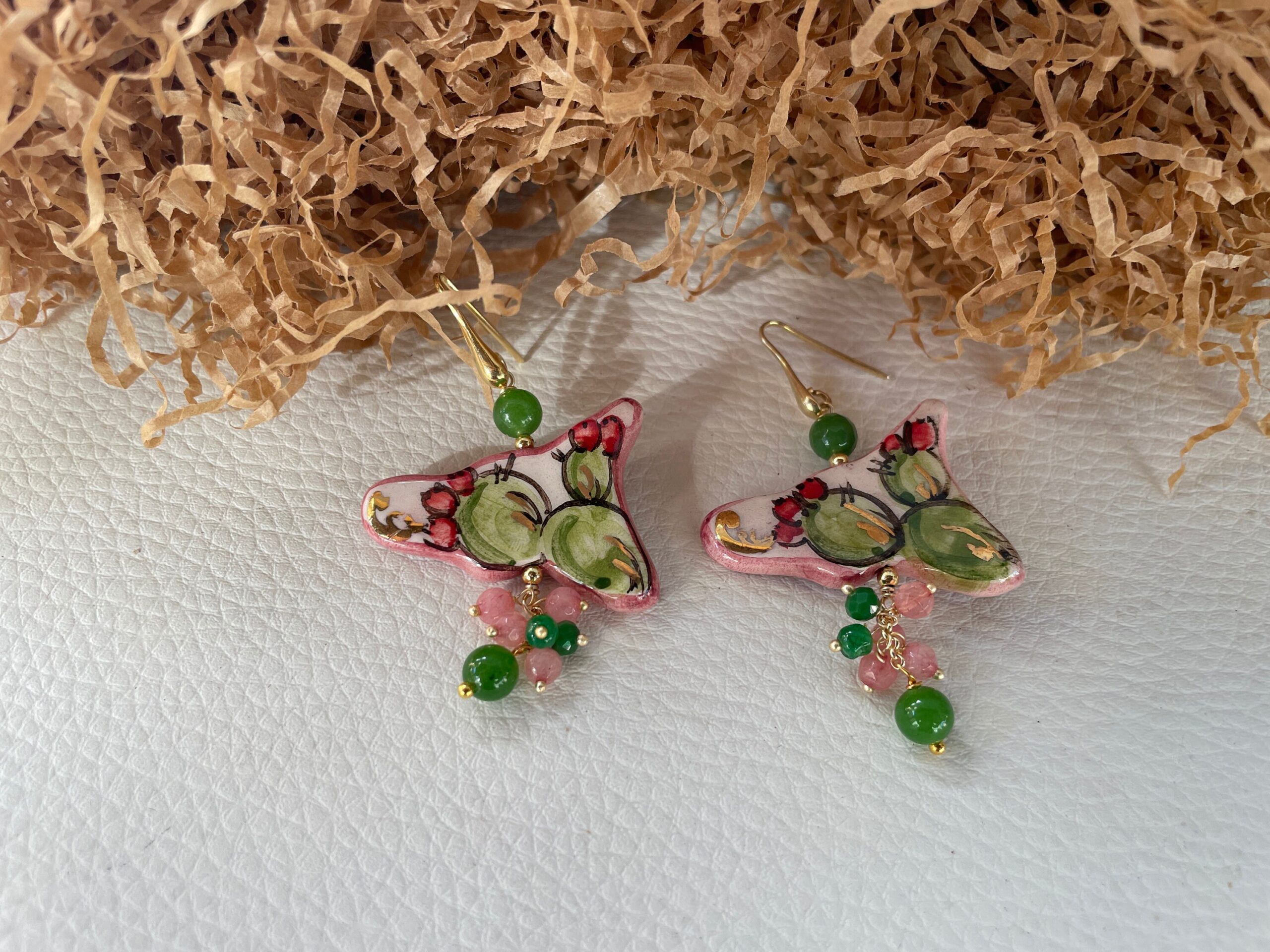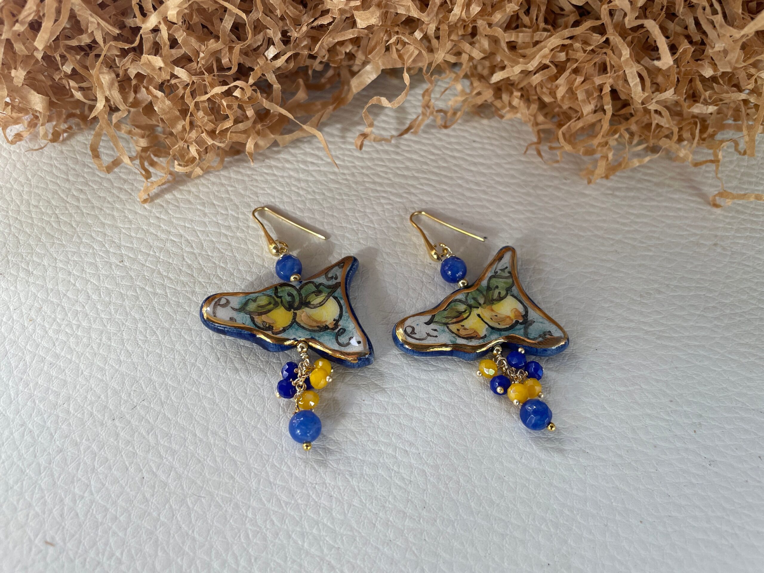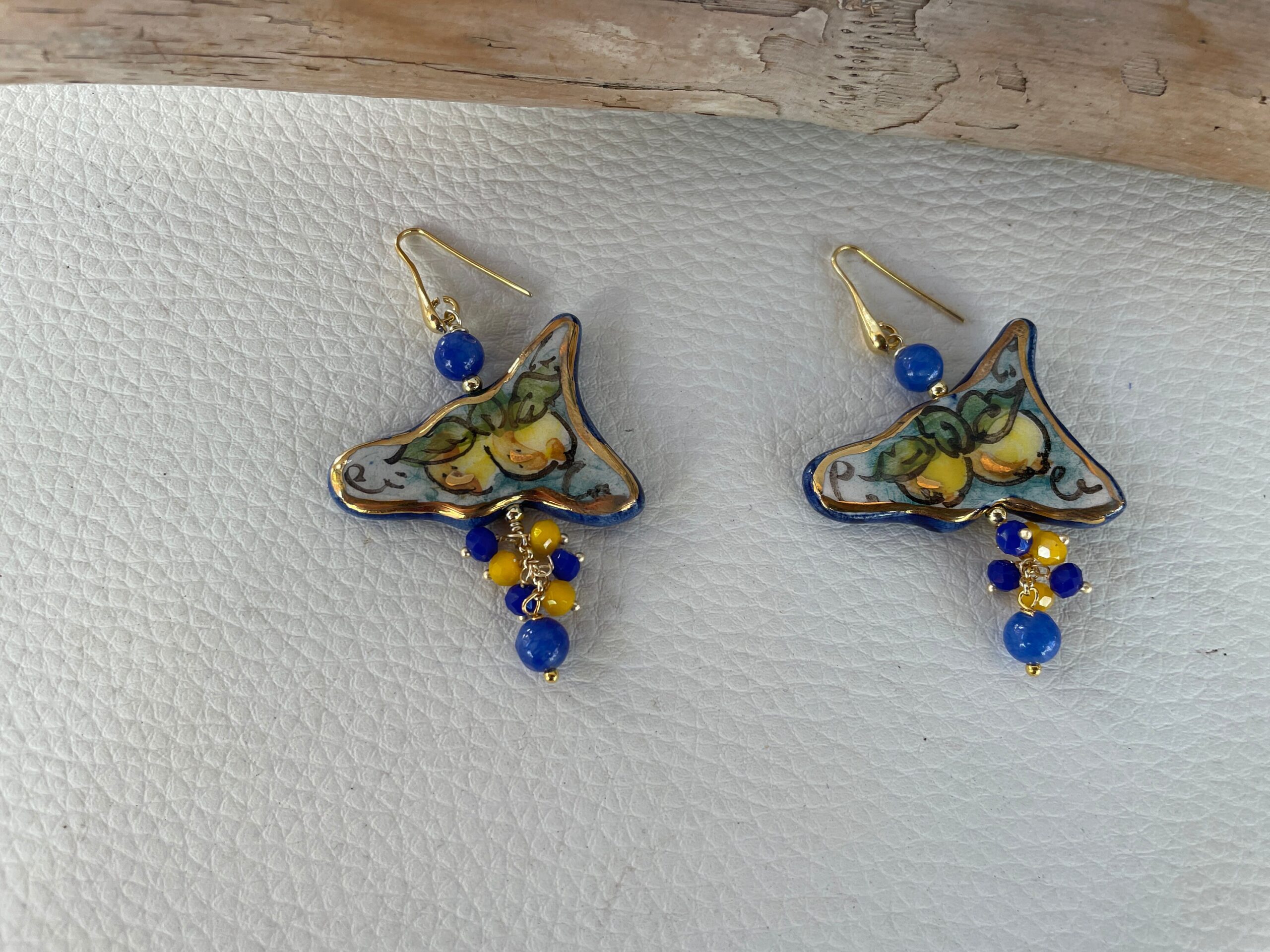 Orecchini dal gusto squisitamente siciliano. Realizzati con ciondoli di ceramic di Caltagirone, dipinti a mano, a forma di Sicilia e raffiguranti in superficie, a seconda della fantasia che scegliete, alcuni simboli della tradizione siciliana: il Fico d’India e i Limoni!