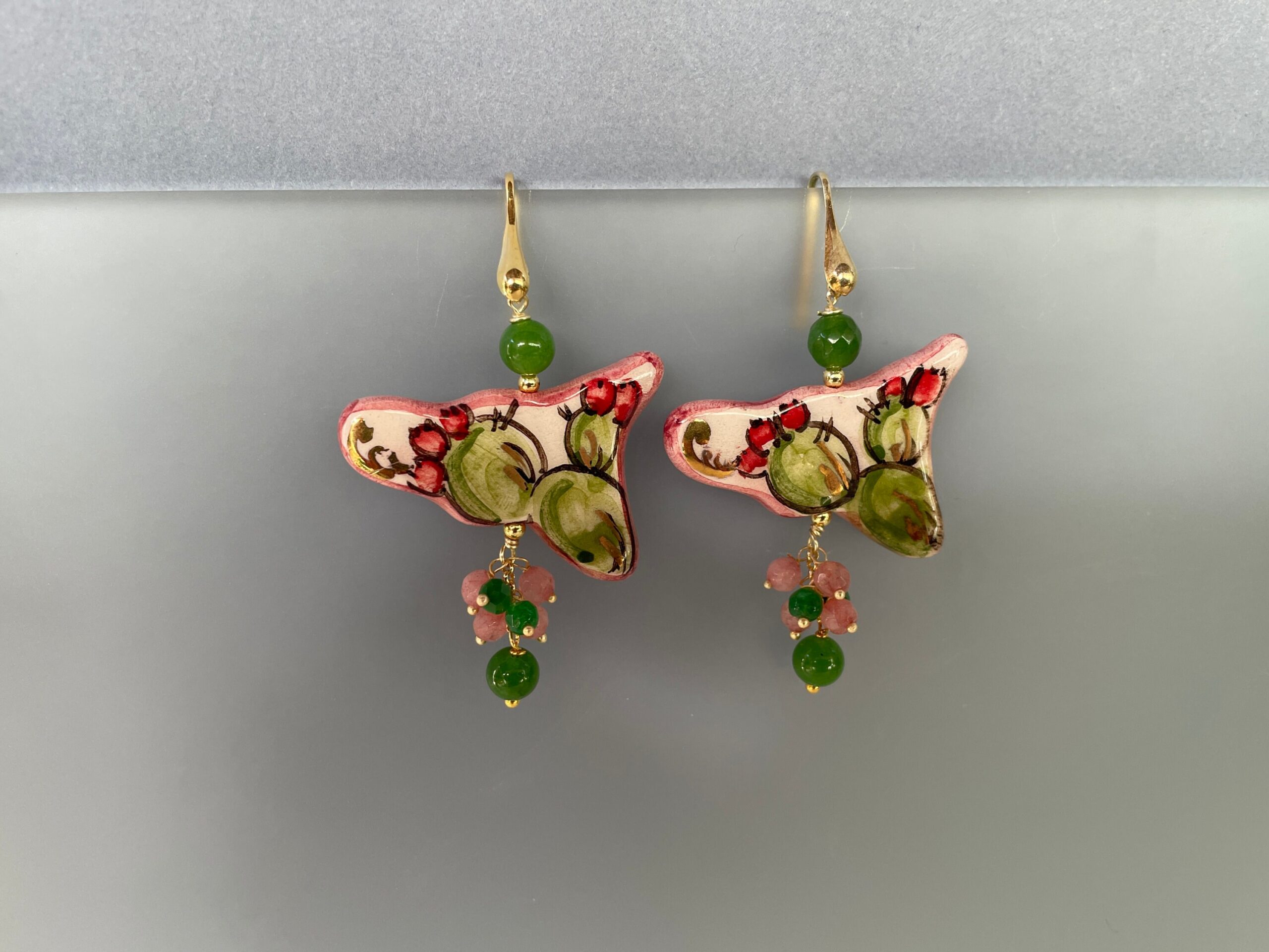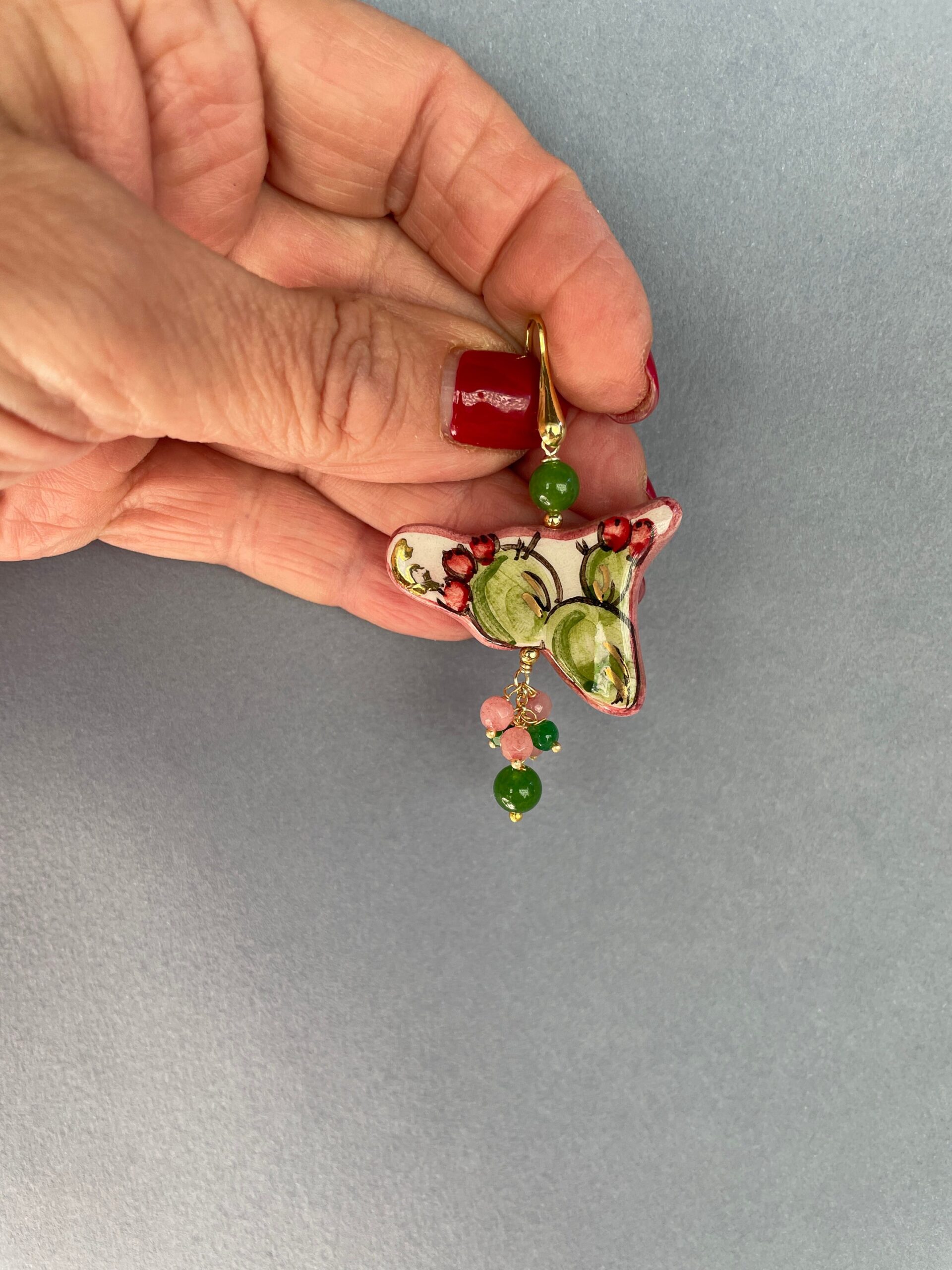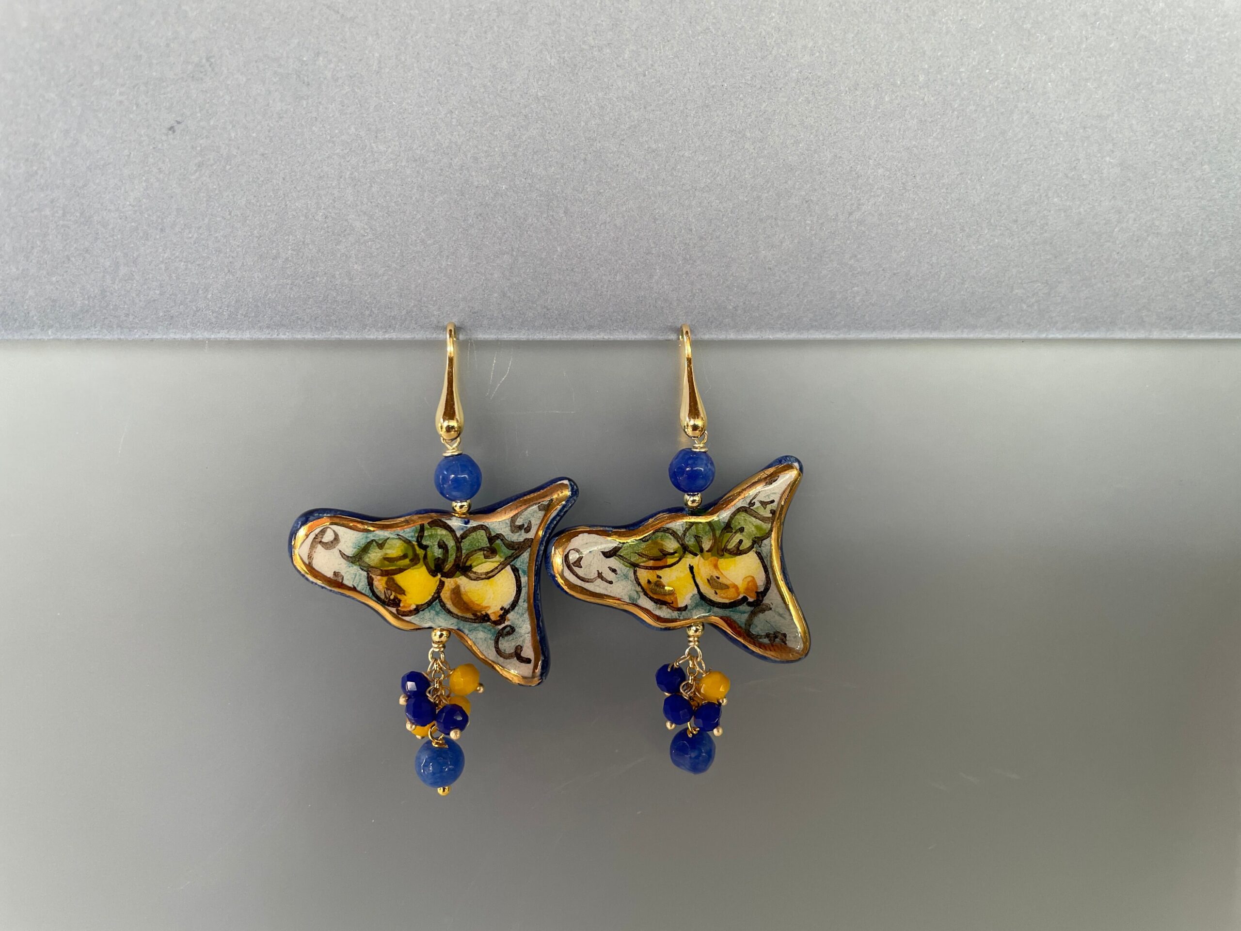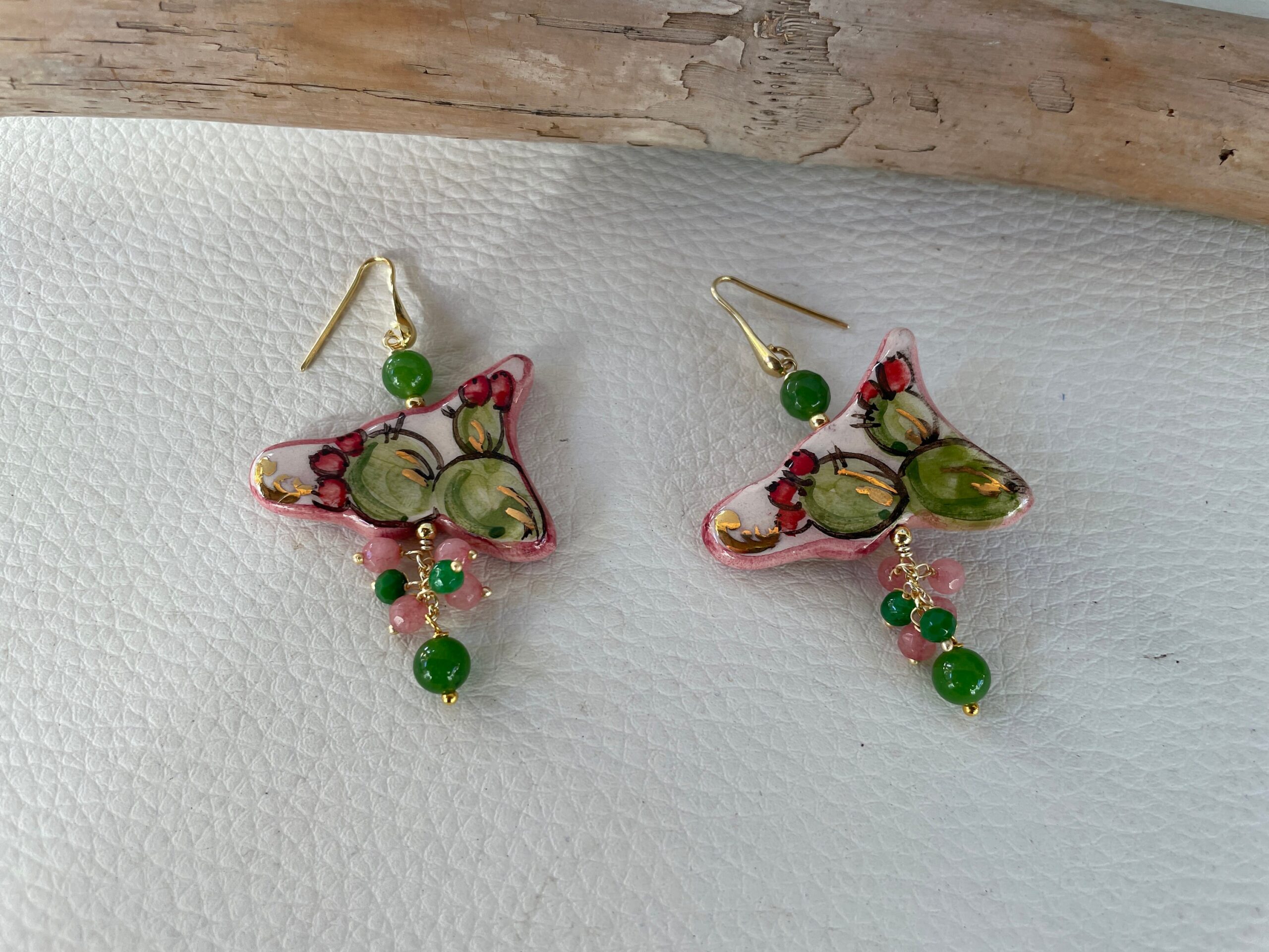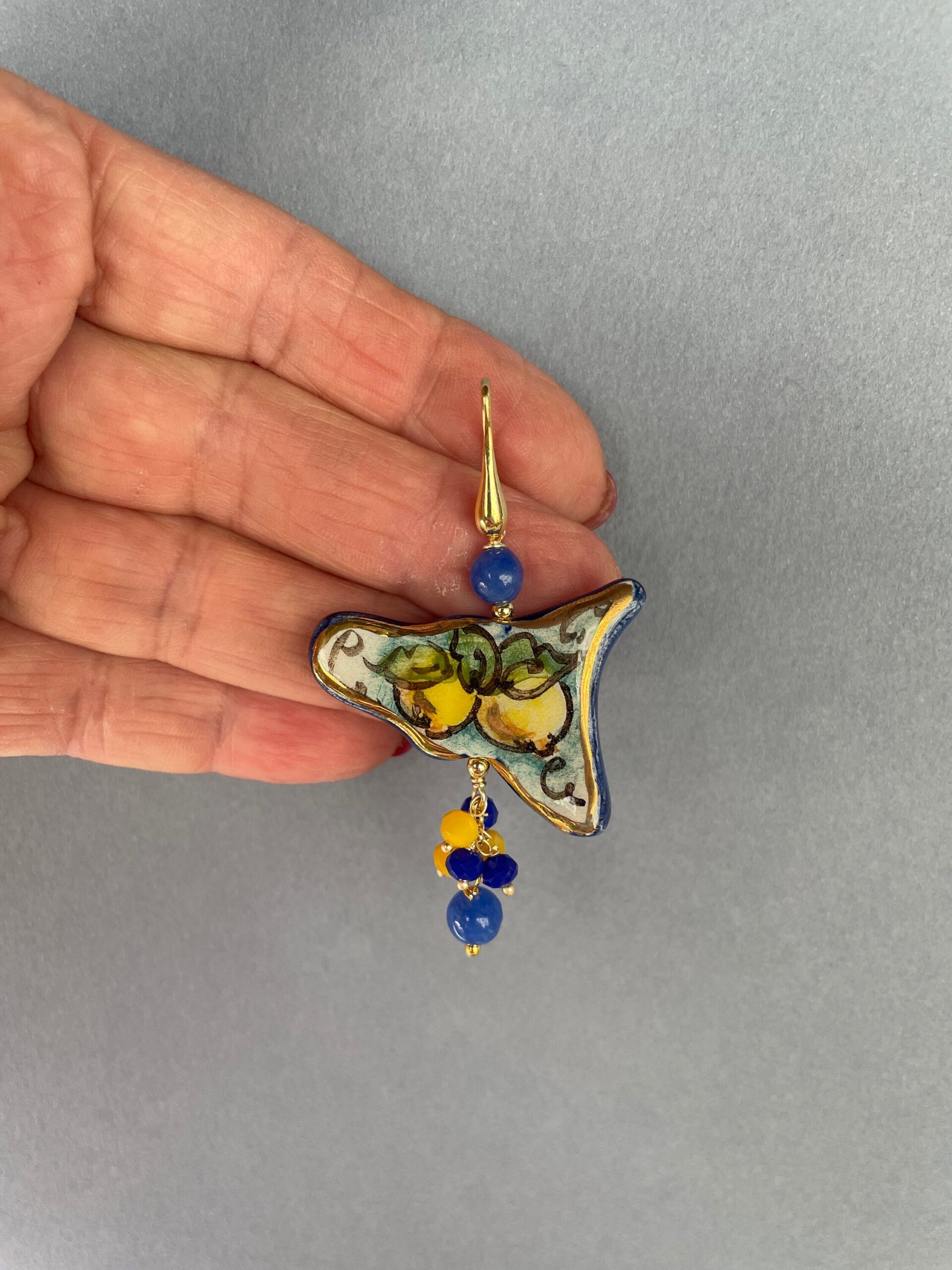 Orecchini dal gusto squisitamente siciliano. Realizzati con ciondoli di ceramic di Caltagirone, dipinti a mano, a forma di Sicilia e raffiguranti in superficie, a seconda della fantasia che scegliete, alcuni simboli della tradizione siciliana: il Fico d’India e i Limoni!