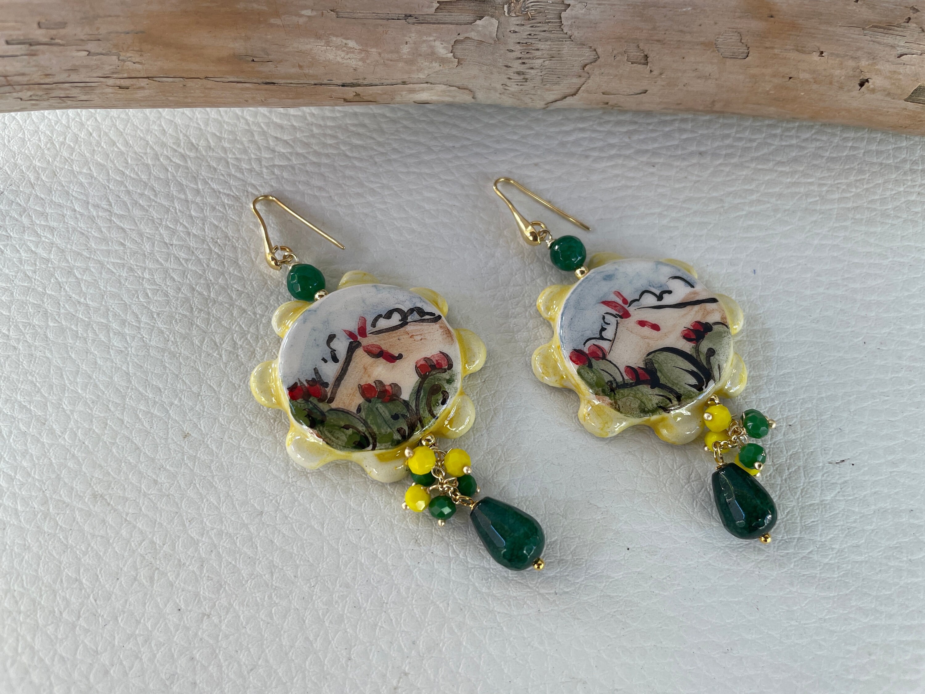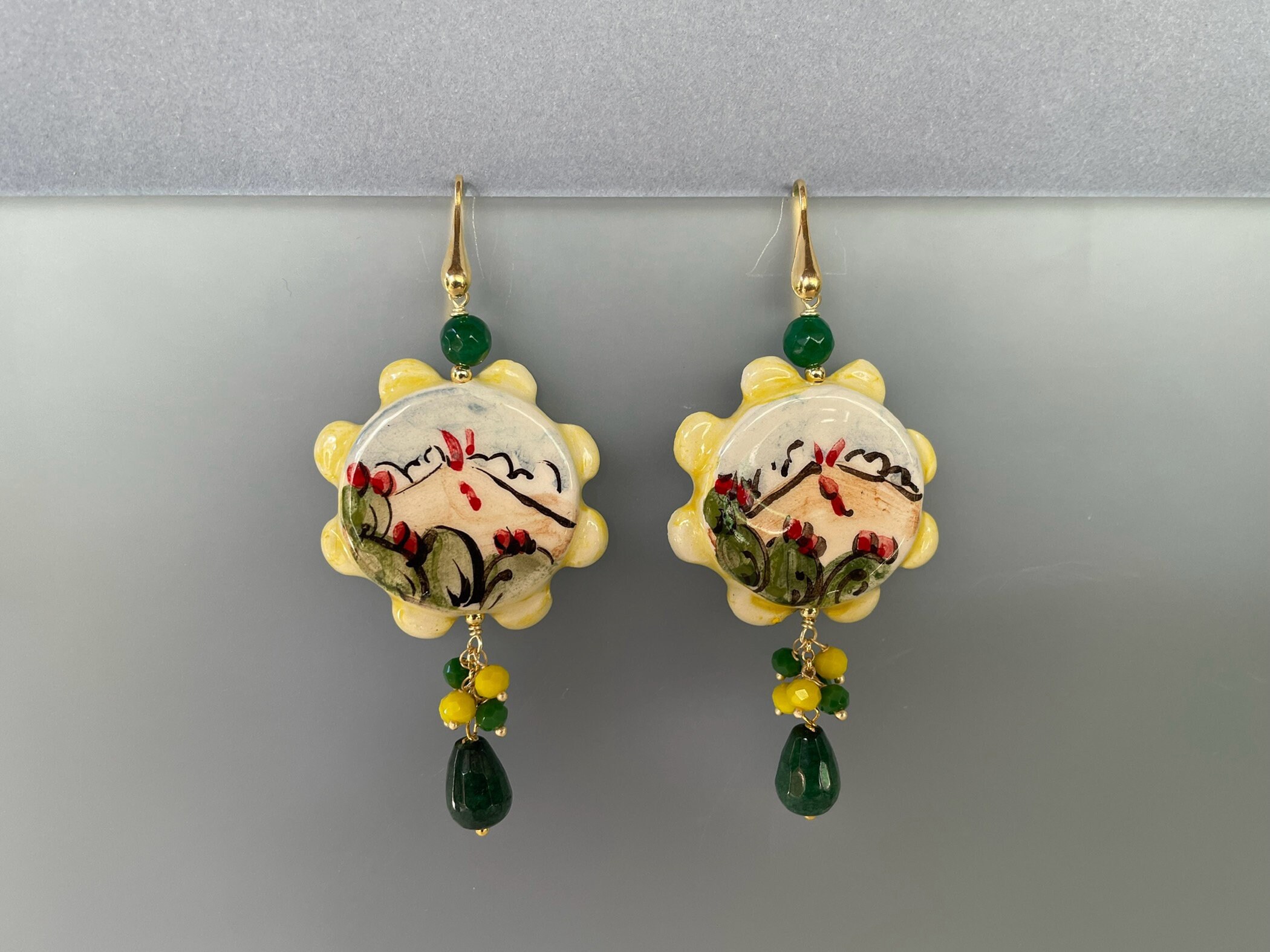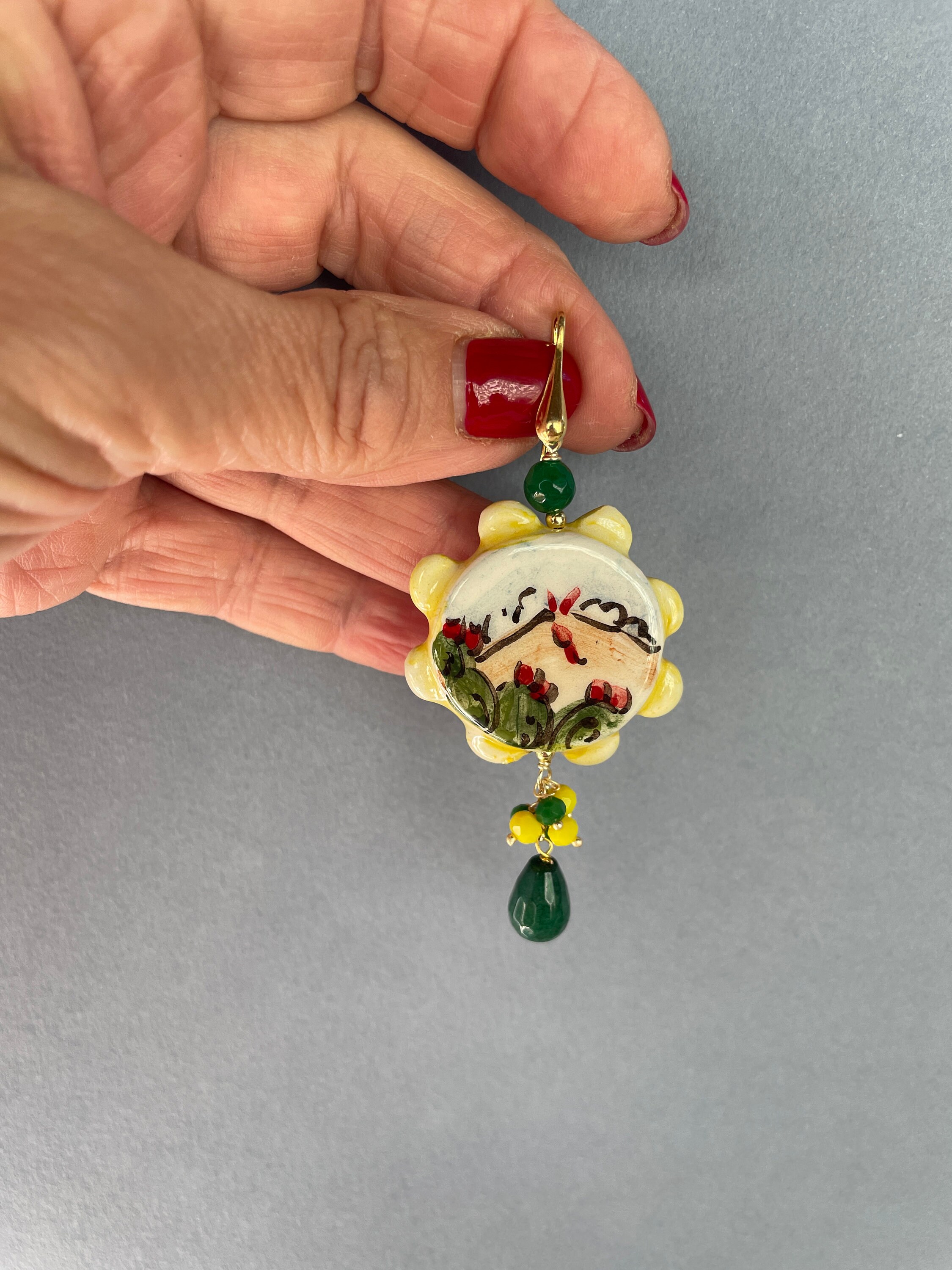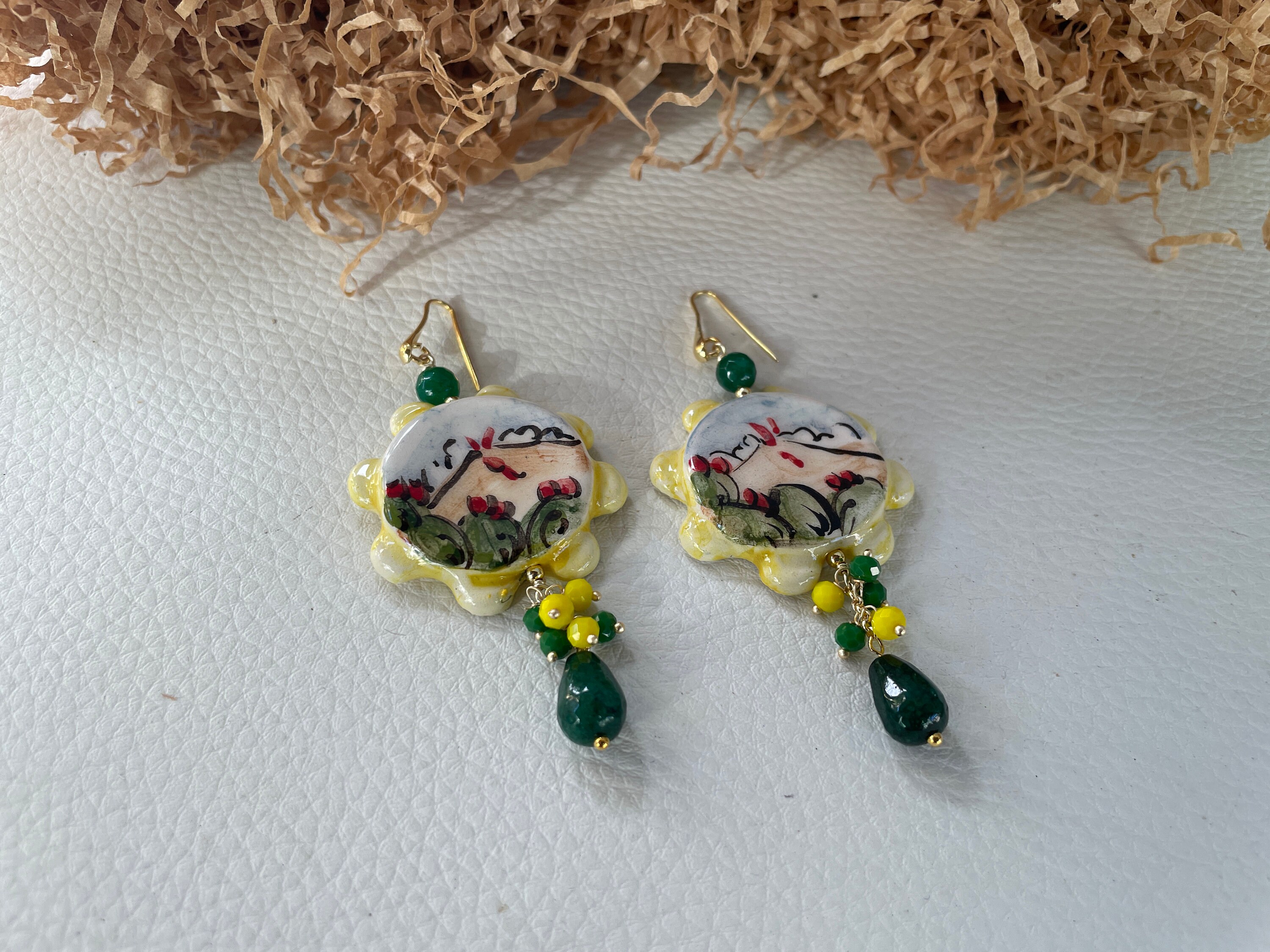 Caratteristici orecchini siciliani con il tipico Tamburello, realizzato in ceramica di Caltagirone dipinta a mano, e raffigurante in superficie l’Etna e Fichi d’India.