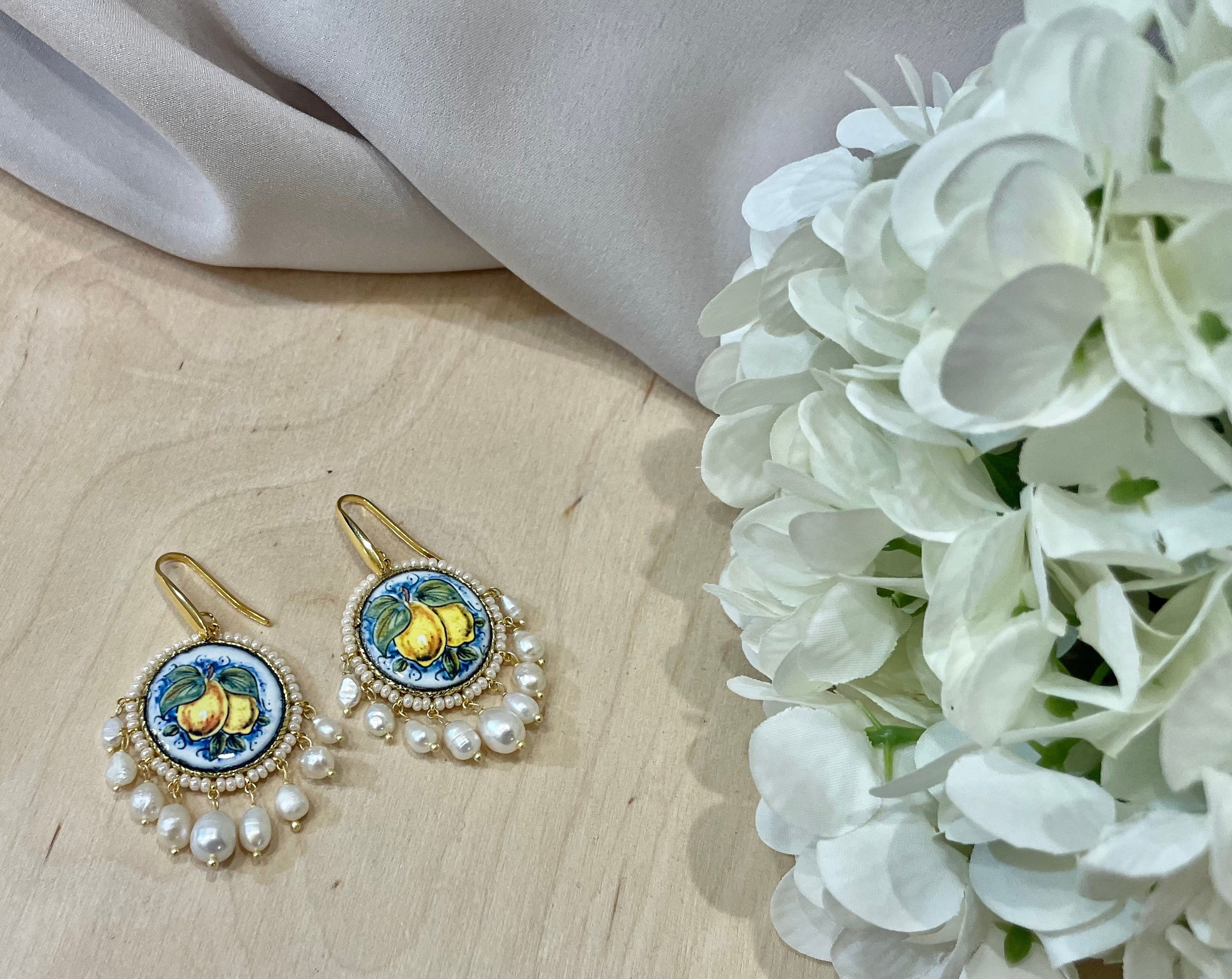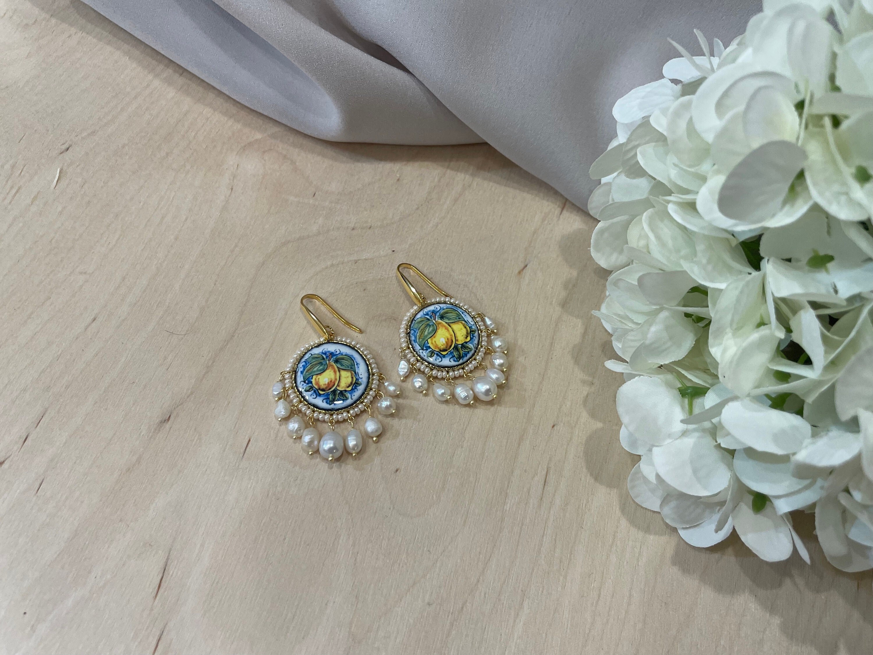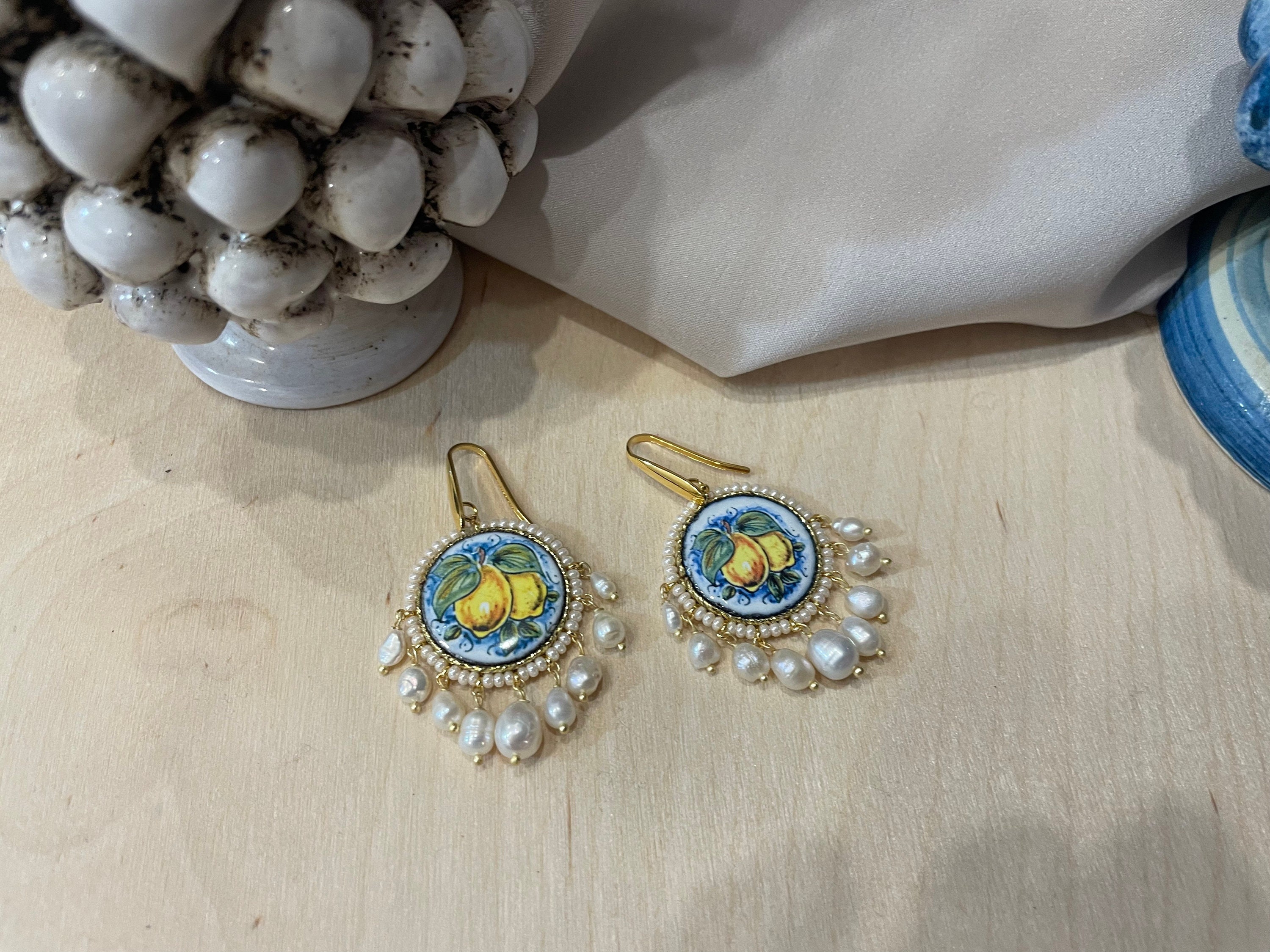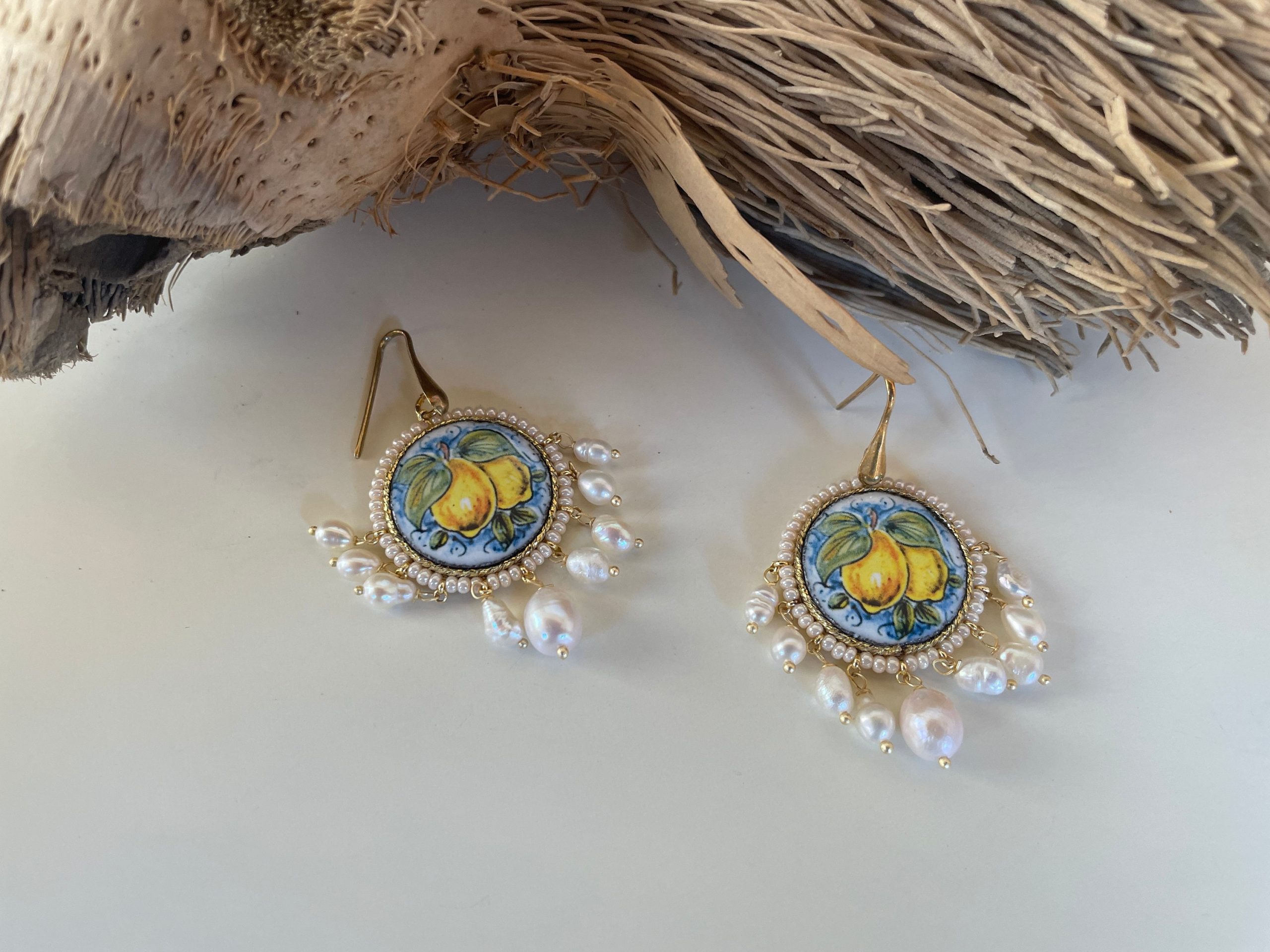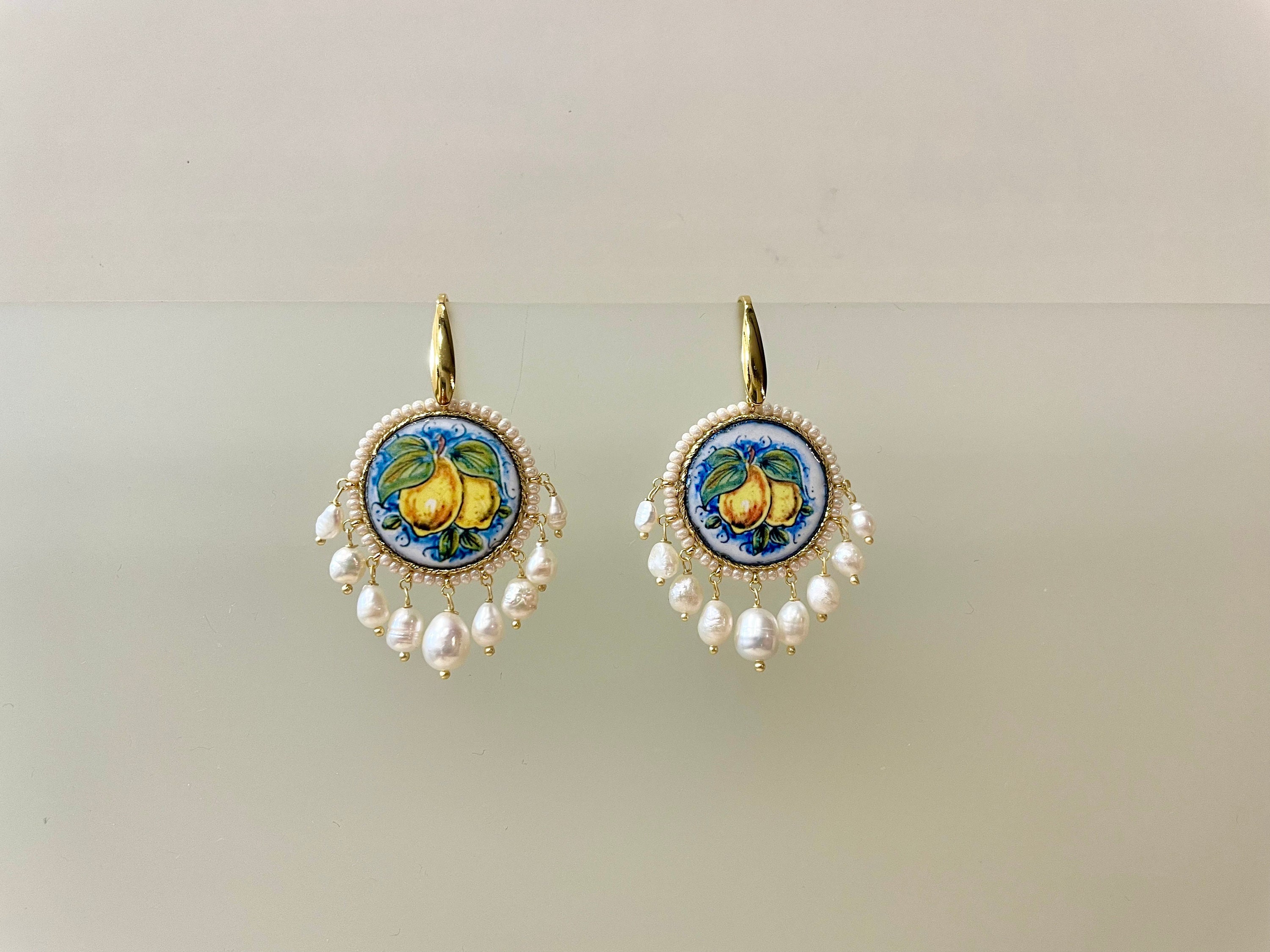 Orecchini argento, con mattonella tonda in ceramica di caltagirone, limoni e perle di fiume