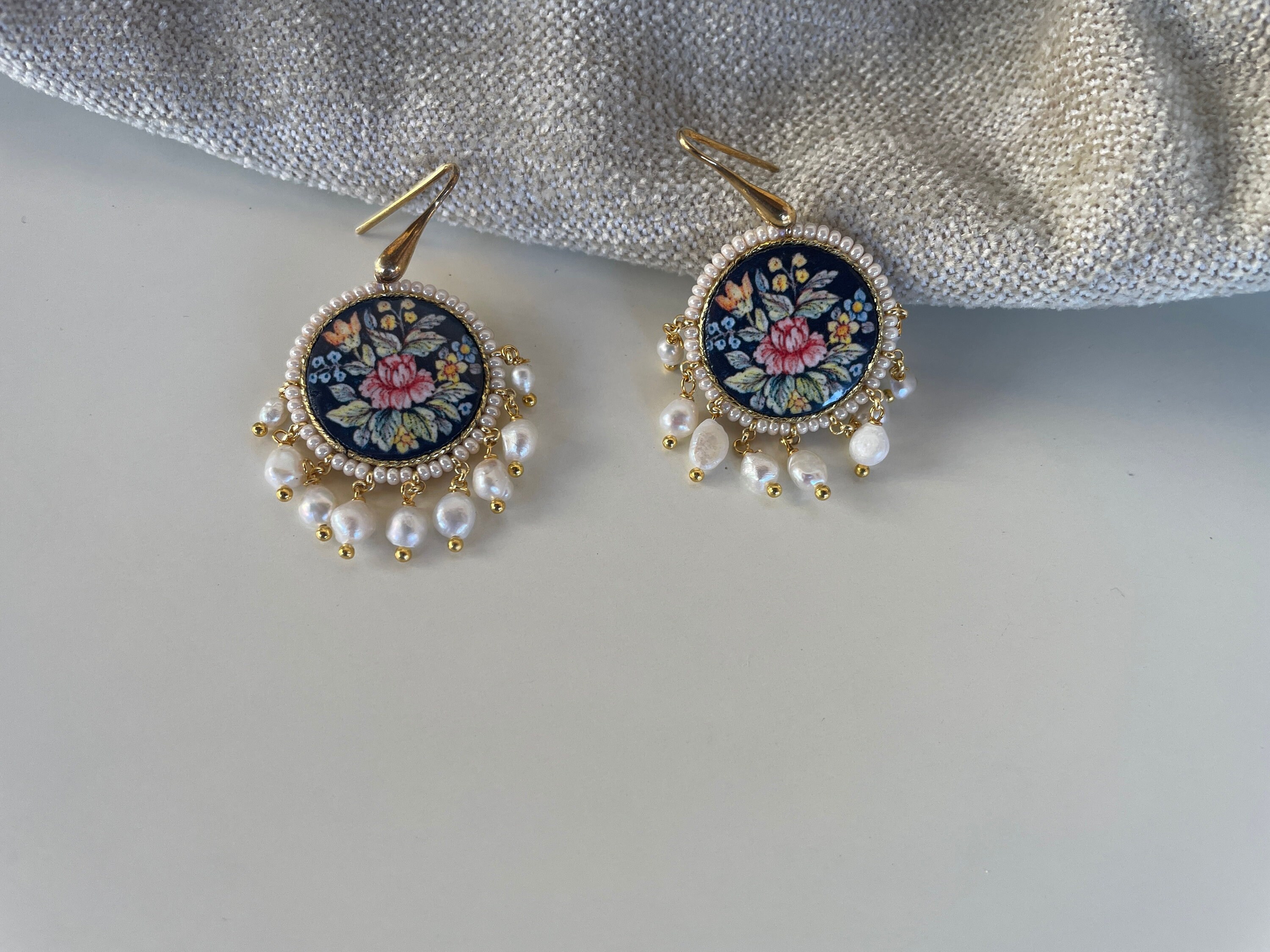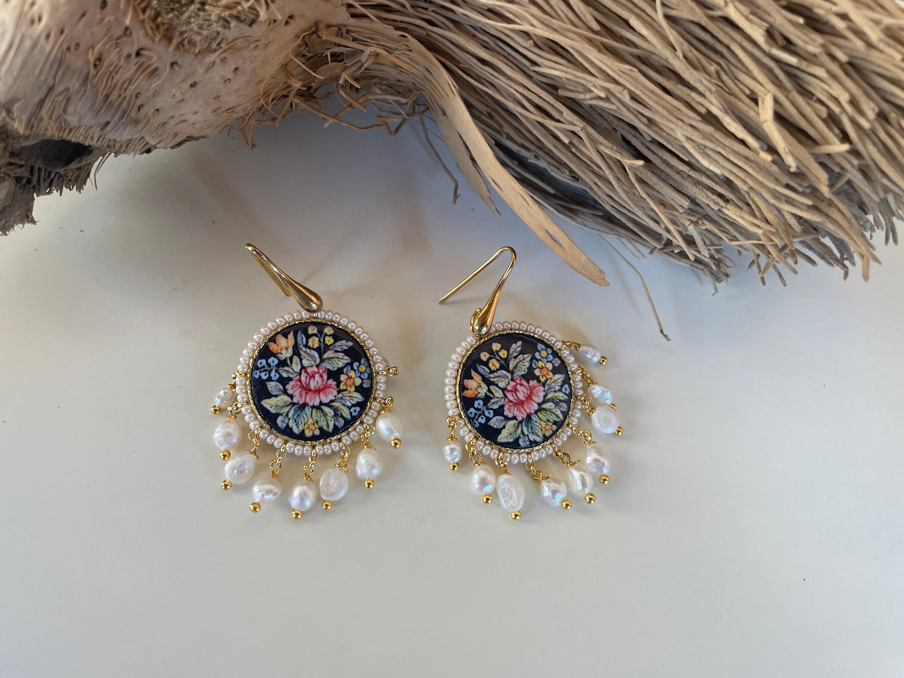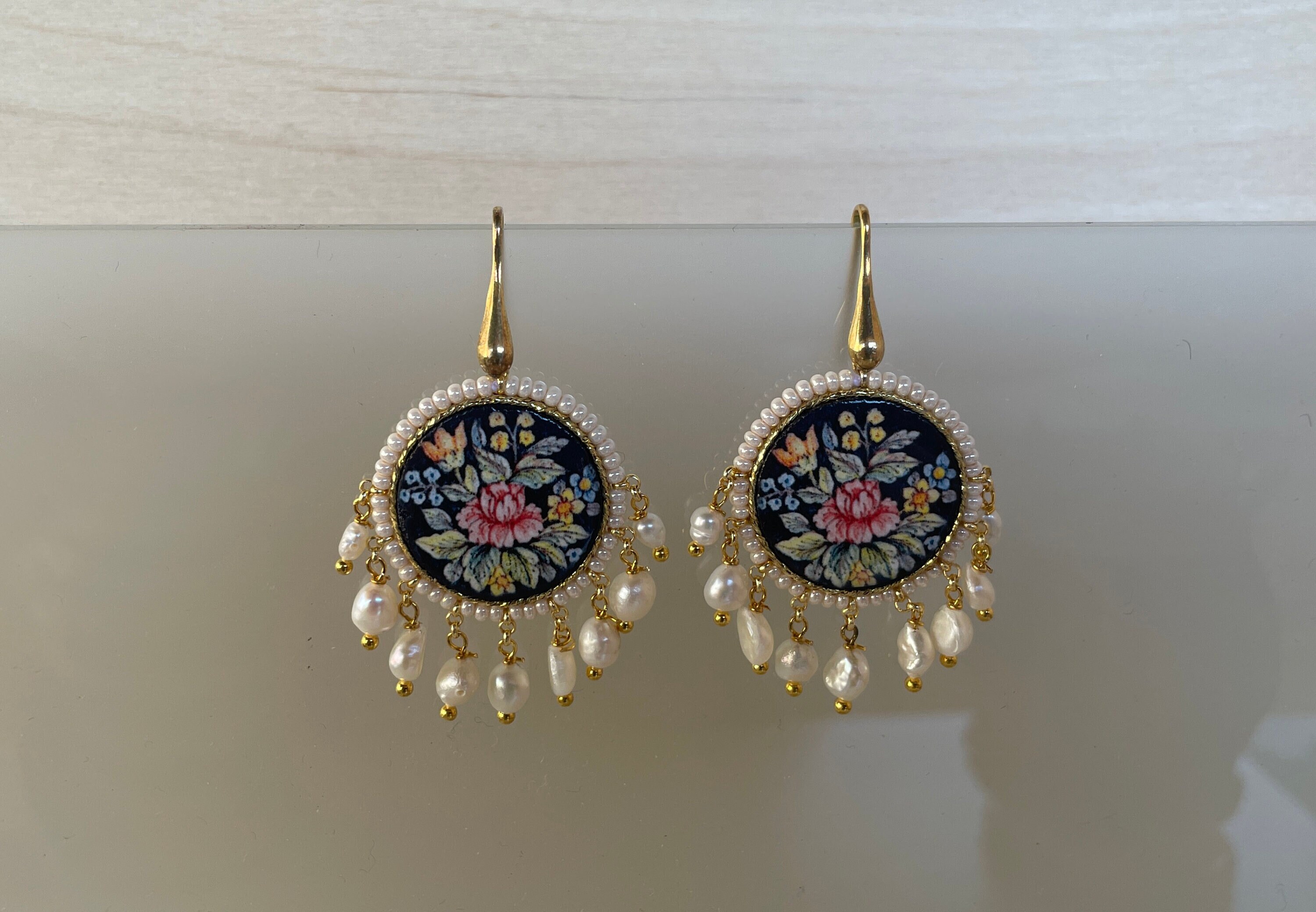 Orecchini Caltagirone e perle di fiume, mattonella maiolica siciliana, gancio argento, fantasia Fiori.