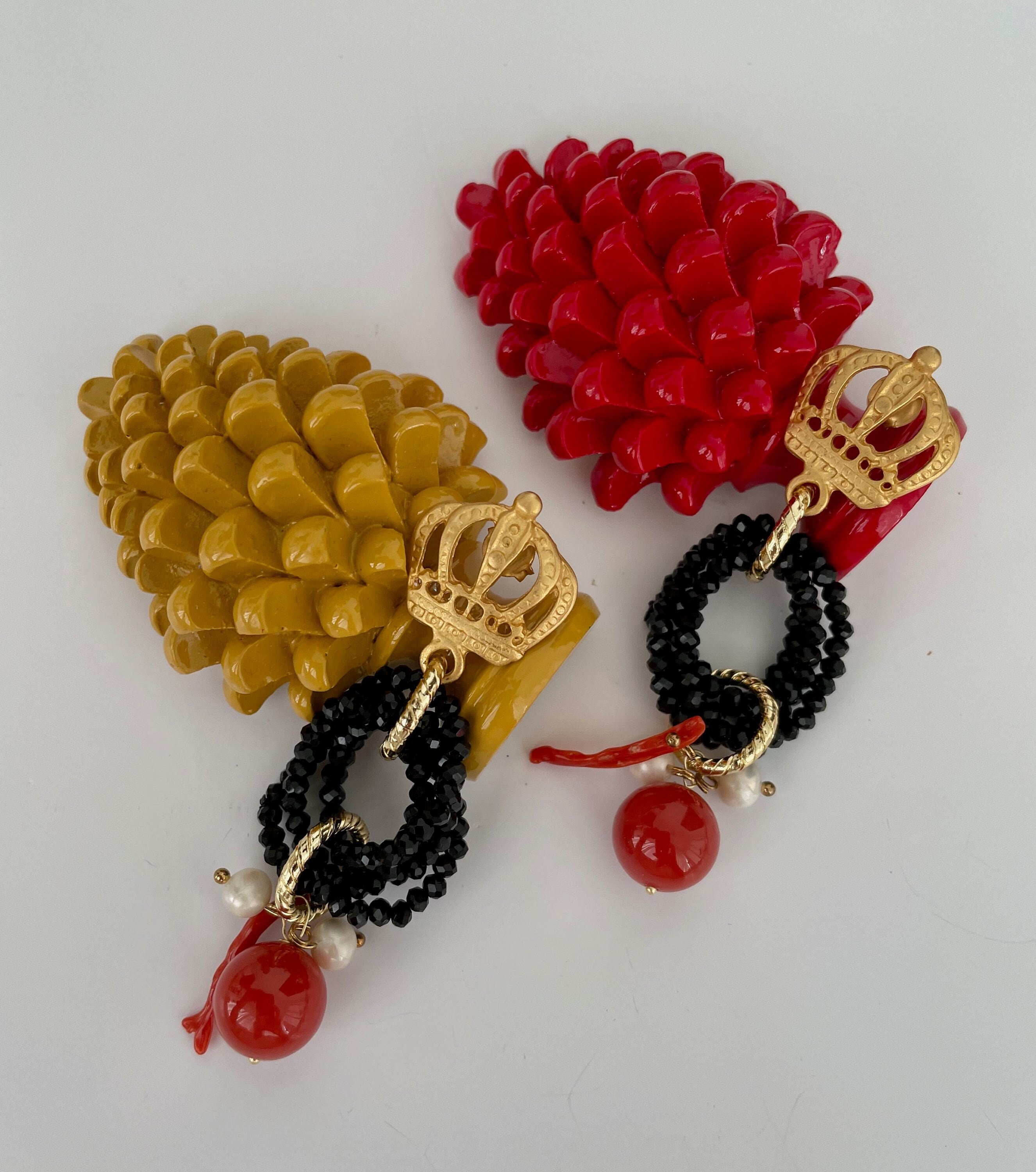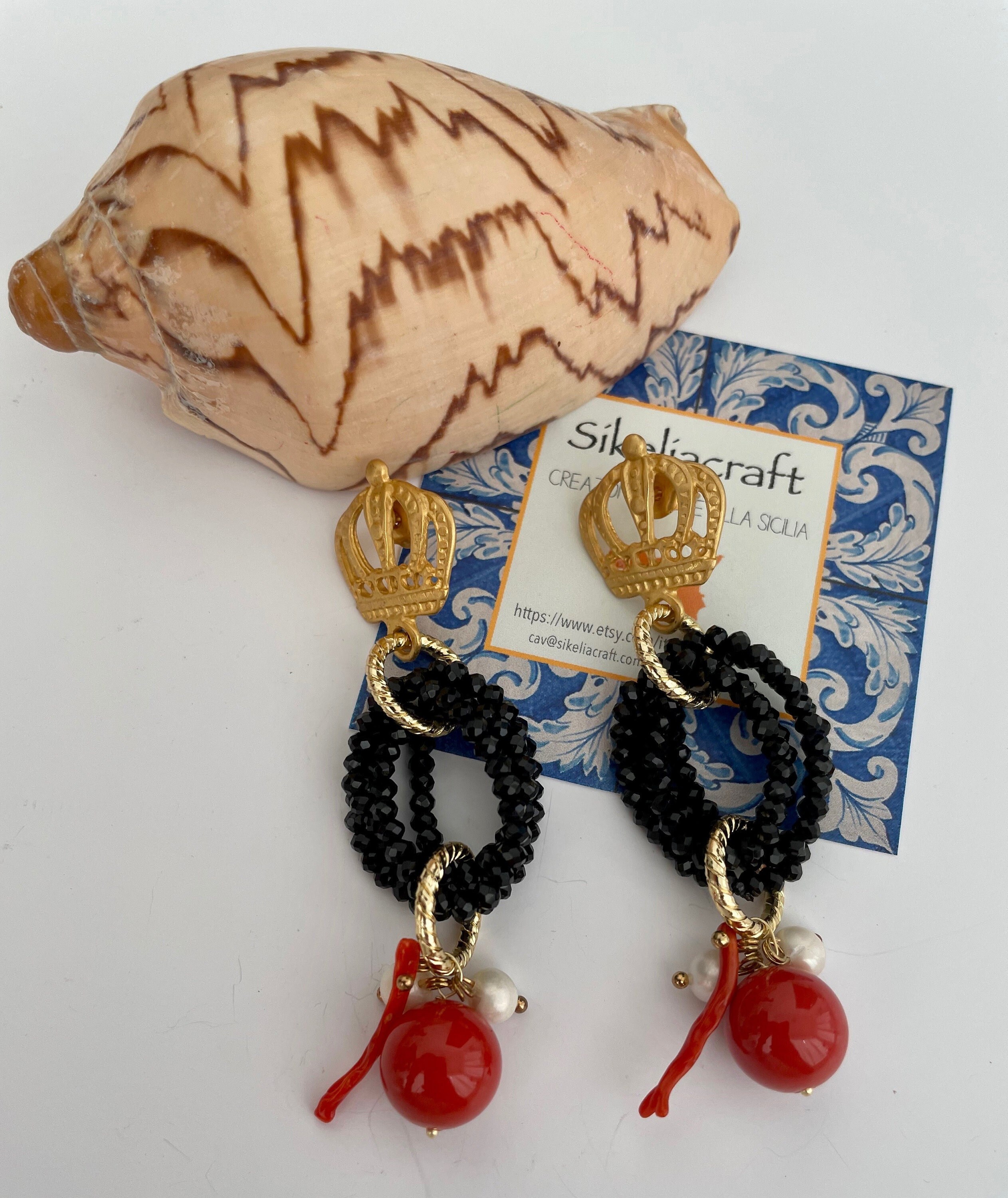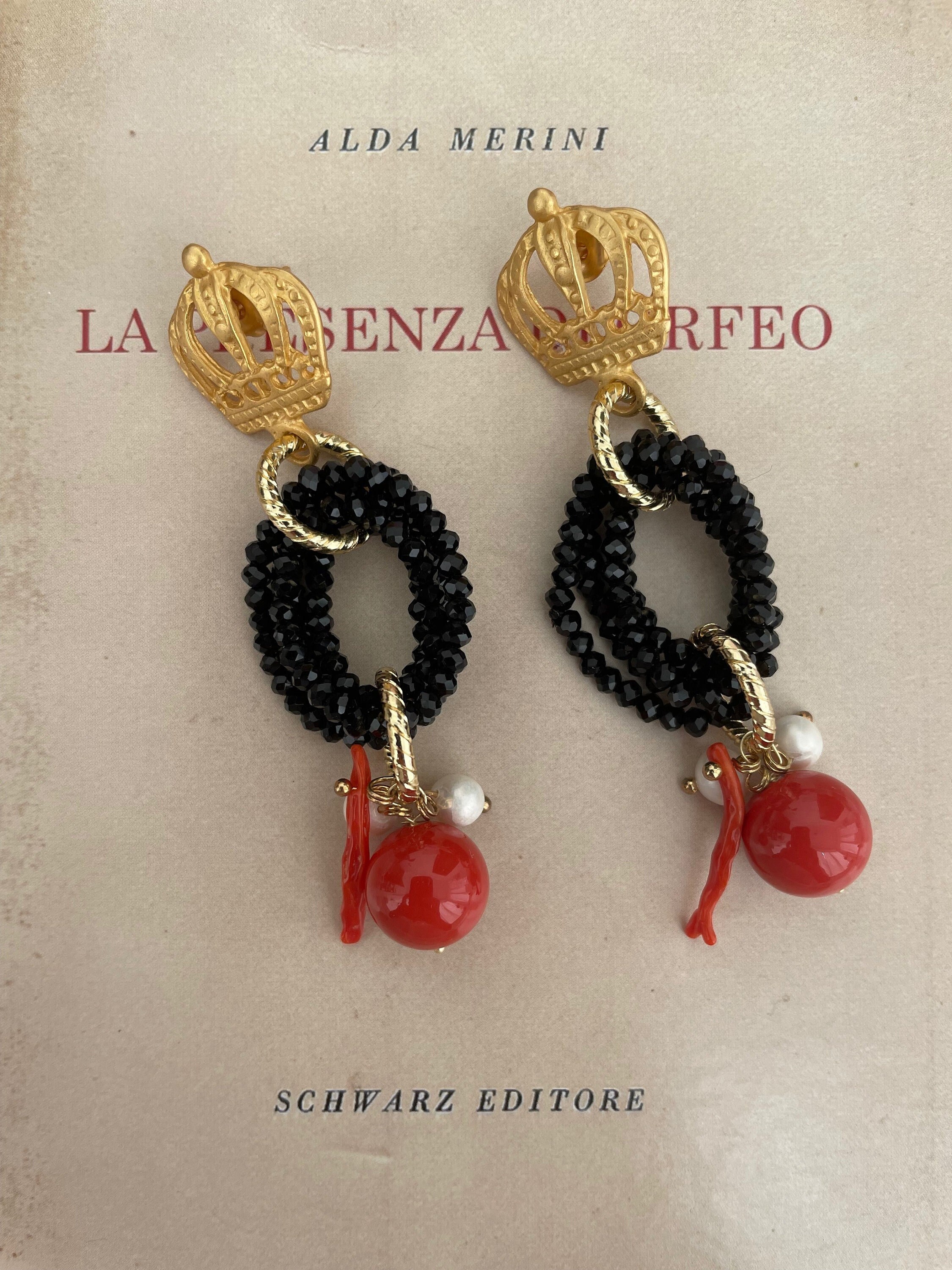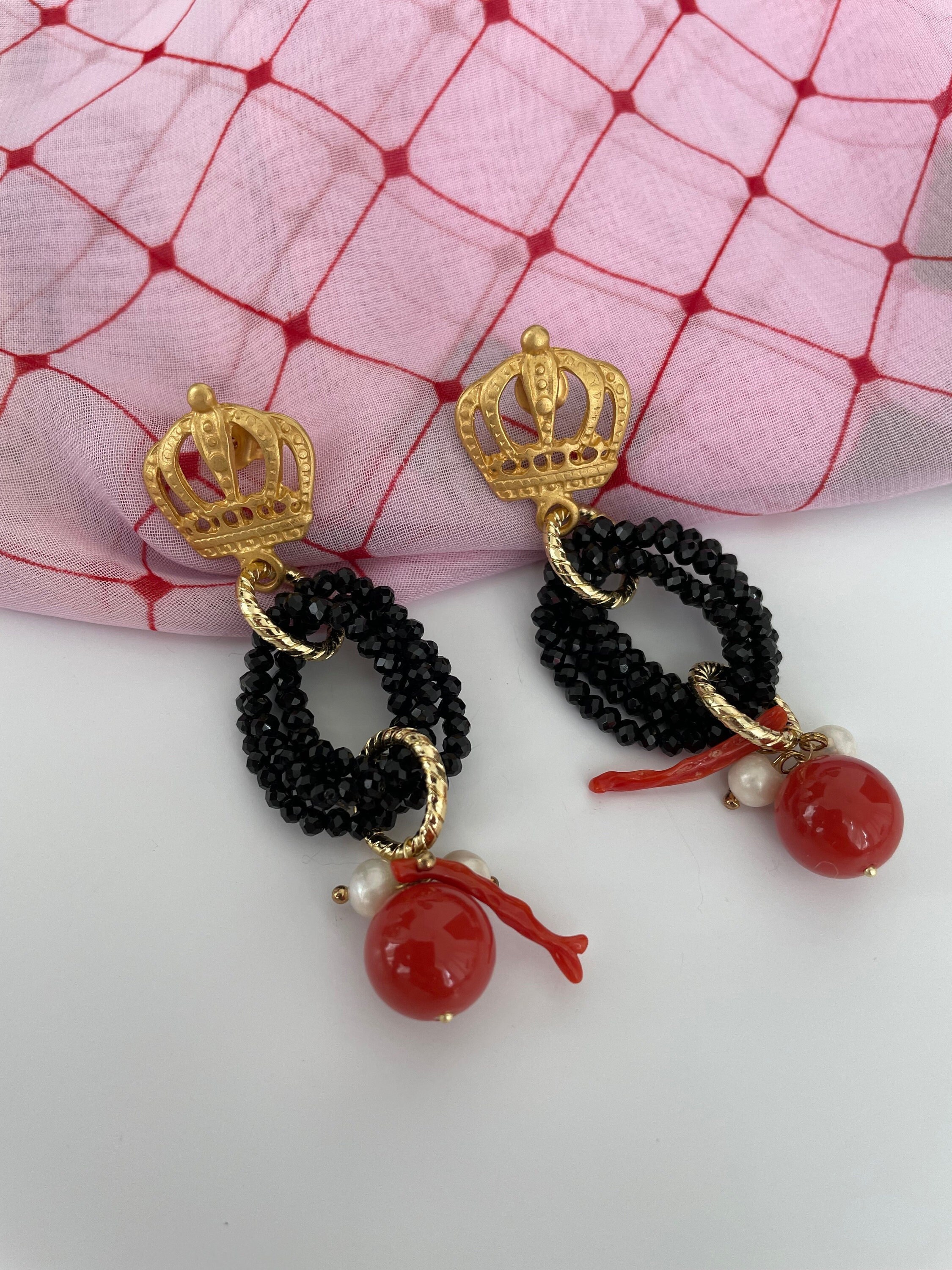 Realizzati con perno in zama a forma di corona, anellini in cristallo nero e perle di Maiorca rosse.