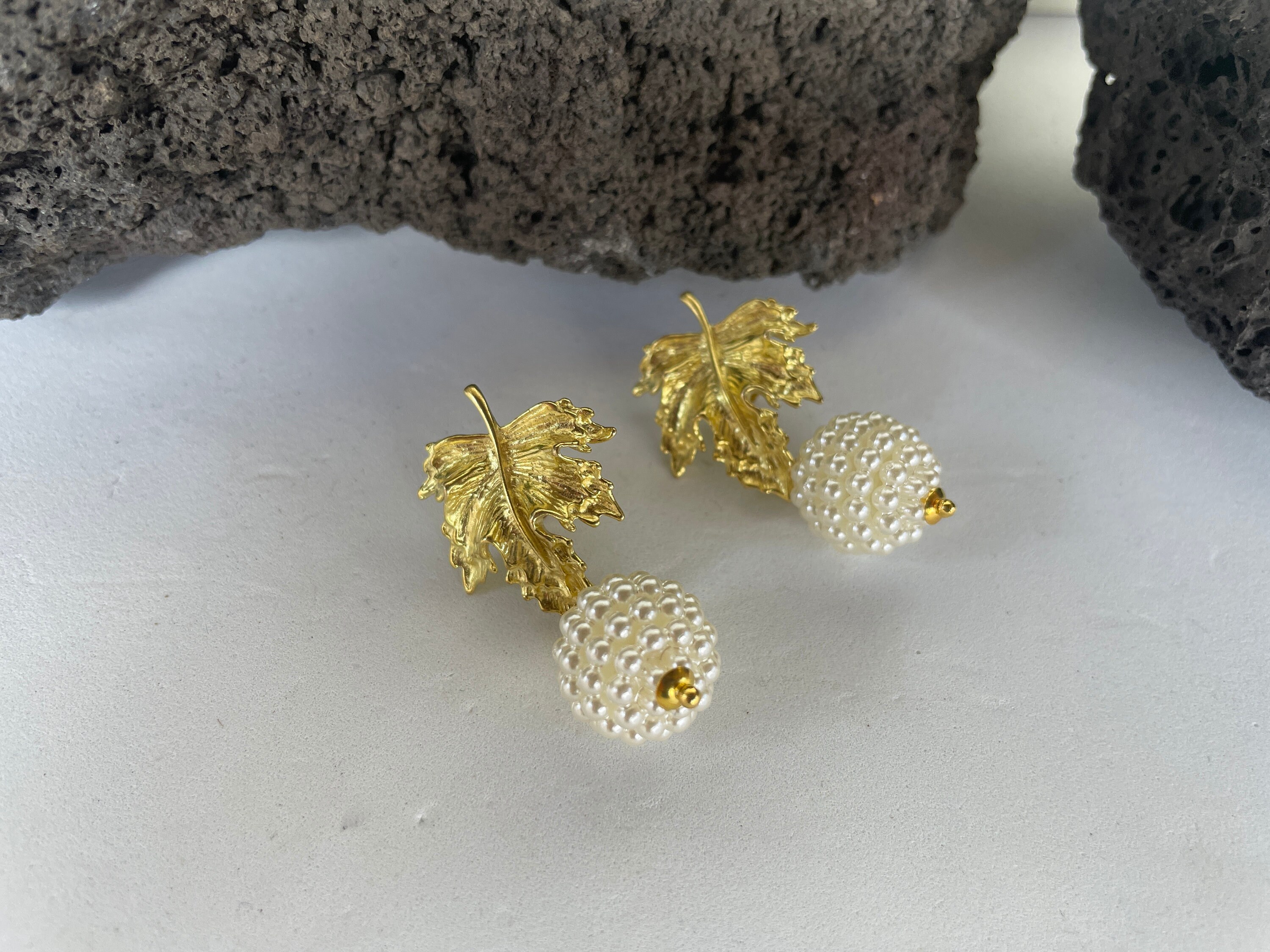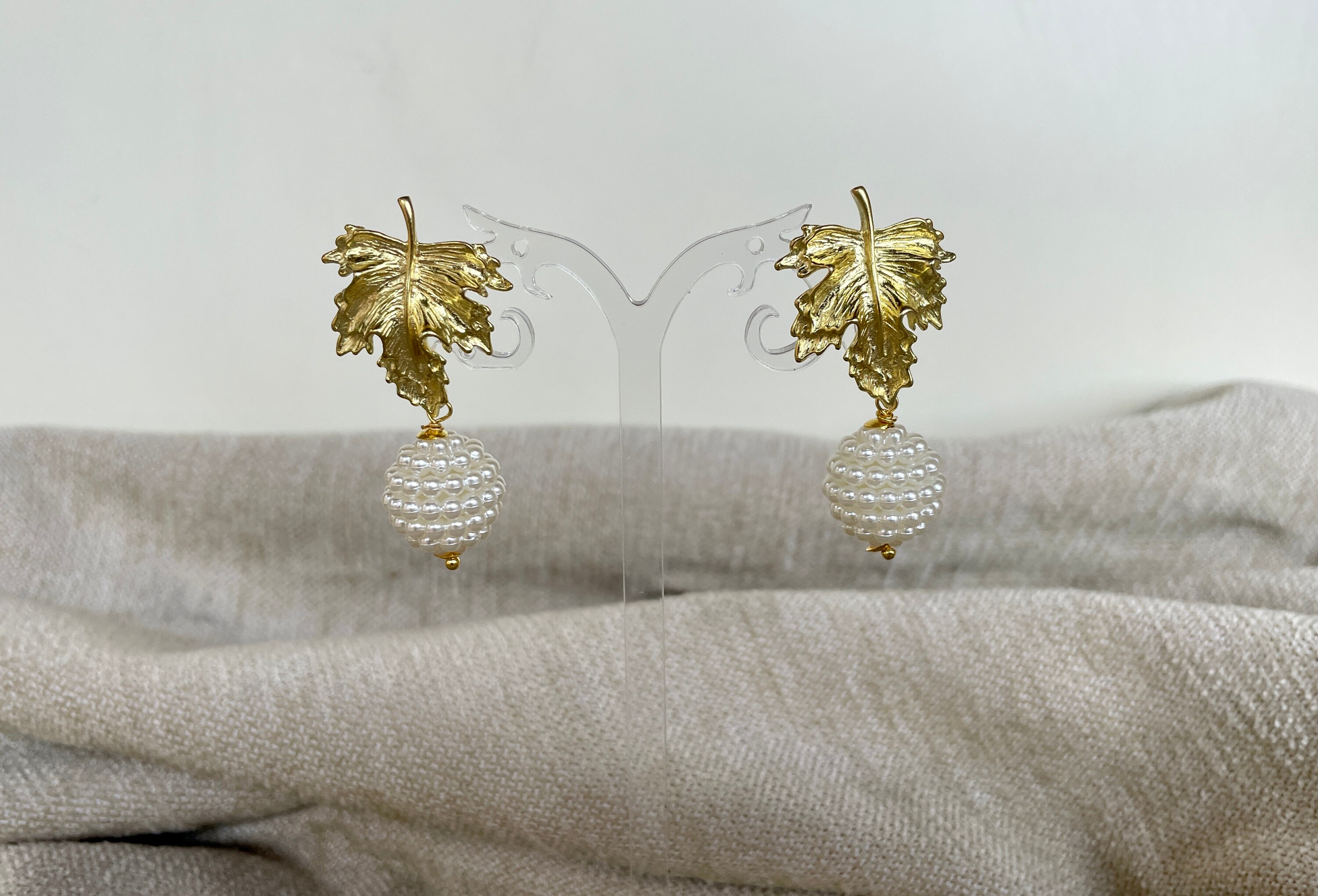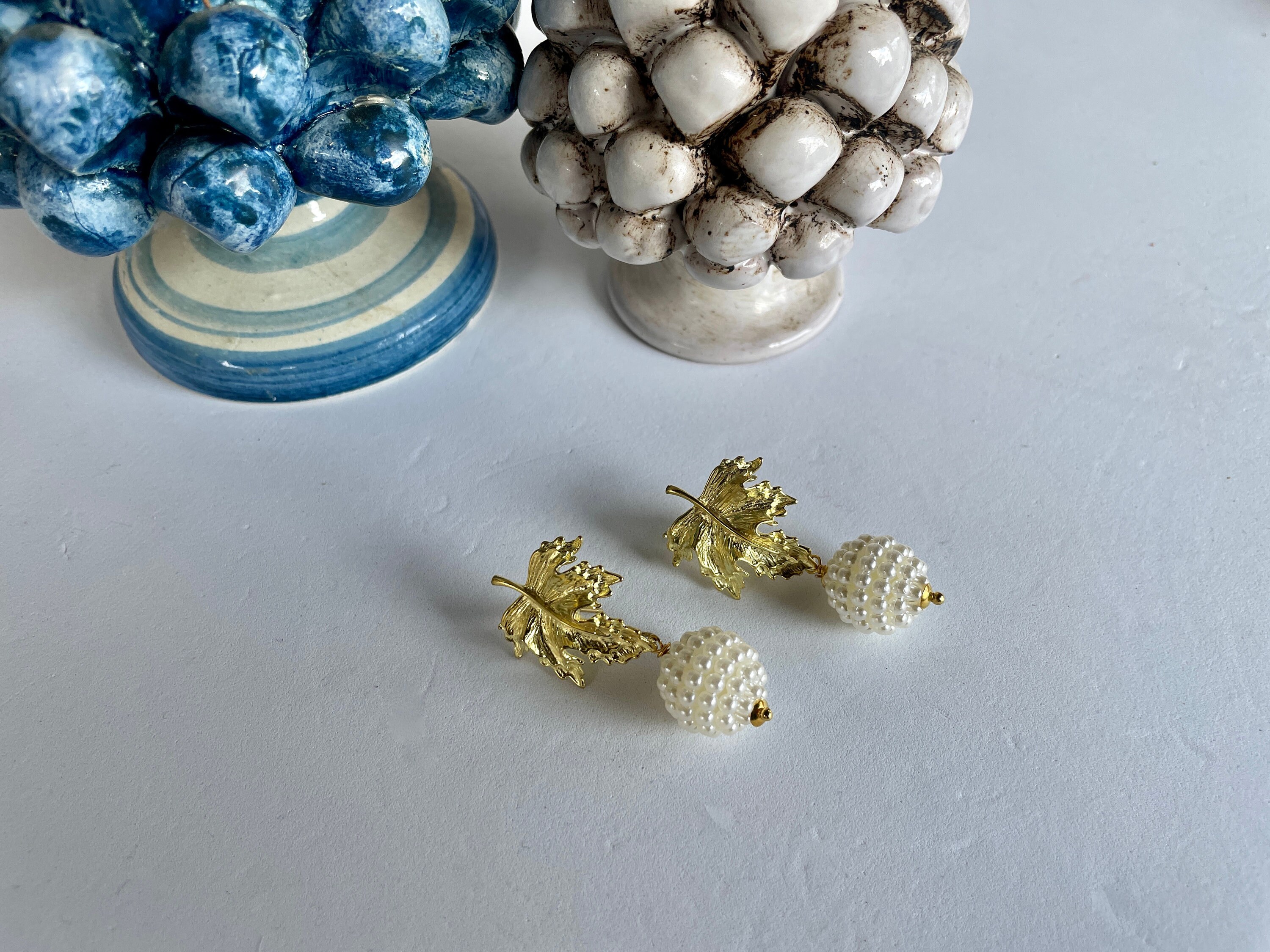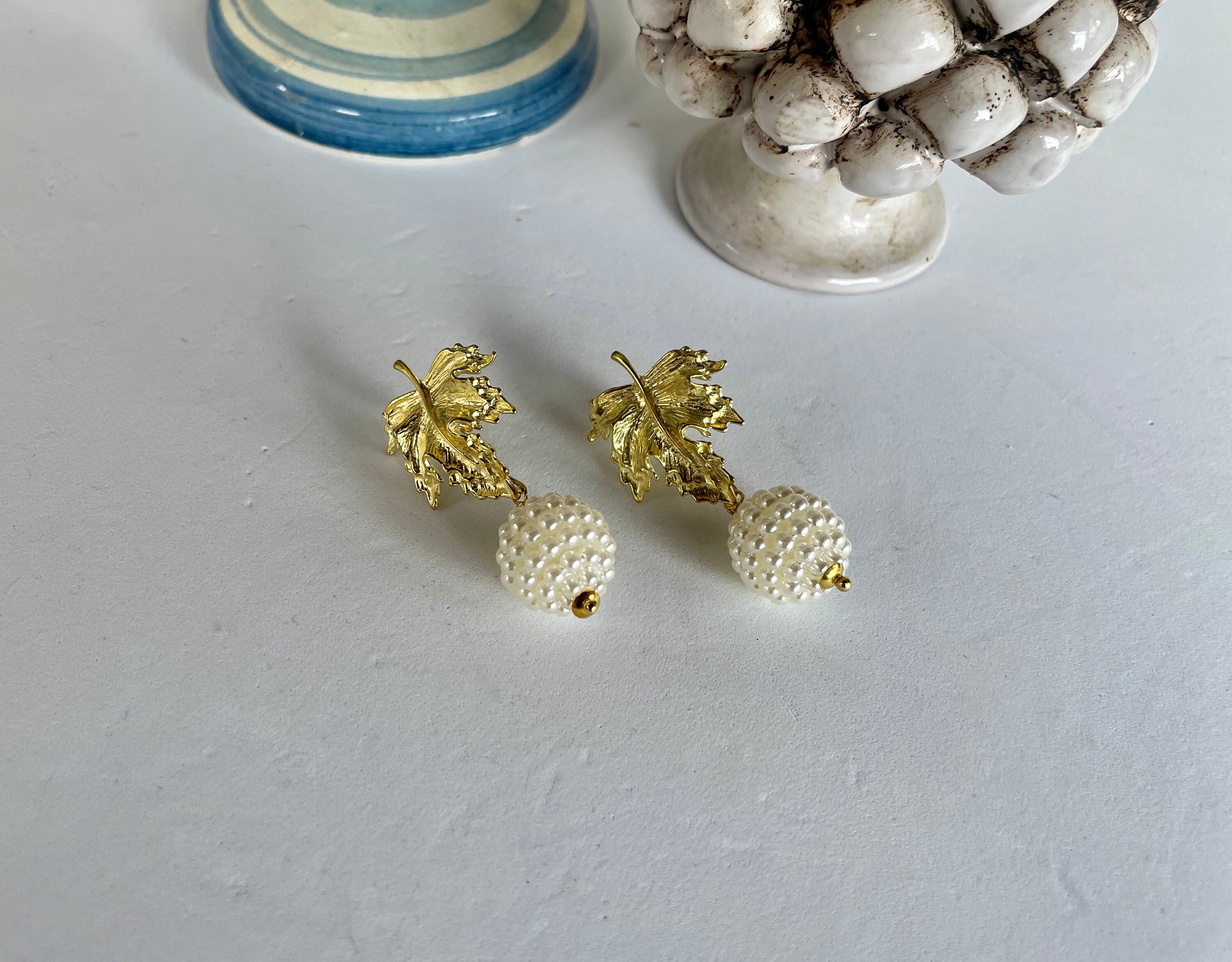 Orecchini con foglia dorata e sfera con perle maiorca