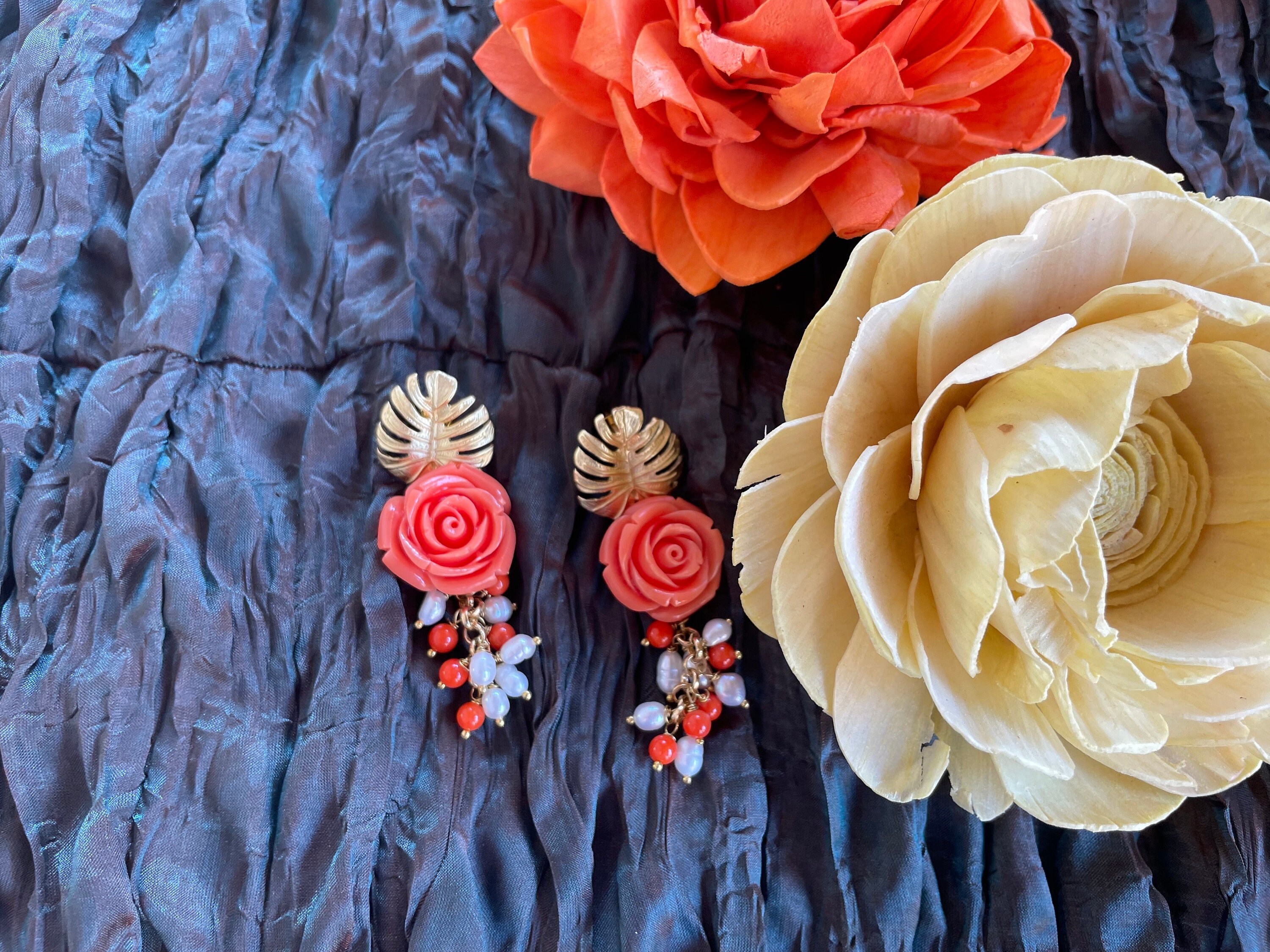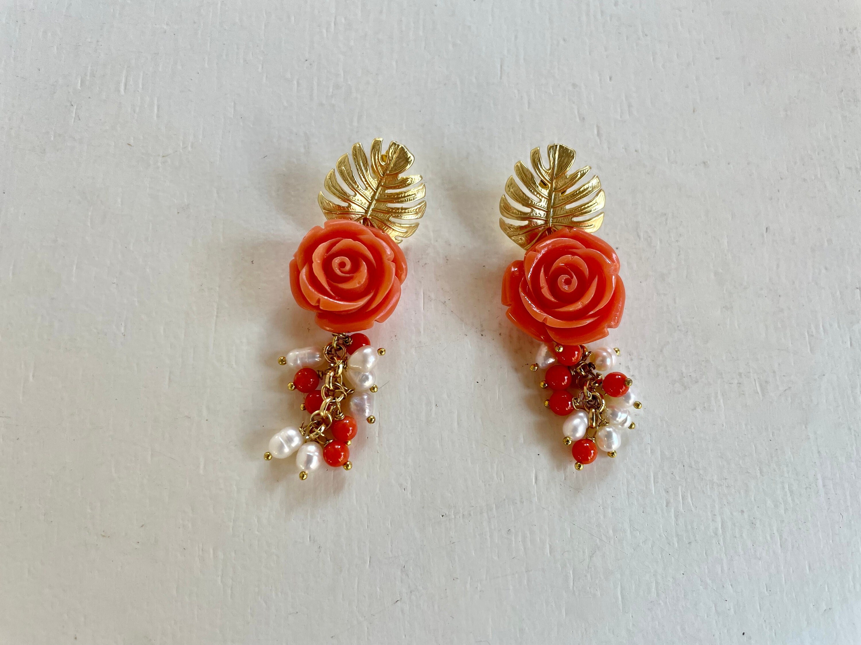 Orecchini artigianali romantici, realizzati con perno in bronzo dorato a forma di foglia di Monstera, rosa in pasta a imitazione del corallo e pendente grappolo di perle di fiume e di corallo.