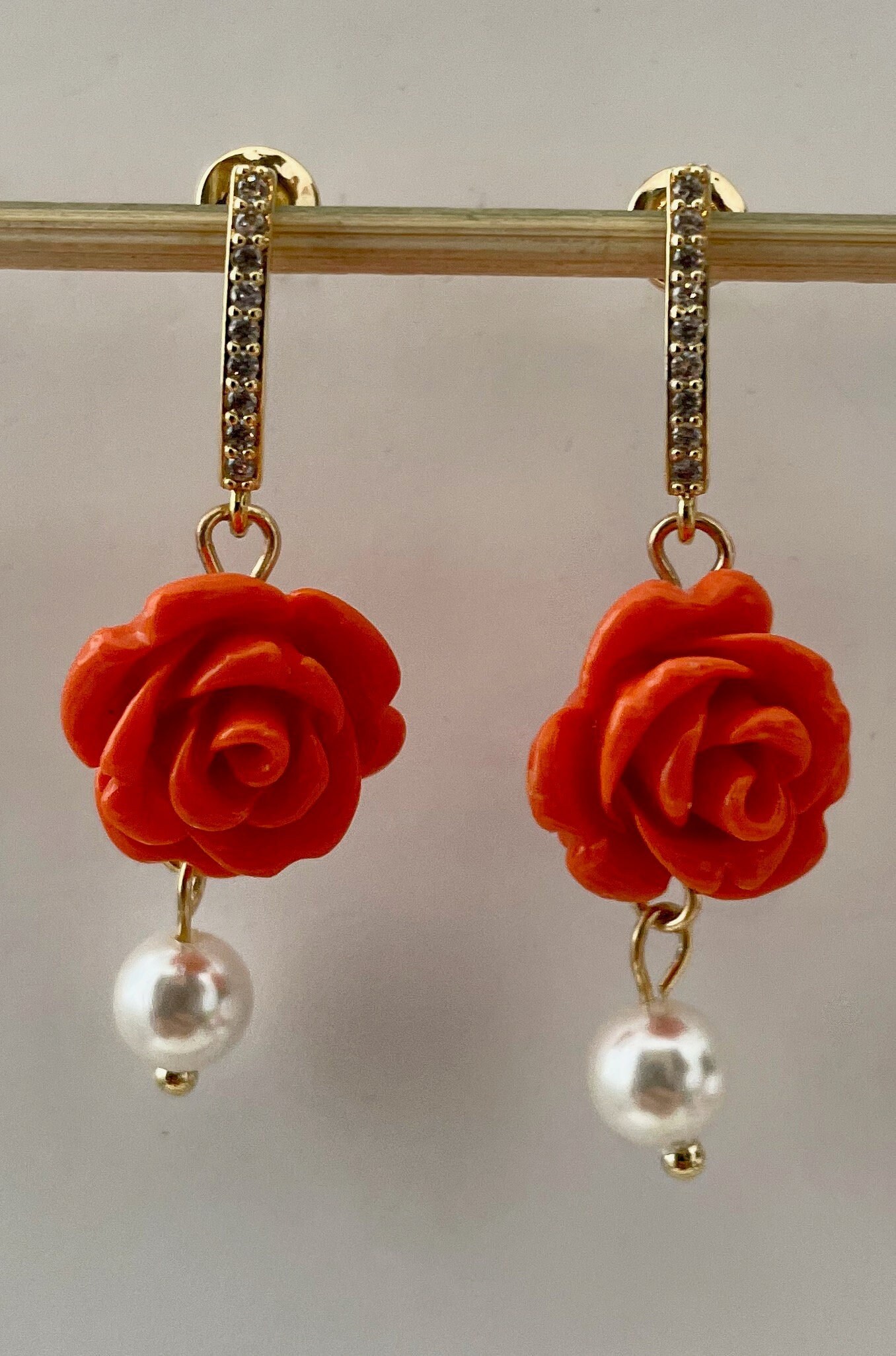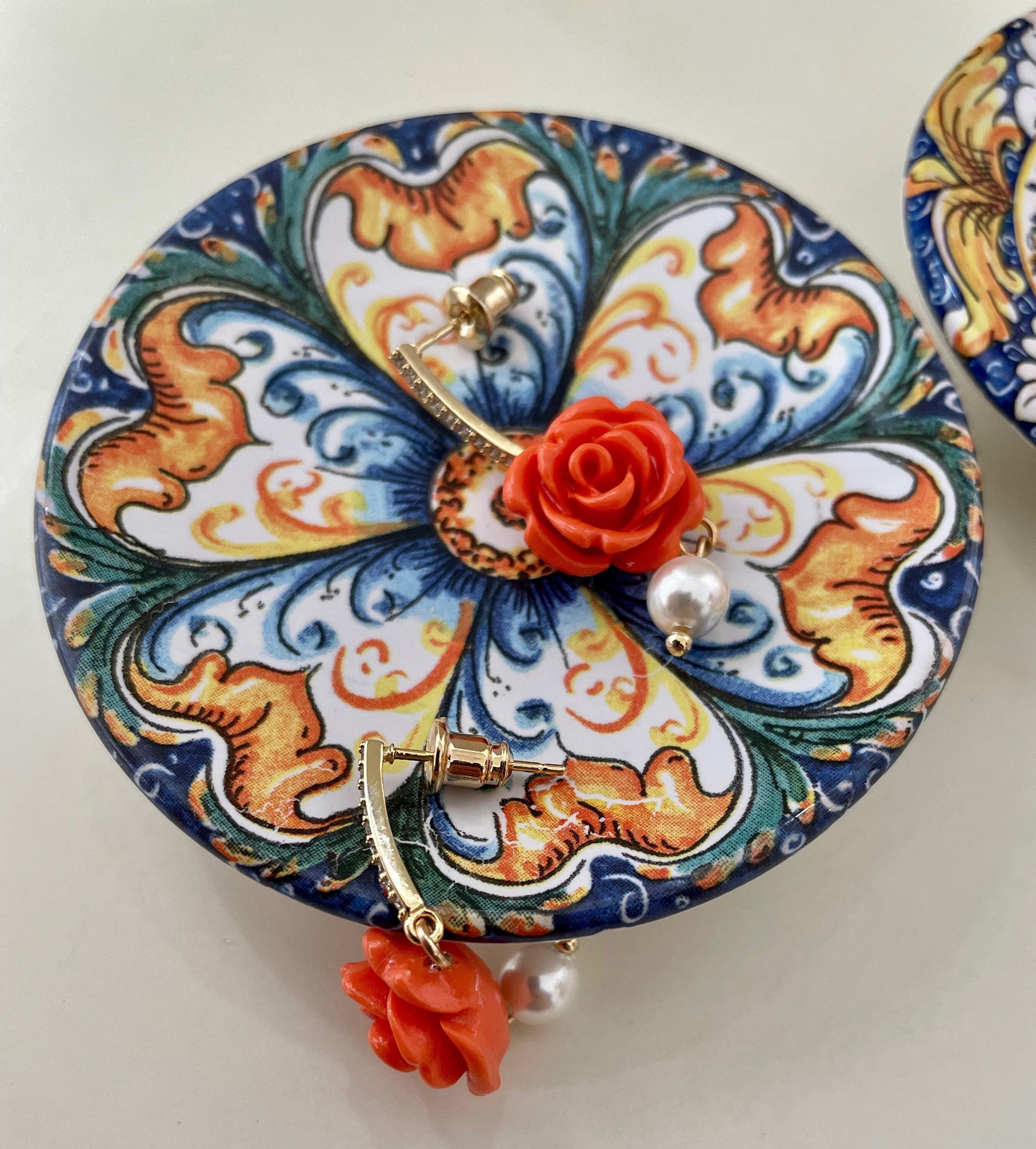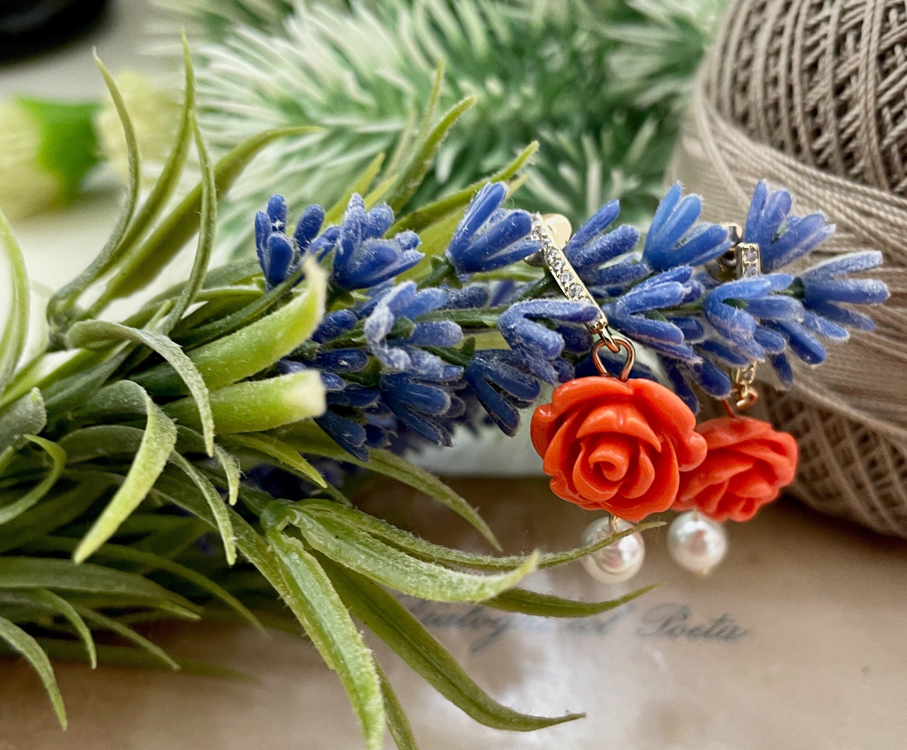 Orecchini dallo stile classico e romantico, realizzati con gancio in acciaio e zirconi, rosa in resina colore corallo e perla.