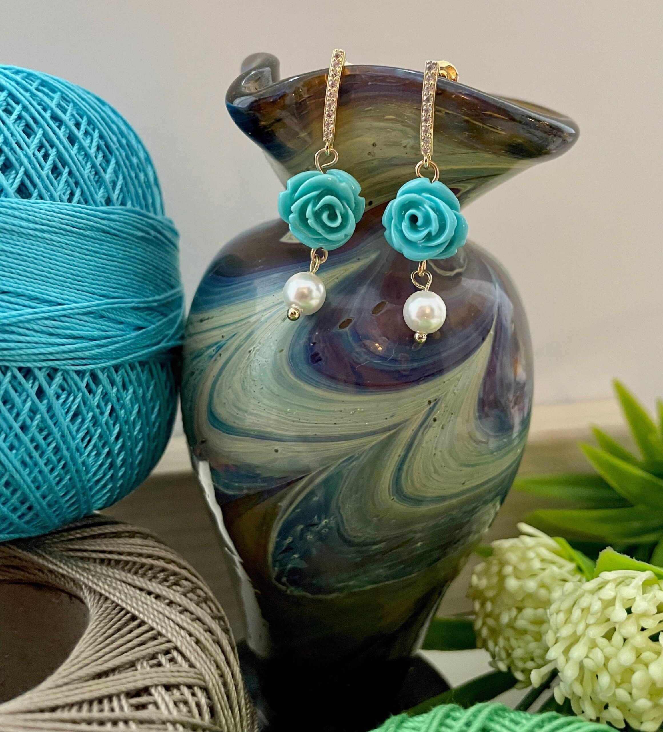 Composti da gancio in acciaio e zirconi e rosa in resina colore turchese e perla.