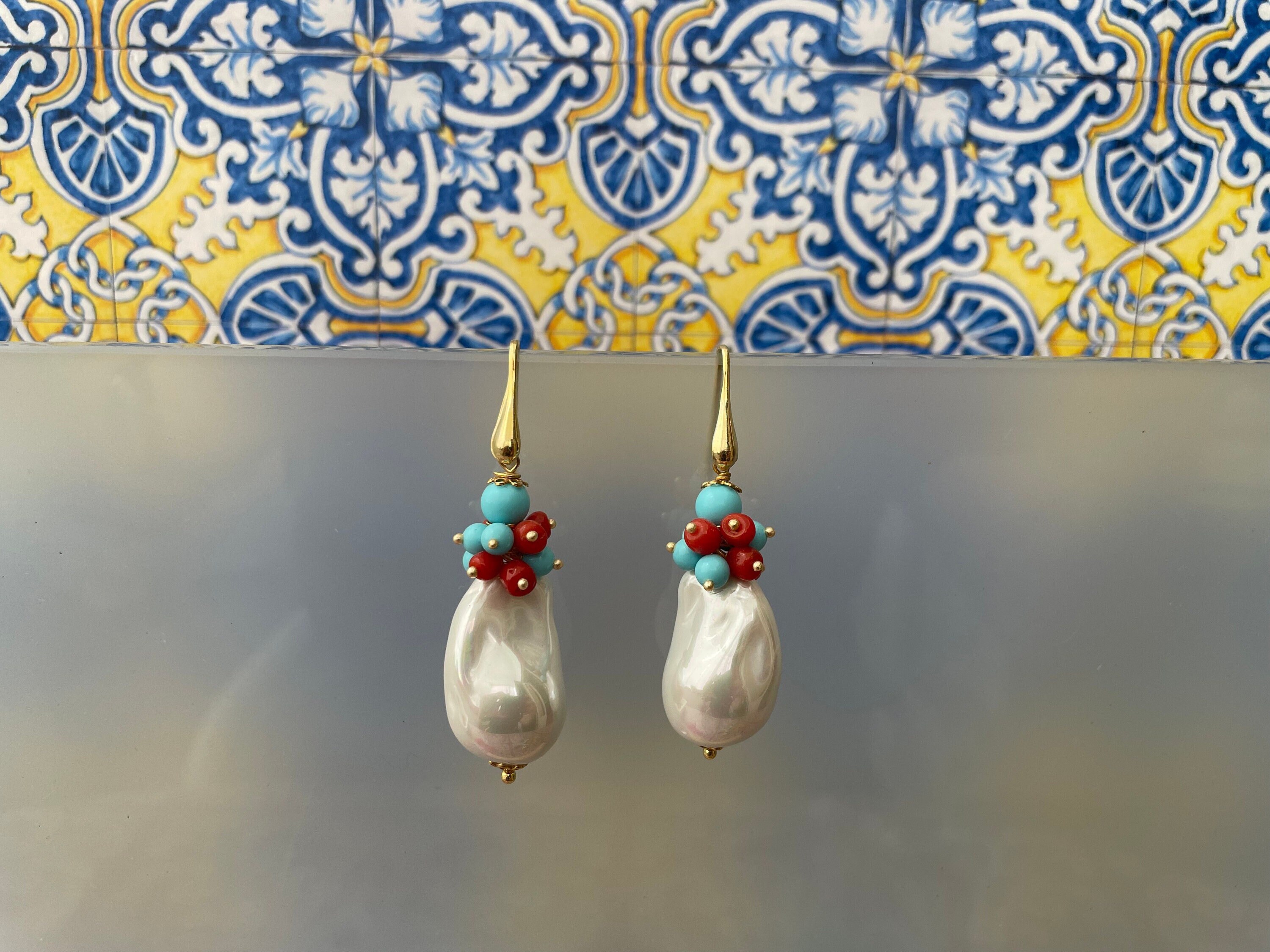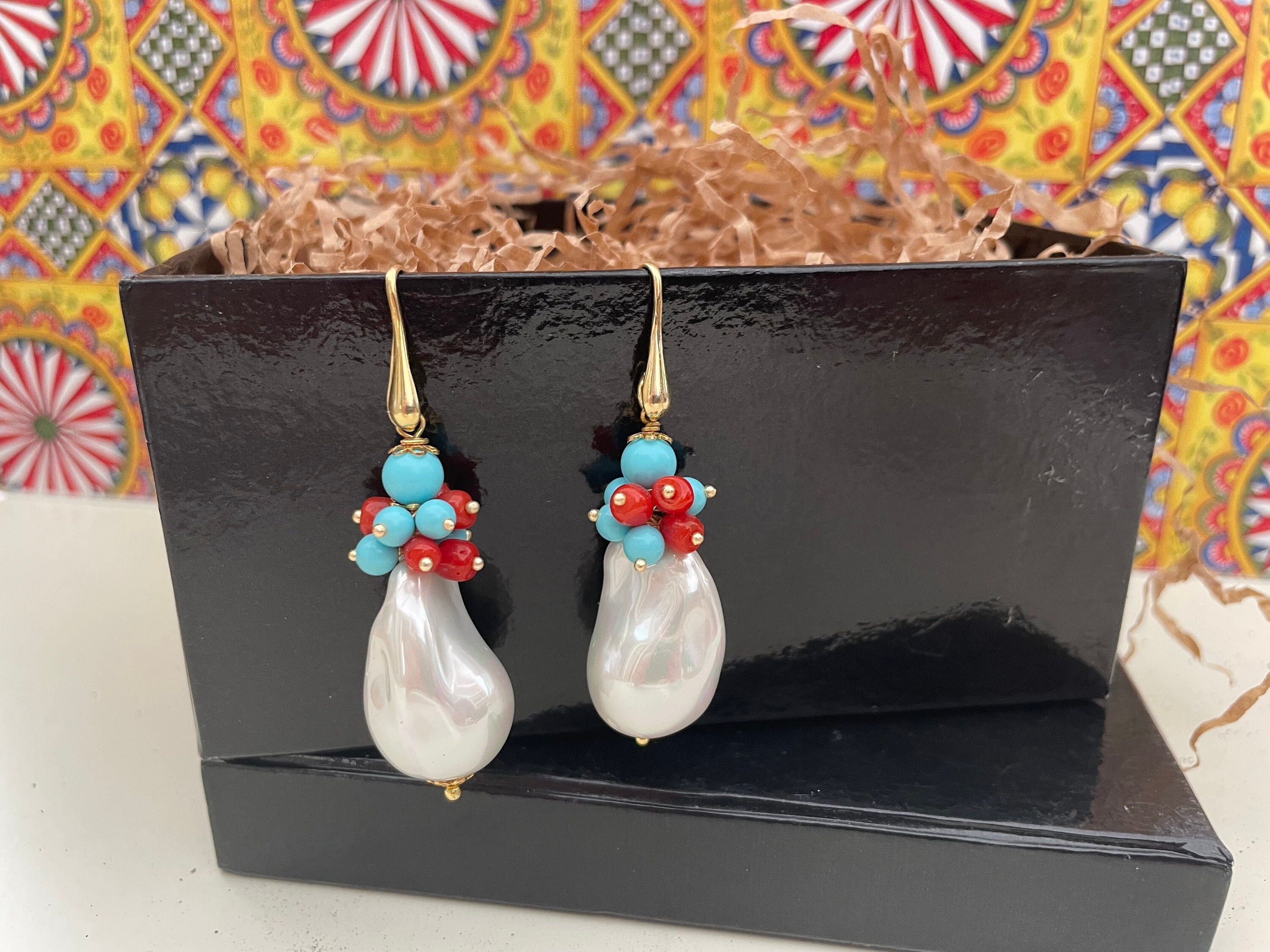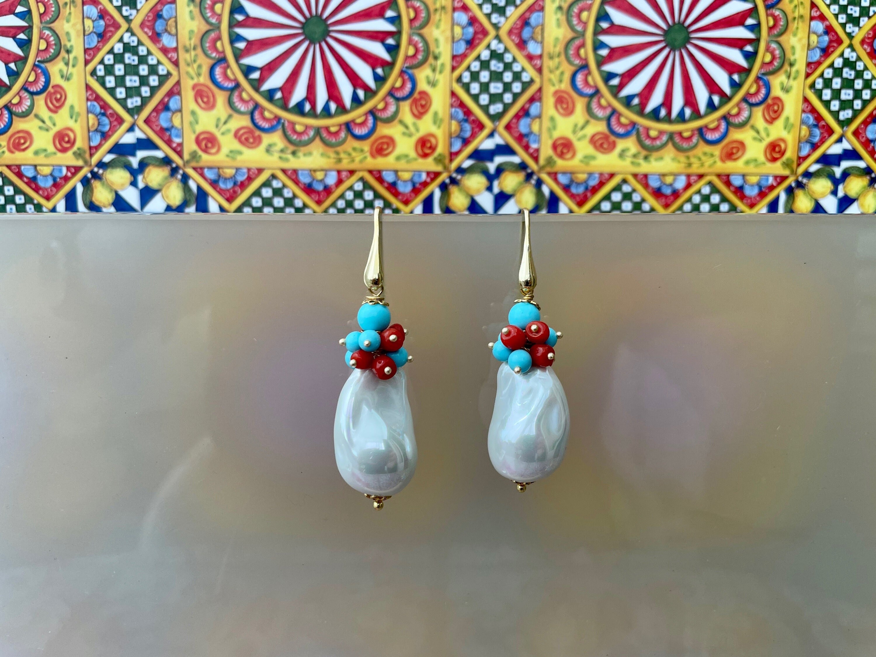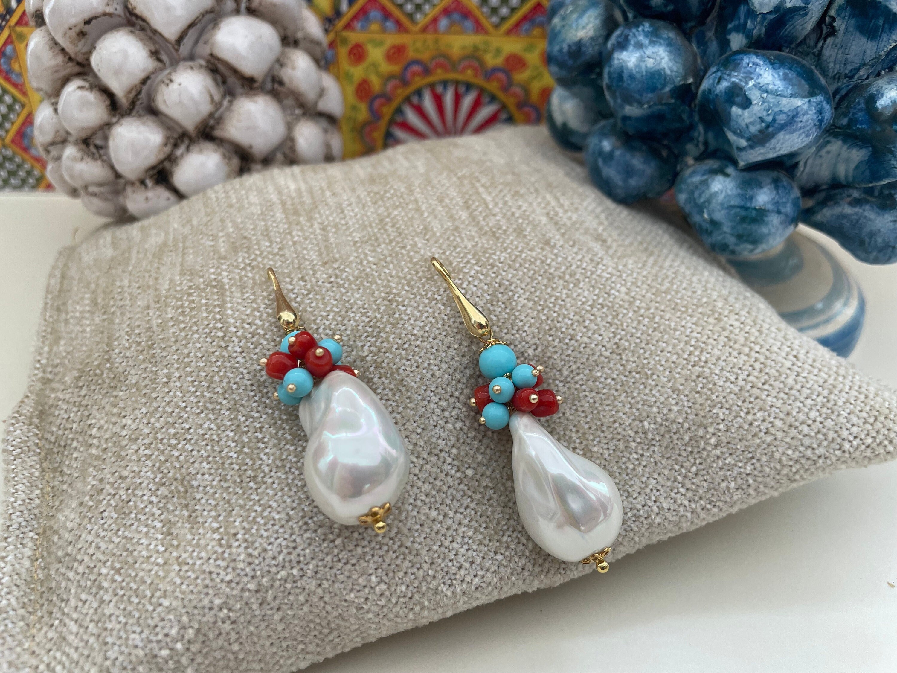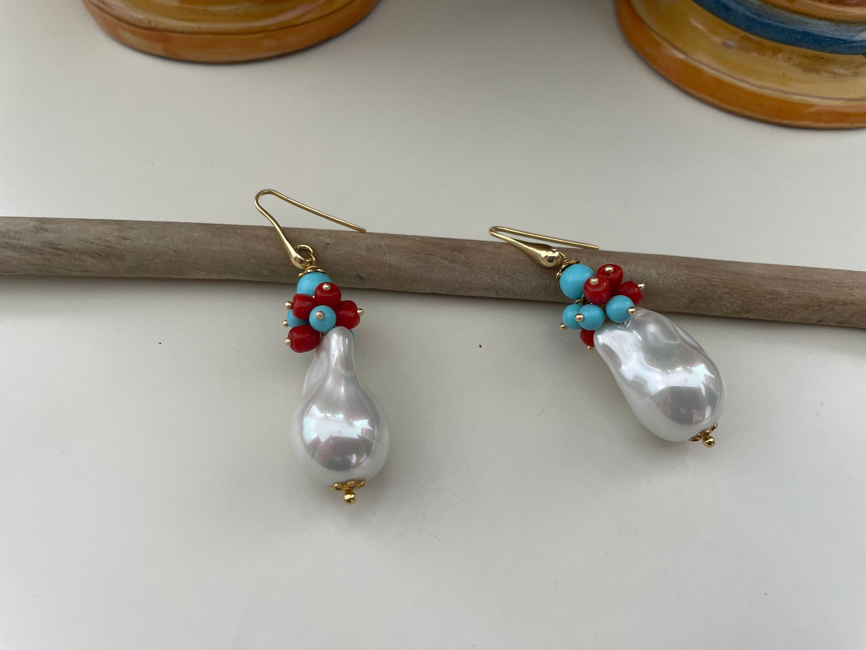 Composti da gancio in argento, grappolo di piccole perle in pasta di turchese e corallo rosso.