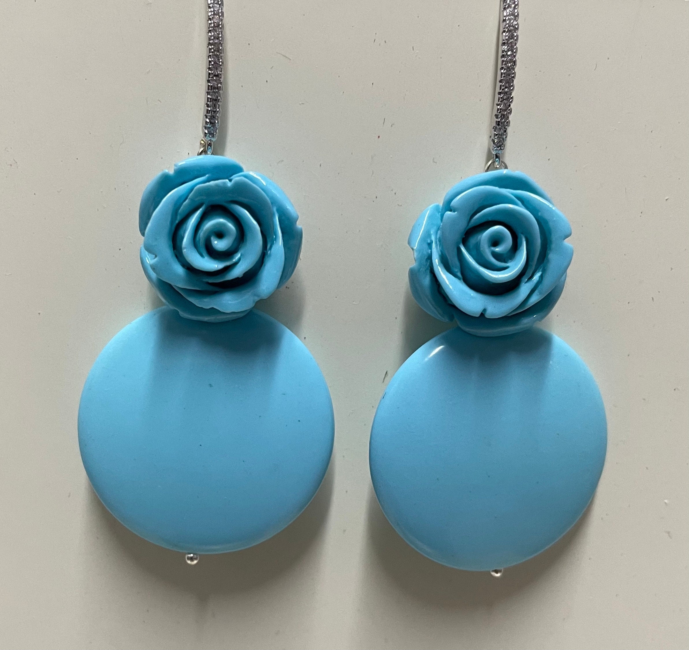 Hanno il gancio in acciaio inox 216L e zirconi da cui pendono una rosa in pasta di Turchese e una grande perla tonda piatta anch’essa in pasta di turchese.