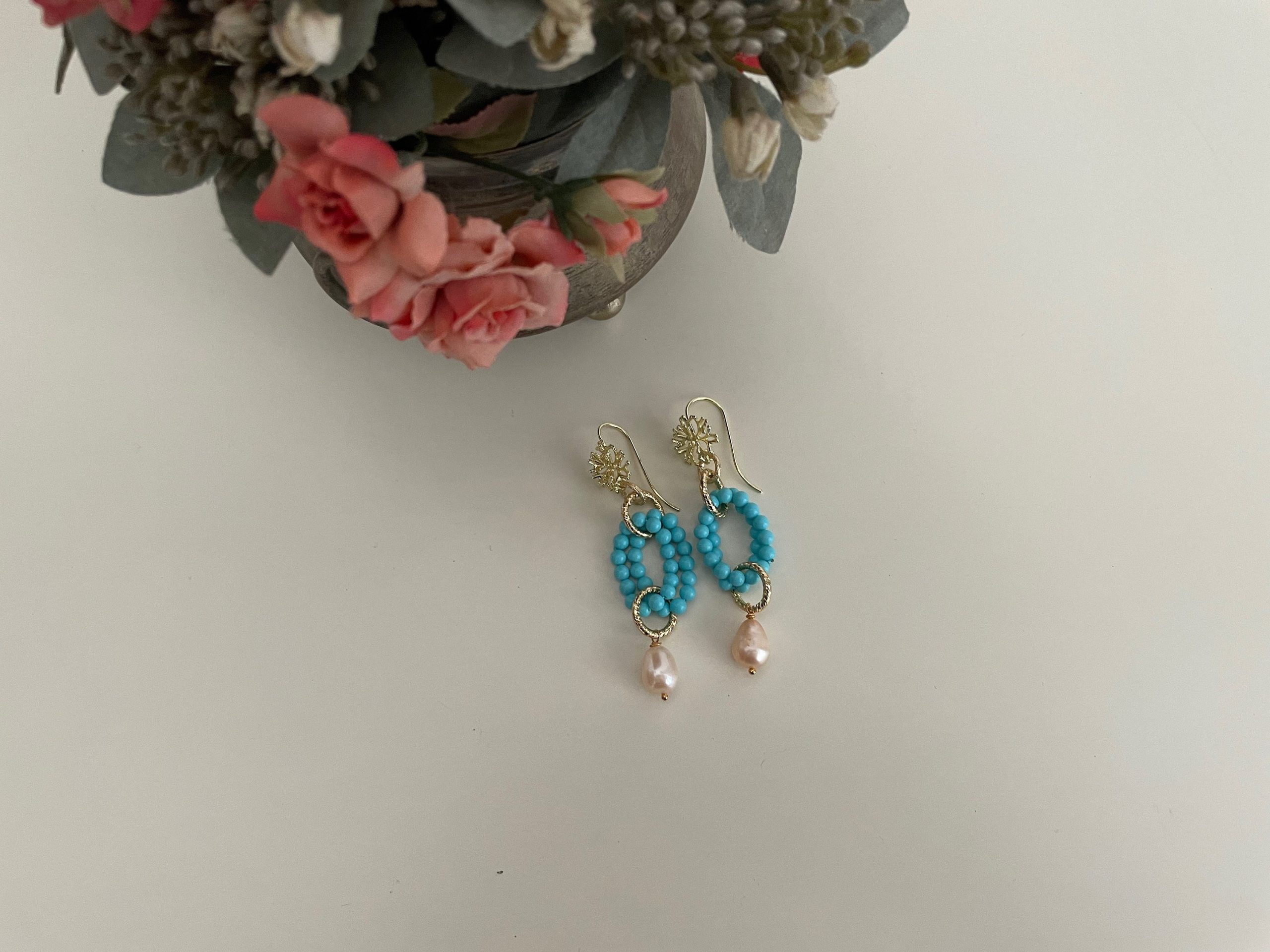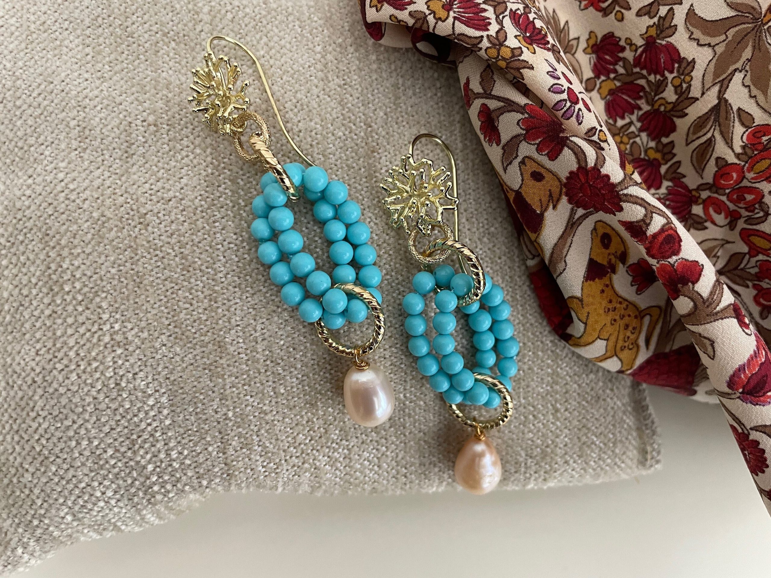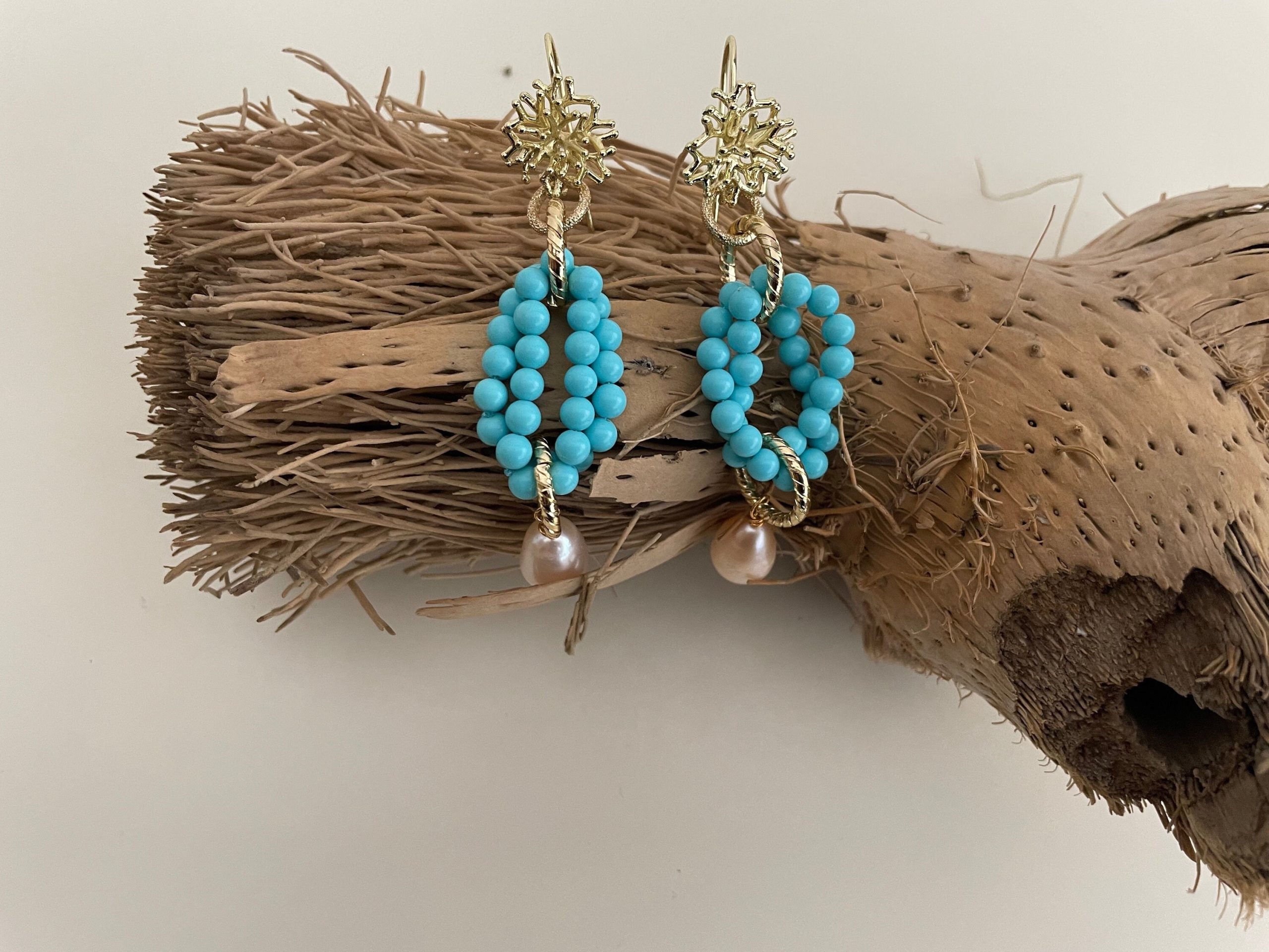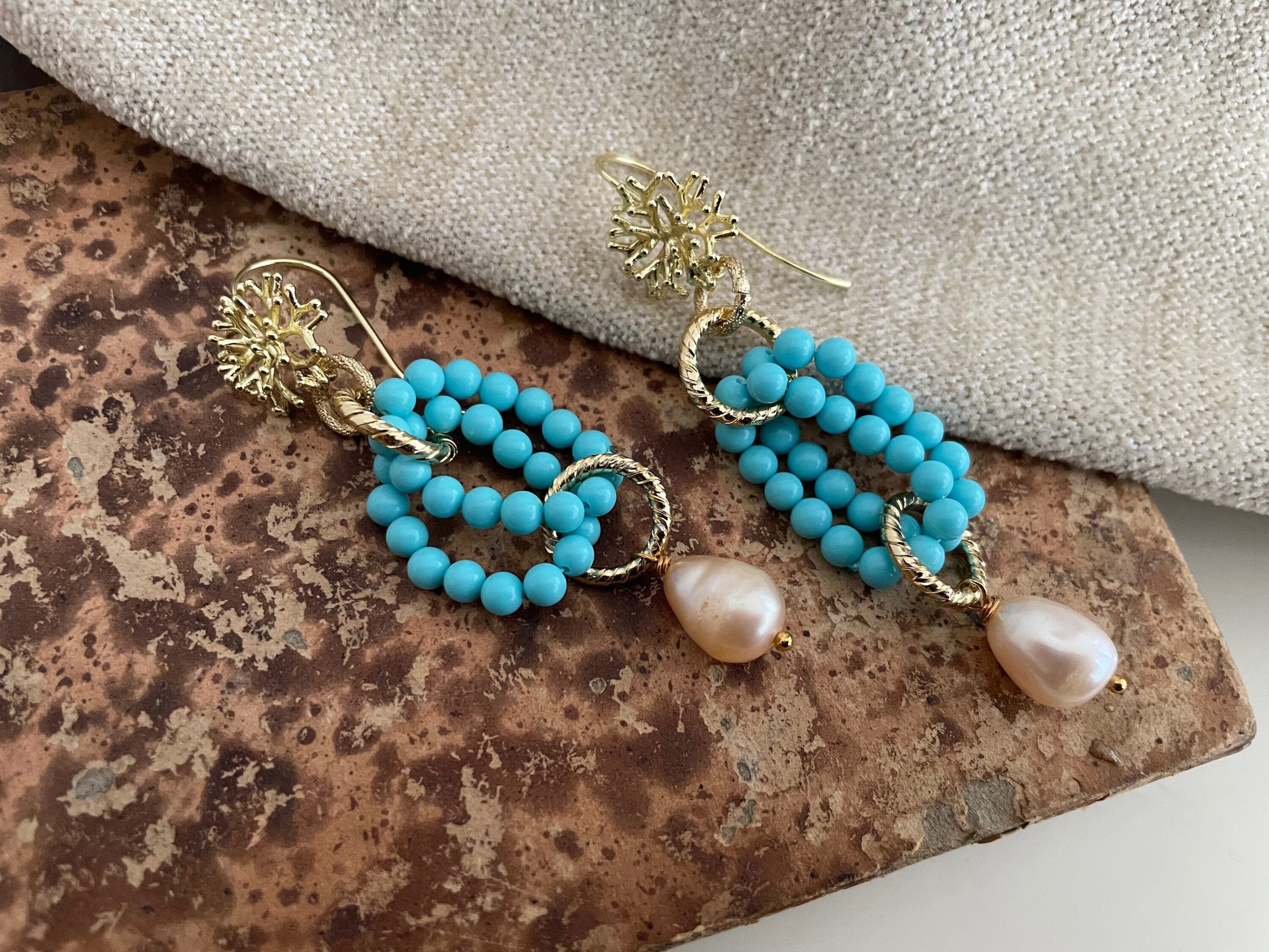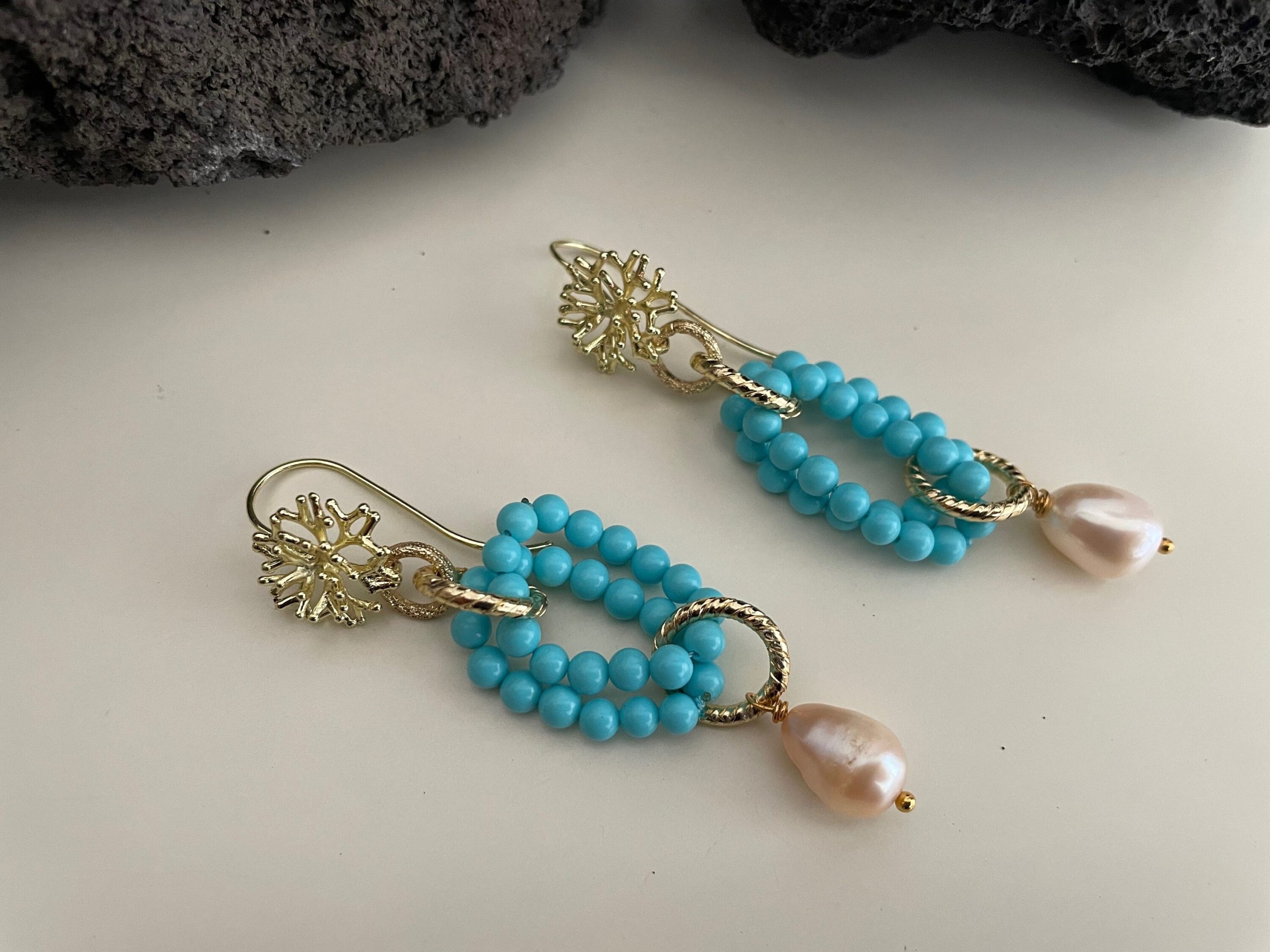Composti da gancio in Ottone a forma di Ramo di Corallo, anelli di perle di Pasta di Turchese e perle barocche.