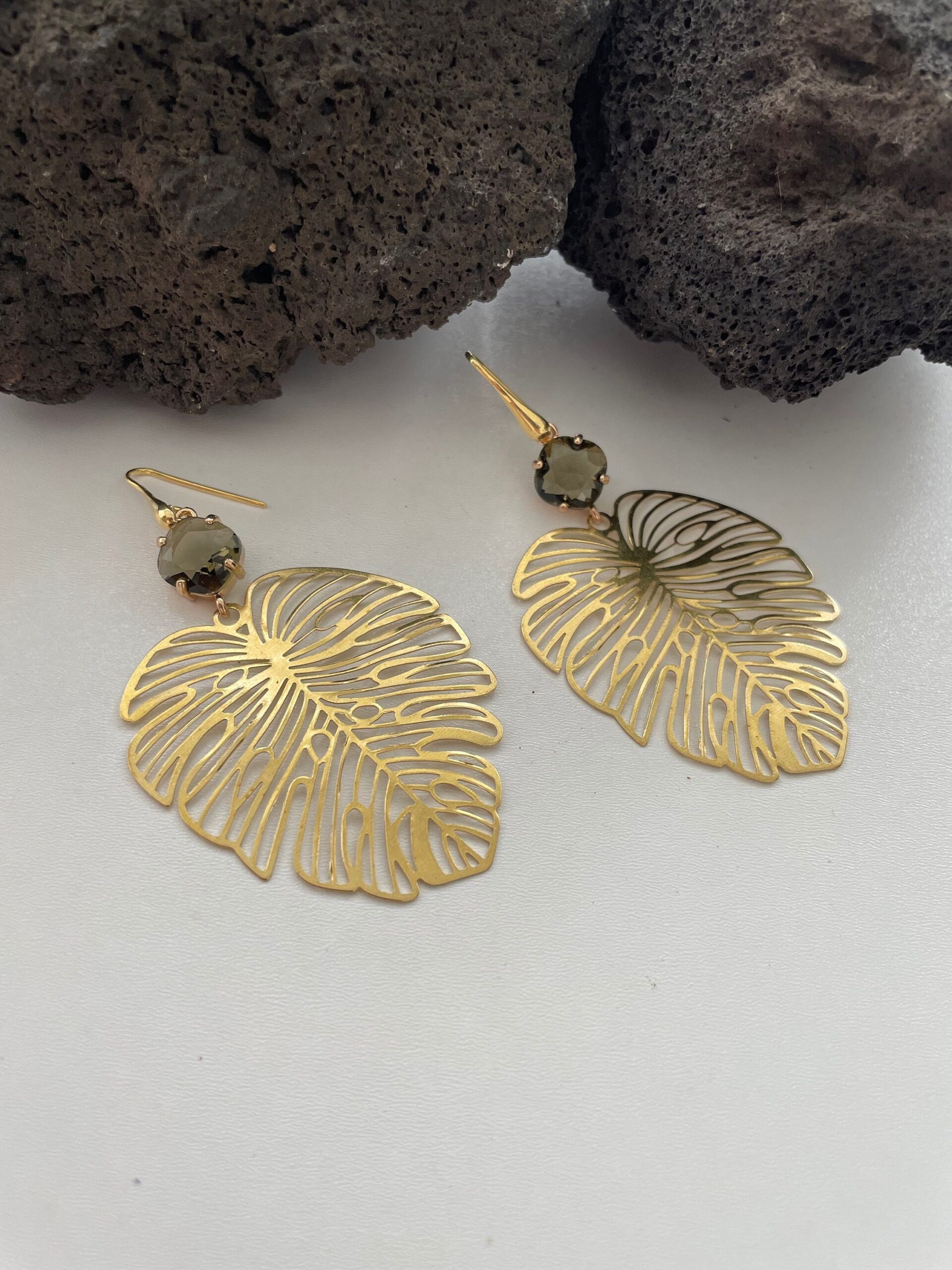 Realizzati con gancio in Argento 925, Cristallo tondo color bruno e pendente una grande foglia di Monstera filigranata in ottone.