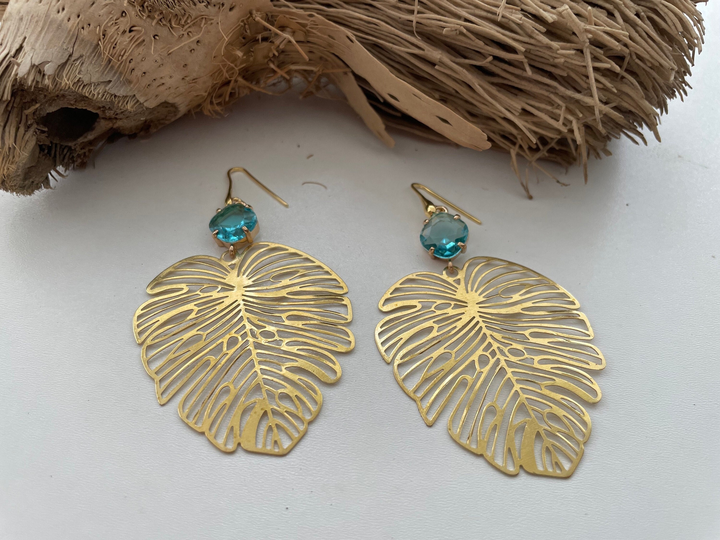 Realizzati con gancio in Argento 925, Cristallo tondo color celeste e pendente una grande foglia di Monstera filigranata in ottone.
