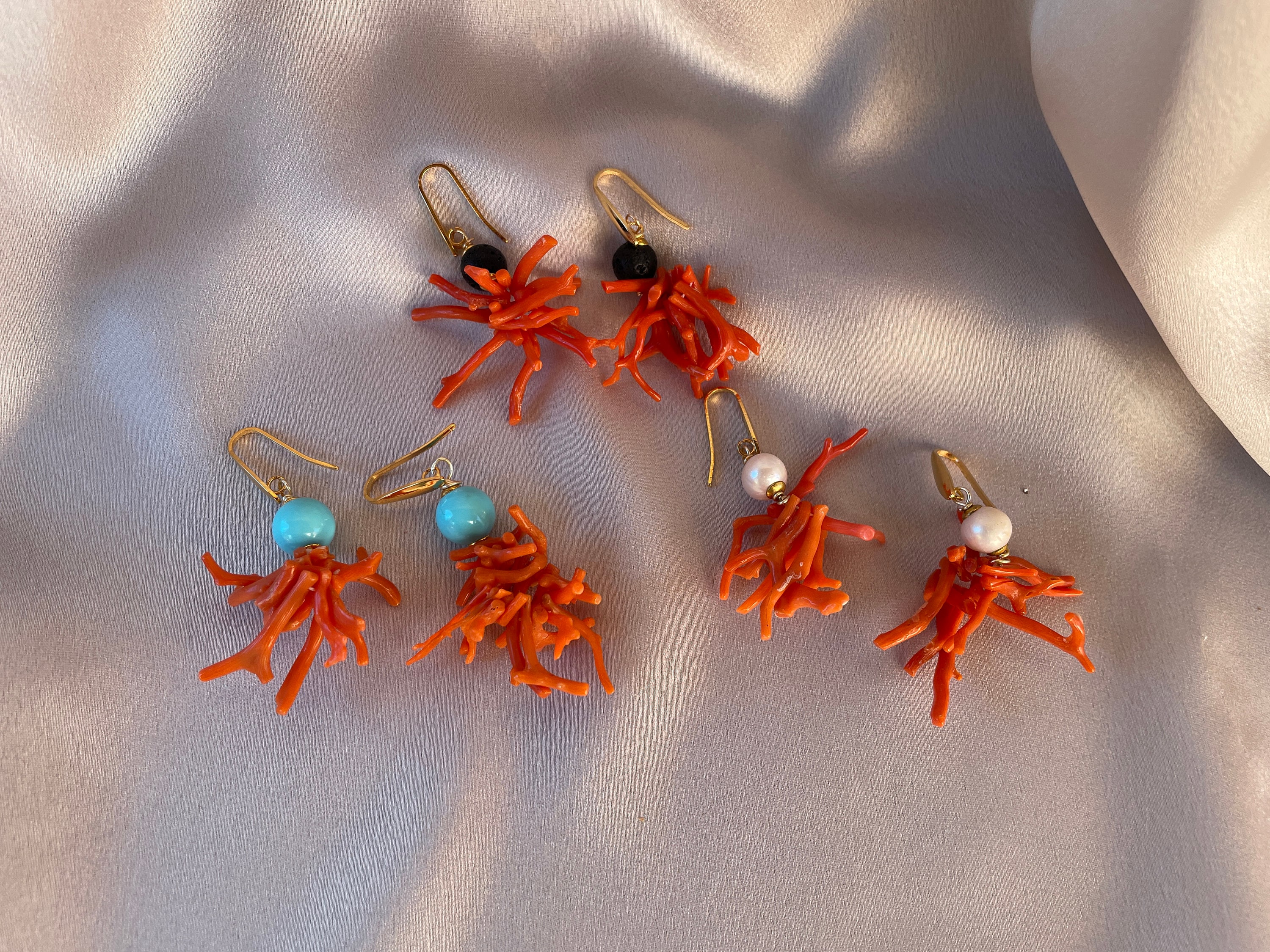 Orecchini con grappolo di rami di corallo autentico del Mediterraneo, perla barocca, orecchini siciliani, regalo per lei.