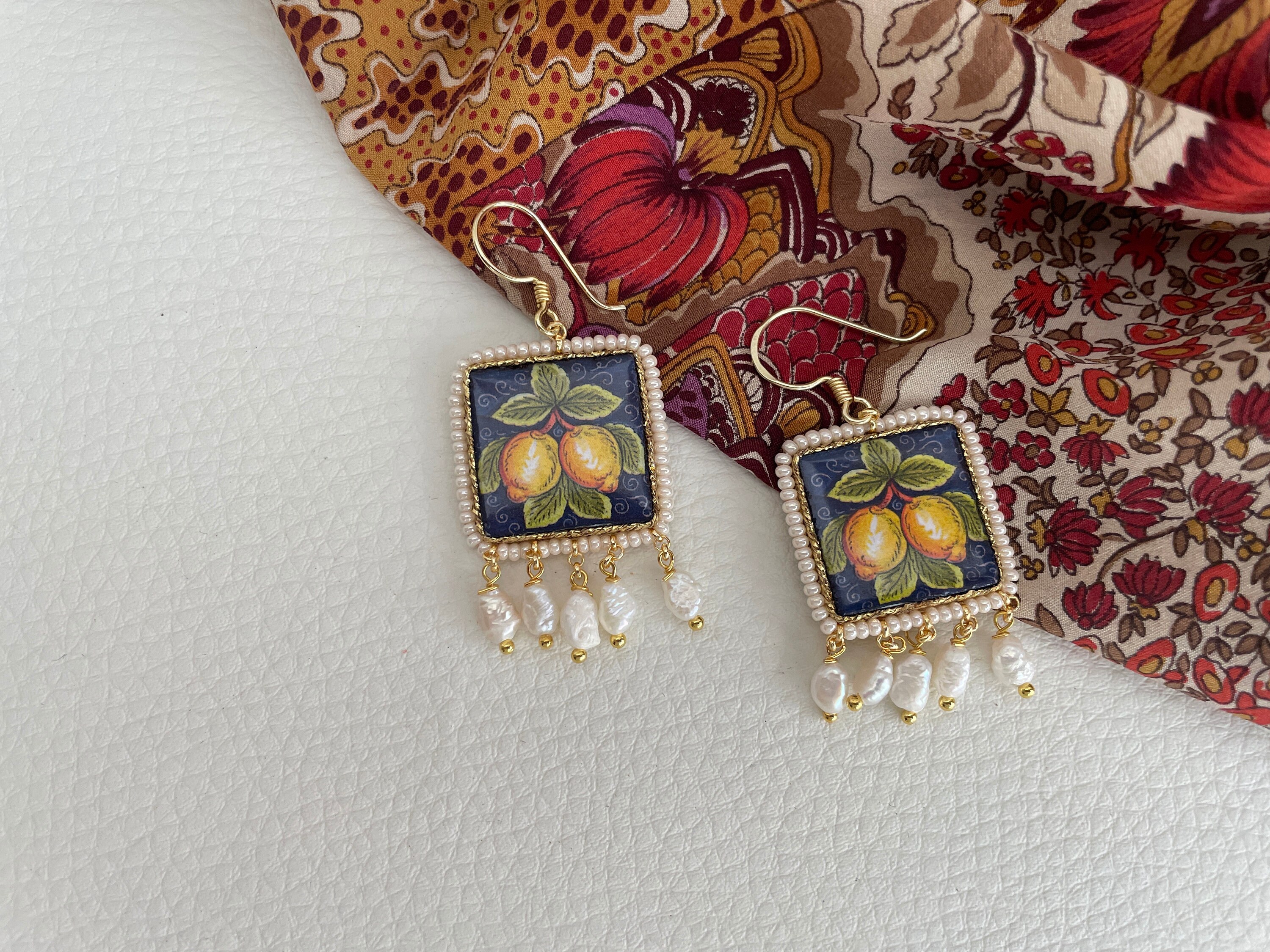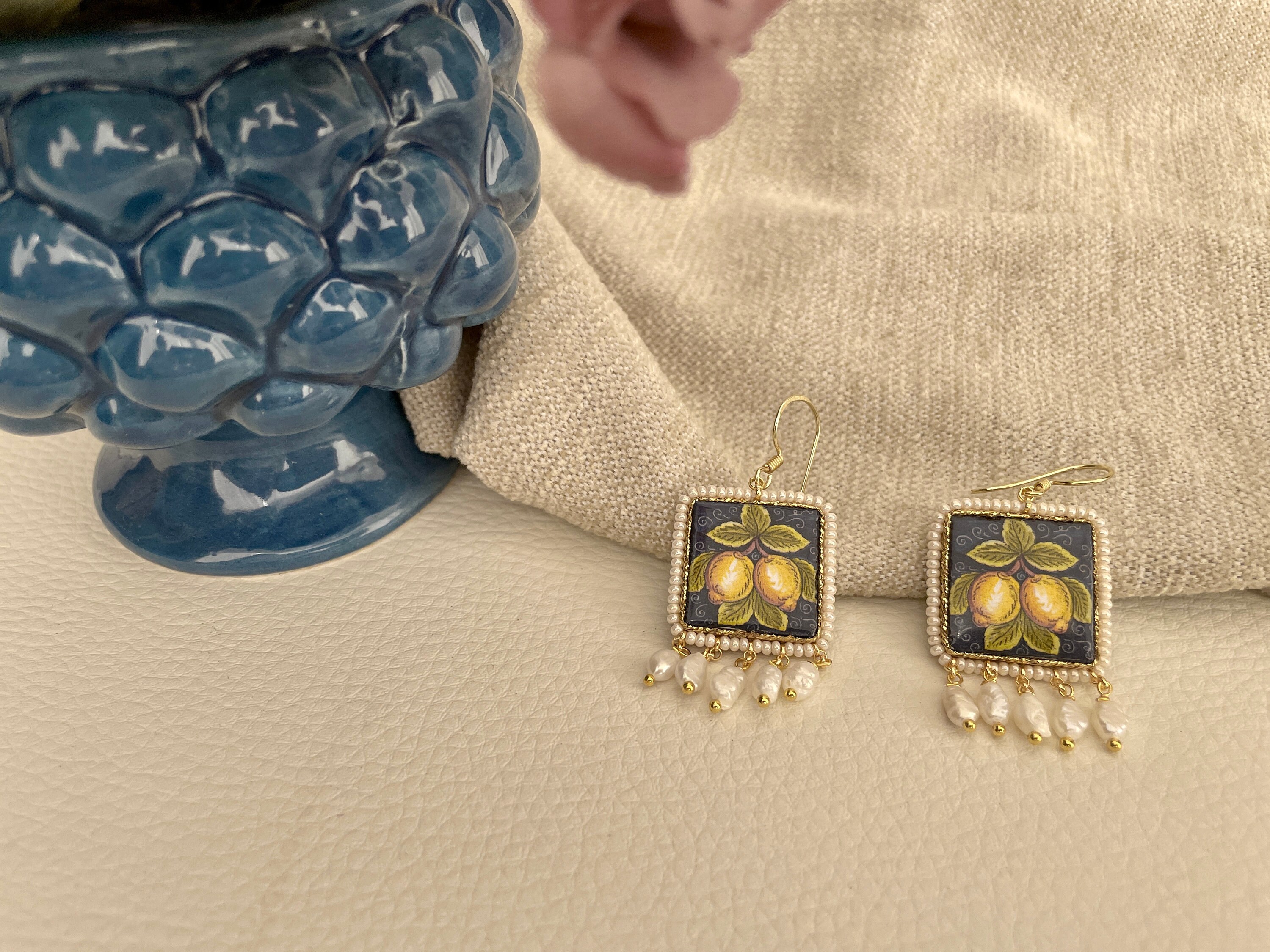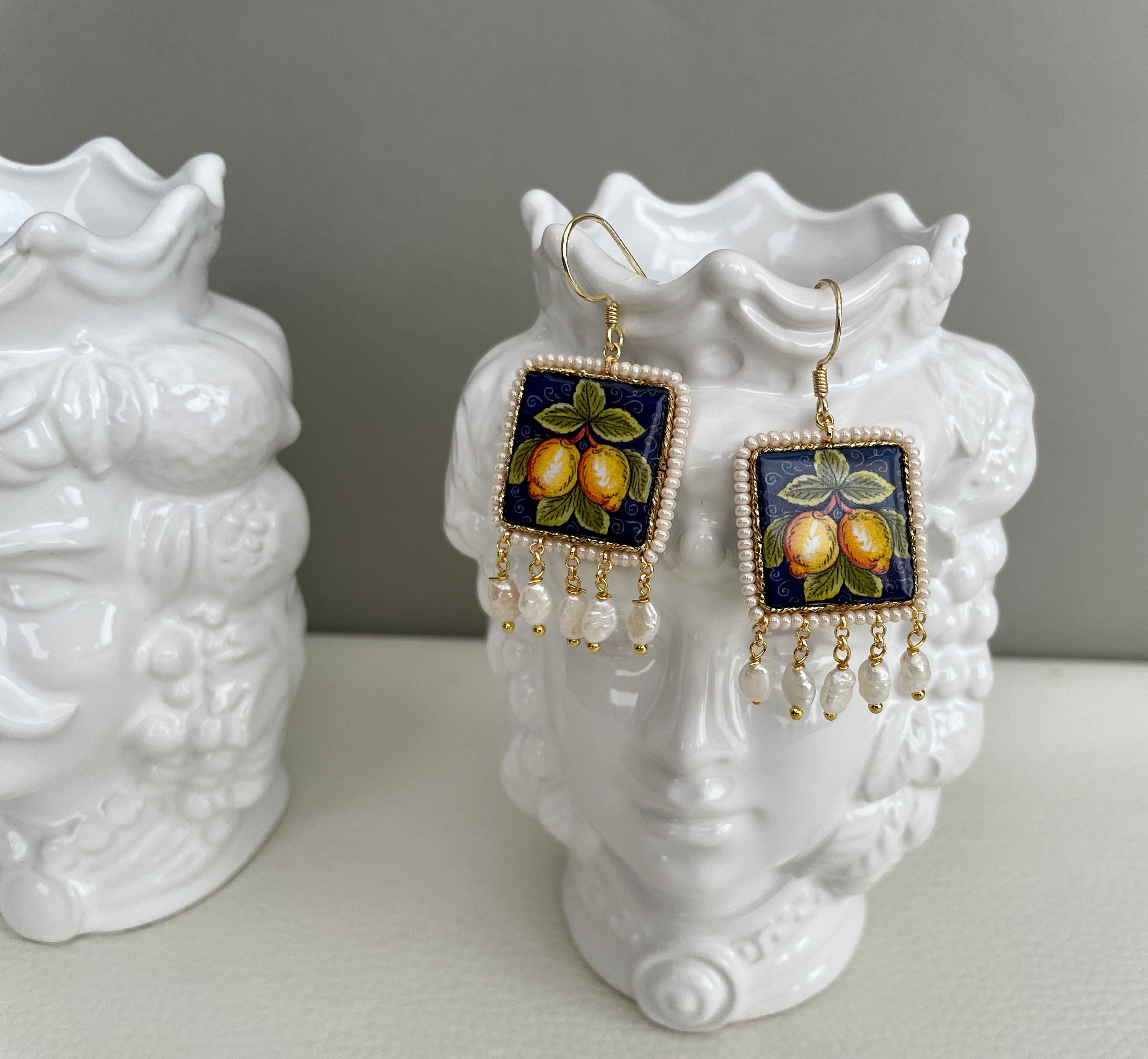 Orecchini siciliani con mattonella di ceramica di Caltagirone su base lavica, stampate in superficie a motivo Limoni.