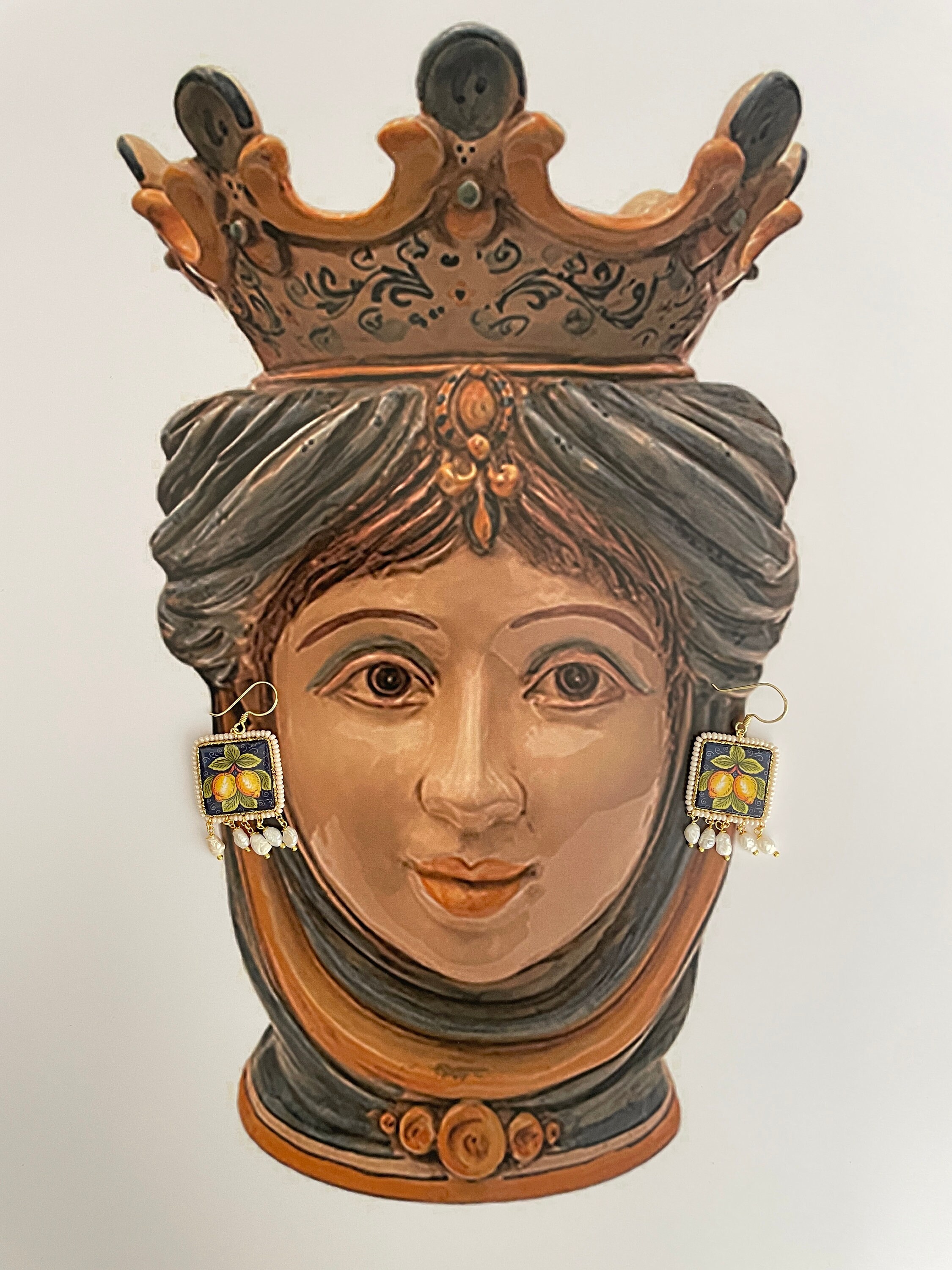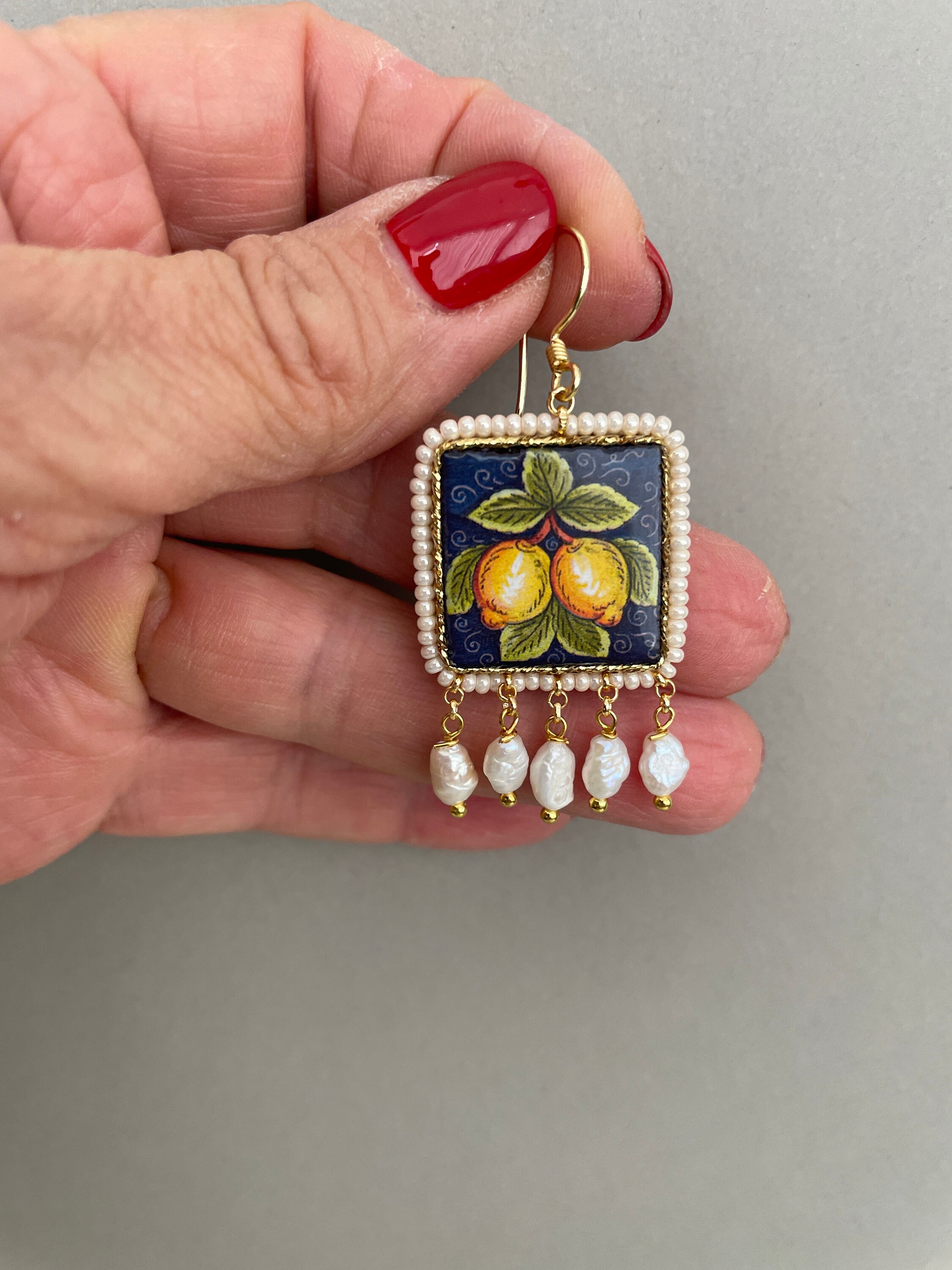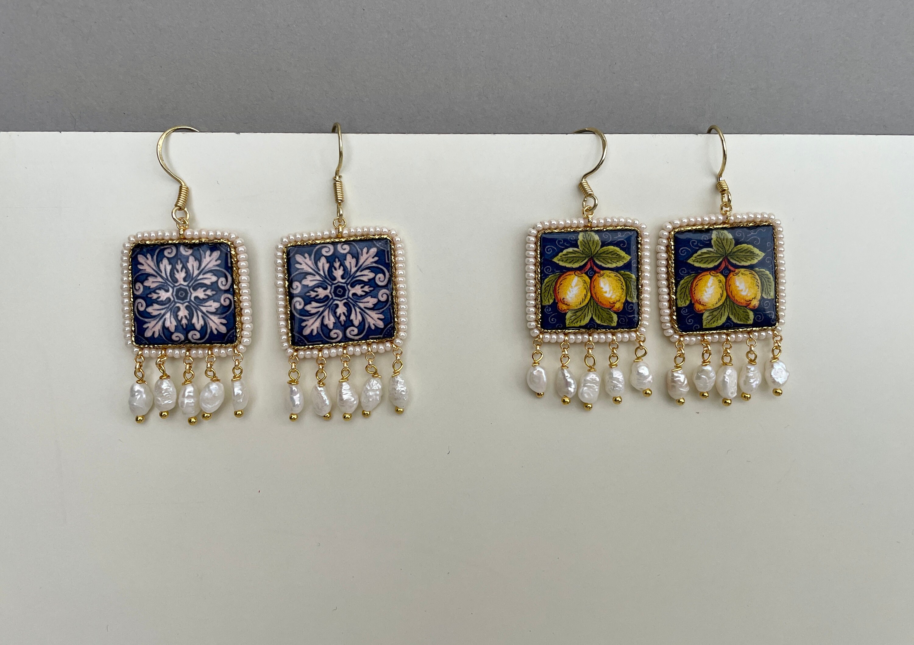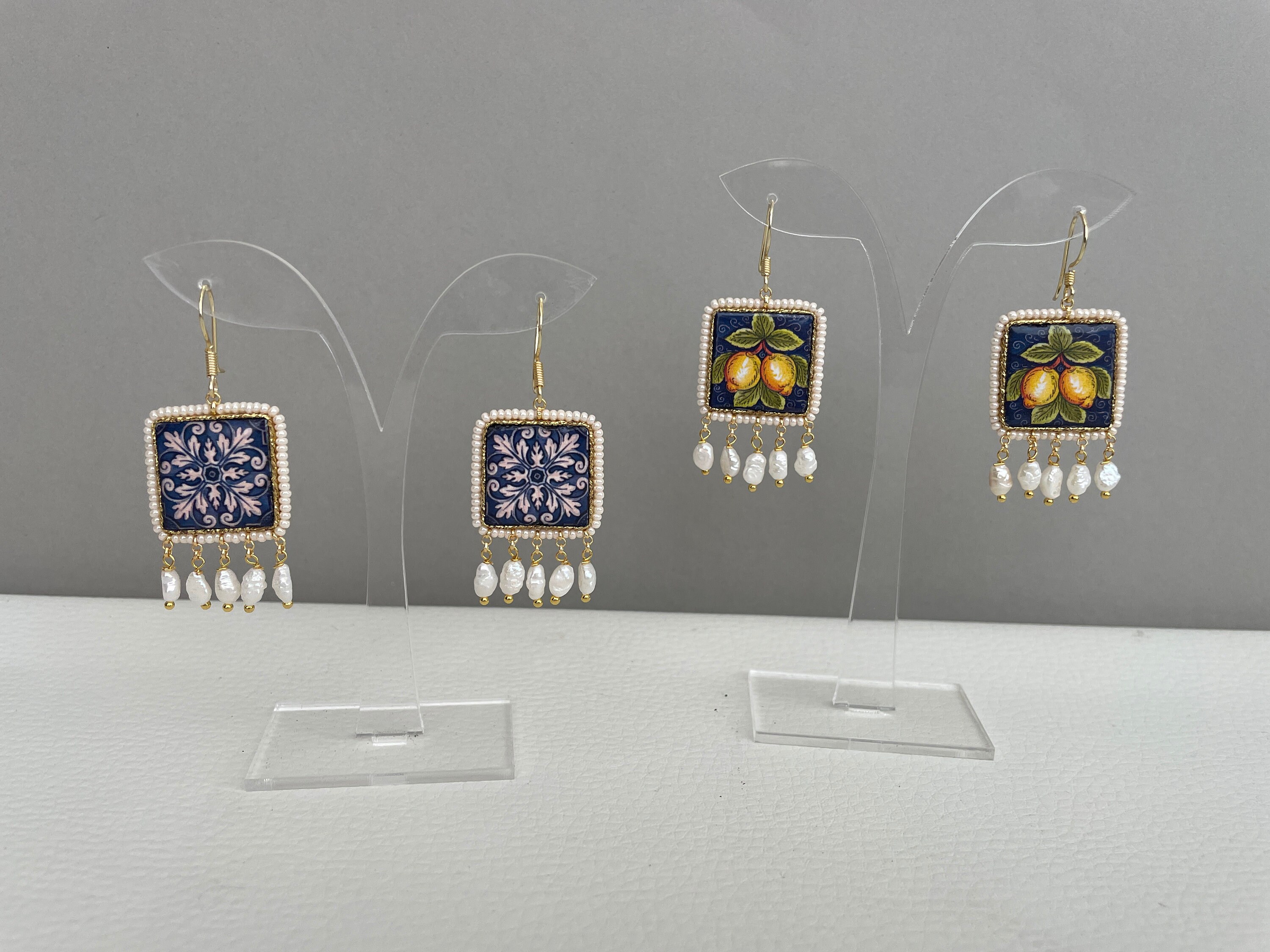 Orecchini siciliani con mattonella di ceramica di Caltagirone su base lavica, stampate in superficie a motivo Limoni.