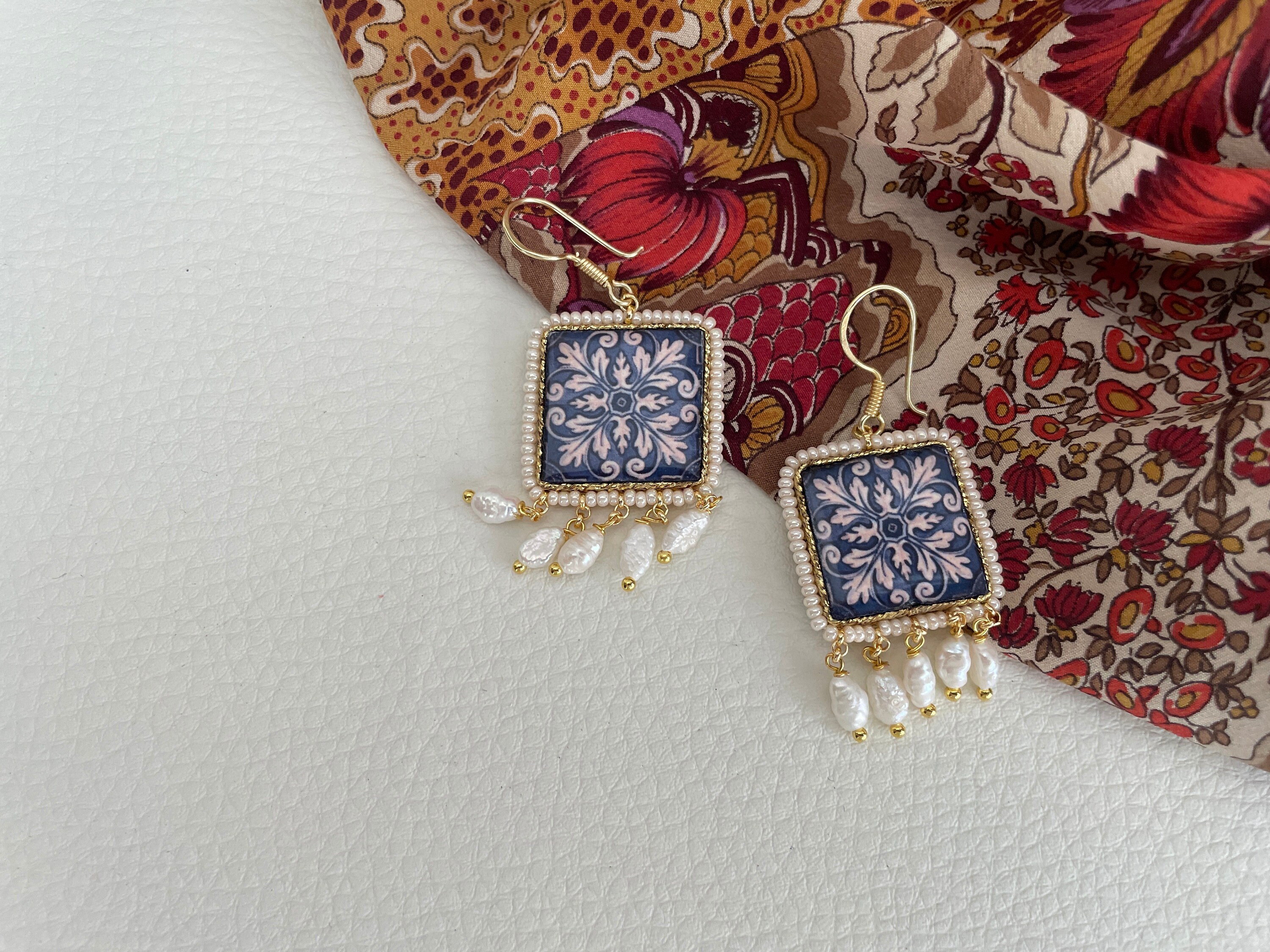 Le mattonelle sono incorniciate da un filo di microperle di fiume e da esse pendono 5 perle di fiume.