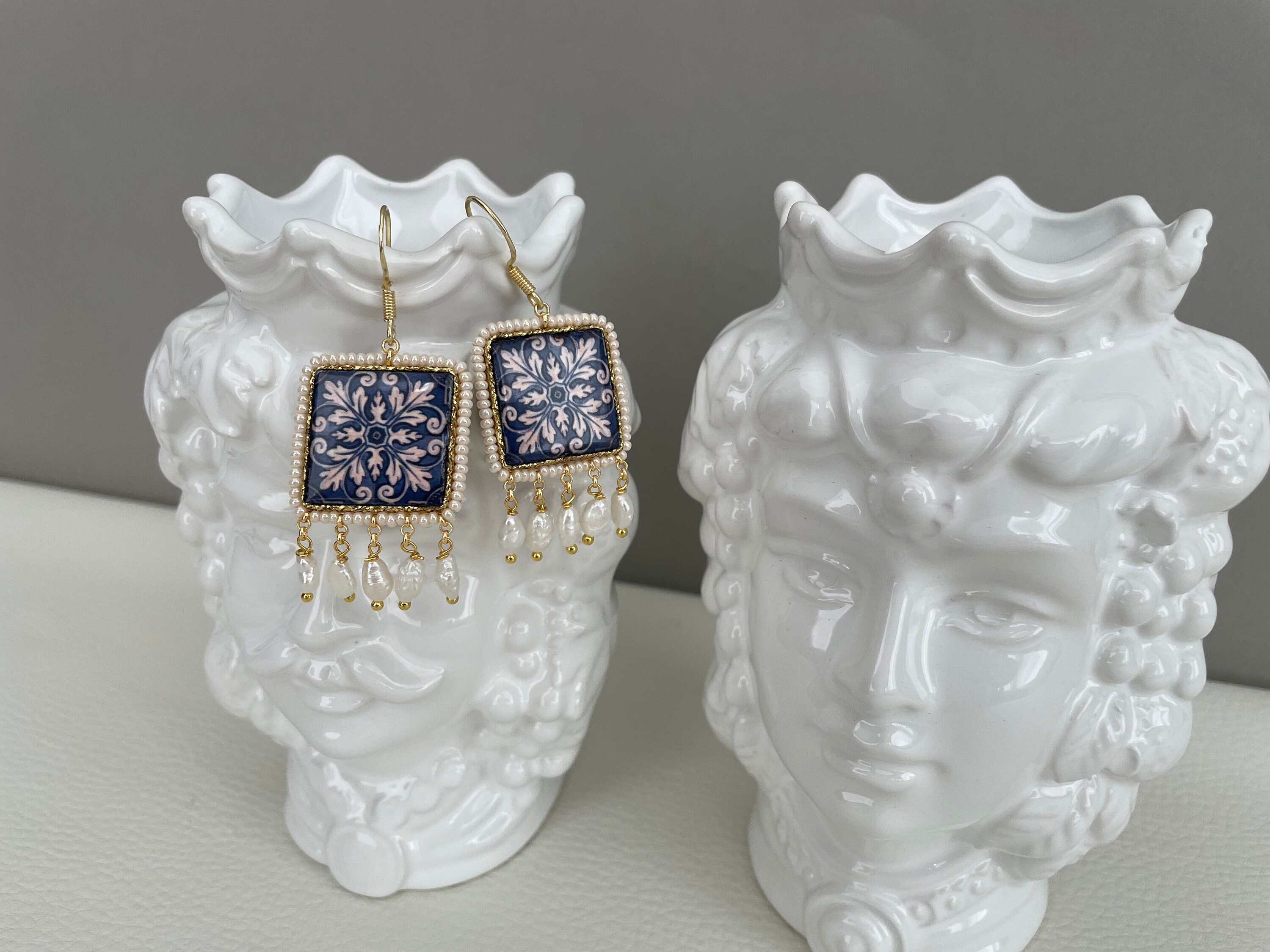 Orecchini artigianali compositi realizzati con vari elementi dallo stile unico e tipico della Sicilia e del Mediterraneo.