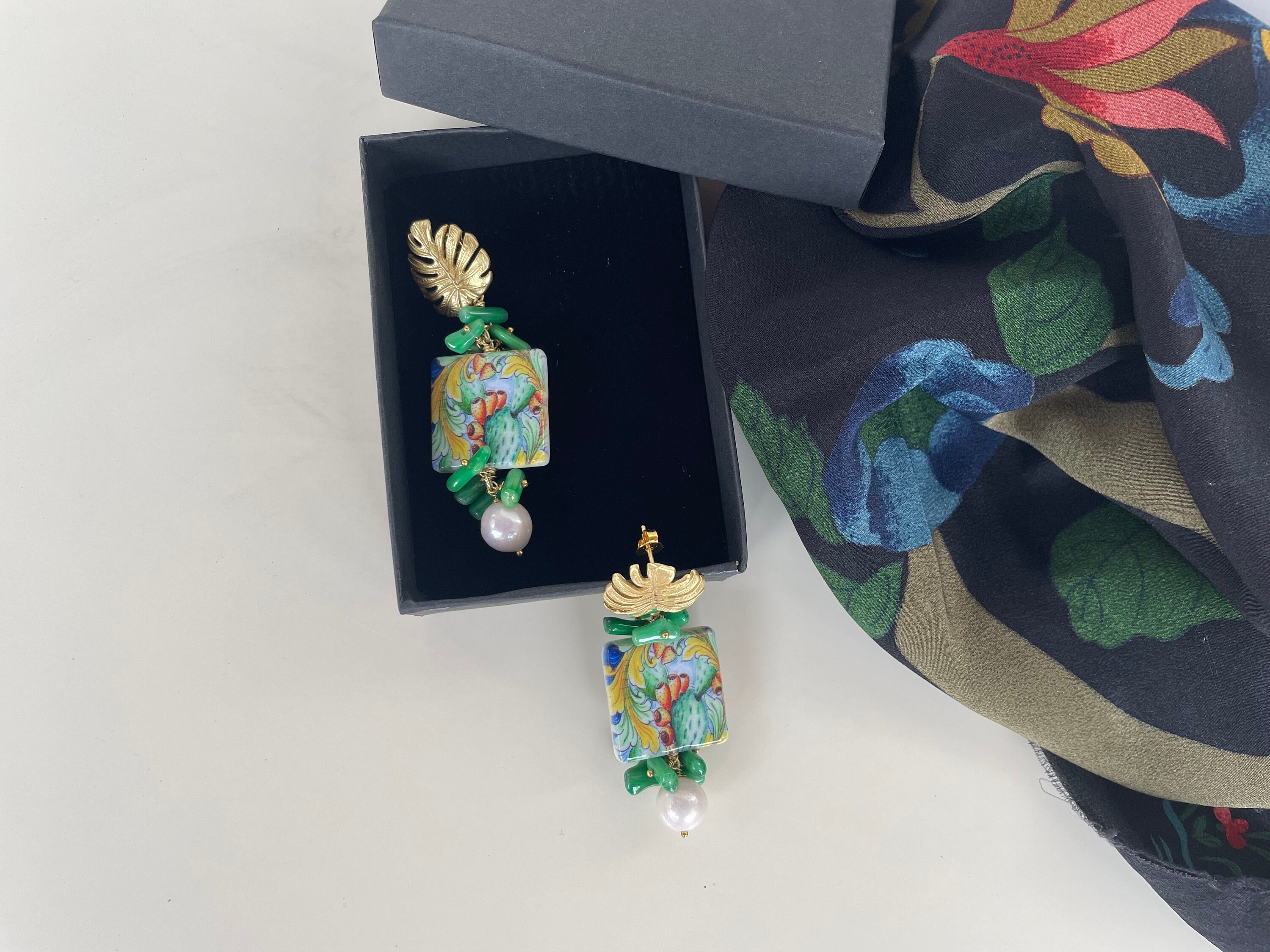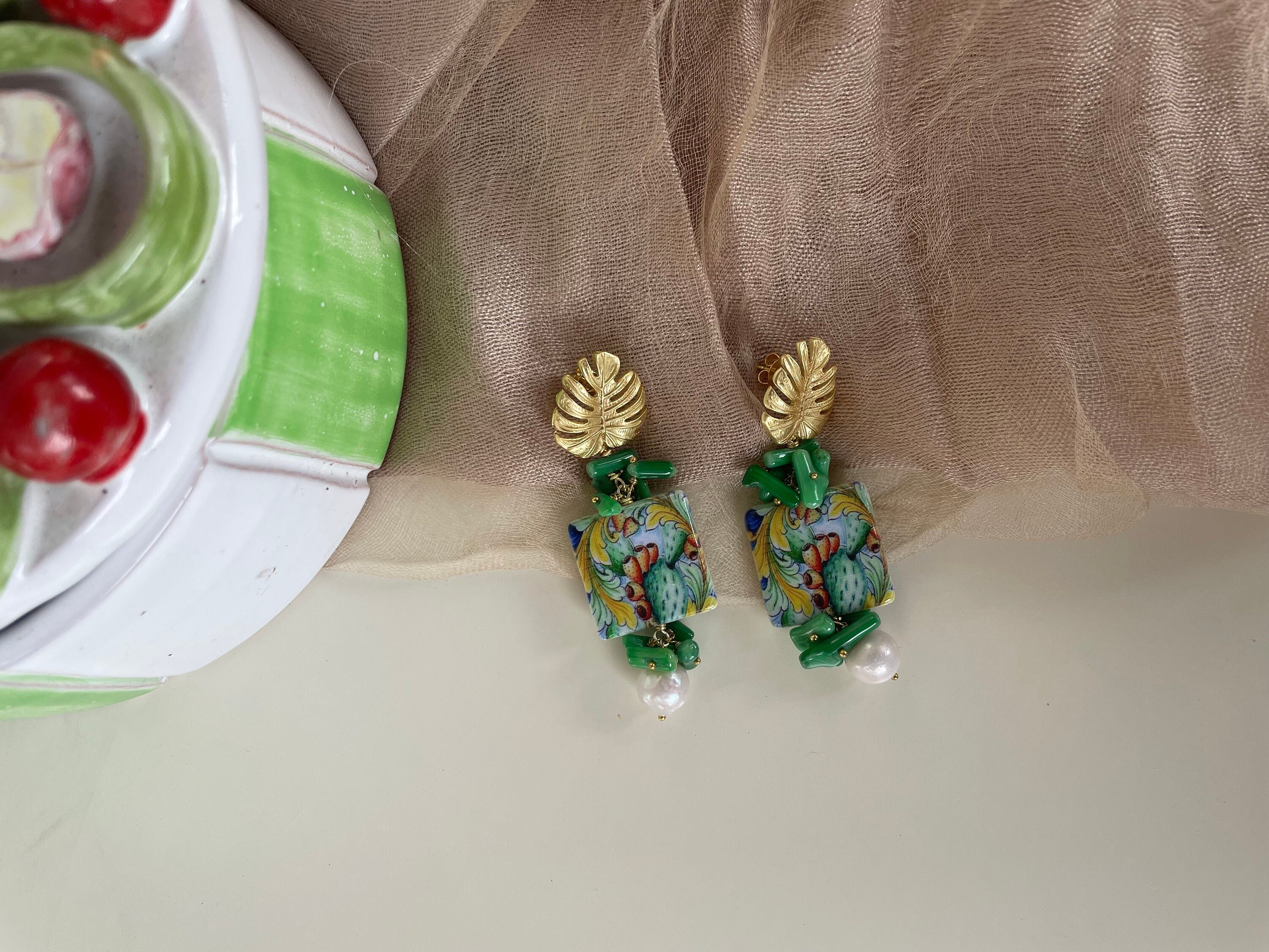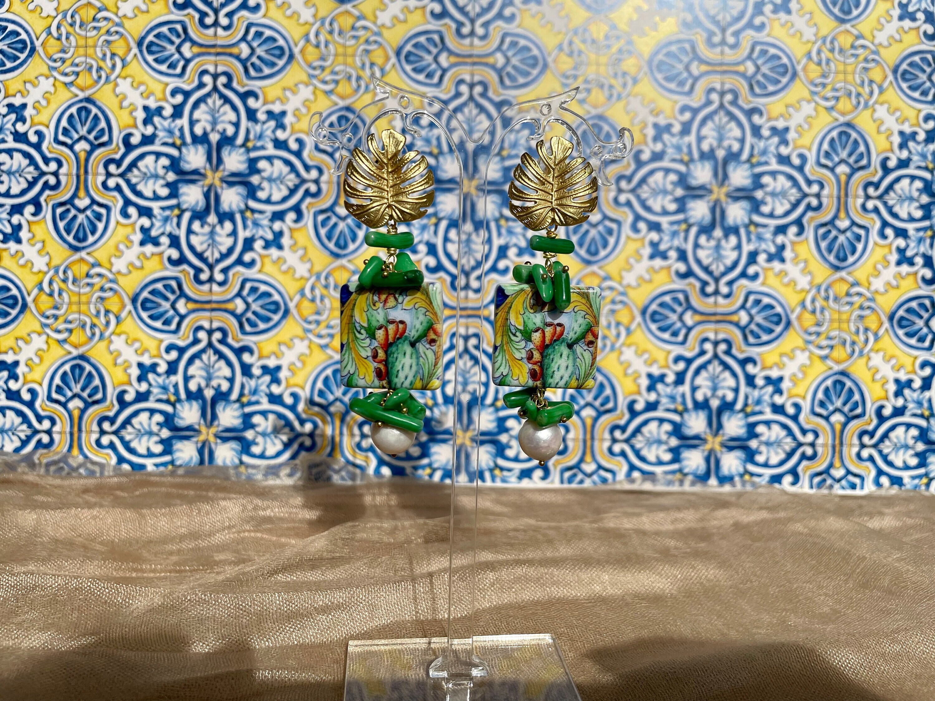 Una mattonella di ceramica di Caltagirone stampata in superficie su due lati e raffigurante i fichi d’india tipici della Sicilia.