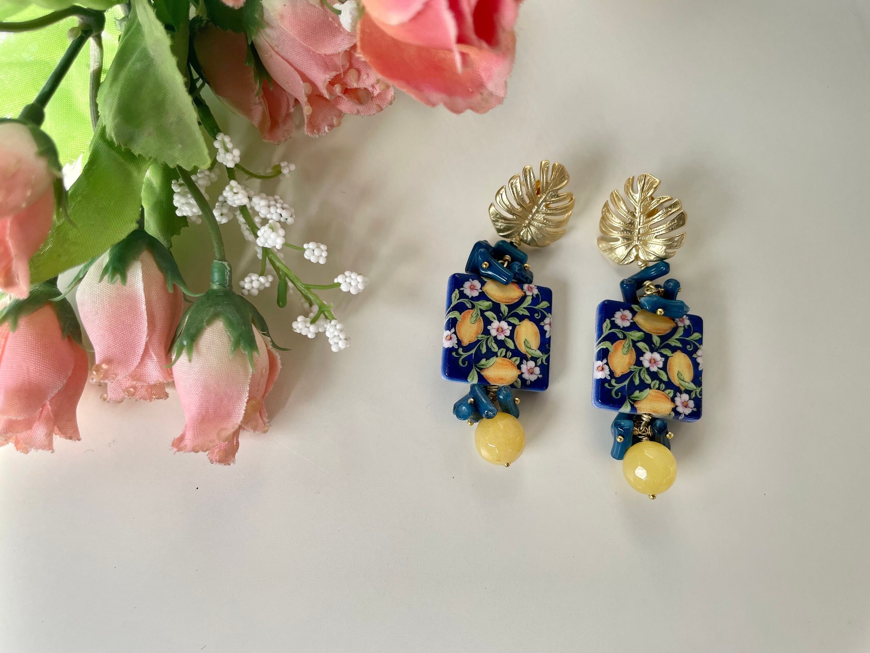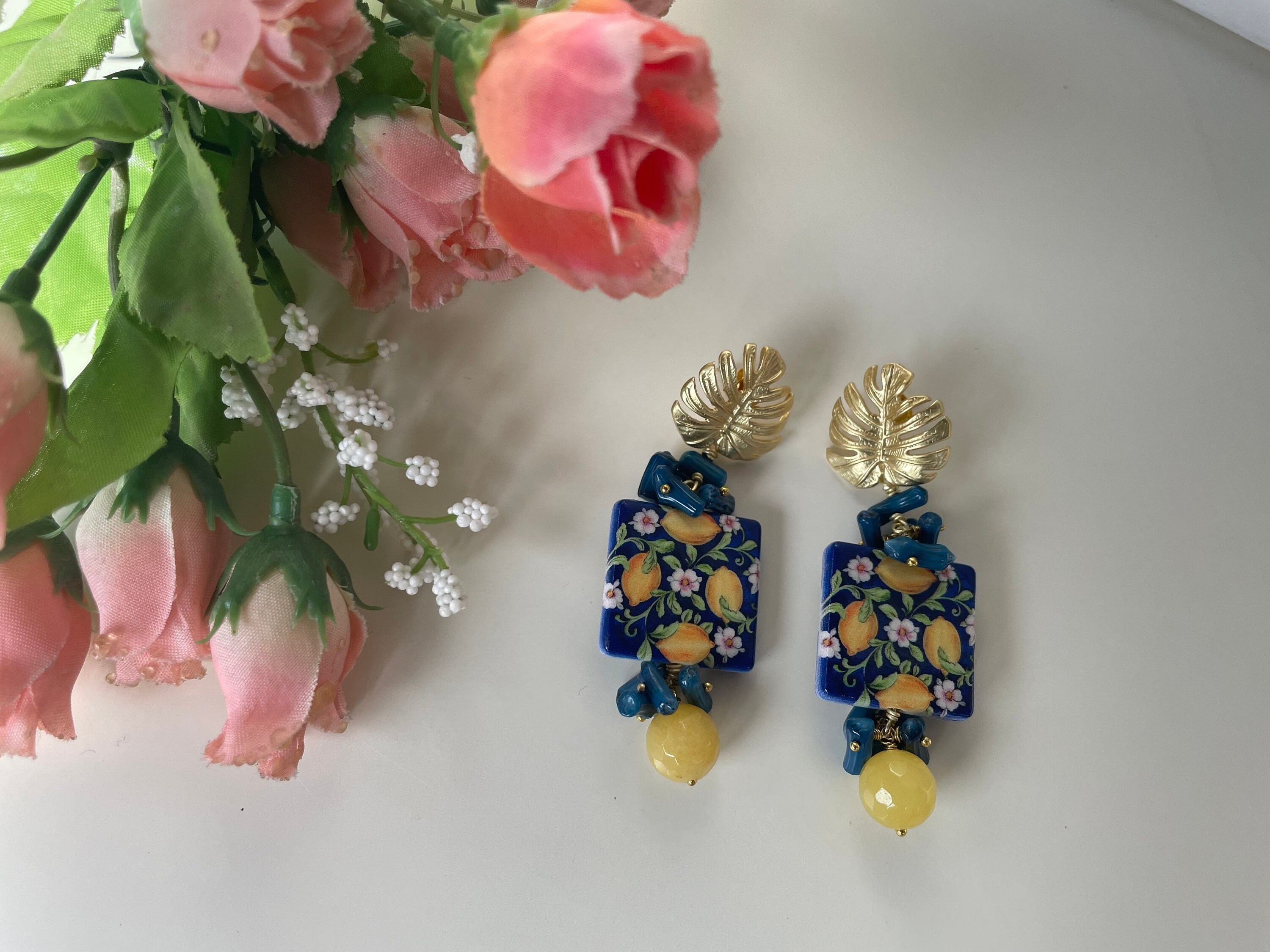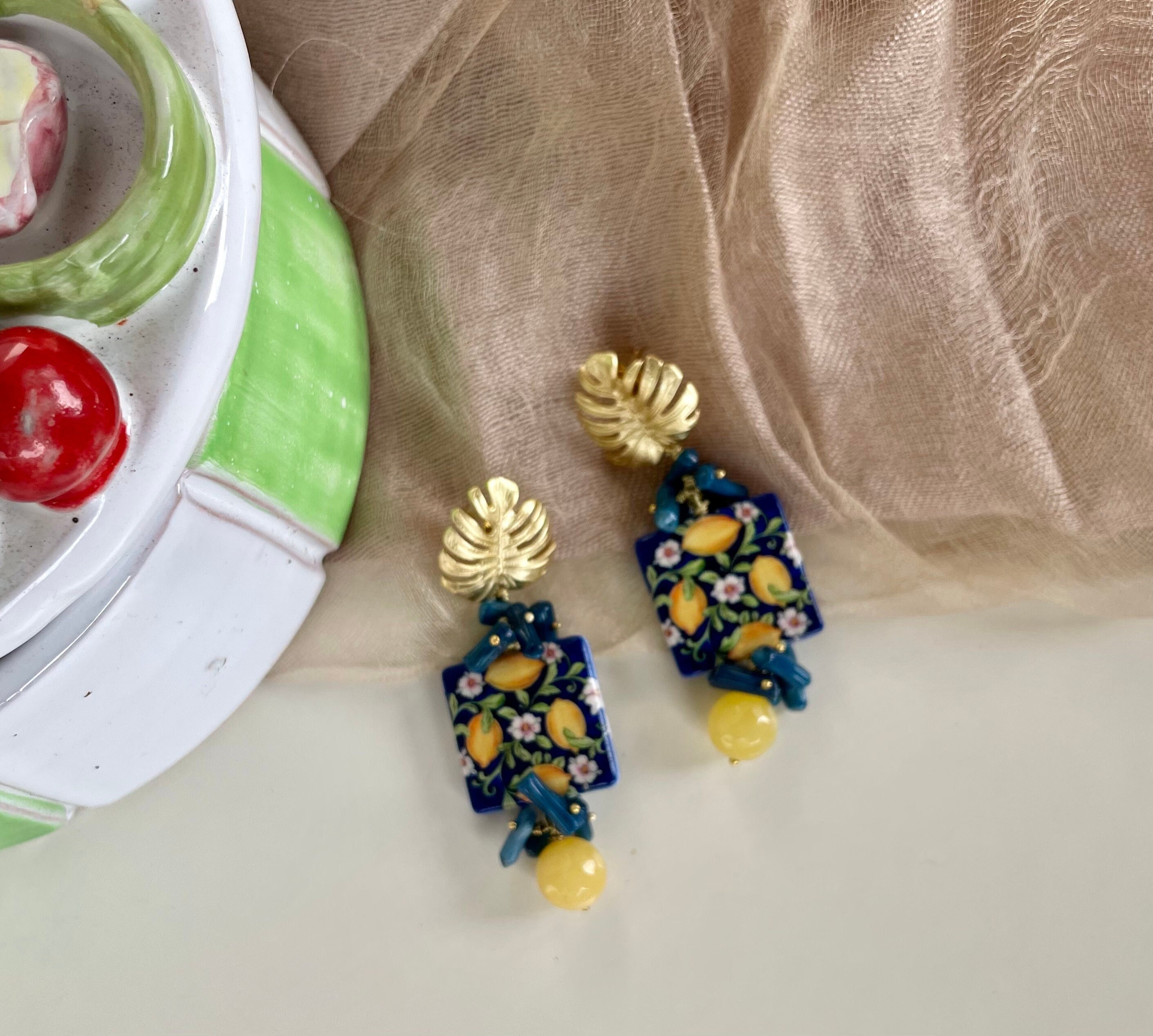 Realizzati con perno in ottone dorato a forma di foglia di Monstera e mattonella di ceramica di Caltagirone stampata in superficie su due lati.