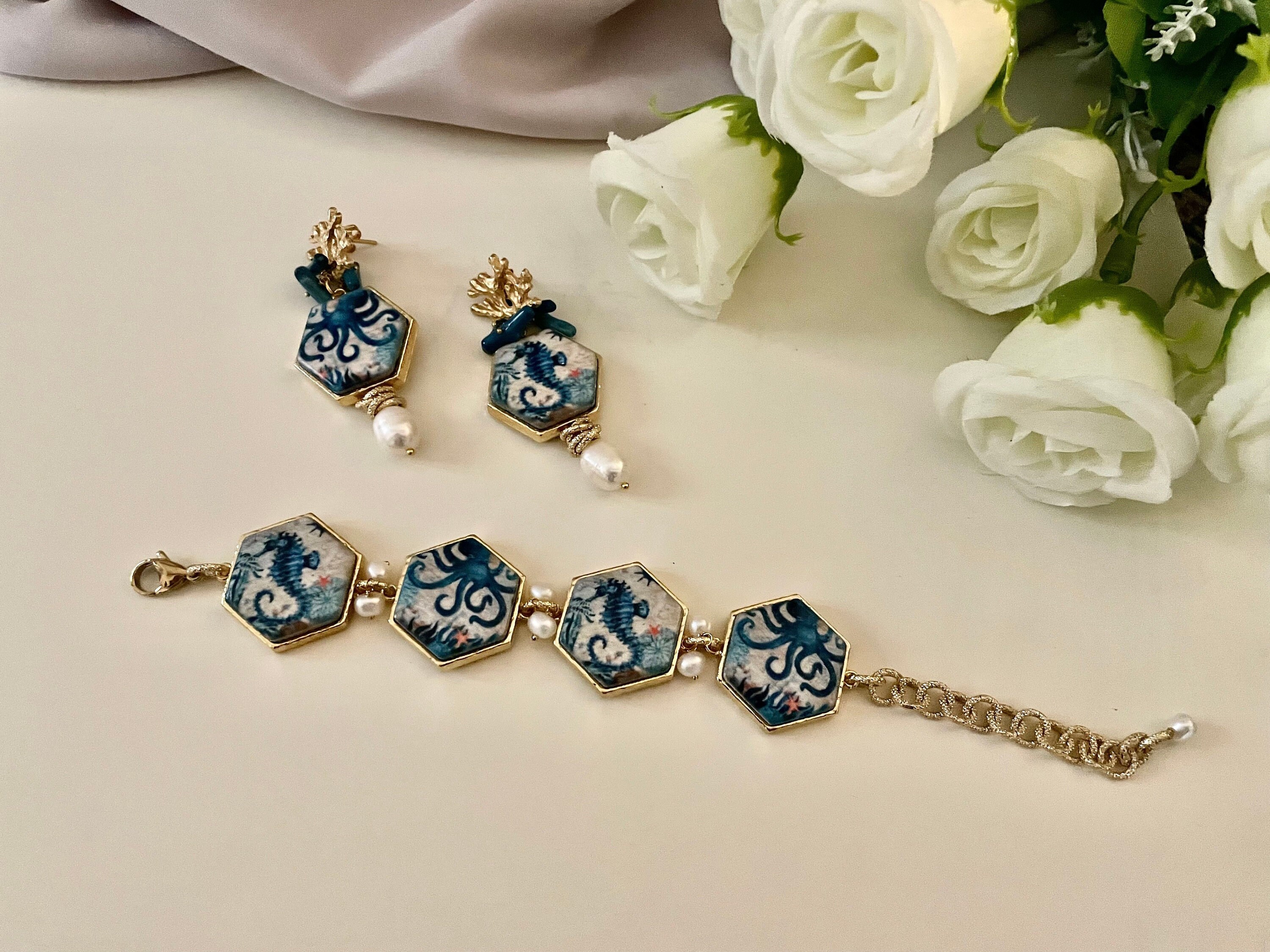 – mattonella esagonale di ceramica di Caltagirone stampata in superficie con Polipo una e Cavalluccio marino l’altra;