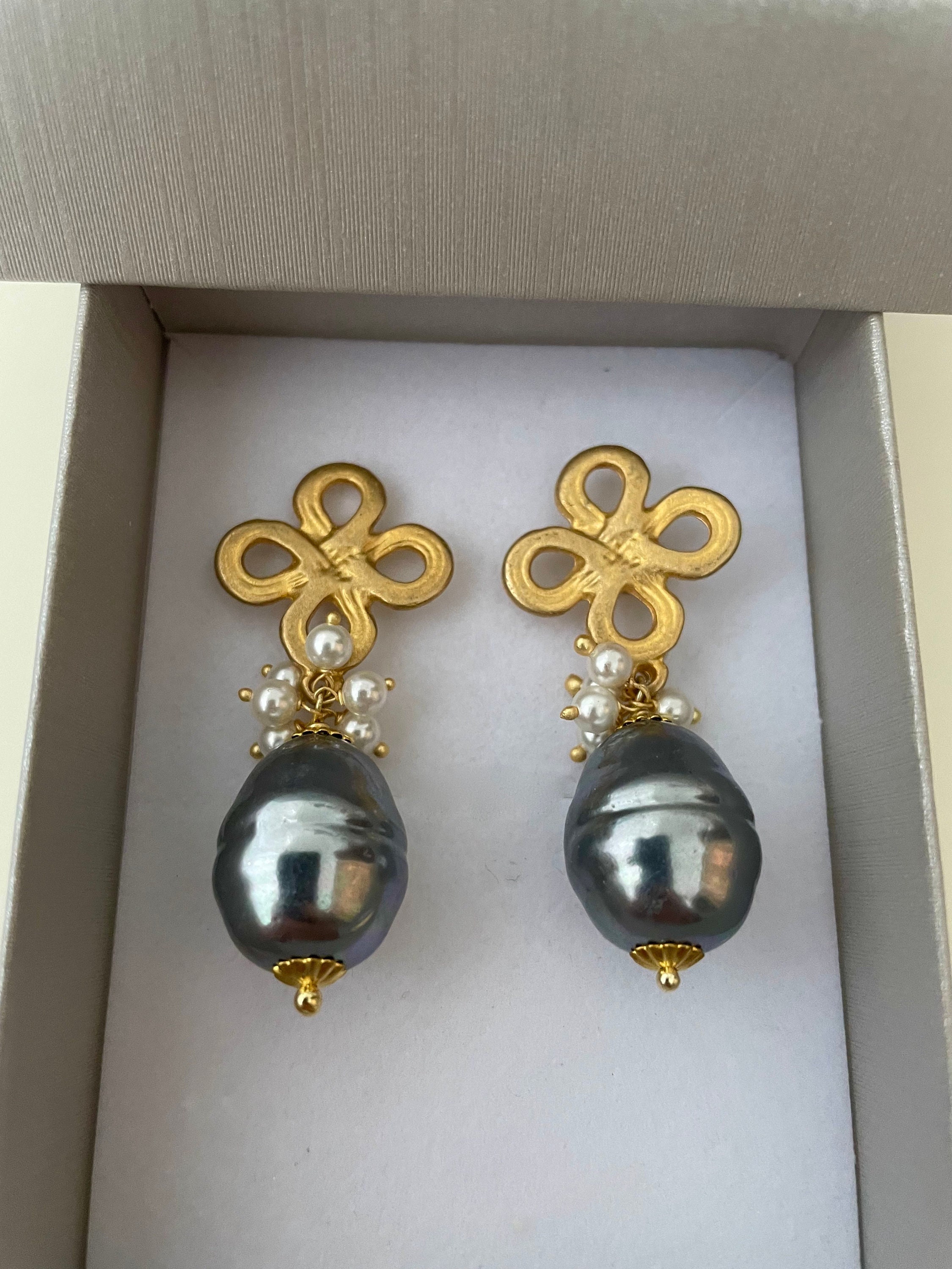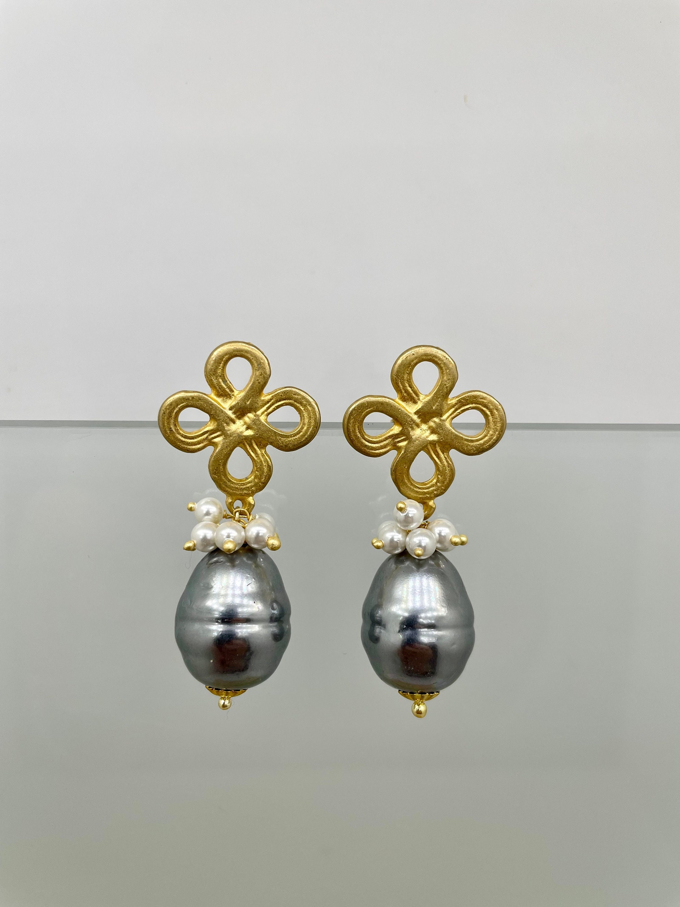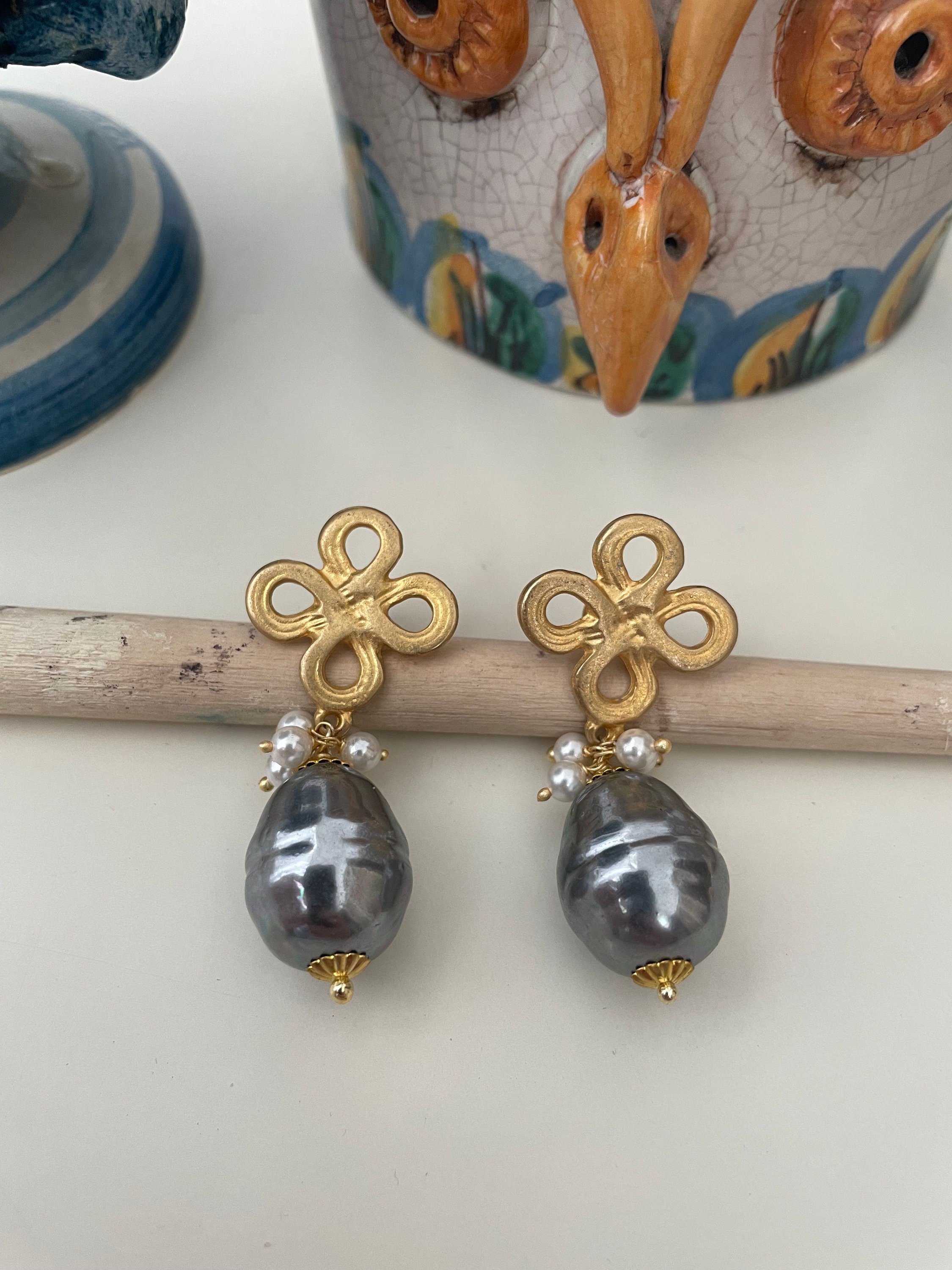 Realizzati con perno in zama a motivo di Nodo arabesco, grandi perle Maiorca grigie e grappoli di piccole perle Maiorca bianche.