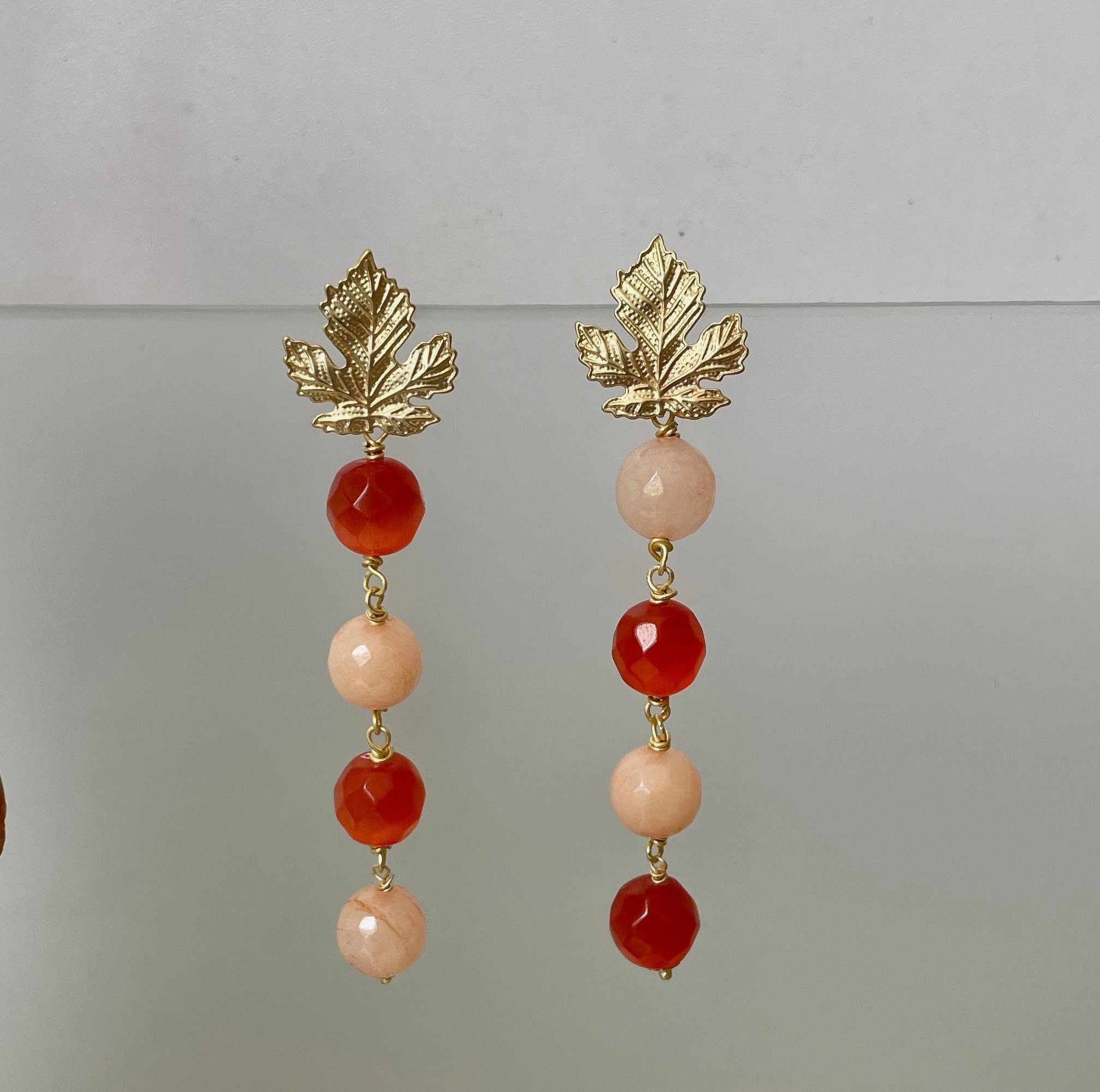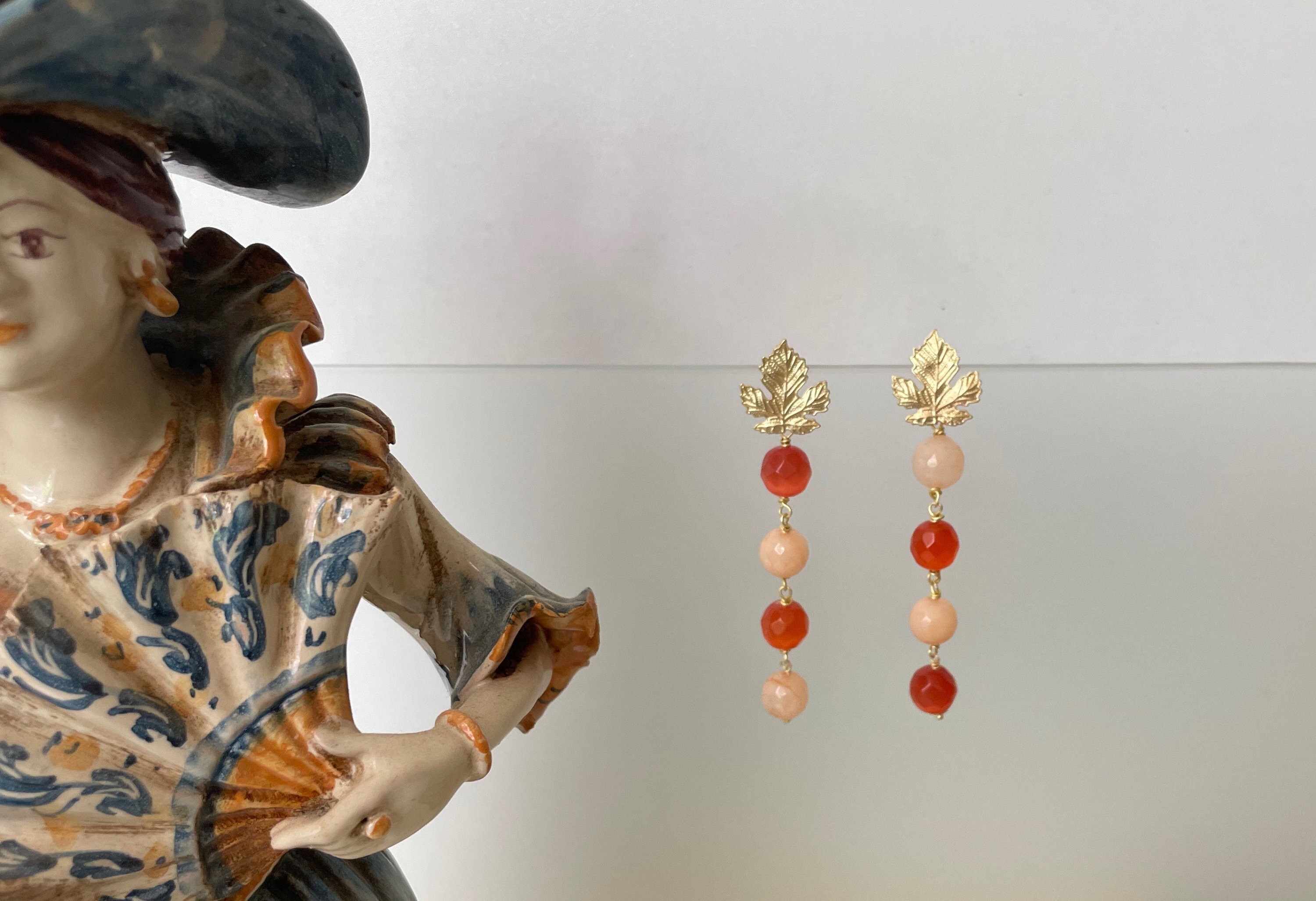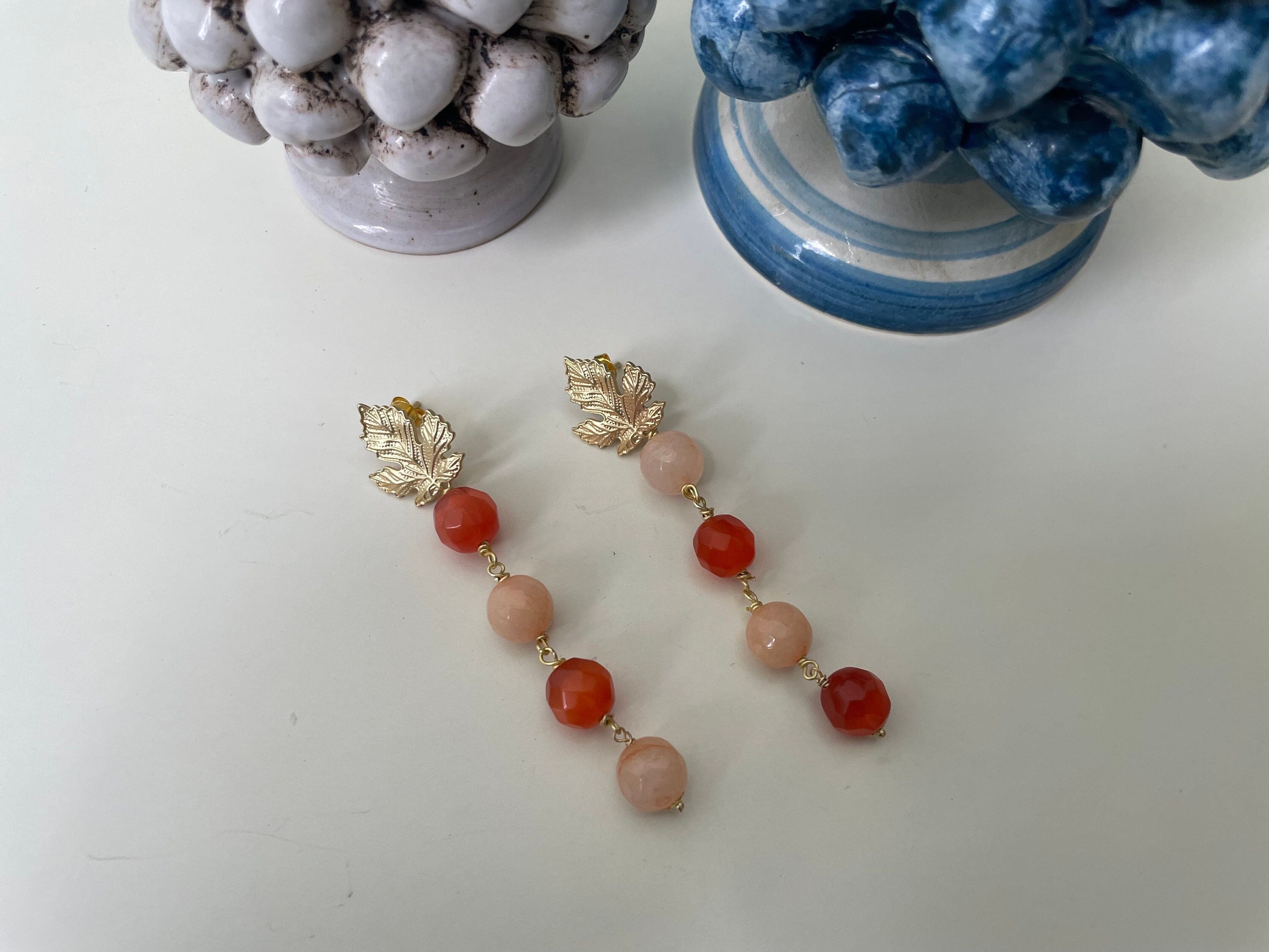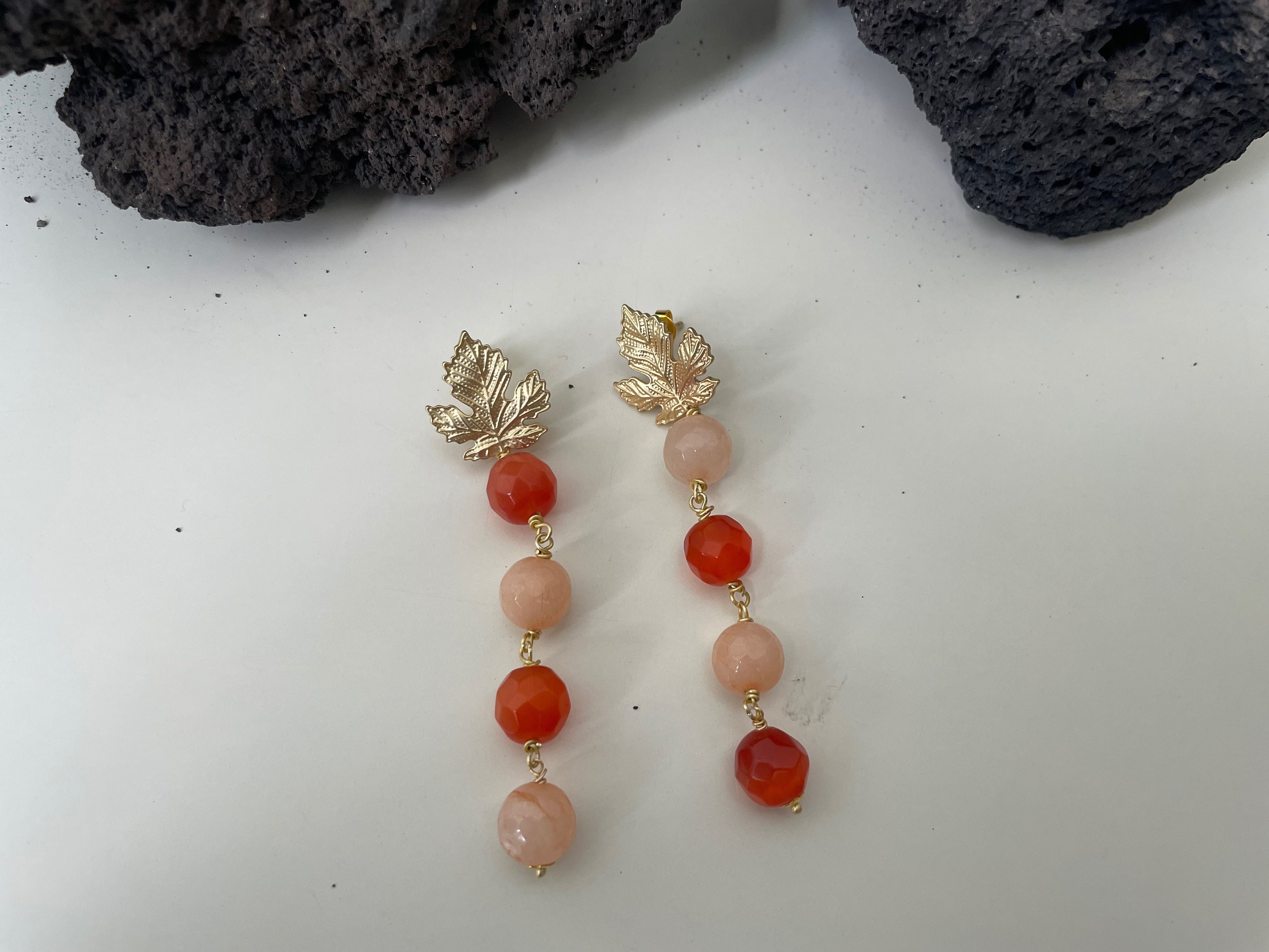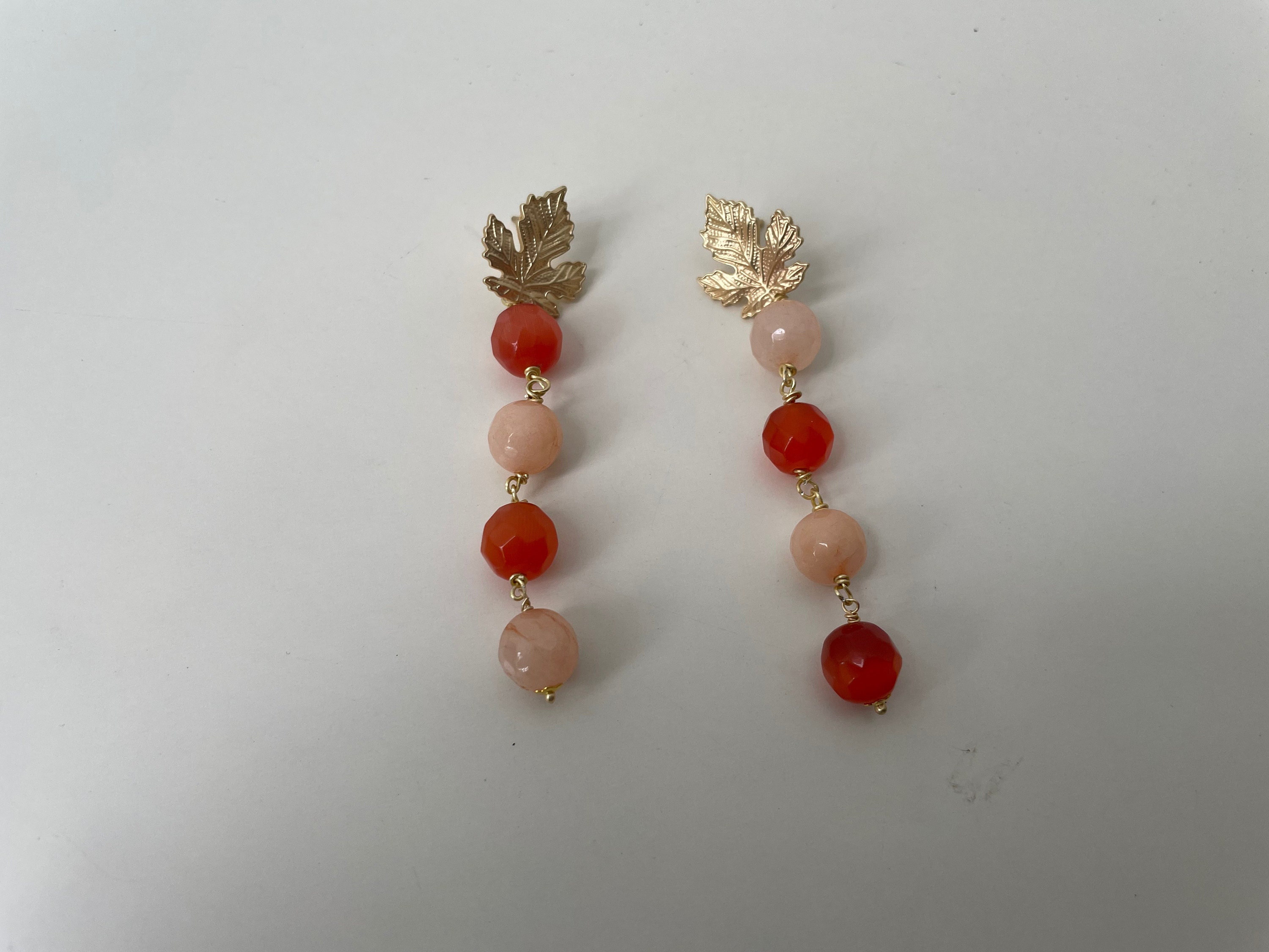 Realizzati con perno in bronzo a forma di Foglia, e quattro perle pendenti sfaccettate in Agata Arancio e Agata Beige, disposte asimmetricamente.
