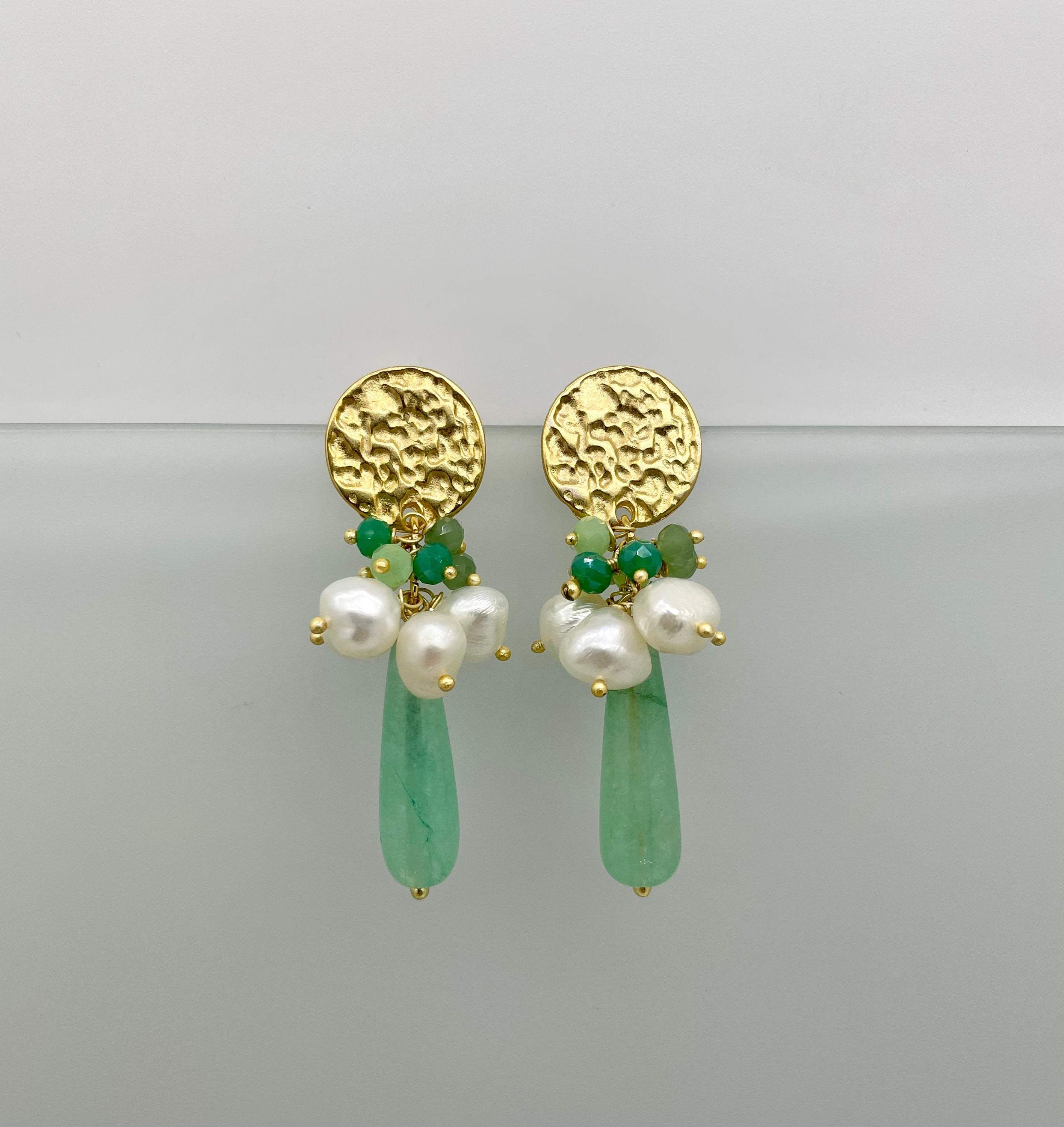 Composti da perno in ottone, tondo e martellato, grappolo di perle di agata verde e perle di fiume.