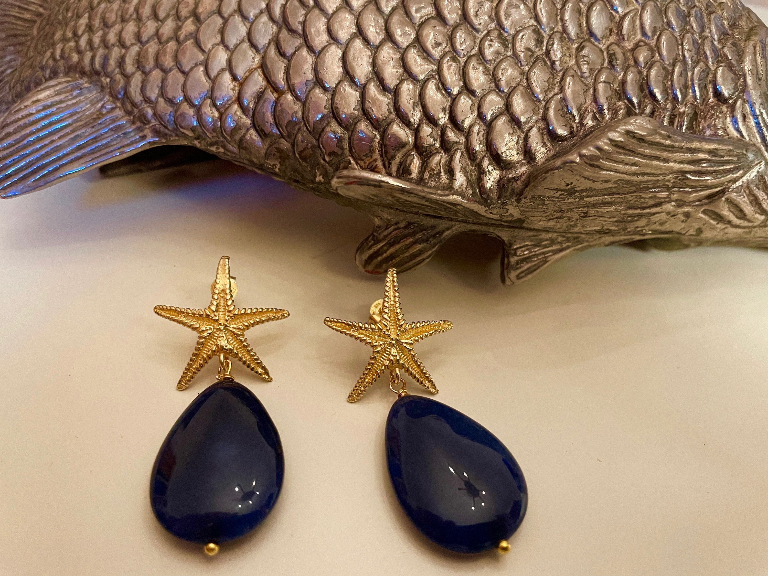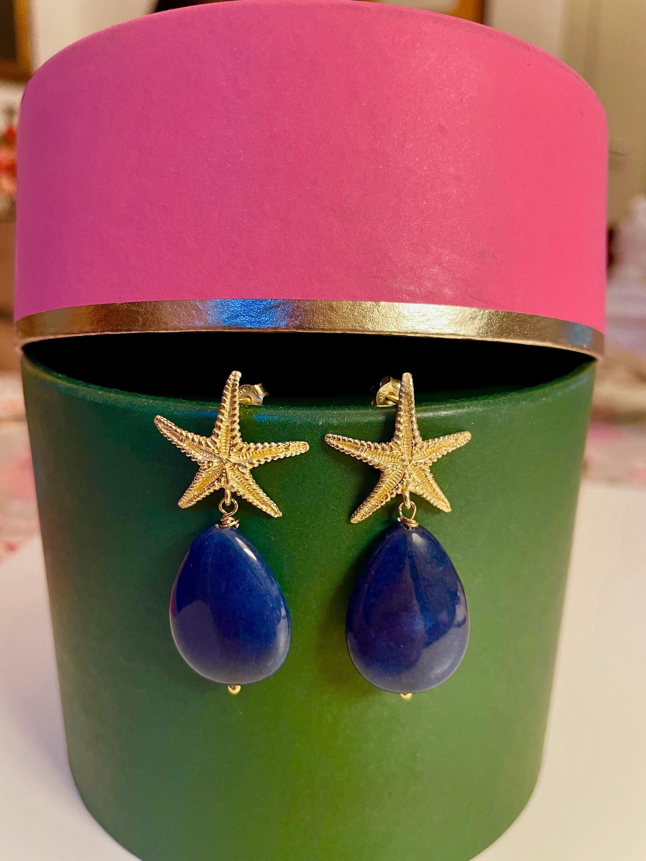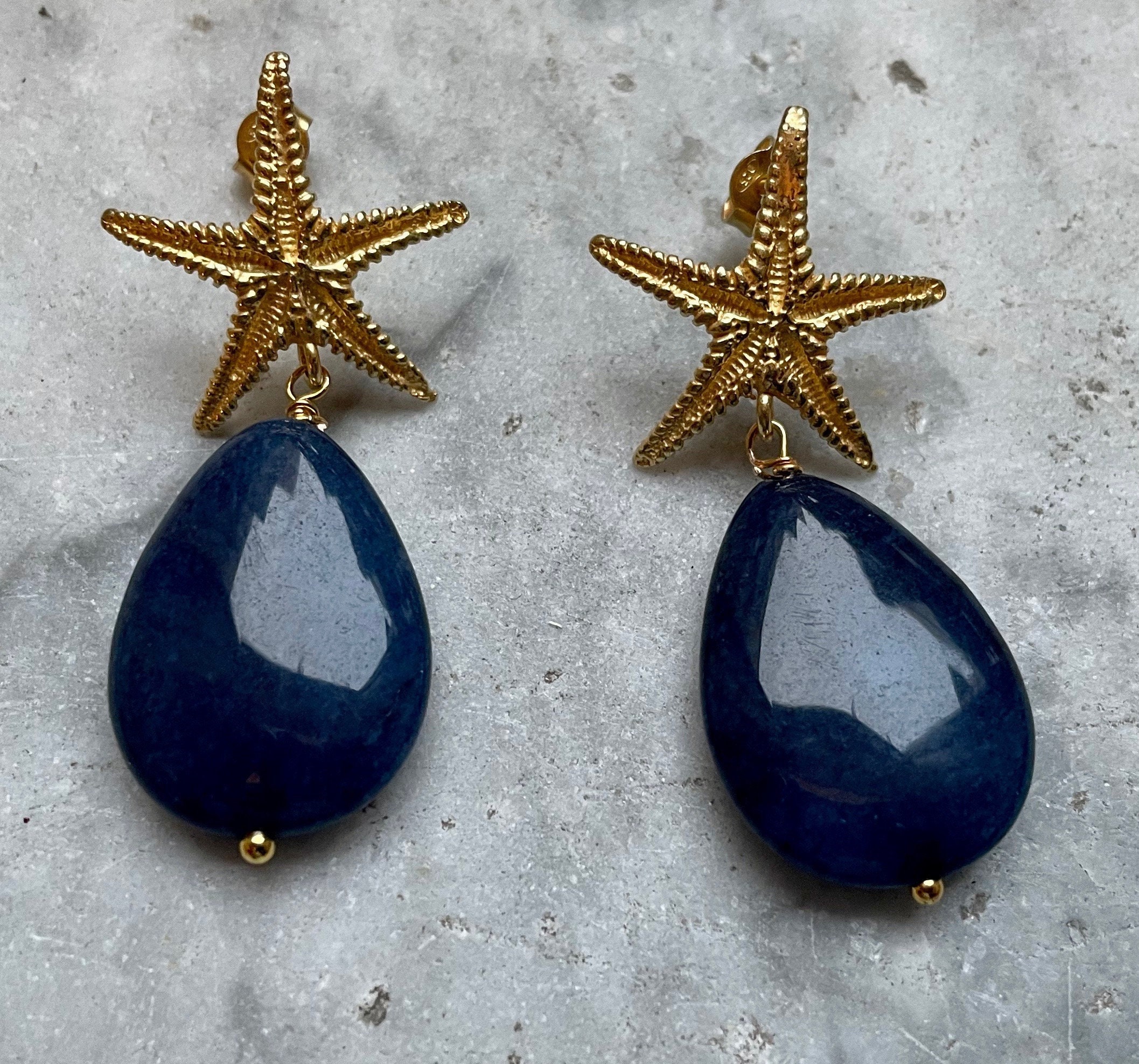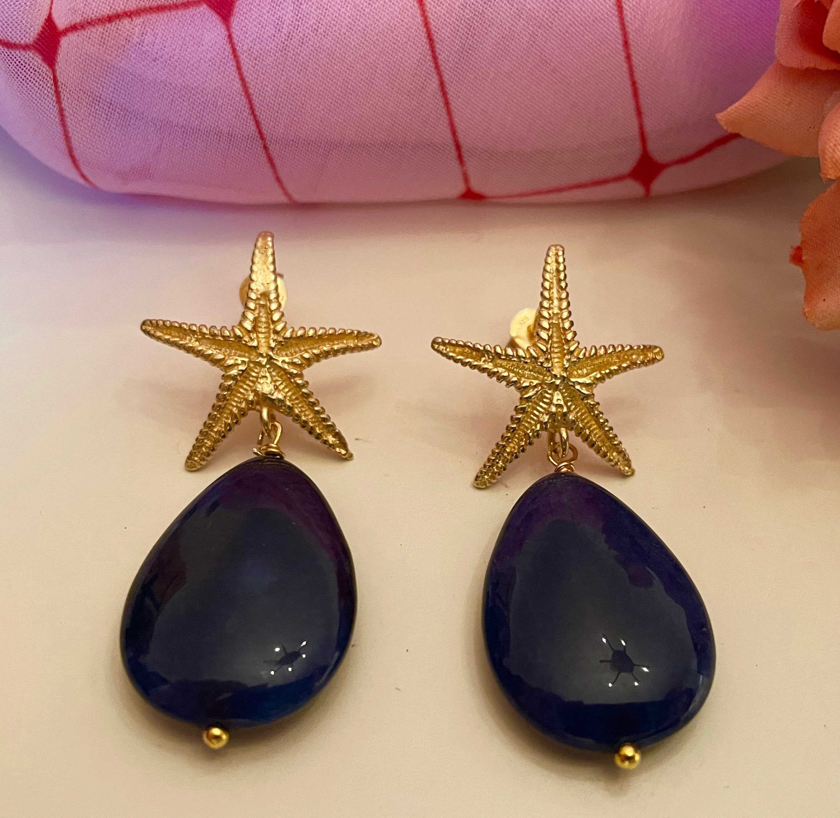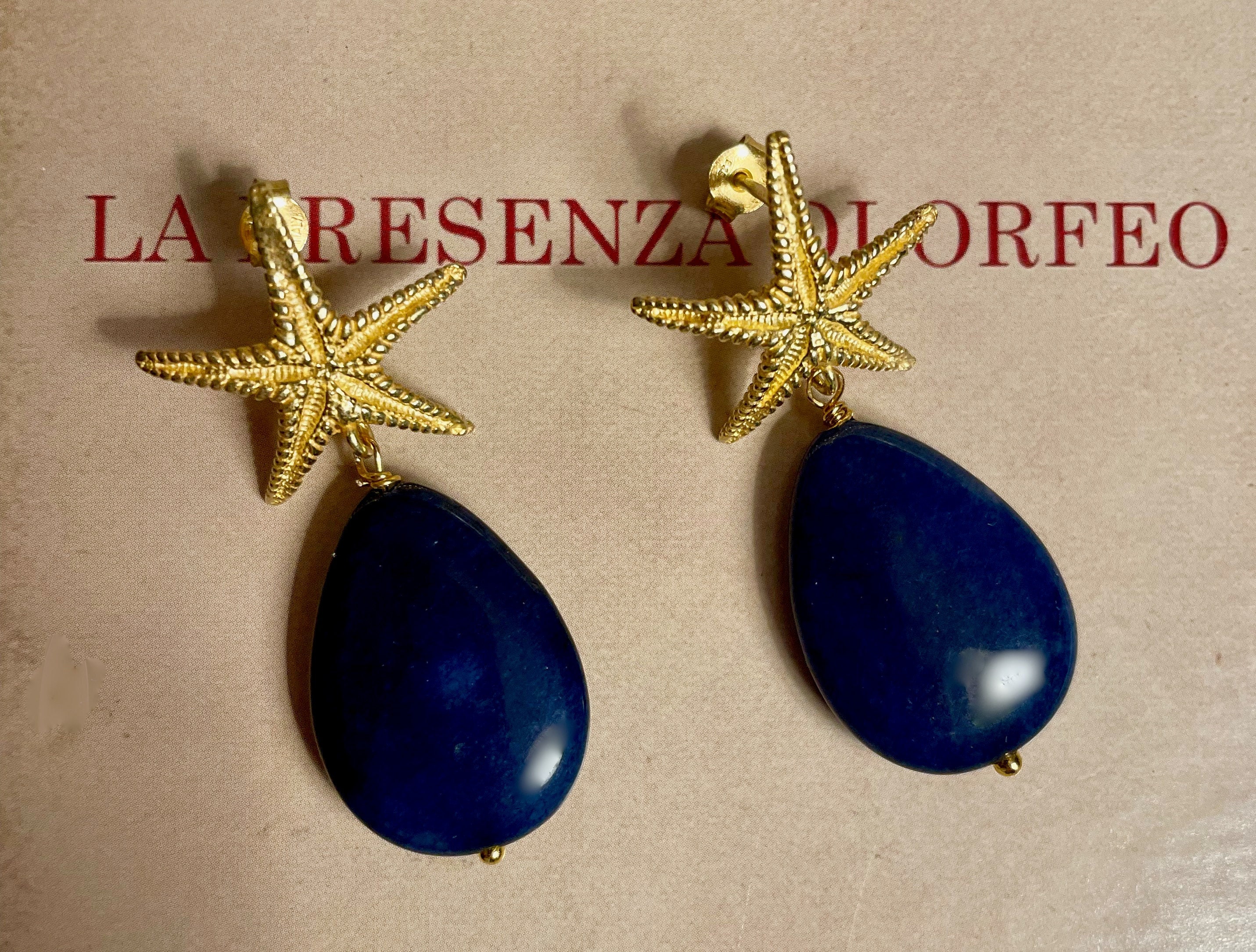 Realizzati con perno in argento 925 placcato oro raffigurante stella marina e perla a goccia piatta in giada color blu zaffiro.
